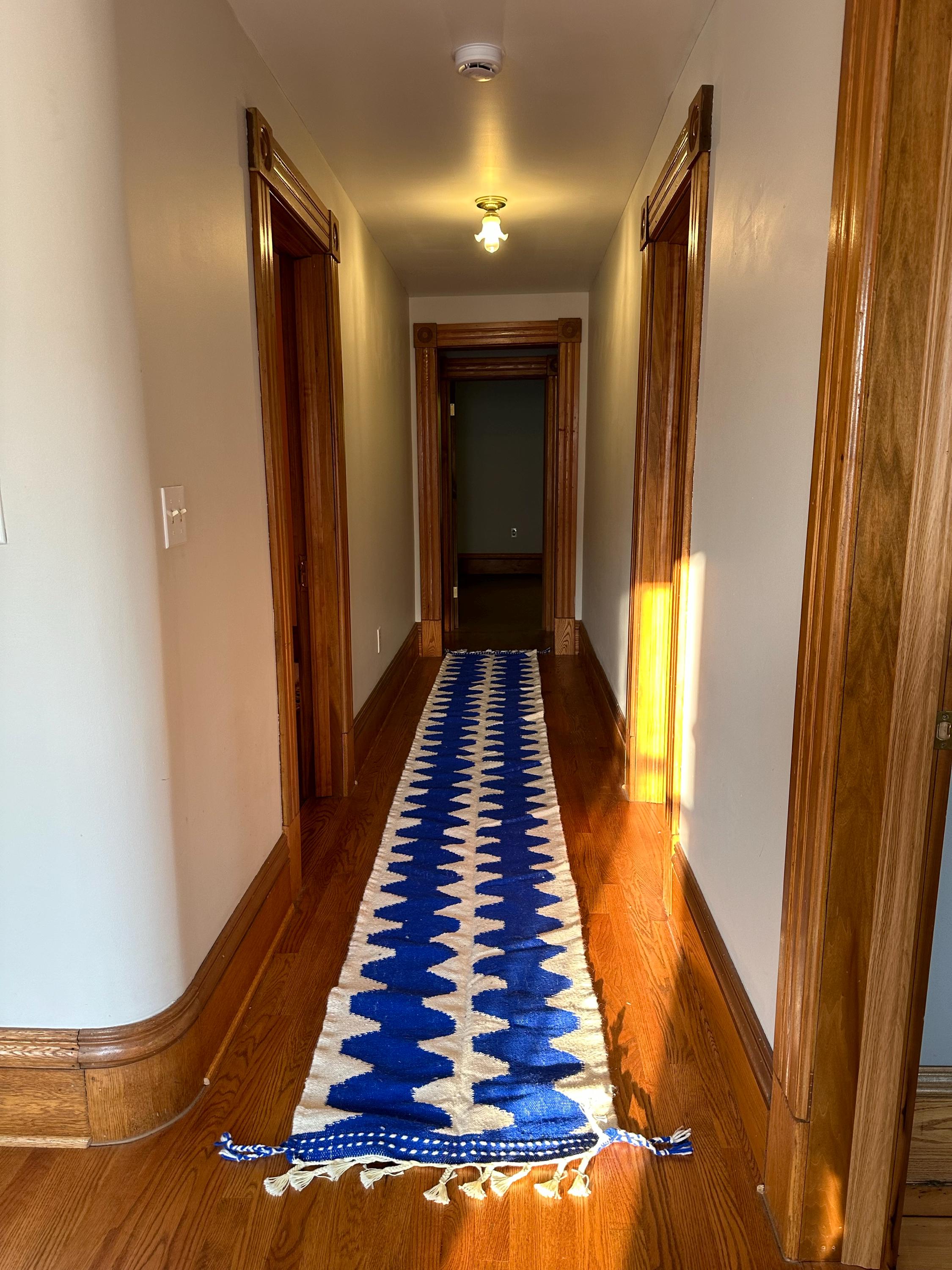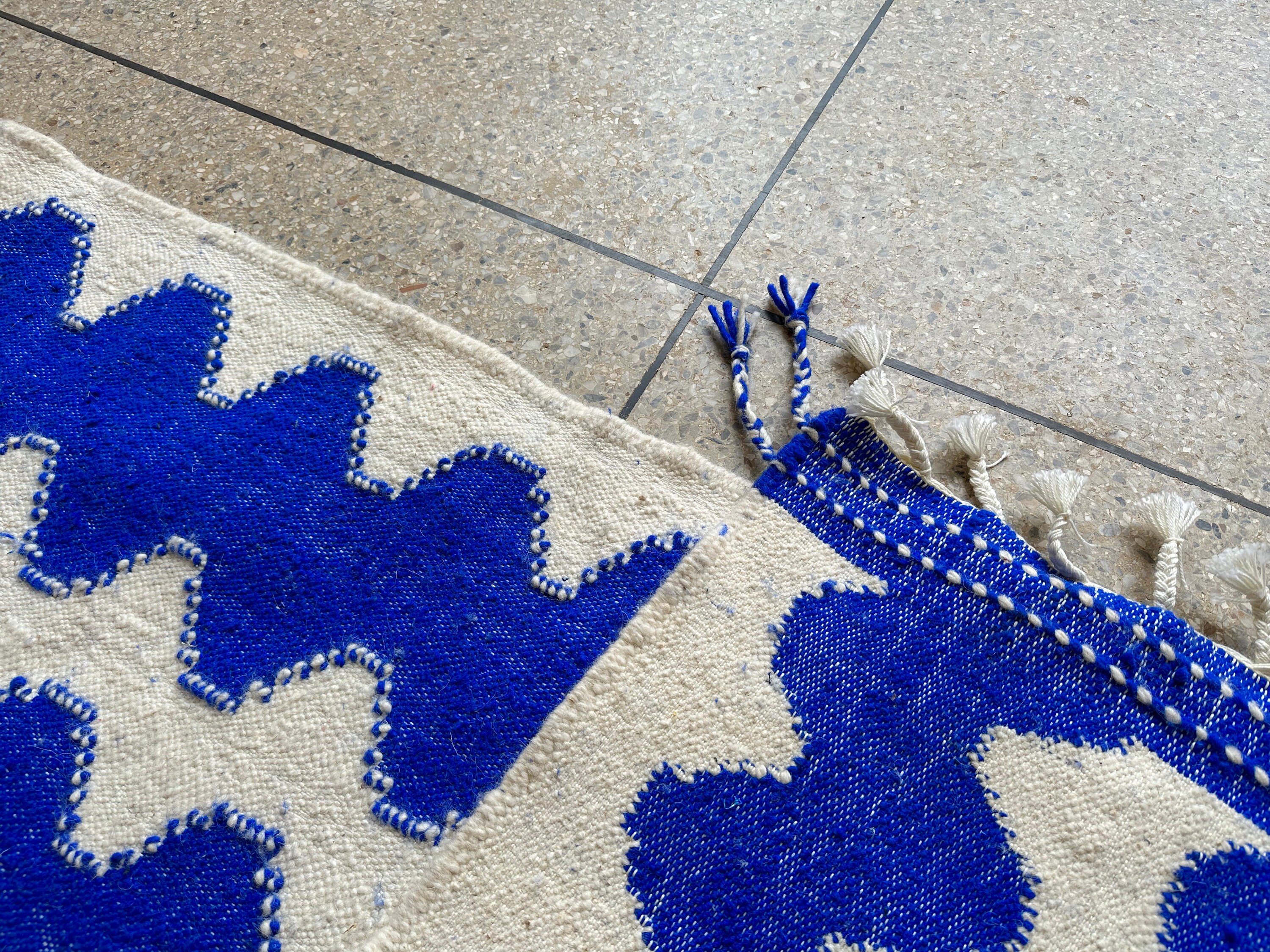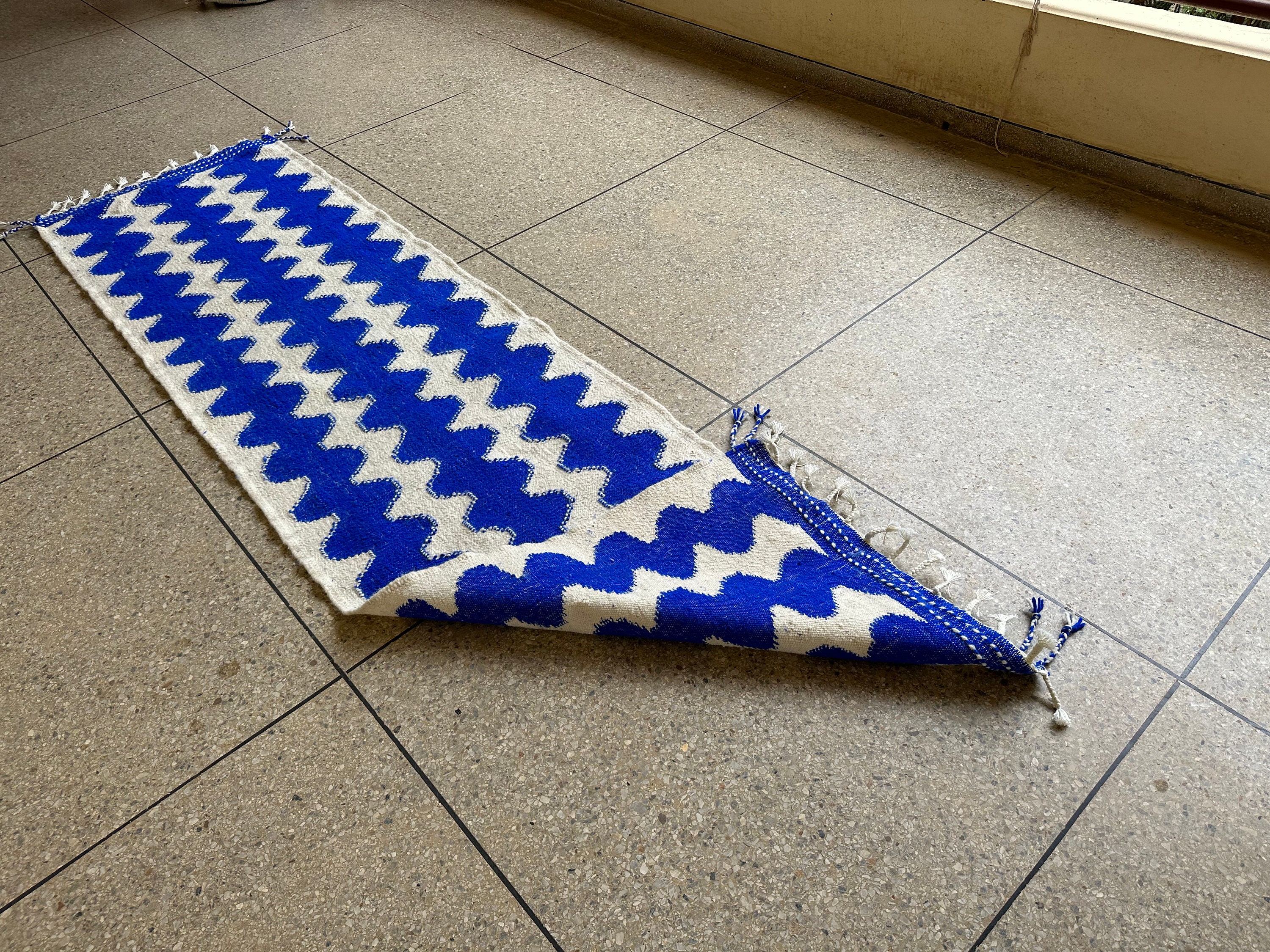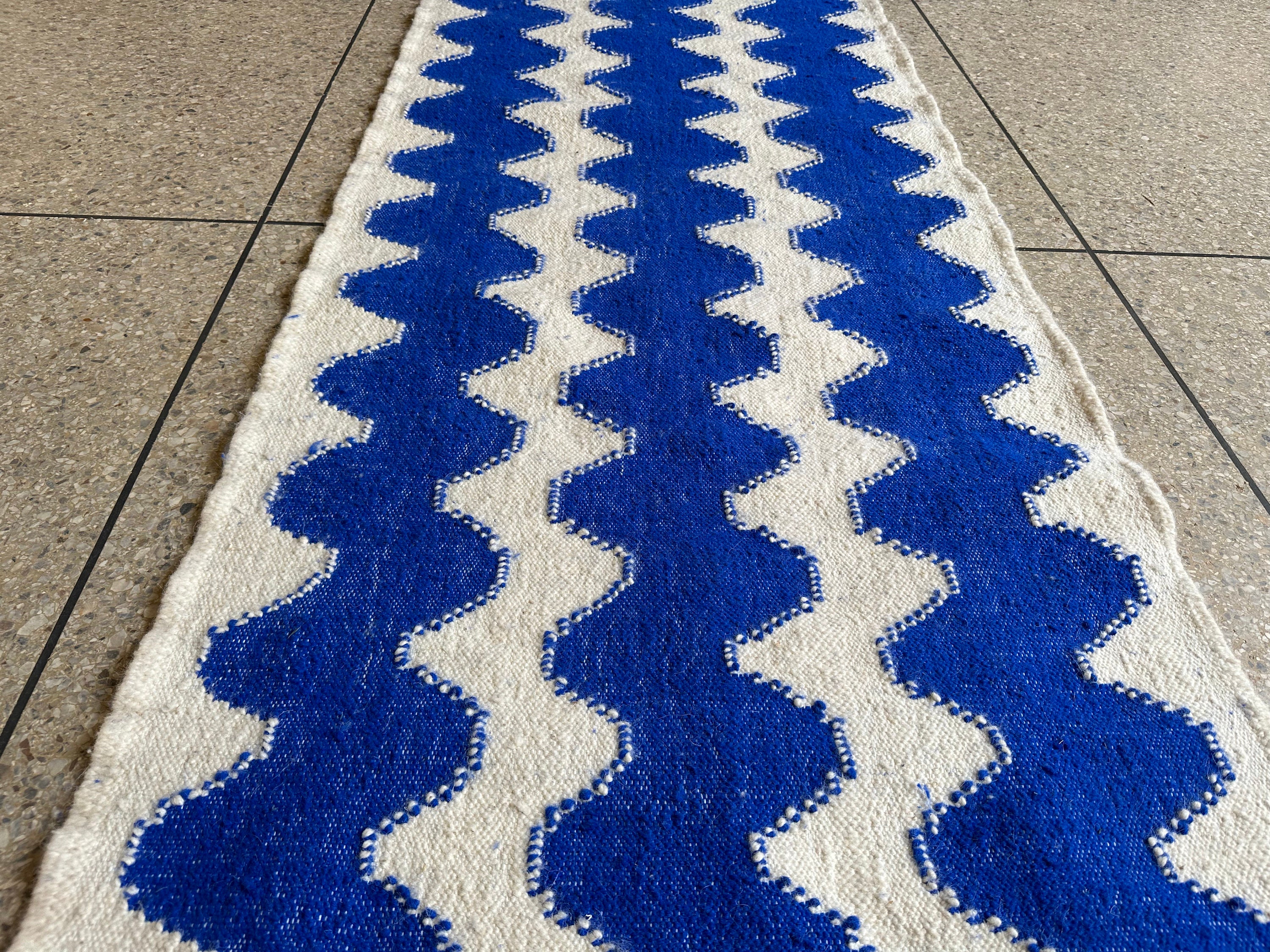Elevate your space with our stunning Moroccan Kilim Runner! This Beni Ourain White and Blue Striped Runner adds a touch of elegance to any hallway. Handmade by Berber artisans, this wool runner rug is both authentic and customizable to complement your entryway perfectly. Make a statement with this unique and timeless piece!