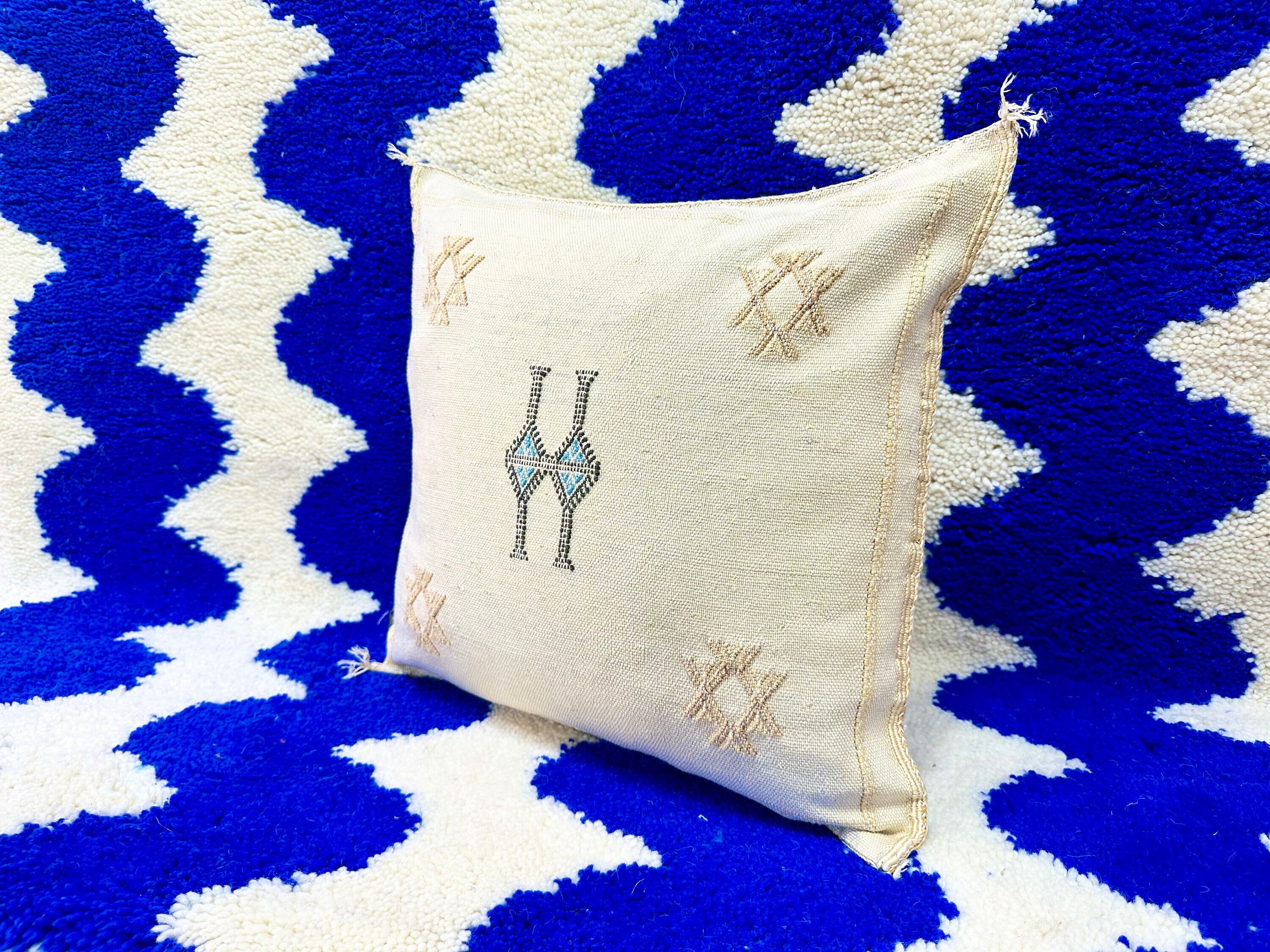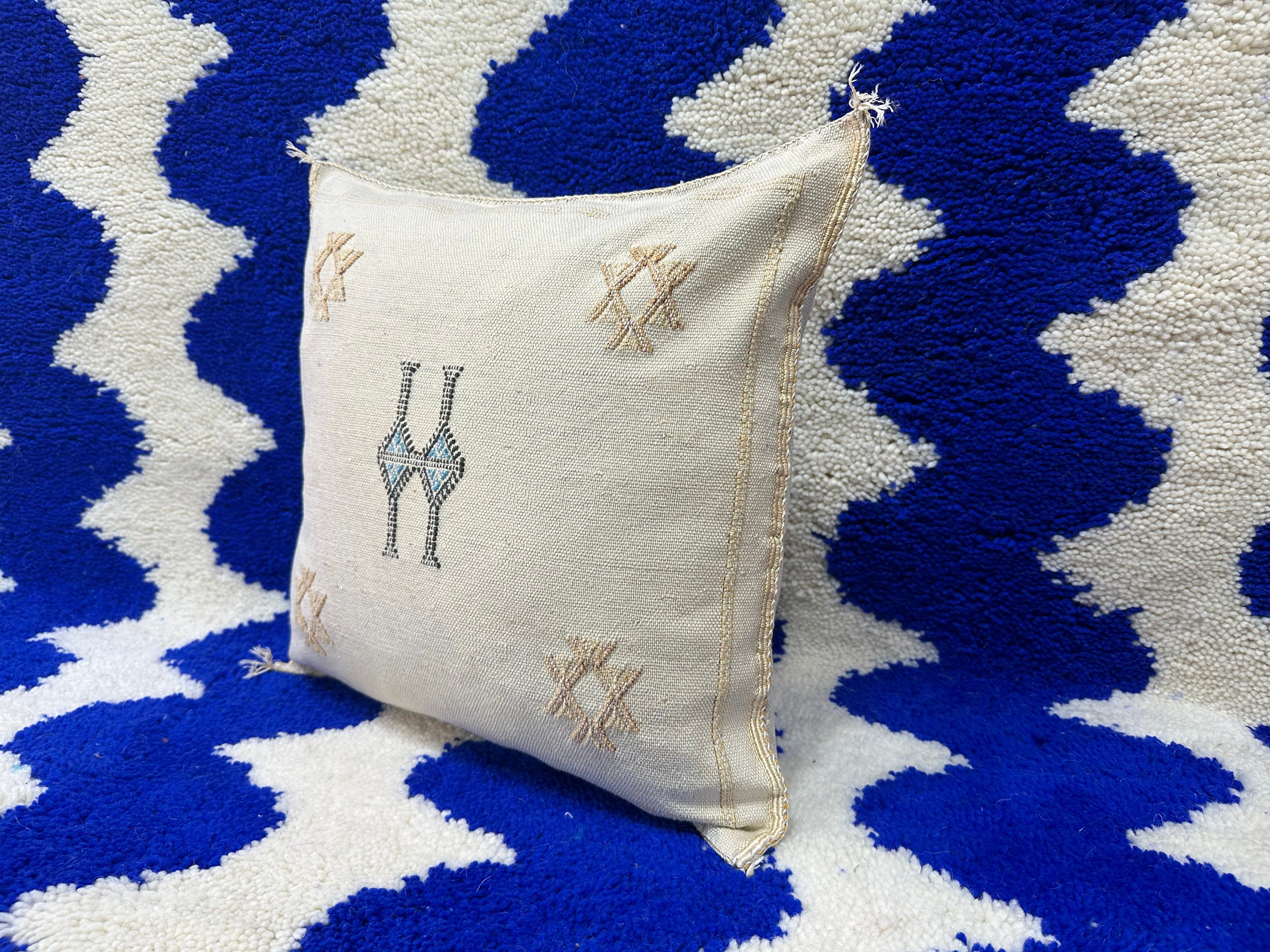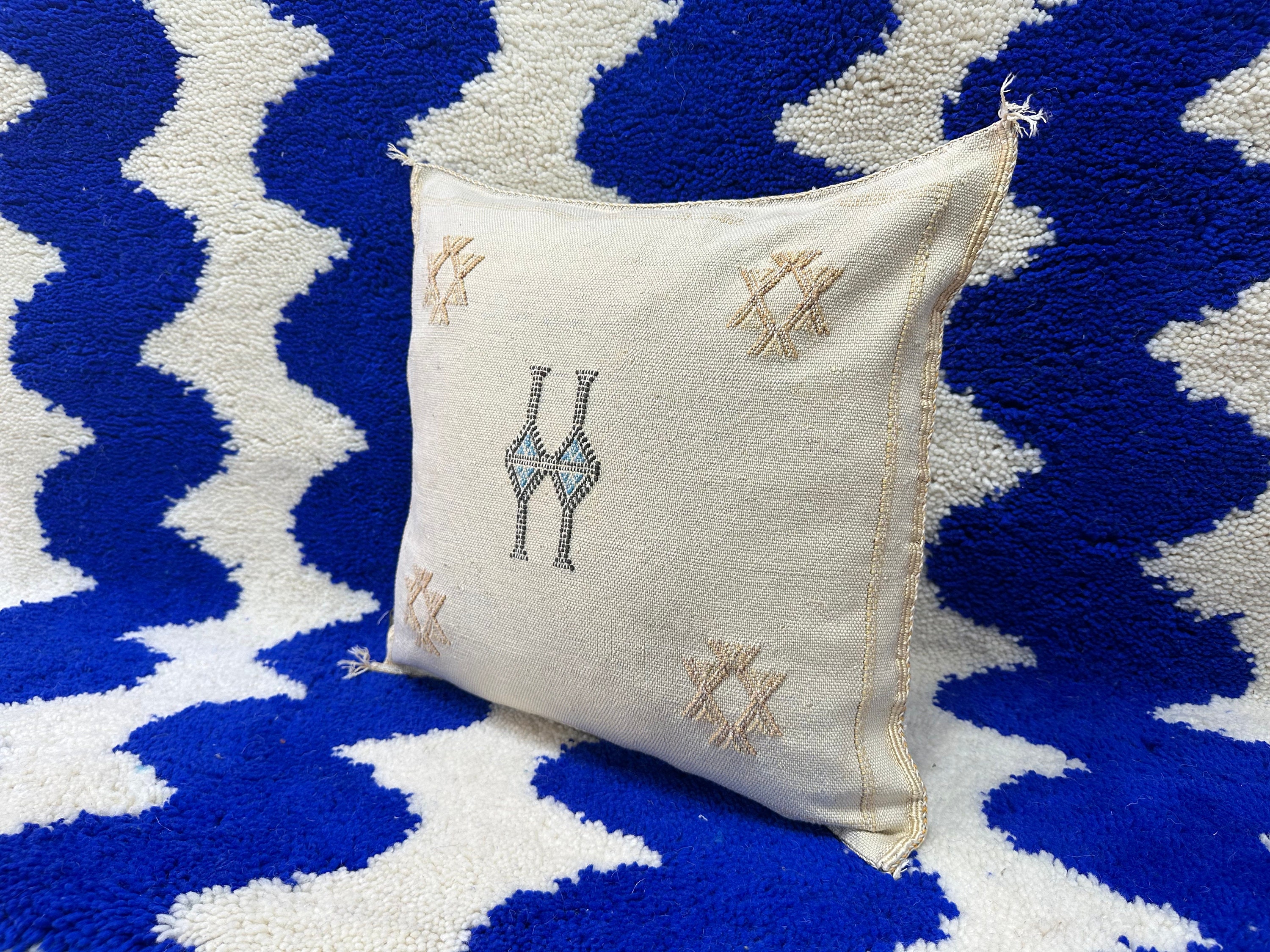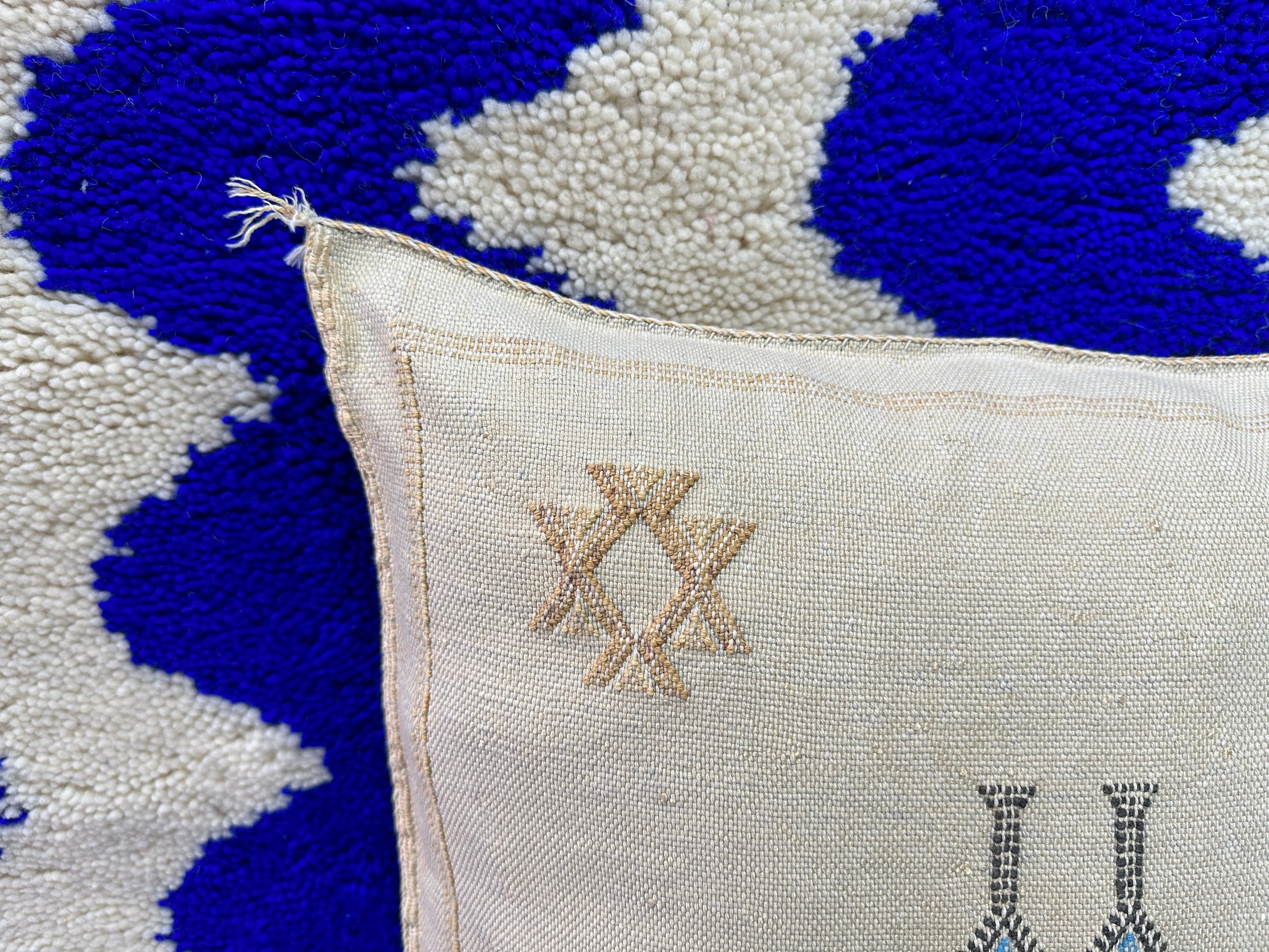 Authentic Moroccan cactus silk pillow, hand woven by Berber women in their own homes. These skilled artisans will take at least a day to weave this pillow on traditional wooden looms, a craft that has been handed down from mother to daughter over many centuries. Following our own design, the motifs on the pillow cover reflect traditional symbols used by tribal women from Morocco's Atlas Mountains.