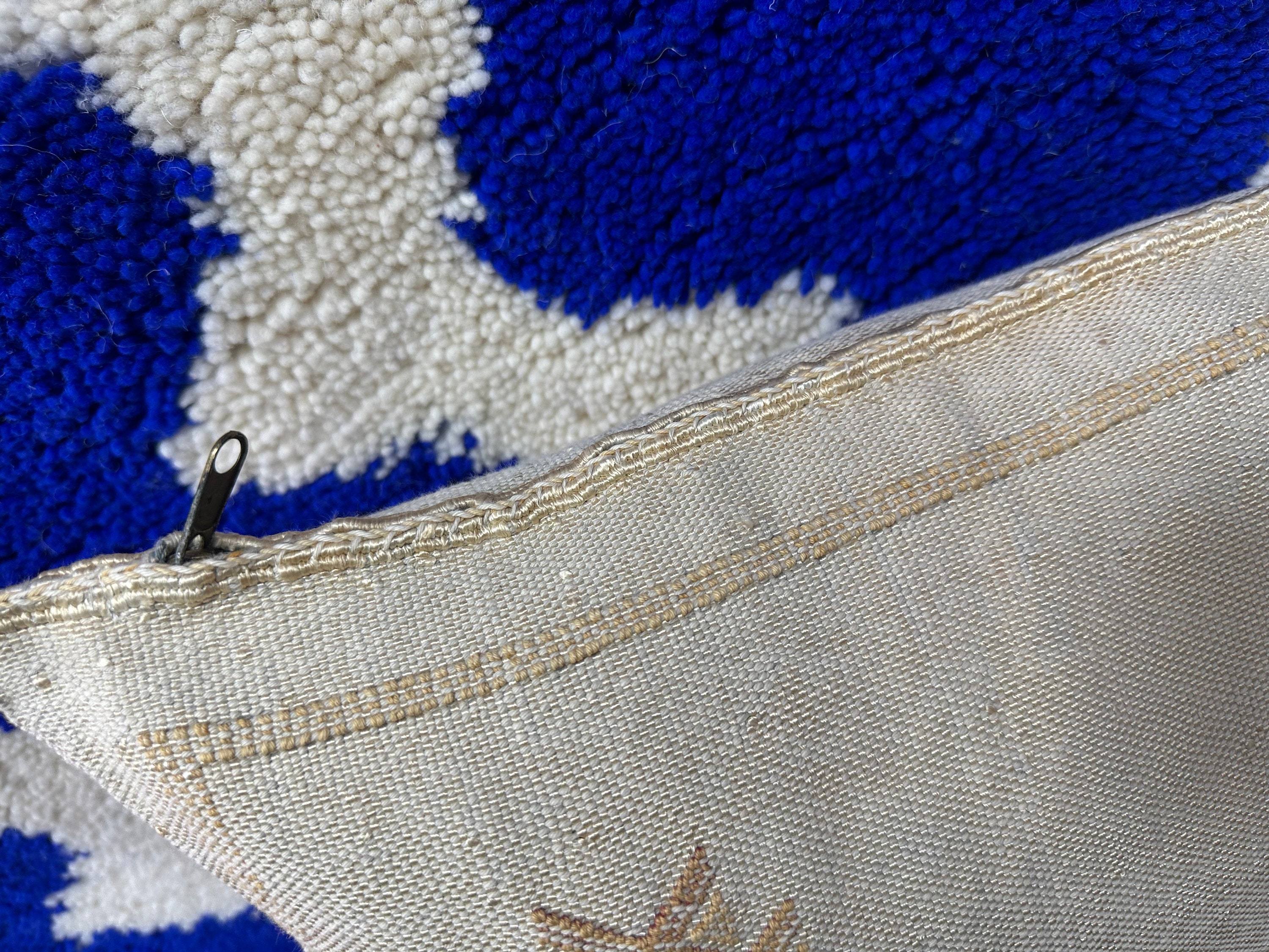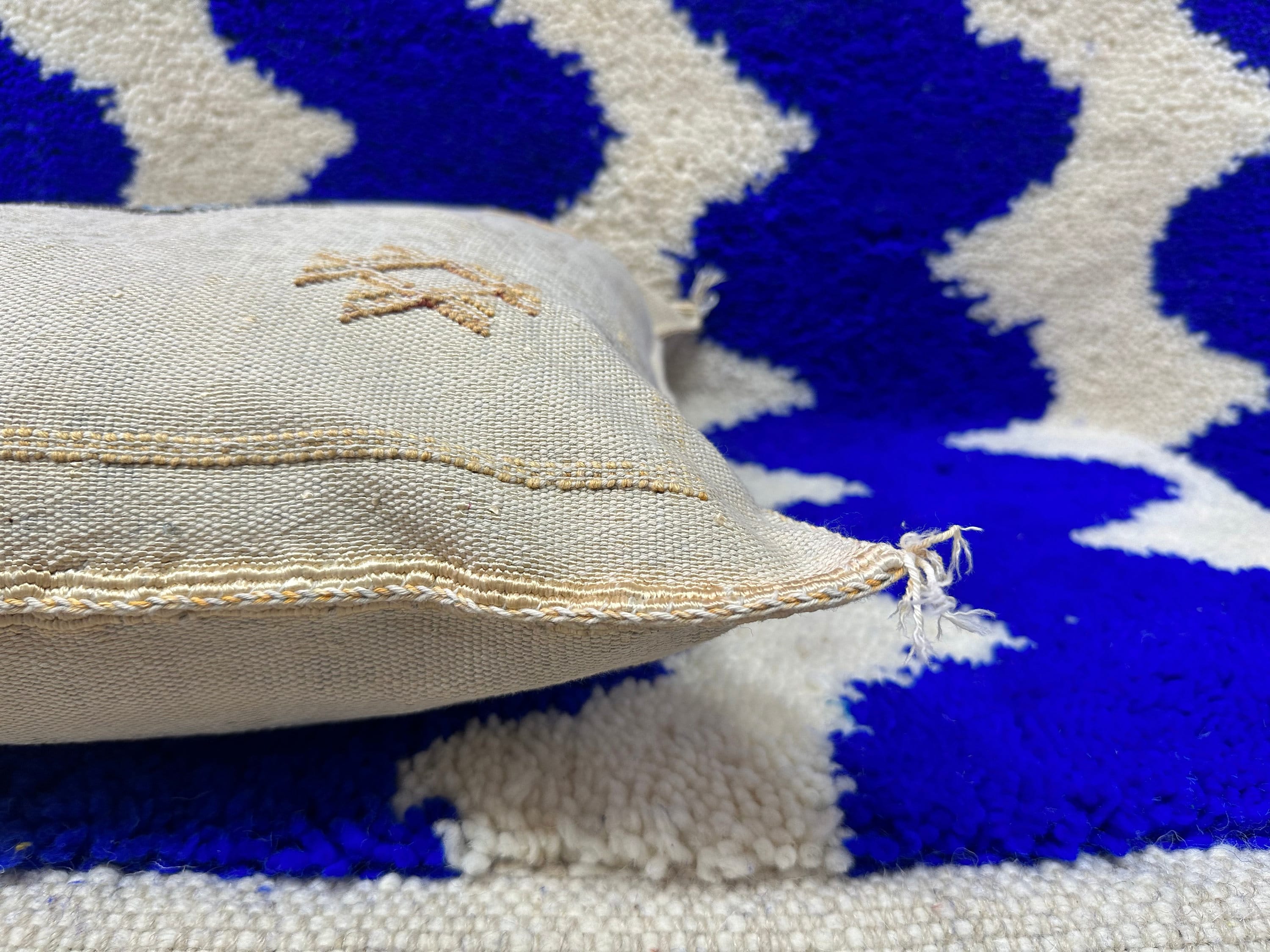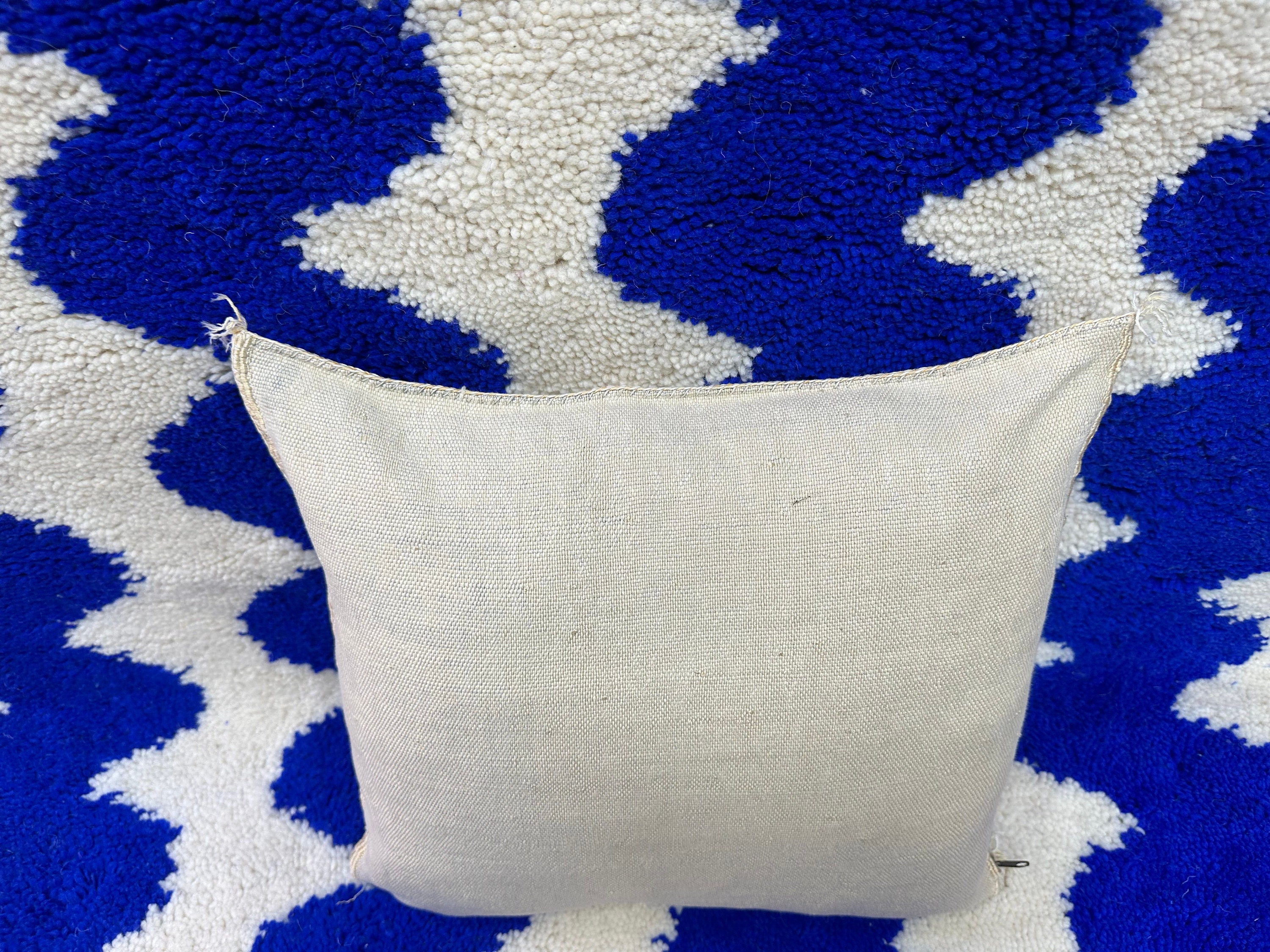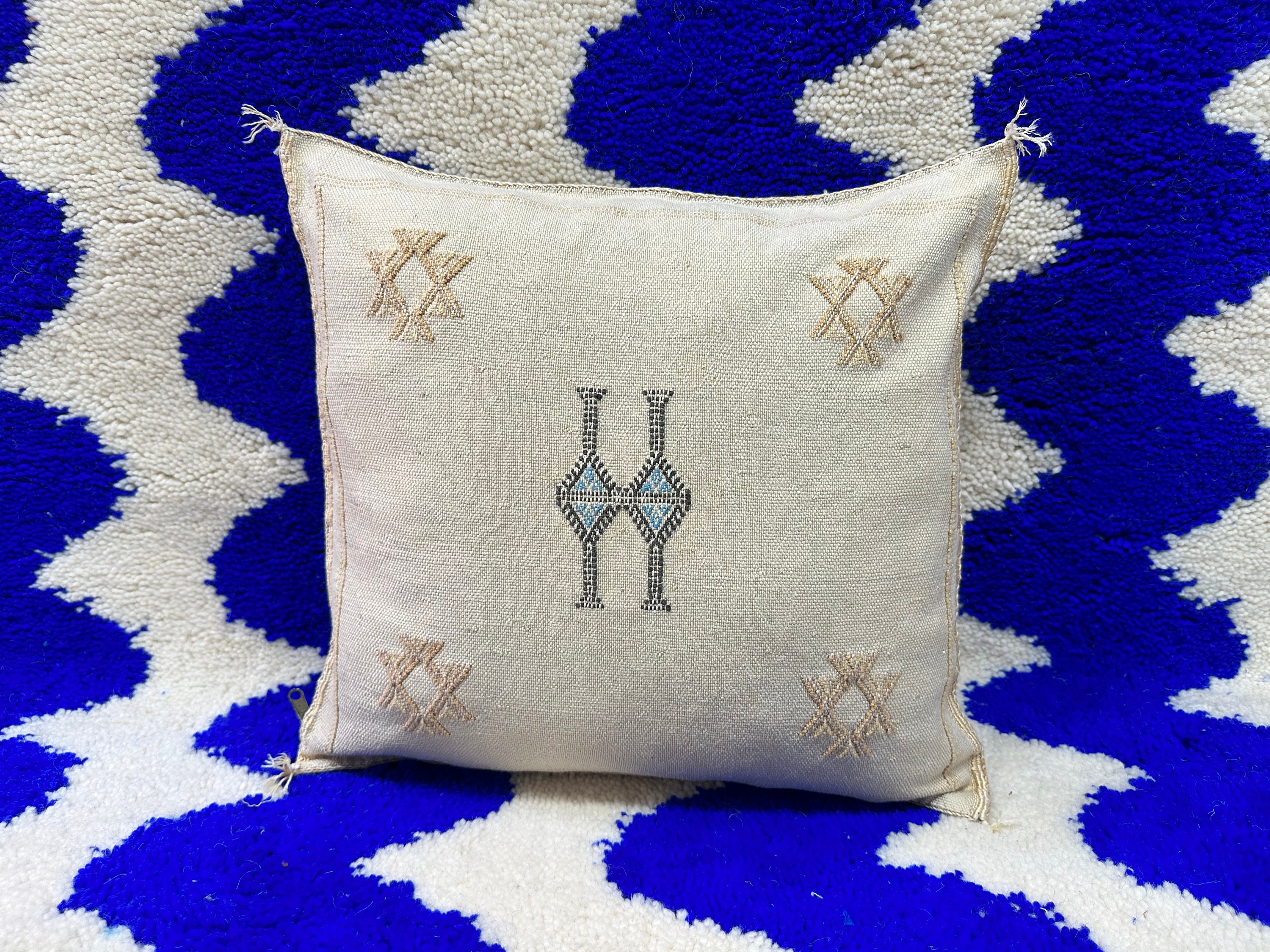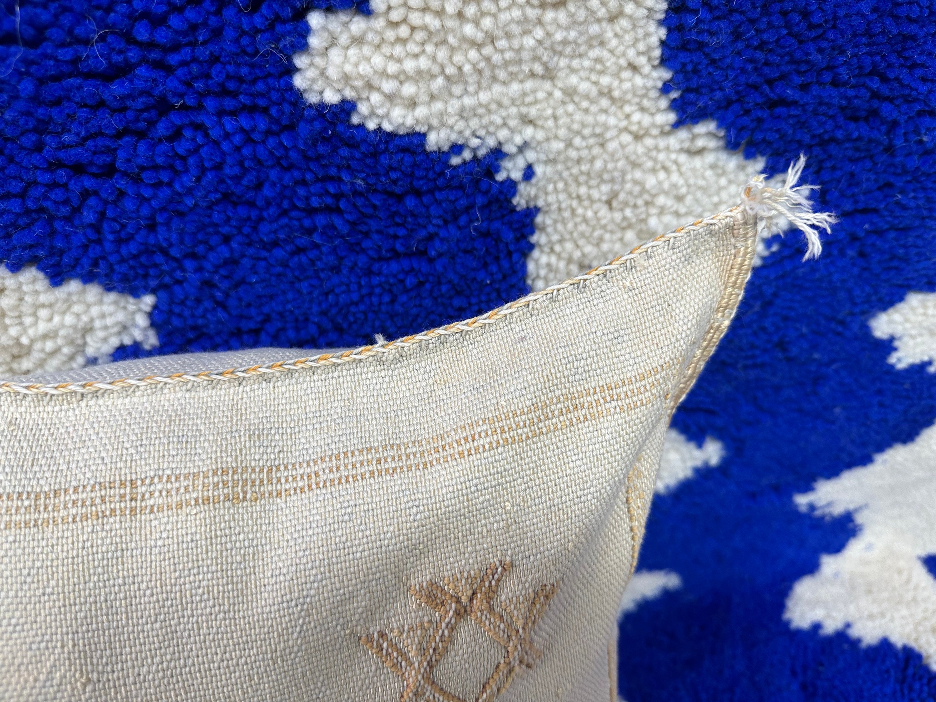 Authentic Moroccan cactus silk pillow, hand woven by Berber women in their own homes. These skilled artisans will take at least a day to weave this pillow on traditional wooden looms, a craft that has been handed down from mother to daughter over many centuries. Following our own design, the motifs on the pillow cover reflect traditional symbols used by tribal women from Morocco's Atlas Mountains.