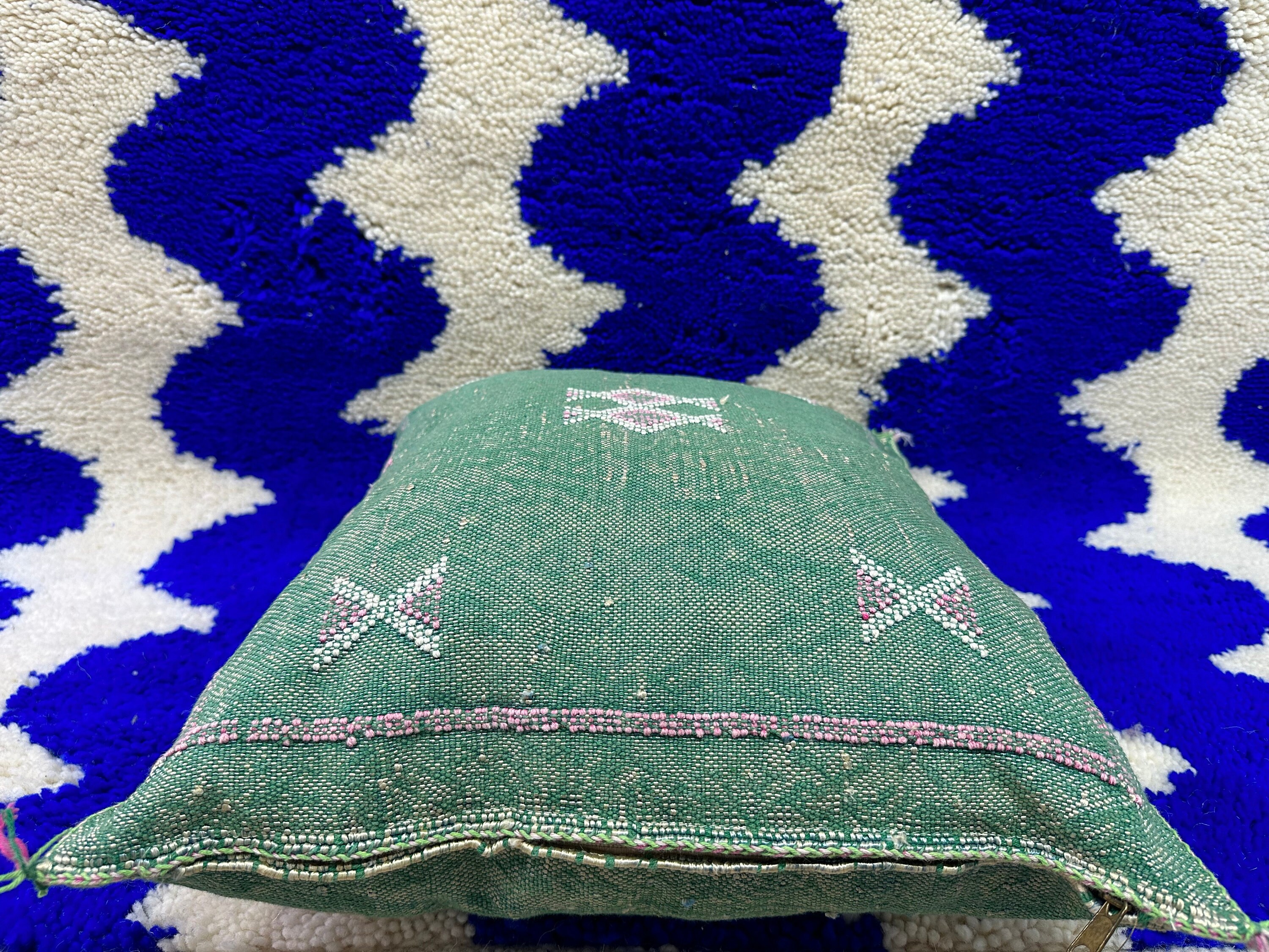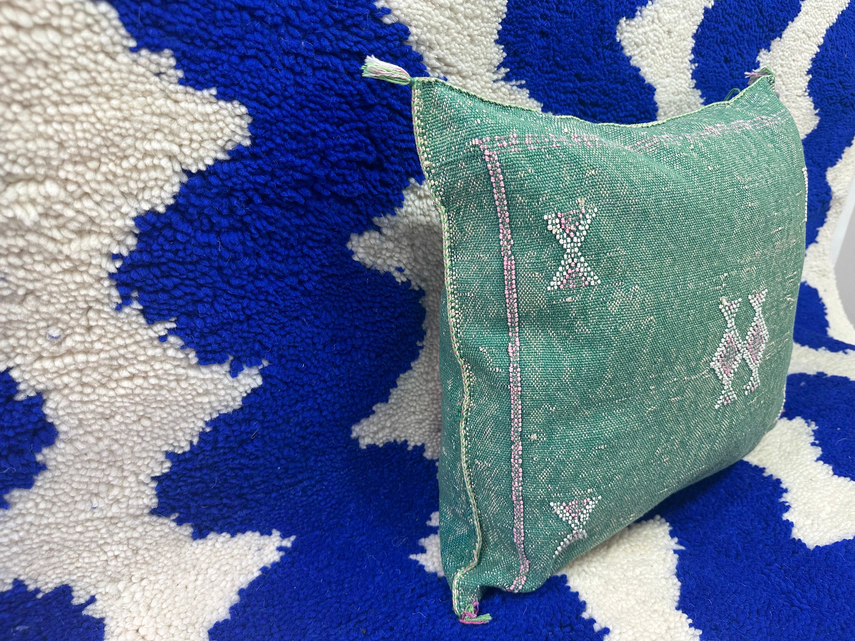 Authentic Moroccan cactus silk pillow, hand woven by Berber women in their own homes. These skilled artisans will take at least a day to weave this pillow on traditional wooden looms, a craft that has been handed down from mother to daughter over many centuries. Following our own design, the motifs on the pillow cover reflect traditional symbols used by tribal women from Morocco's Atlas Mountains.