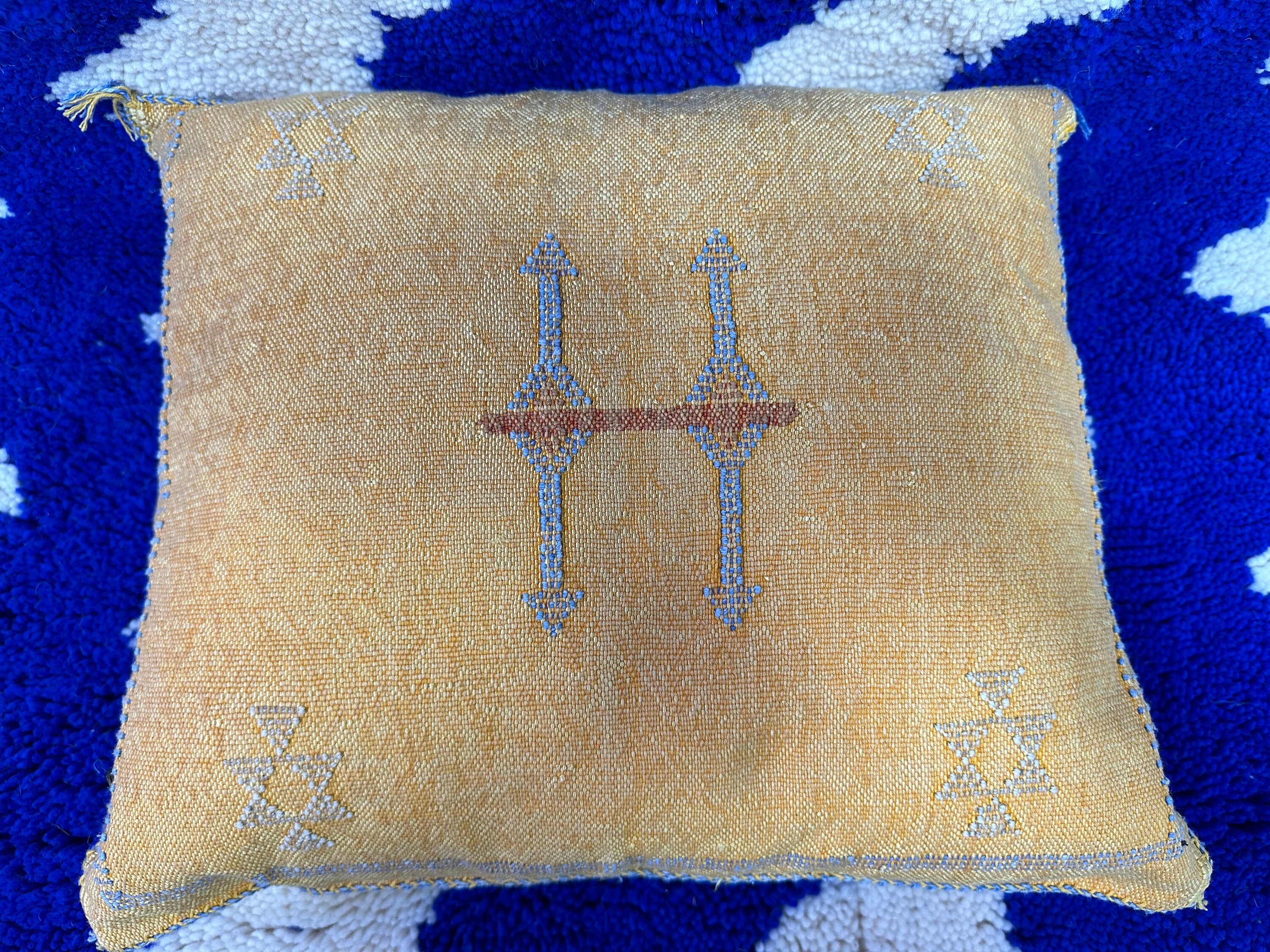 Authentic Moroccan cactus silk pillow, hand woven by Berber women in their own homes. These skilled artisans will take at least a day to weave this pillow on traditional wooden looms, a craft that has been handed down from mother to daughter over many centuries. Following our own design, the motifs on the pillow cover reflect traditional symbols used by tribal women from Morocco's Atlas Mountains.