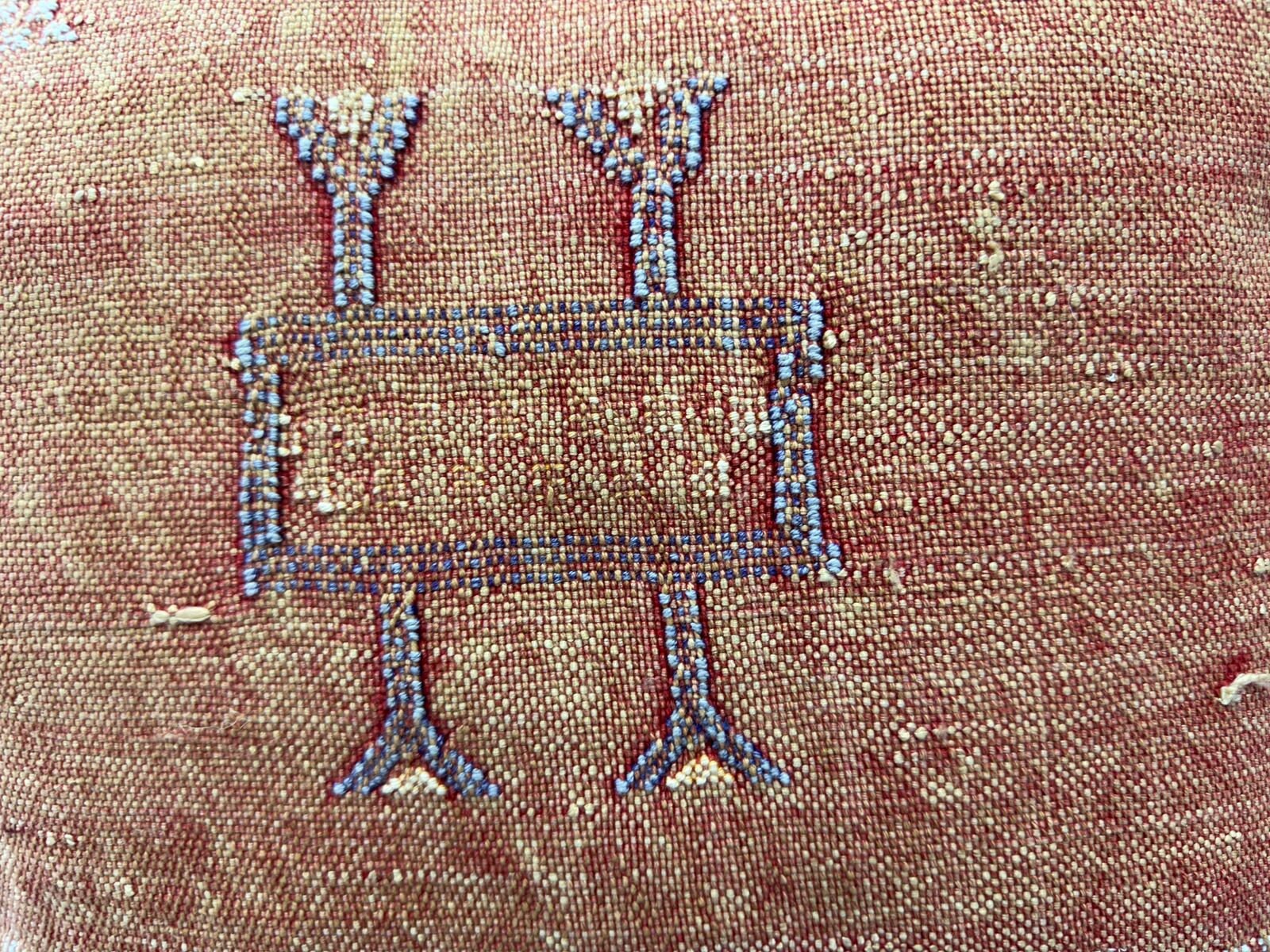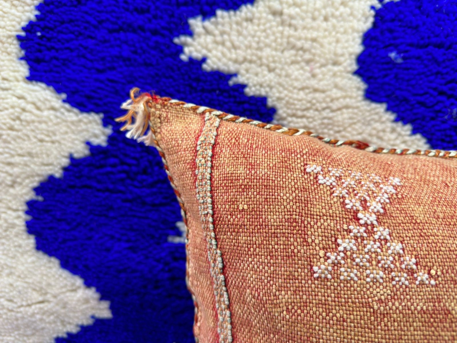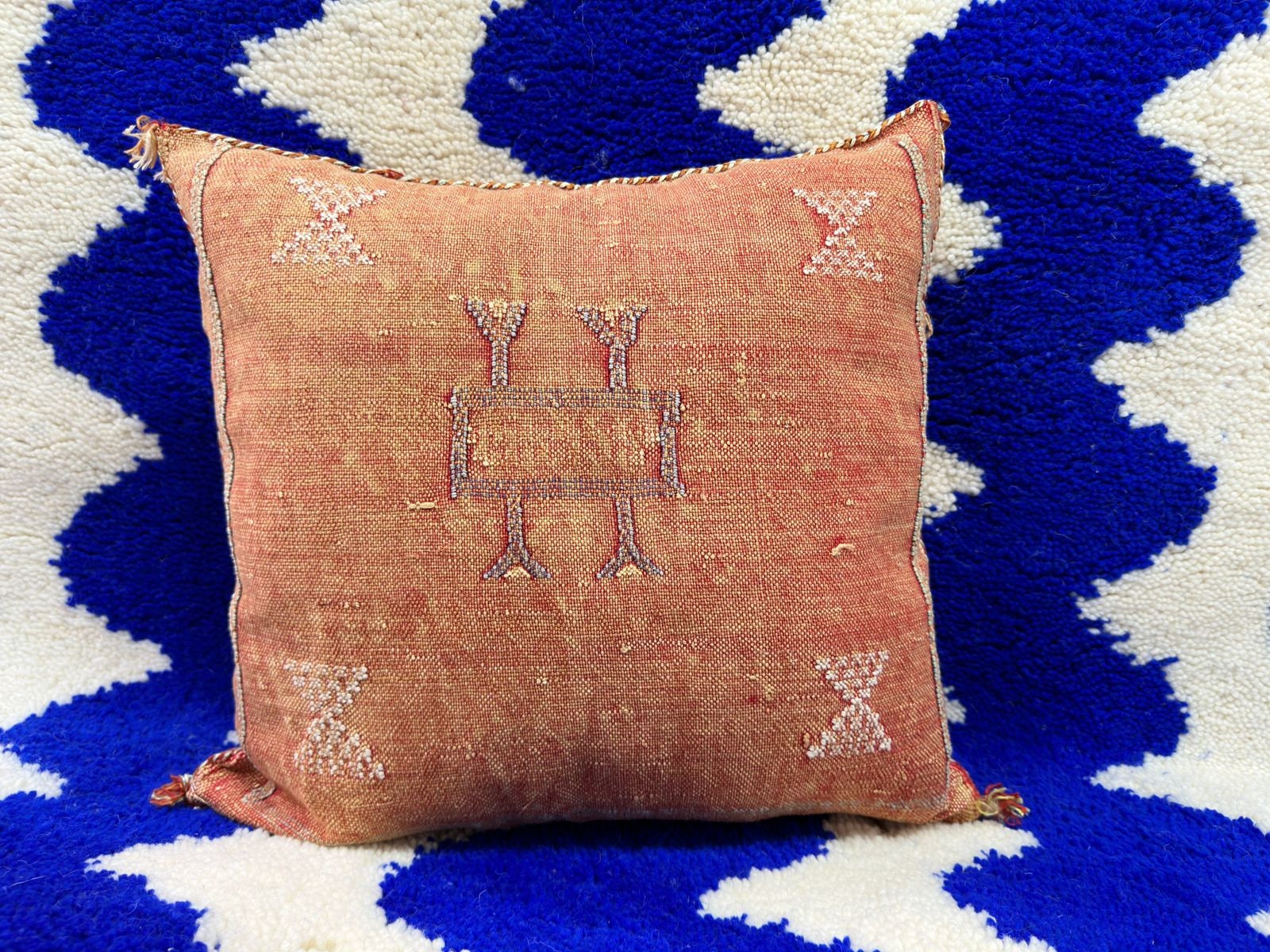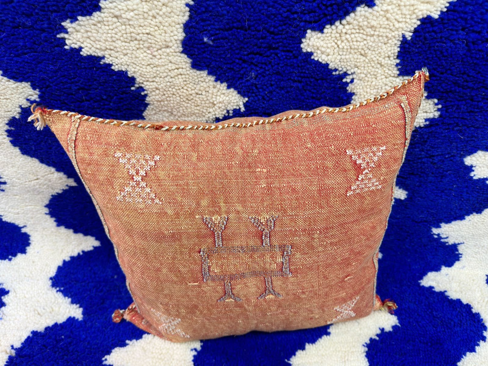 Authentic Moroccan cactus silk pillow, hand woven by Berber women in their own homes. These skilled artisans will take at least a day to weave this pillow on traditional wooden looms, a craft that has been handed down from mother to daughter over many centuries. Following our own design, the motifs on the pillow cover reflect traditional symbols used by tribal women from Morocco's Atlas Mountains.
