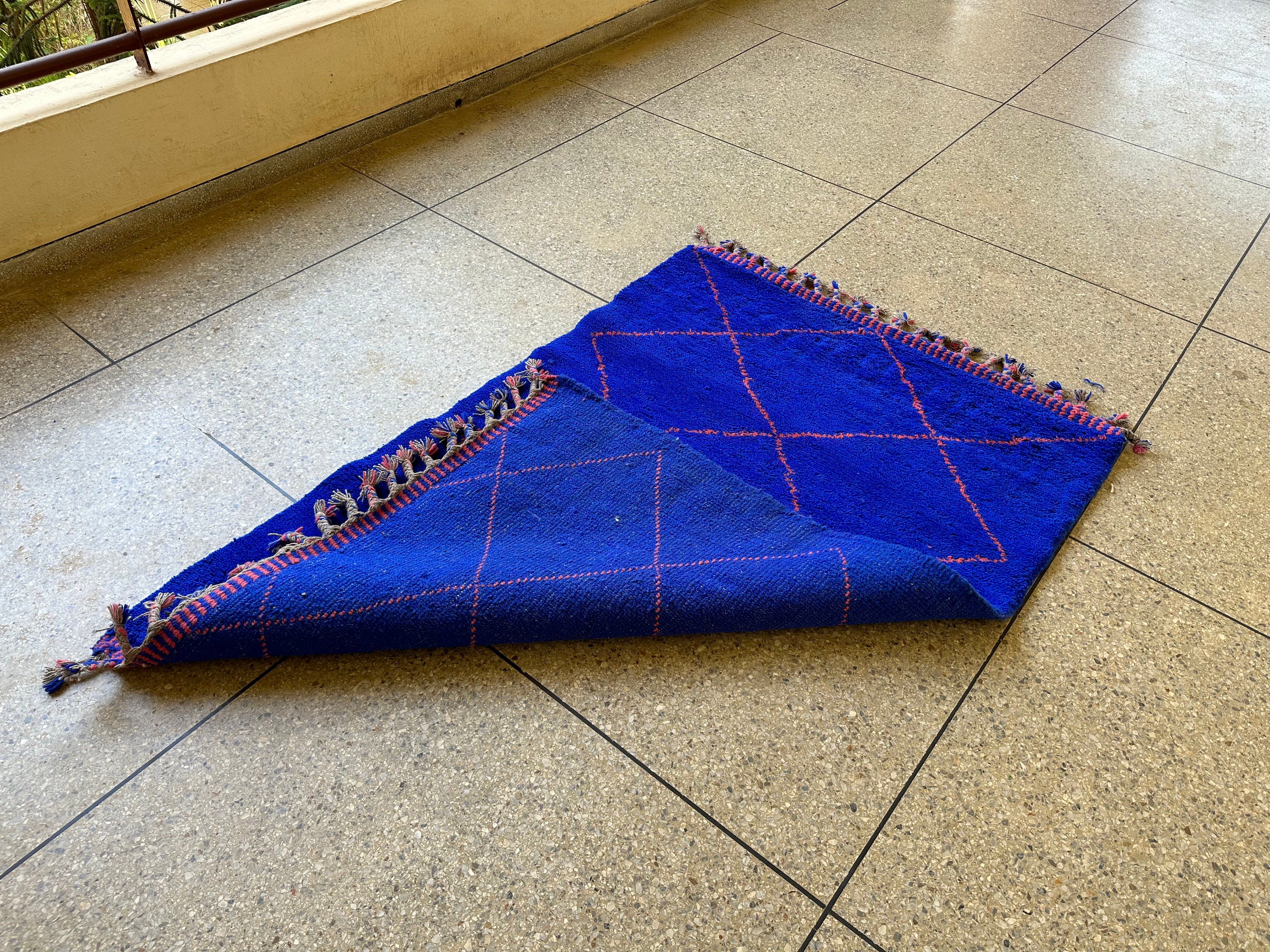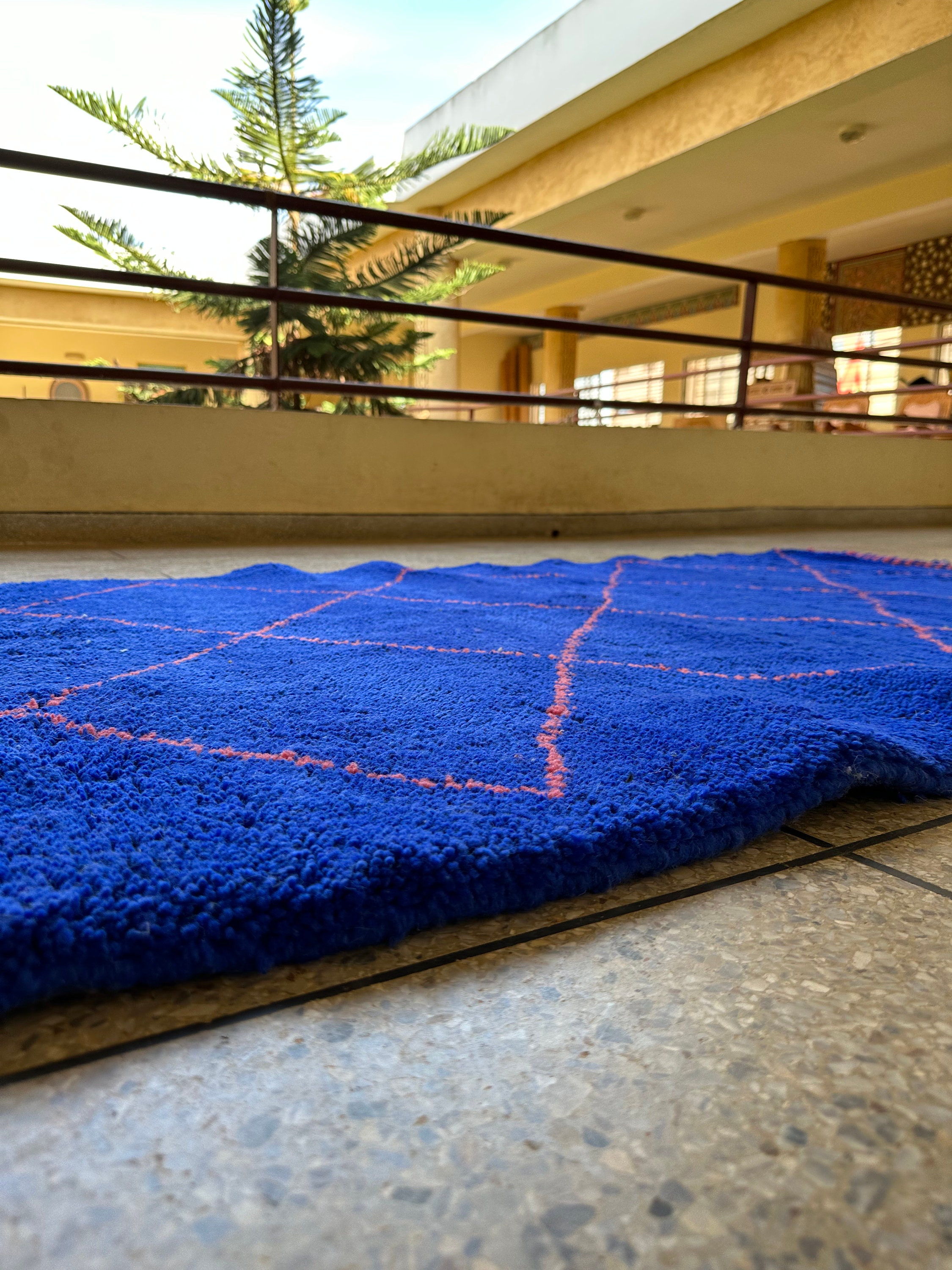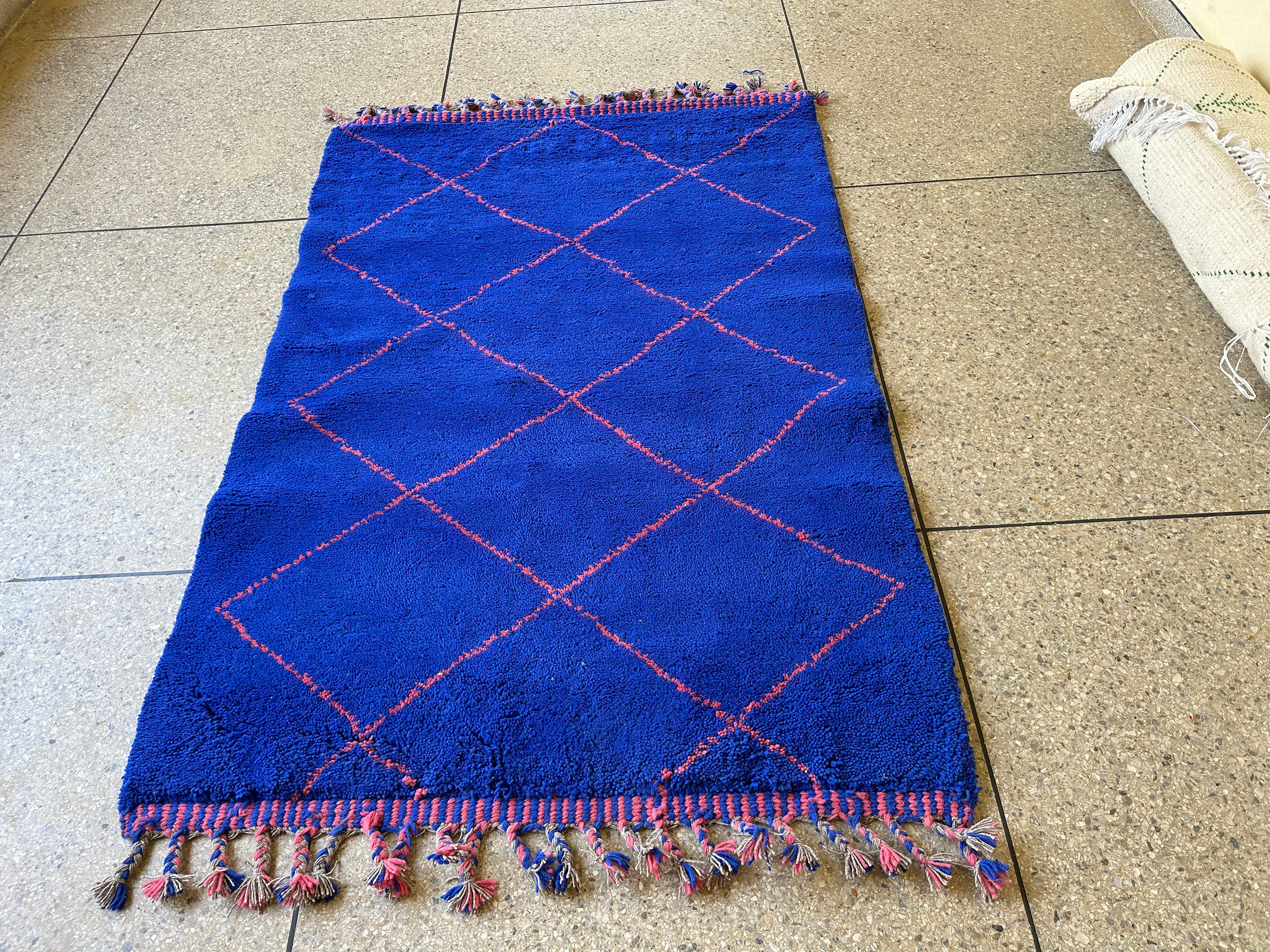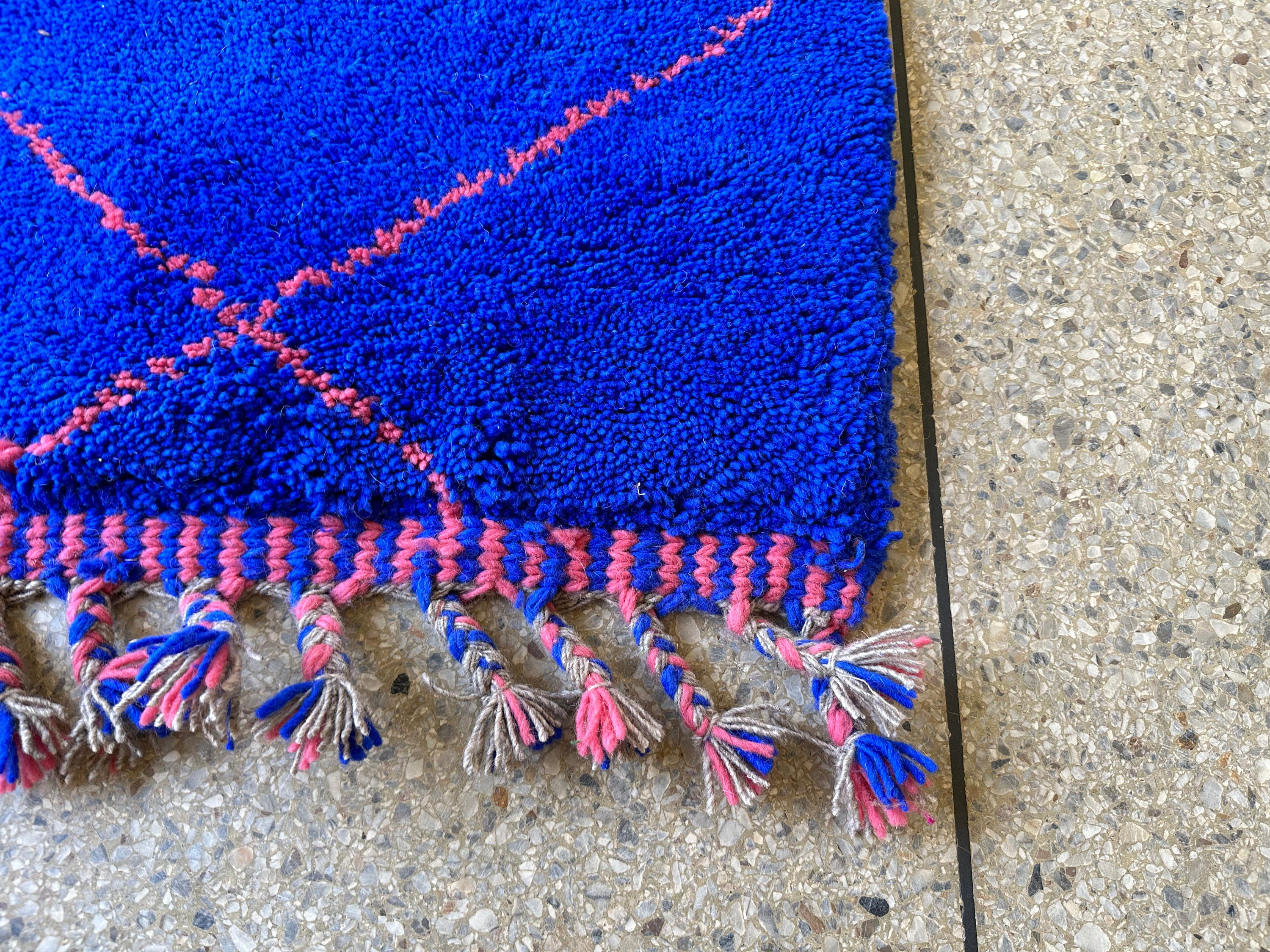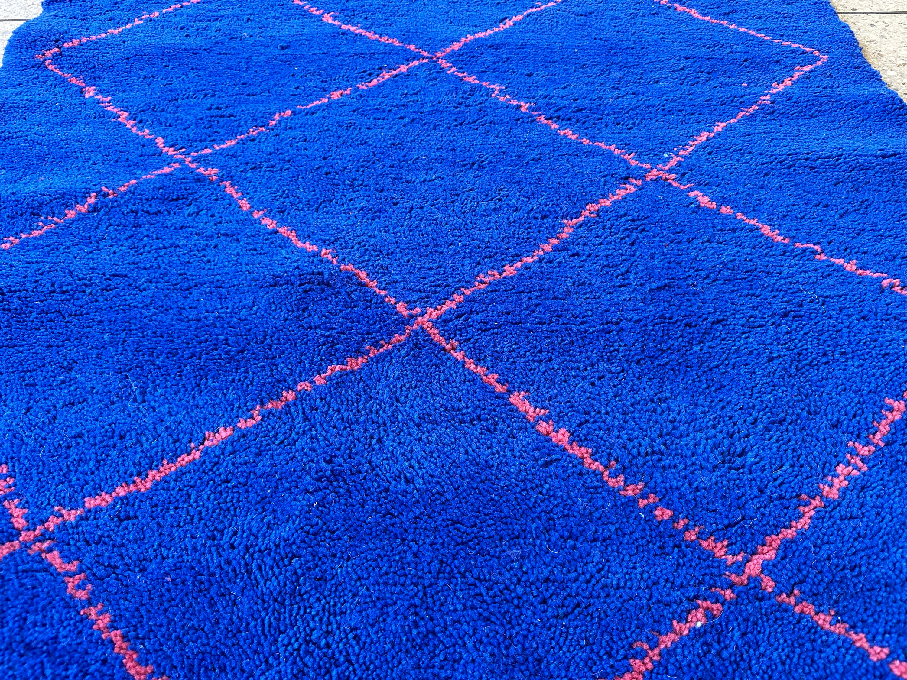 Add a pop of color and style to your home with this blue and pink geometric Beni Ourain rug. Featuring an abstract diamond design, this custom handmade wool rug is perfect for modern bohemian or minimalist living rooms and bedrooms. Its vibrant pattern and eco-friendly materials make it a sustainable and stylish choice for any space. Elevate your decor with this luxurious, artisan-crafted Moroccan rug today!