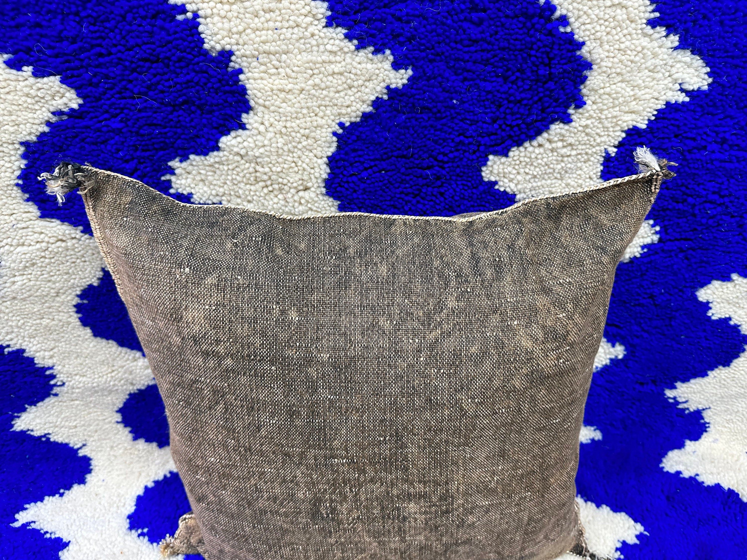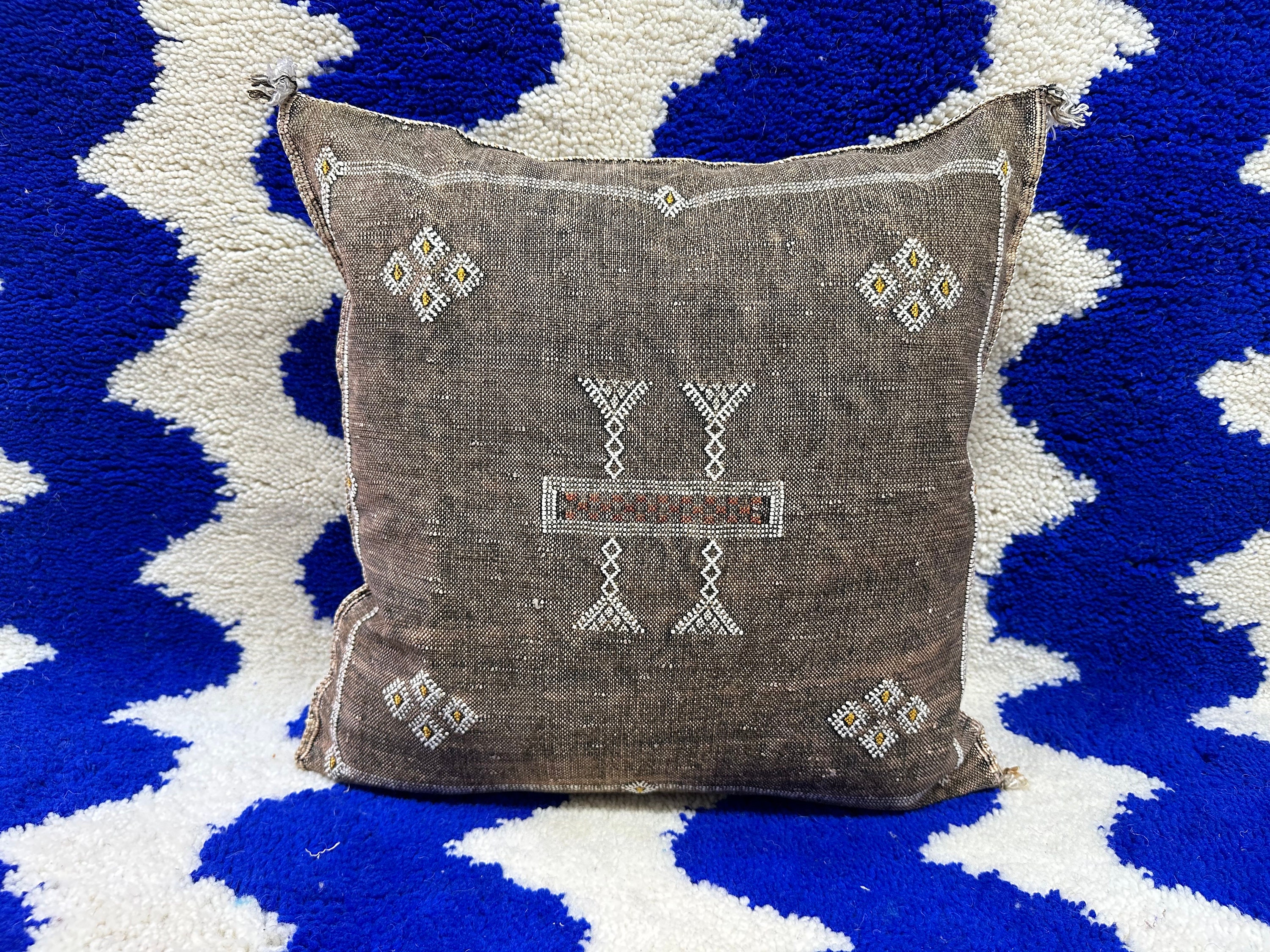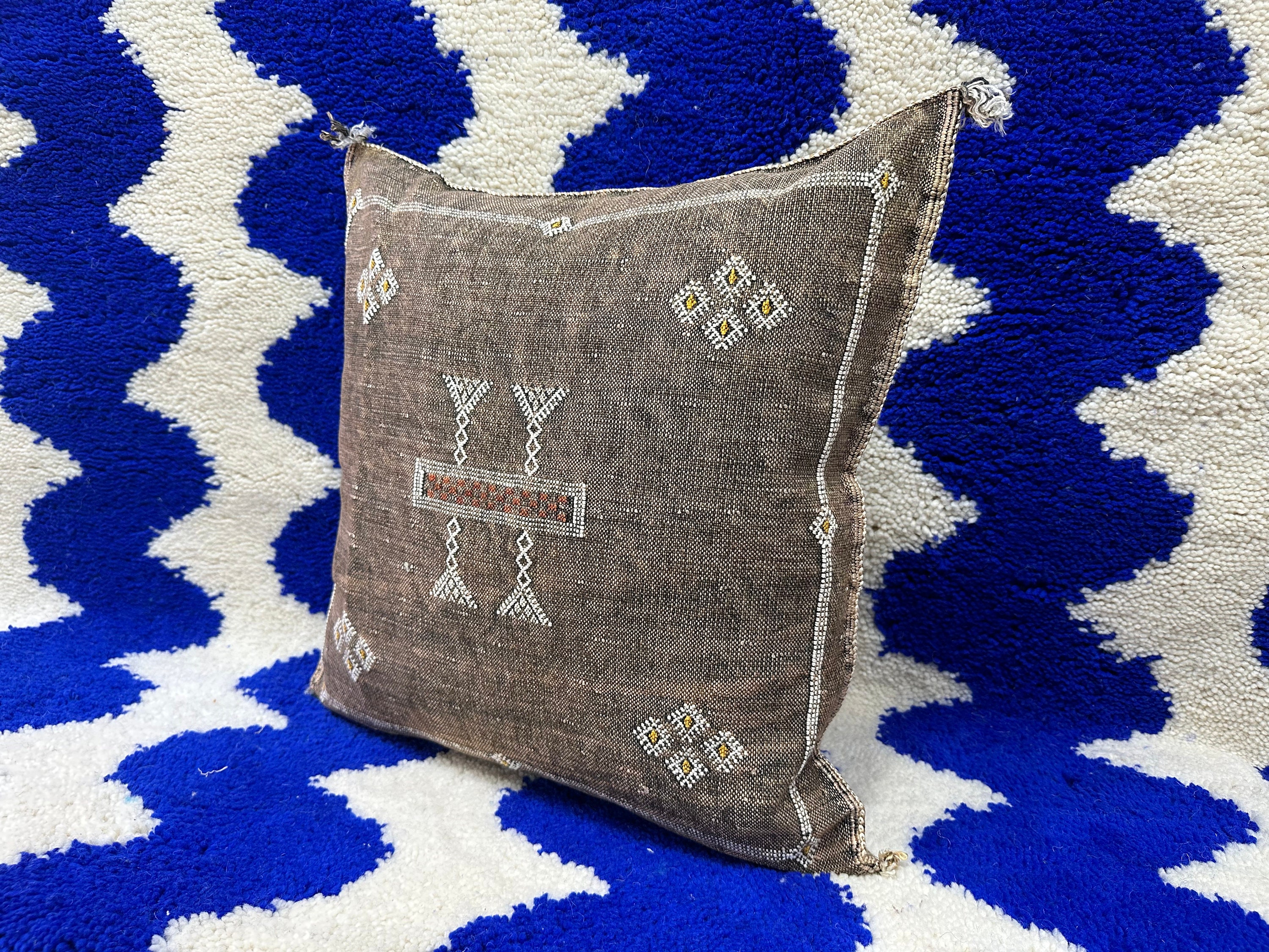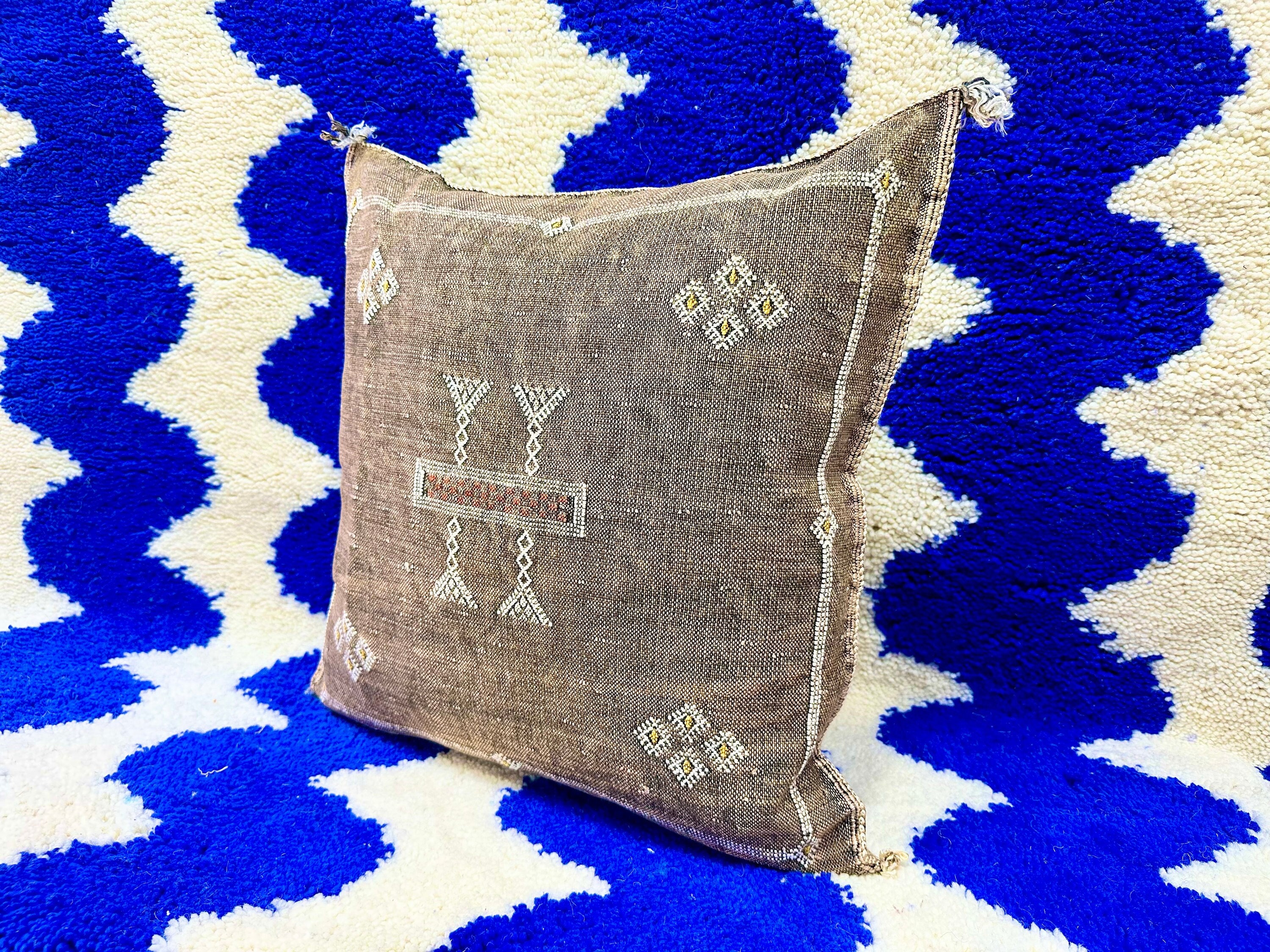 Authentic Moroccan cactus silk pillow, hand woven by Berber women in their own homes. These skilled artisans will take at least a day to weave this pillow on traditional wooden looms, a craft that has been handed down from mother to daughter over many centuries. Following our own design, the motifs on the pillow cover reflect traditional symbols used by tribal women from Morocco's Atlas Mountains.