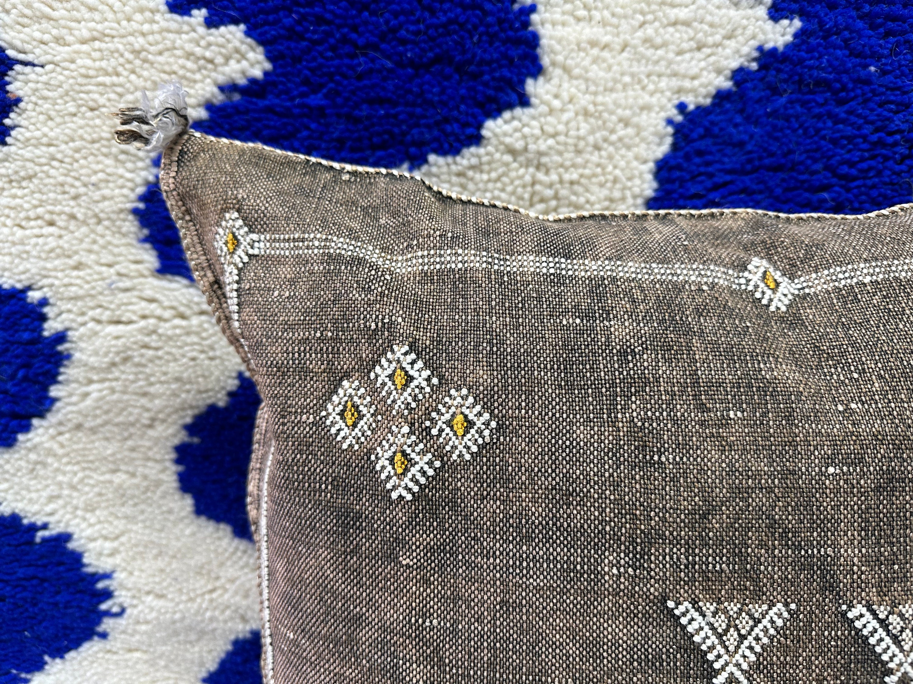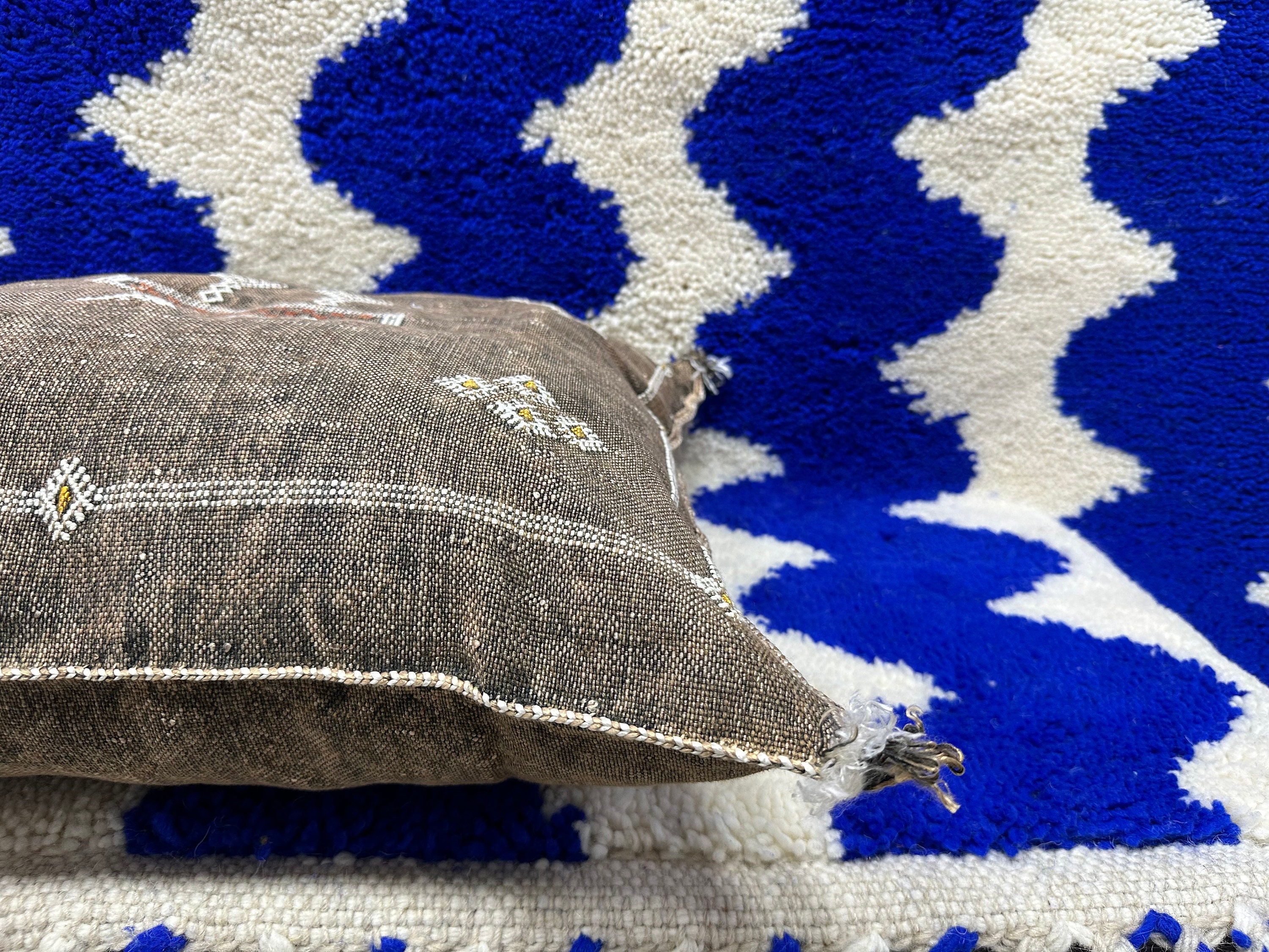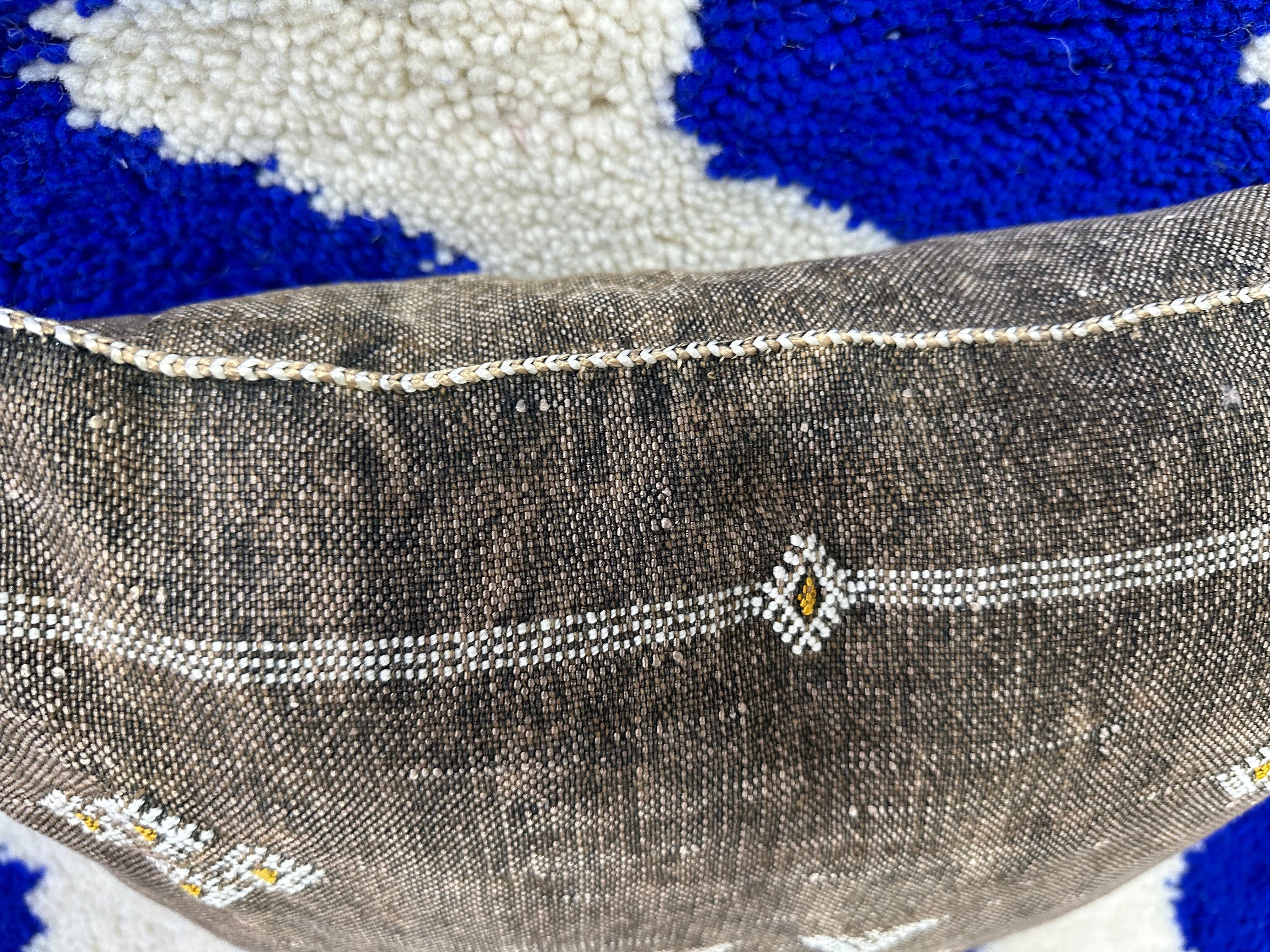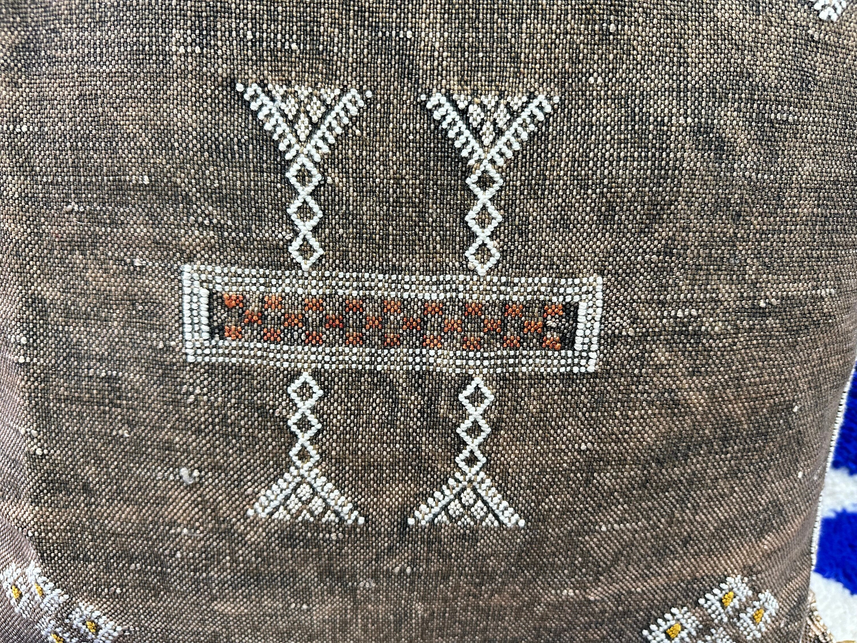 Authentic Moroccan cactus silk pillow, hand woven by Berber women in their own homes. These skilled artisans will take at least a day to weave this pillow on traditional wooden looms, a craft that has been handed down from mother to daughter over many centuries. Following our own design, the motifs on the pillow cover reflect traditional symbols used by tribal women from Morocco's Atlas Mountains.