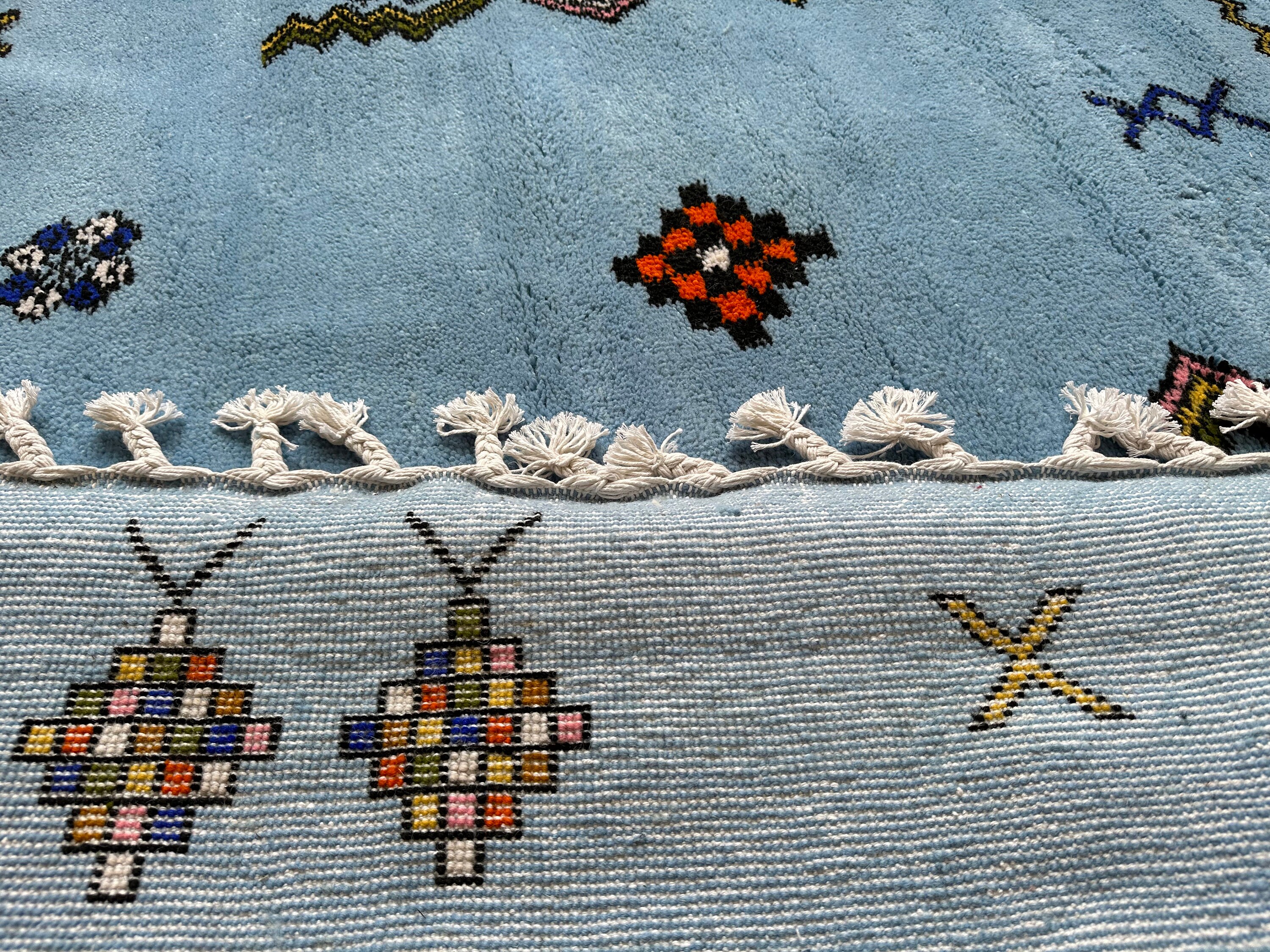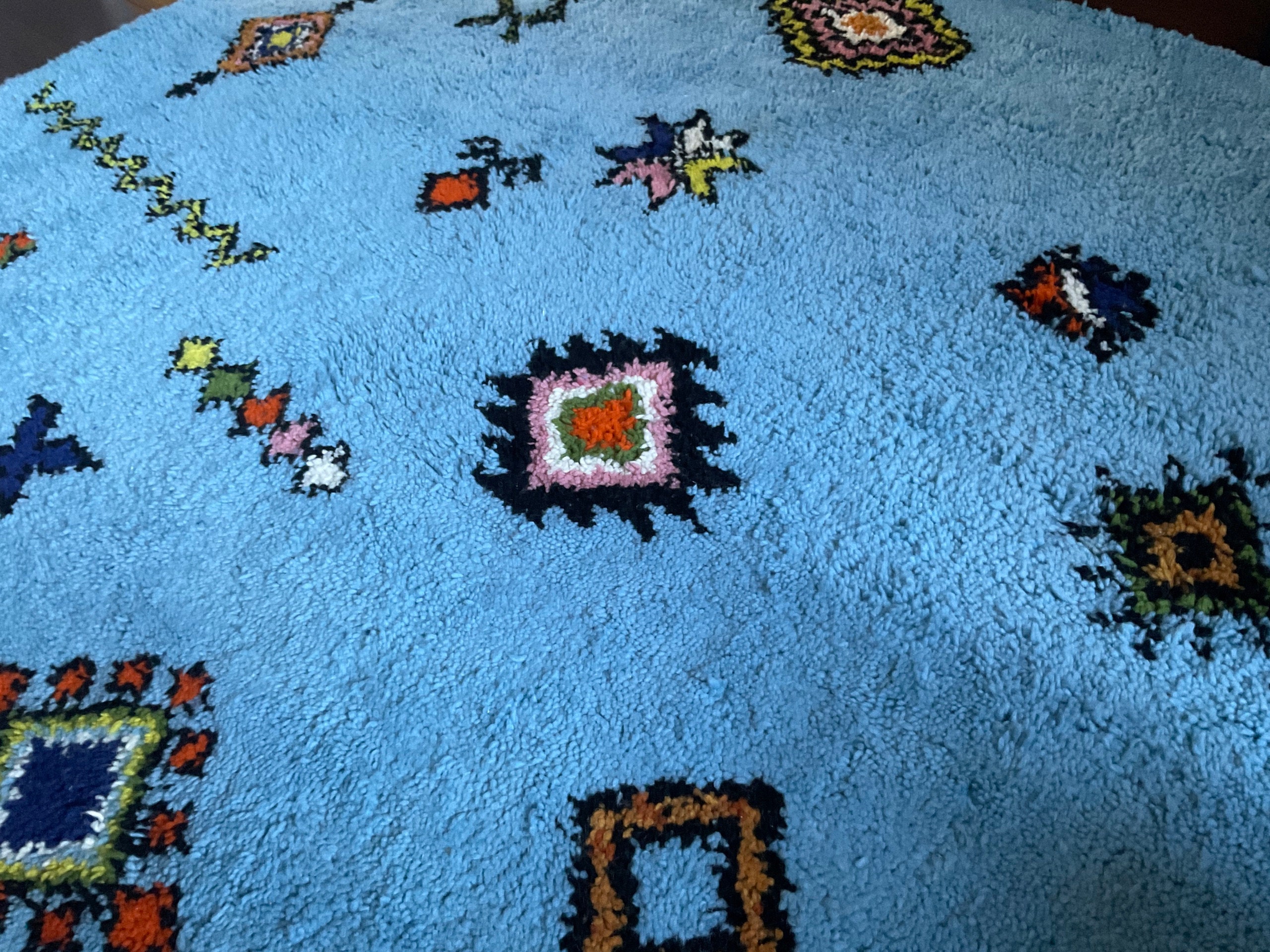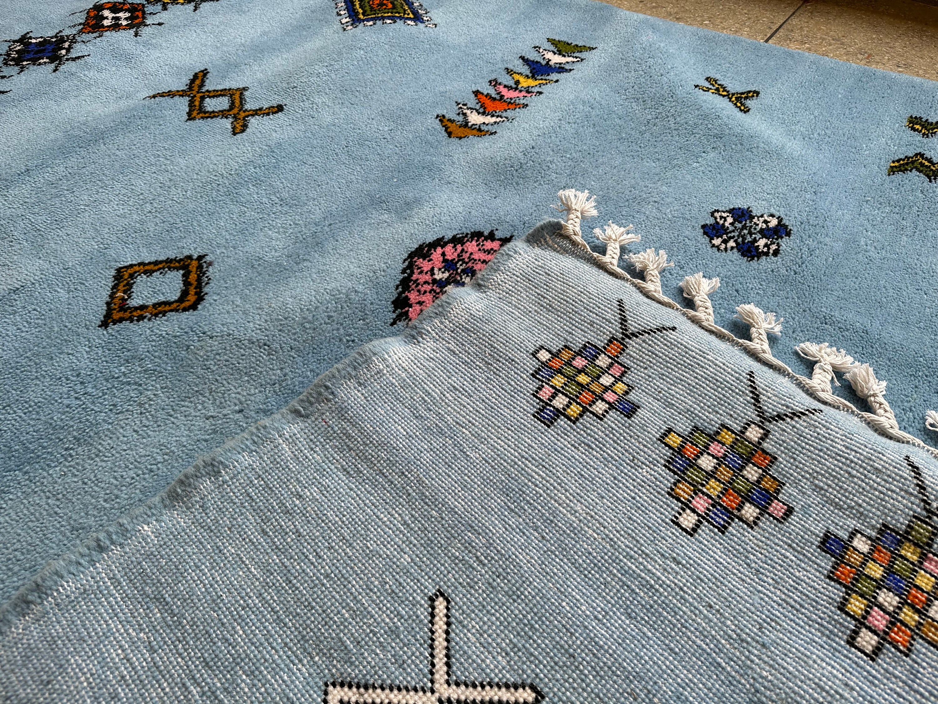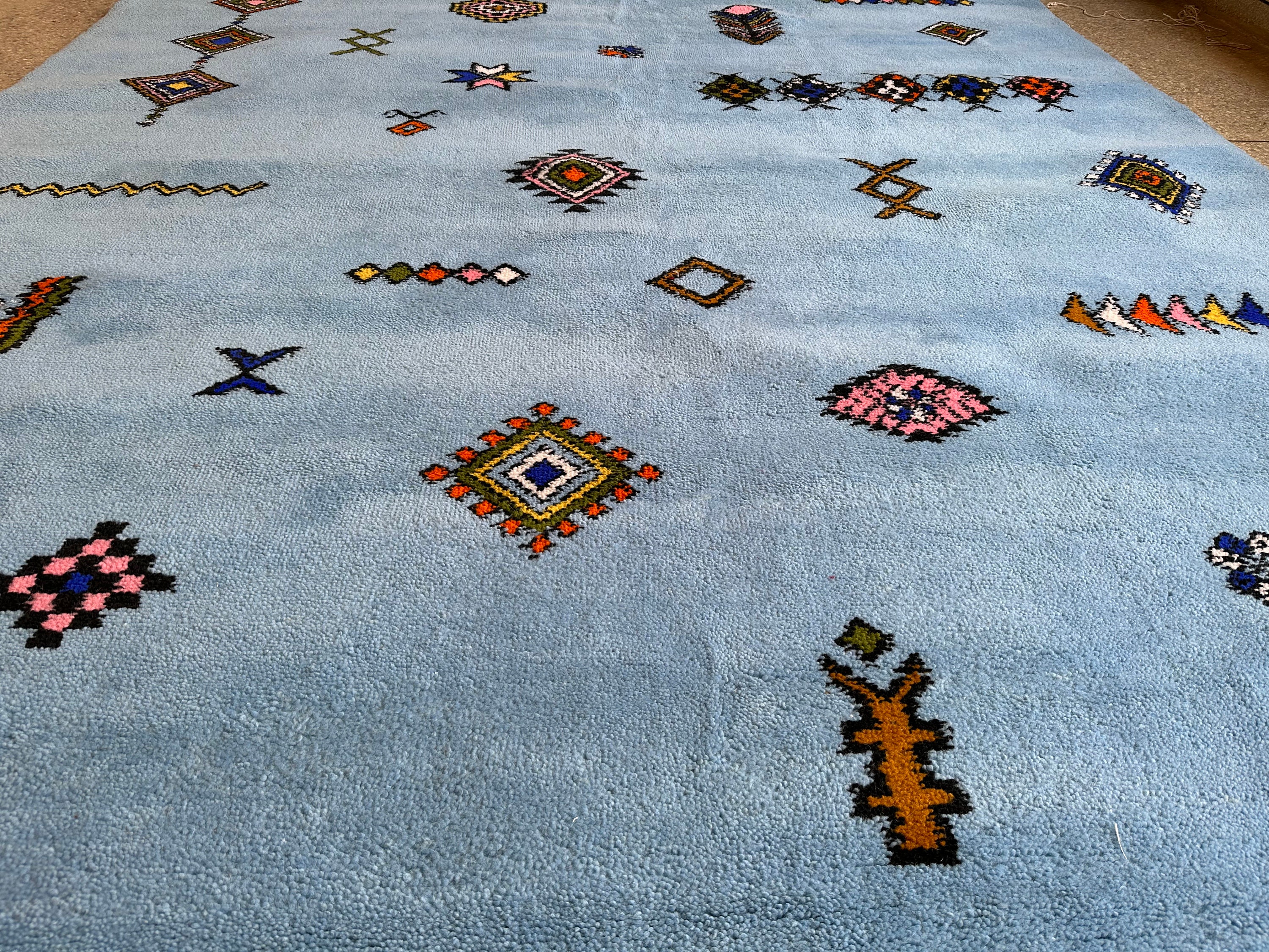 Add a touch of Moroccan charm to your home with this custom Beni Ourain rug. The unique blue abstract design gives a contemporary twist to the traditional Berber area rug. Handcrafted with wool, this rug combines comfort with style effortlessly. Perfect for adding warmth and personality to any space!