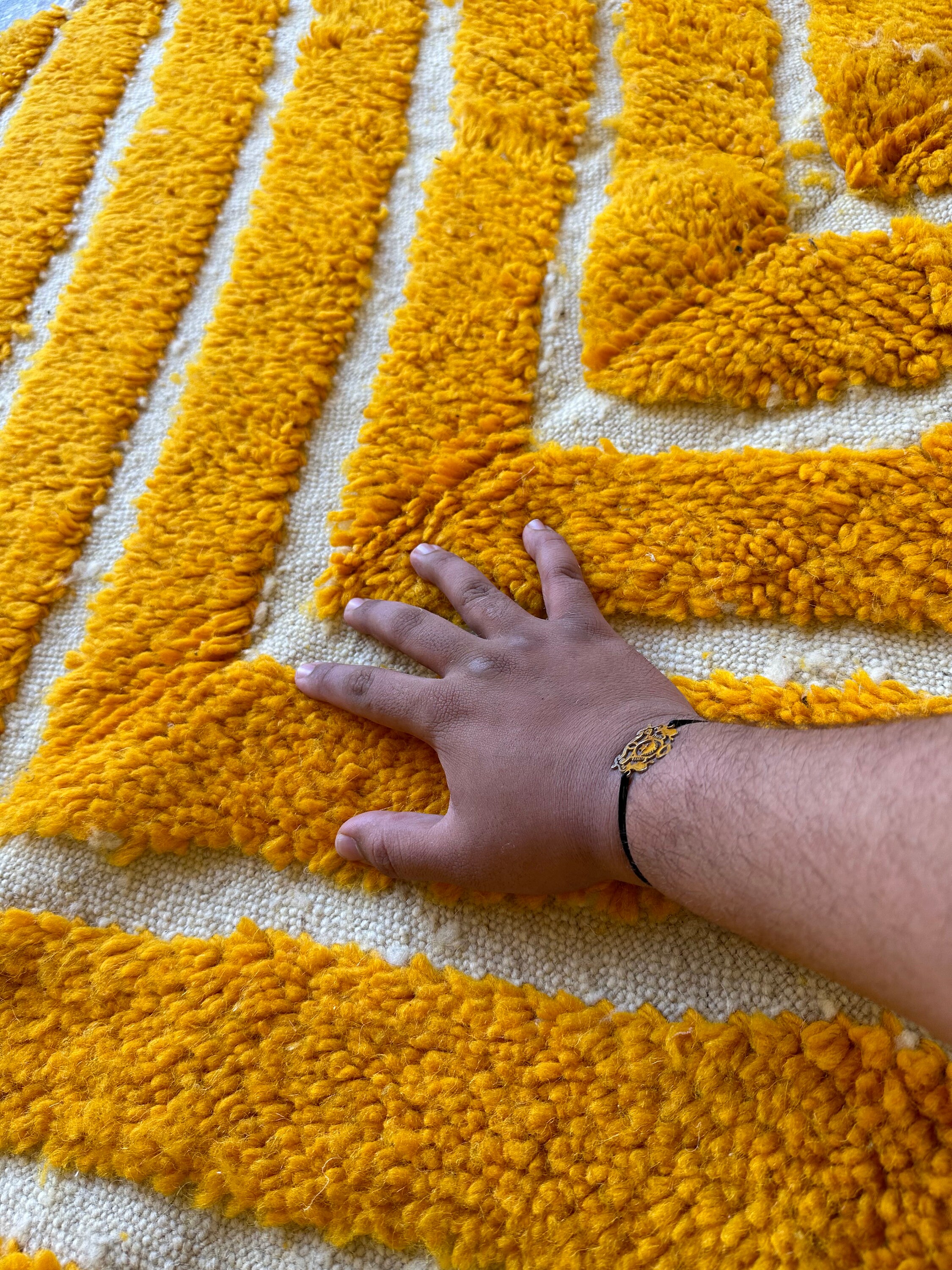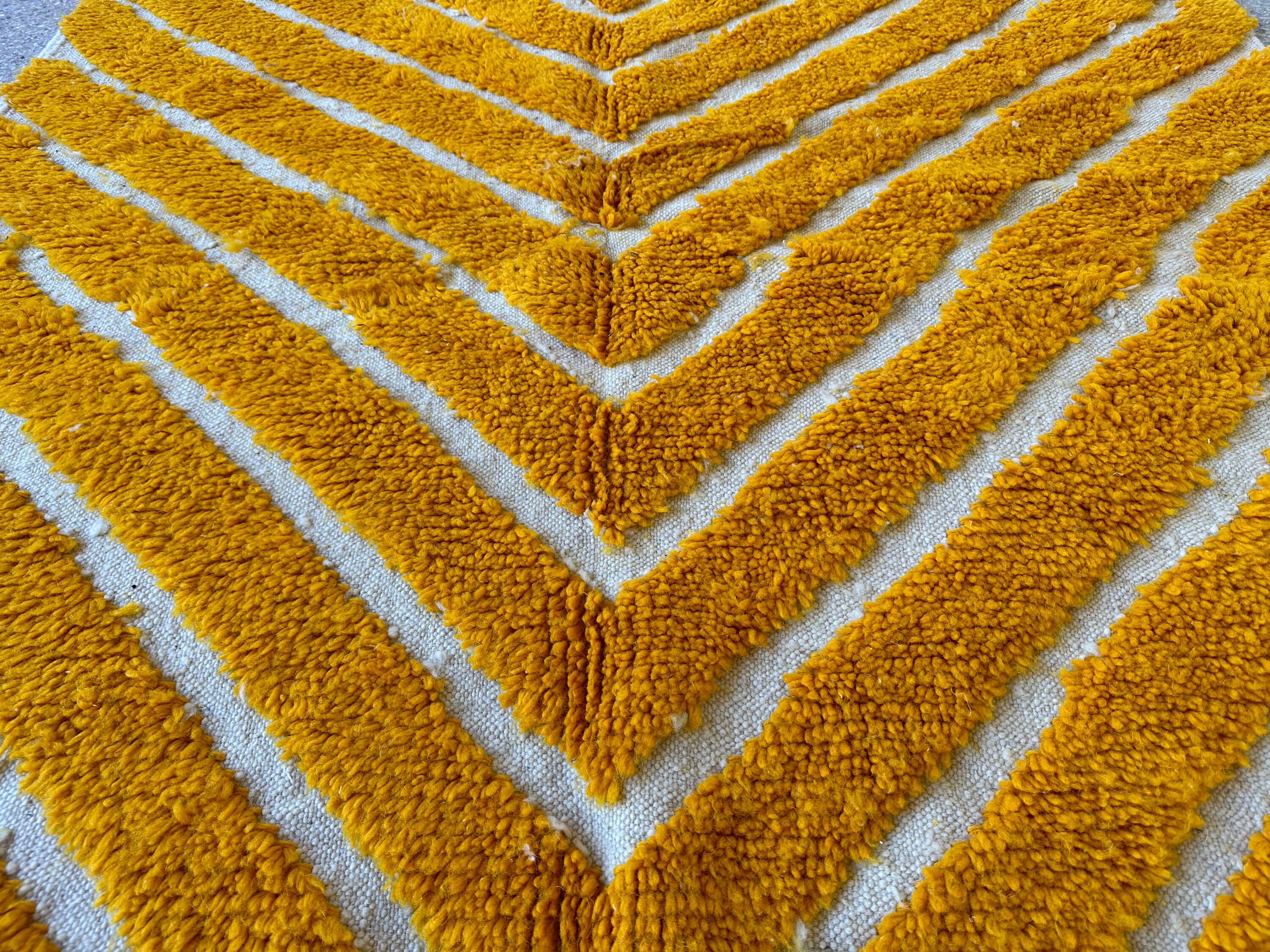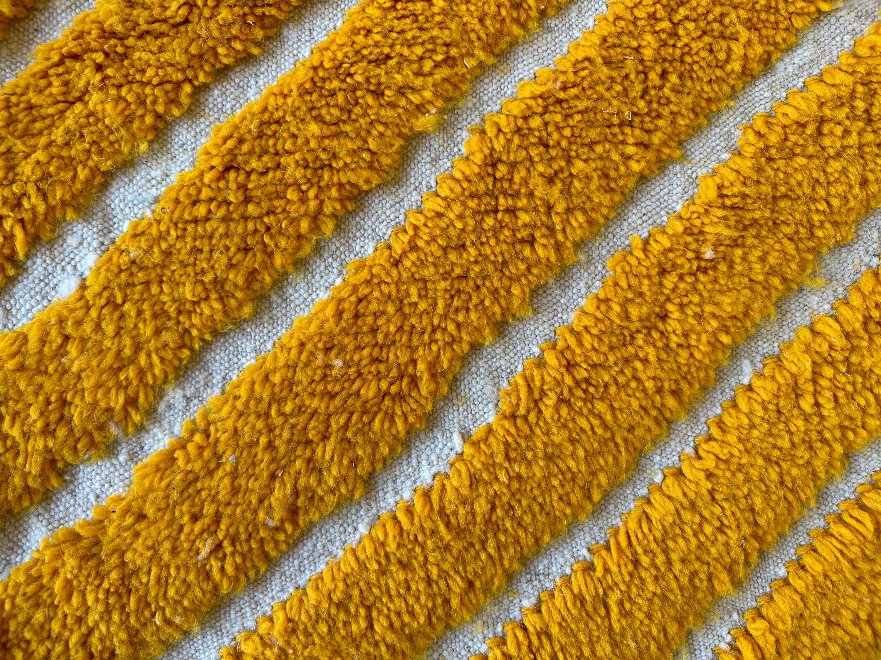 Transform your space with our stunning Yellow Area Rug, a perfect blend of retro charm and modern style. This handmade Shag Carpet features a unique striped pattern, inspired by traditional Beni Ourain designs using soft wool for ultimate comfort. Ideal as a custom Moroccan rug or a vibrant floor accent, it adds warmth and character to any room. Elevate your decor with this eye-catching striped pattern Berber rug that effortlessly combines elegance and coziness. Perfect for living rooms, bedrooms, or any chic space!