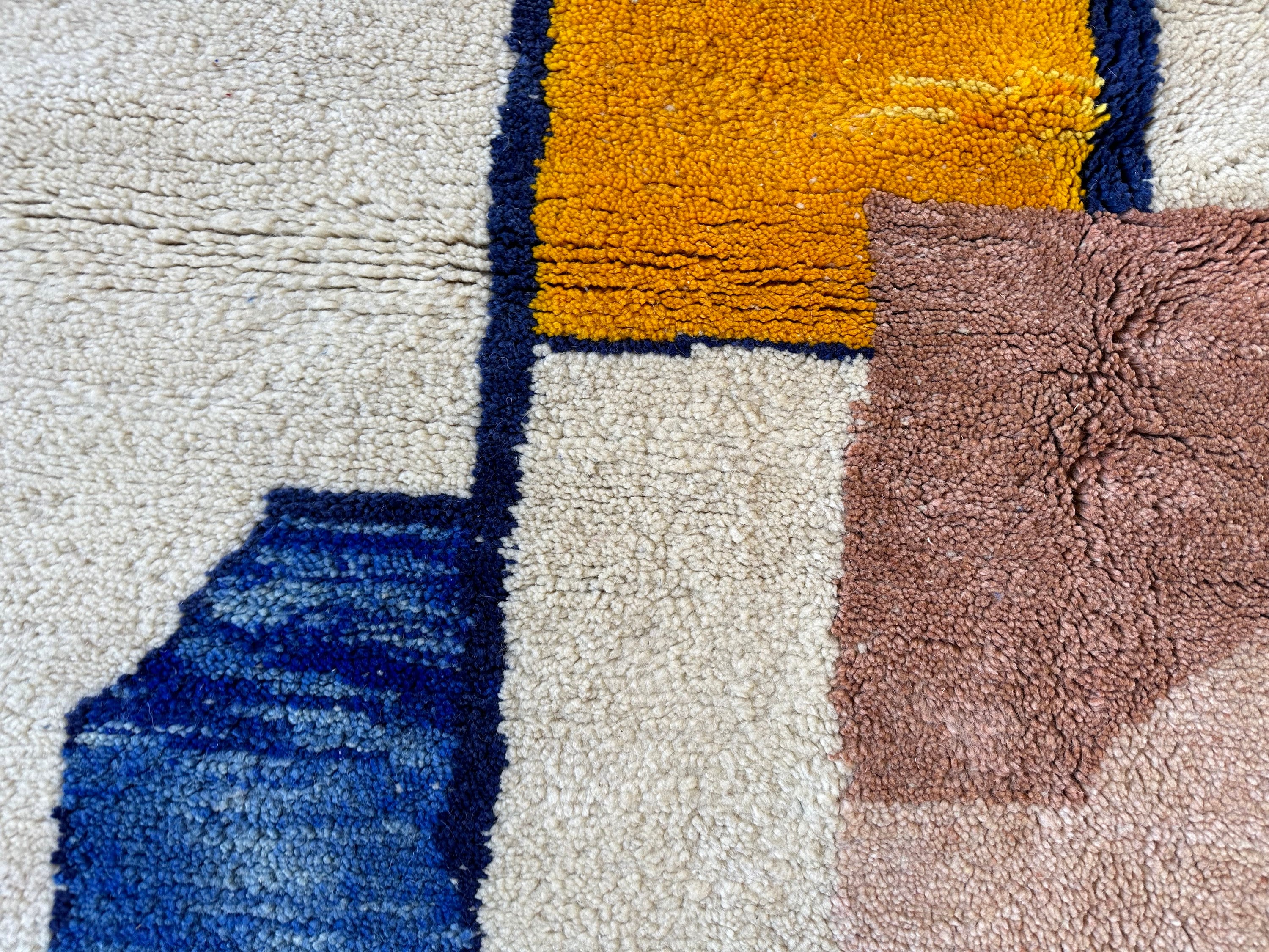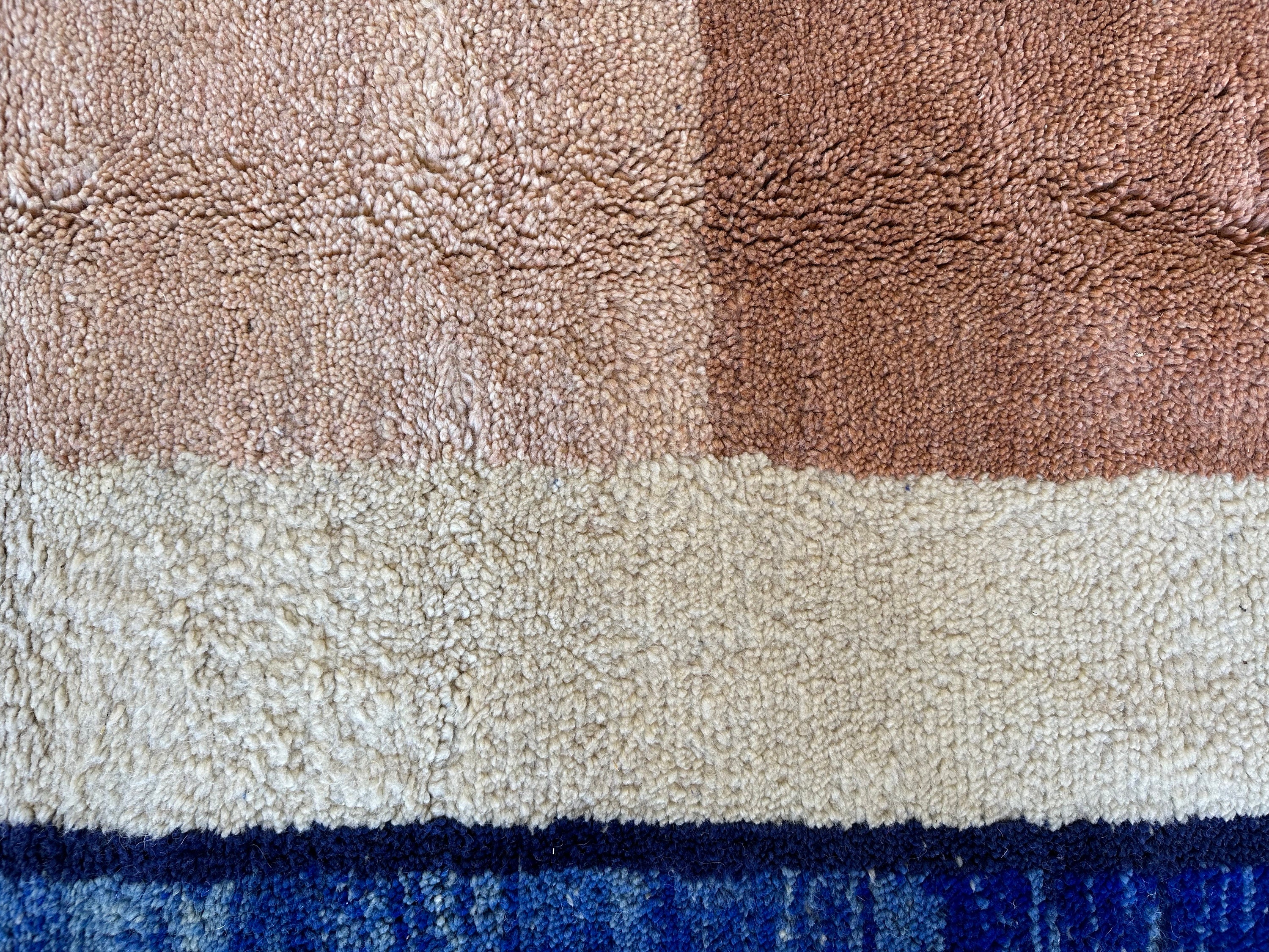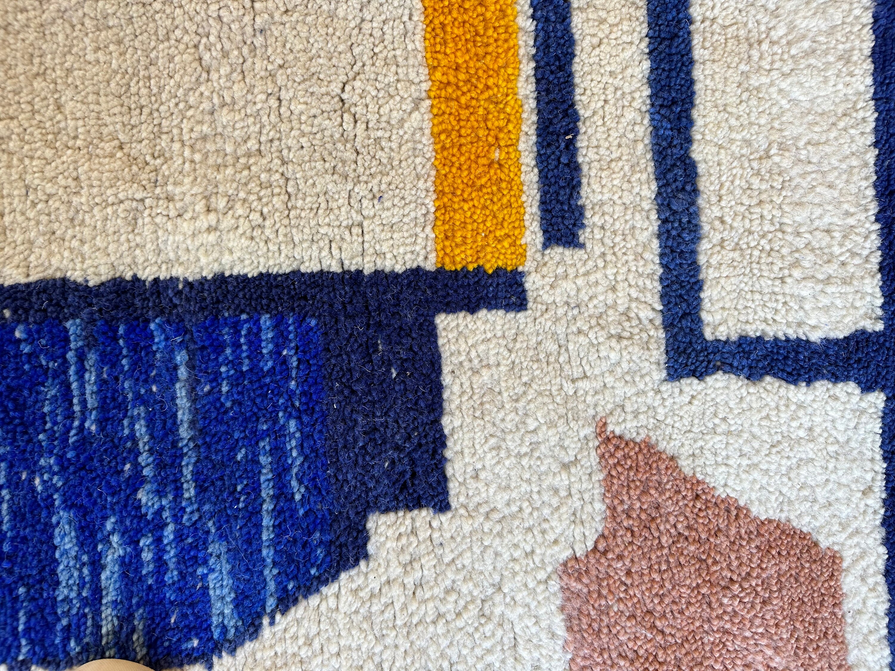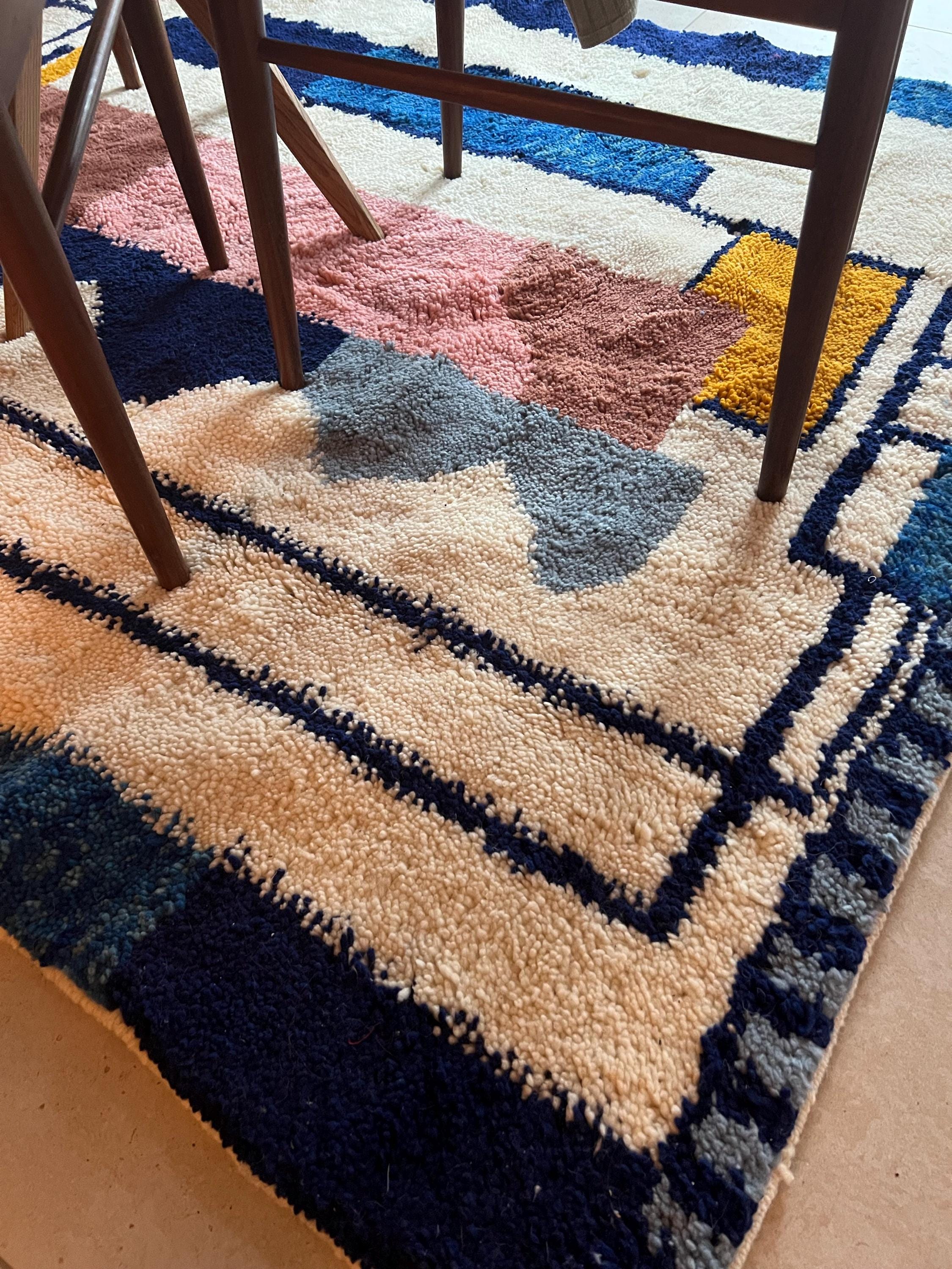 Add a touch of Moroccan charm to your space with this unique BENI OURAIN RUG. Handmade with love, this Contemporary Berber Carpet features a beautiful abstract blue design on a white background. Customizable to fit your style, this one-of-a-kind piece is the perfect addition to any home decor. Crafted from high-quality wool, this Moroccan beauty brings warmth and character to any room. Elevate your space with this stunning statement piece today!