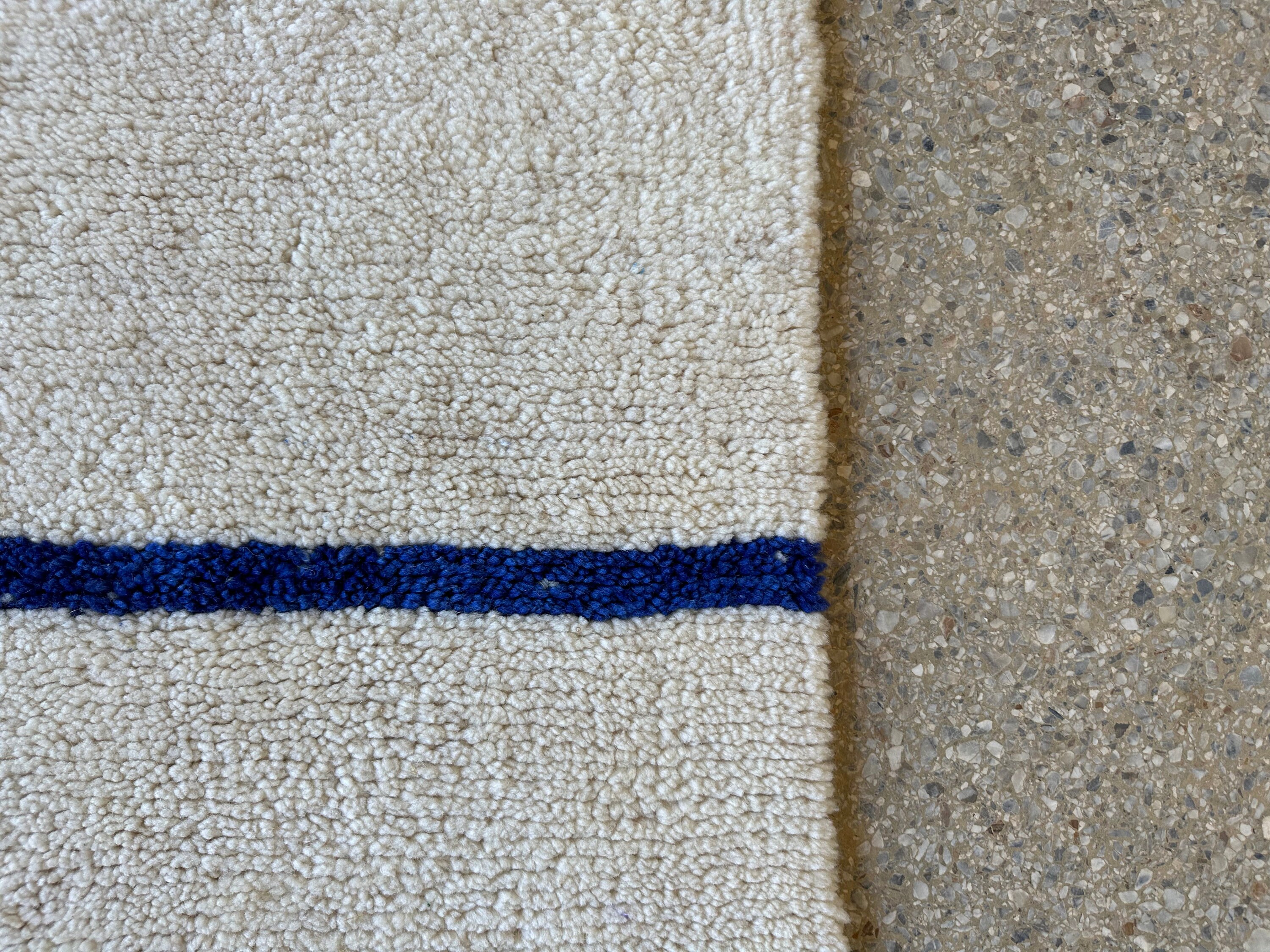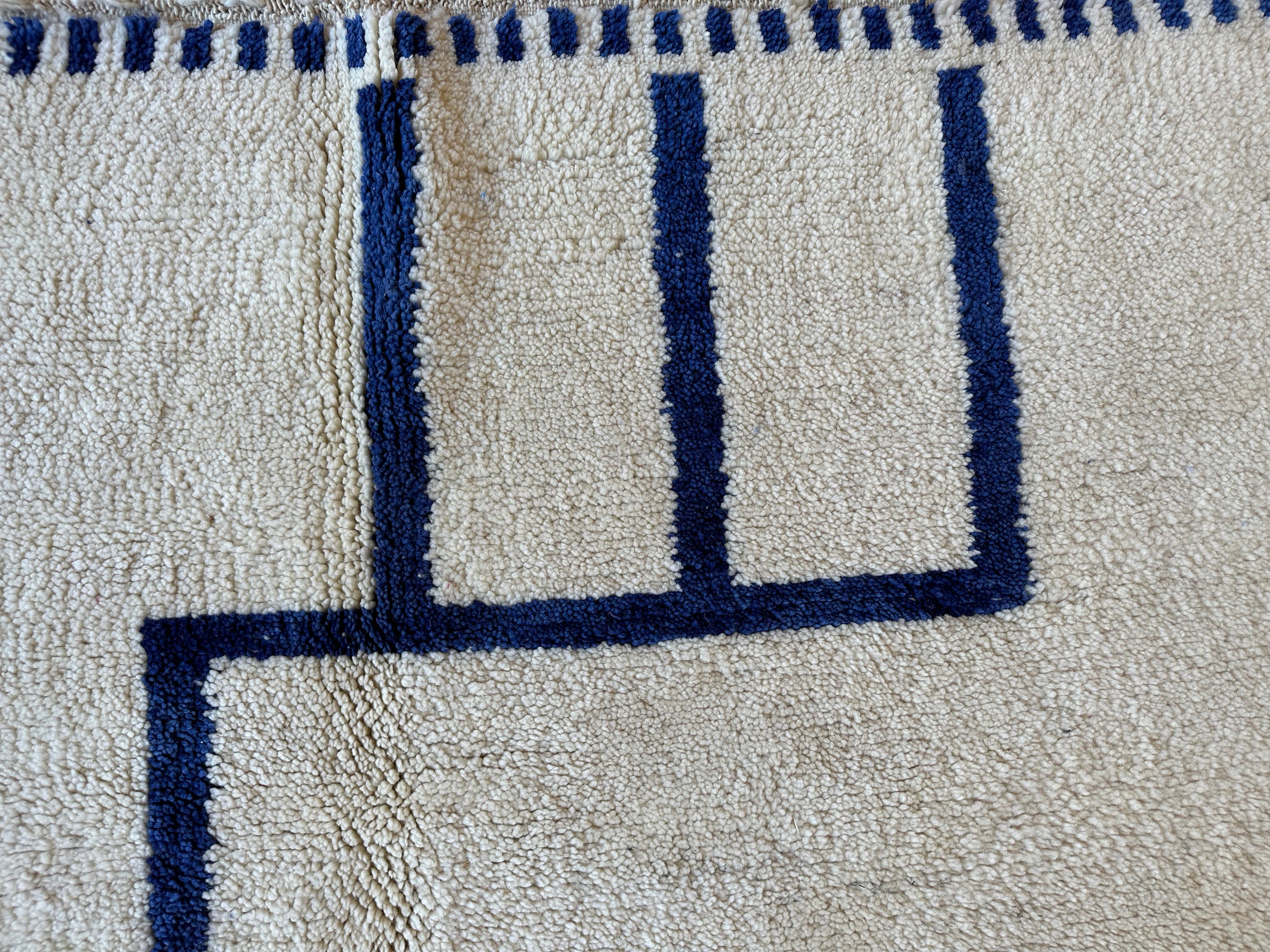Elevate your space with this minimalist Moroccan rug, featuring abstract white and blue stripes. Handwoven from premium soft wool, this Beni Ourain rug adds warmth and elegance to any bedroom, living room, nursery, or kids' room.