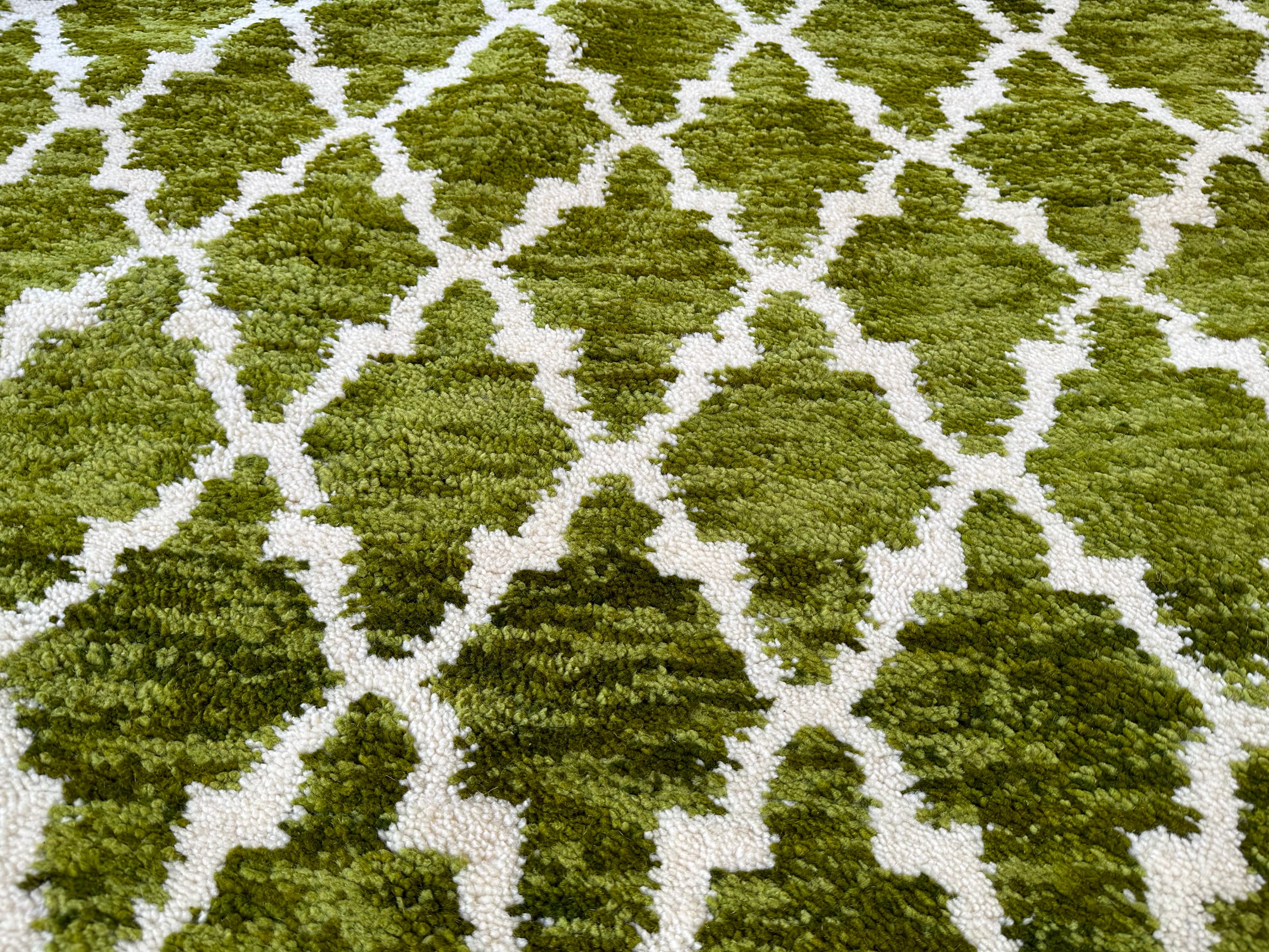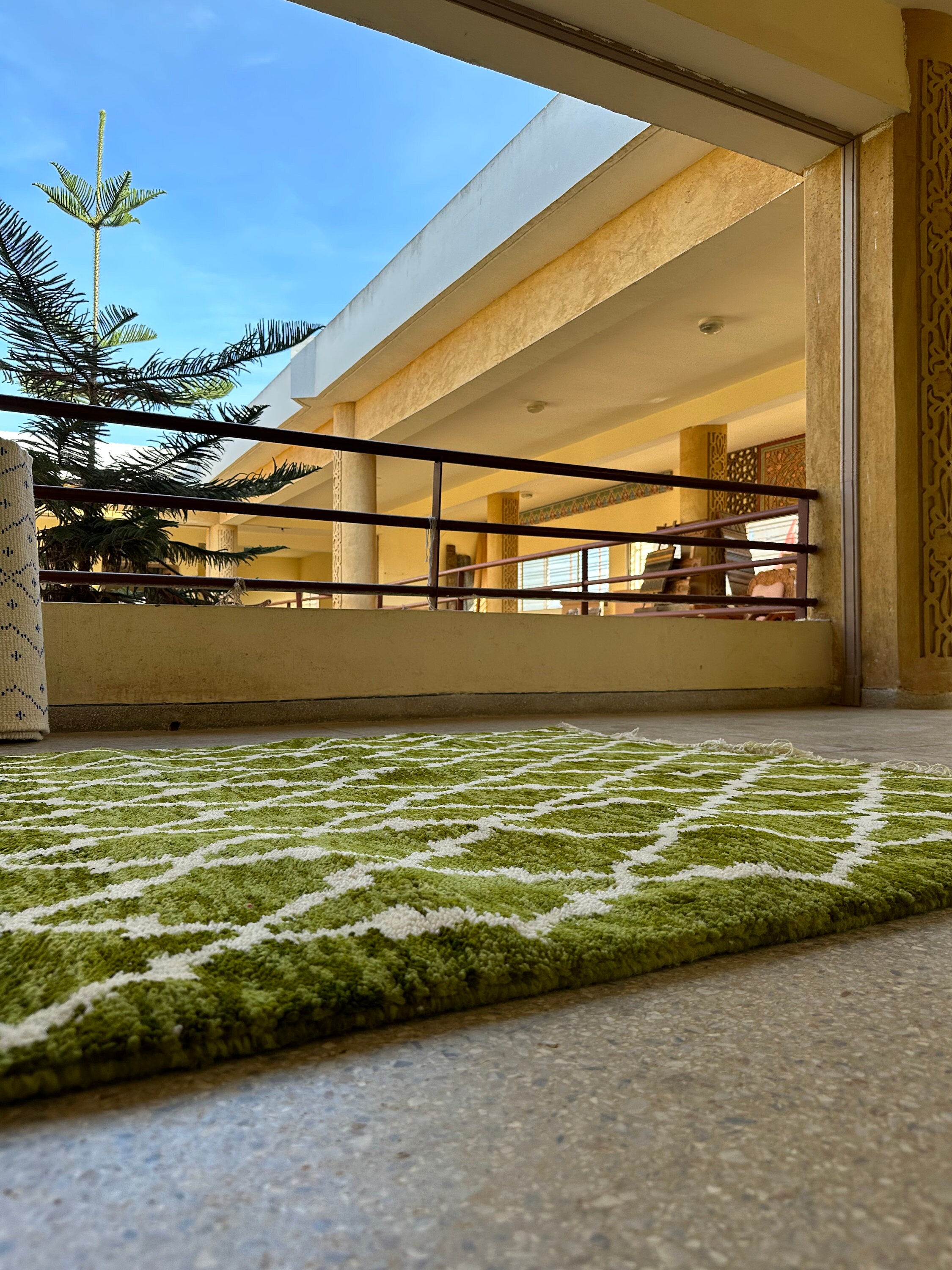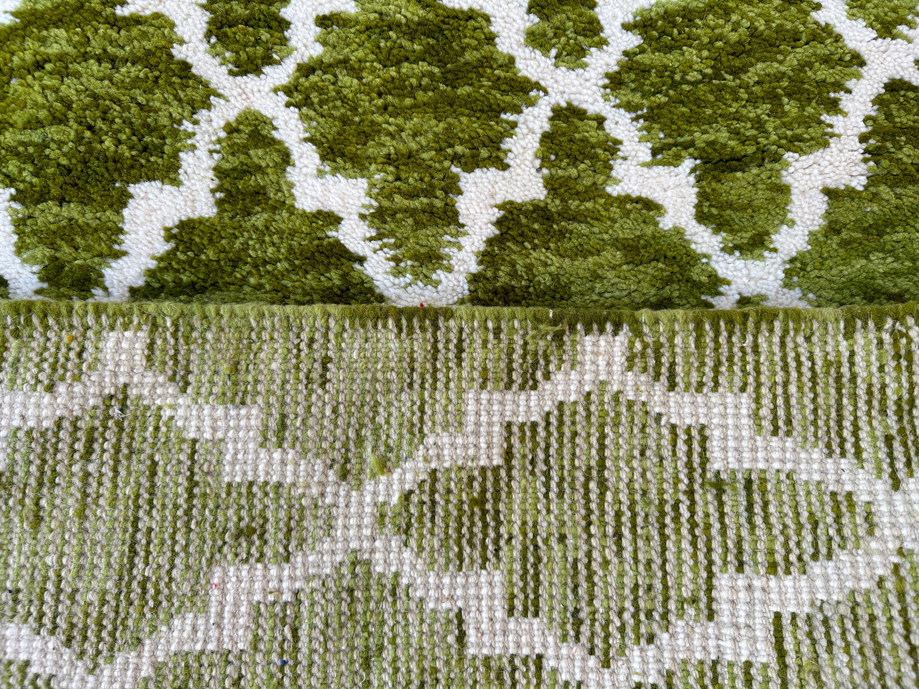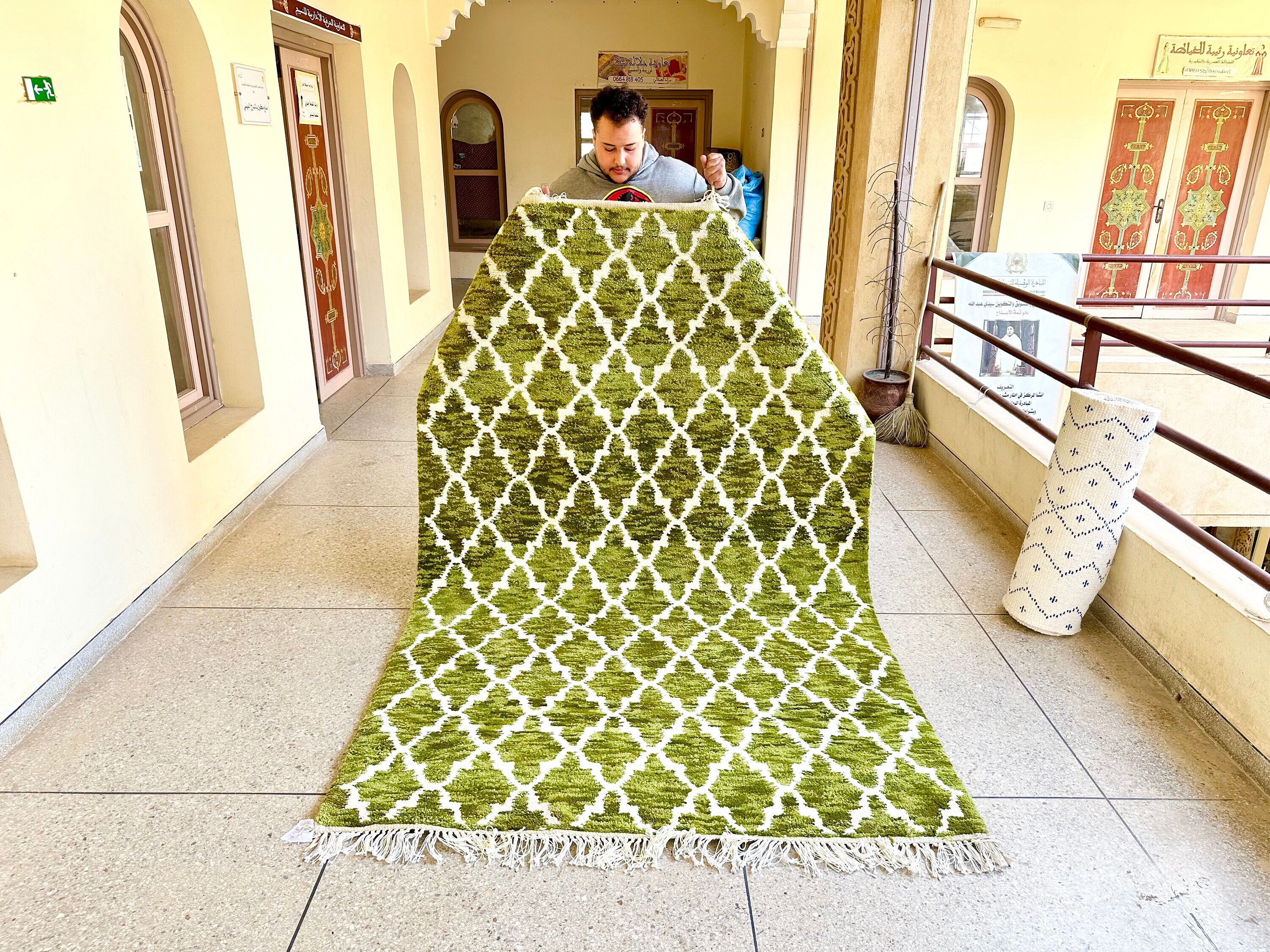 Add a fresh and modern touch to your home with this green and white Beni Ourain rug. Handmade by Berber artisans using soft wool, this geometric area rug is perfect for modern decor. Its timeless design and eco-friendly materials make it a sustainable and stylish choice for any space. Elevate your decor with this luxurious, artisan-crafted Moroccan rug today!