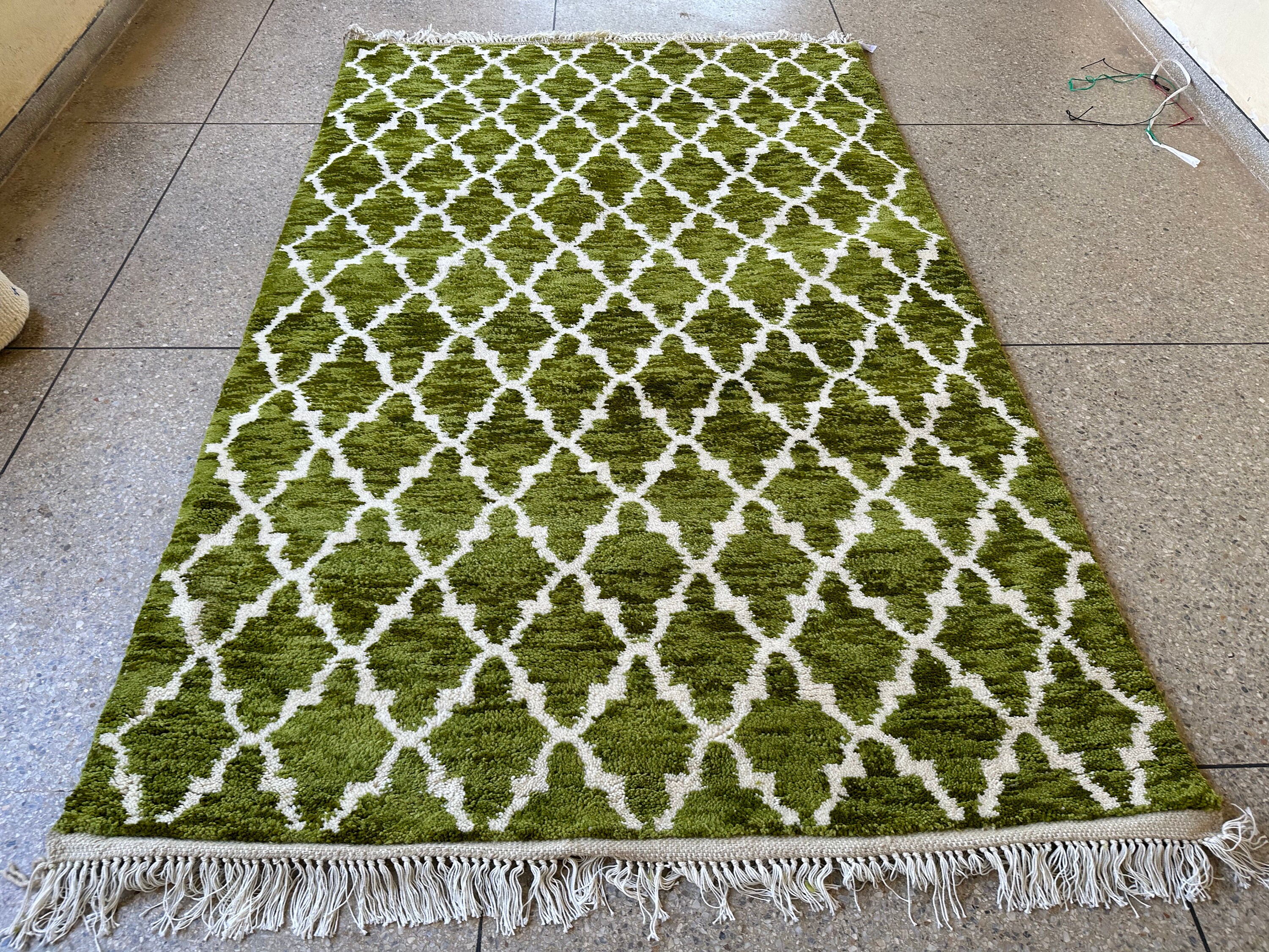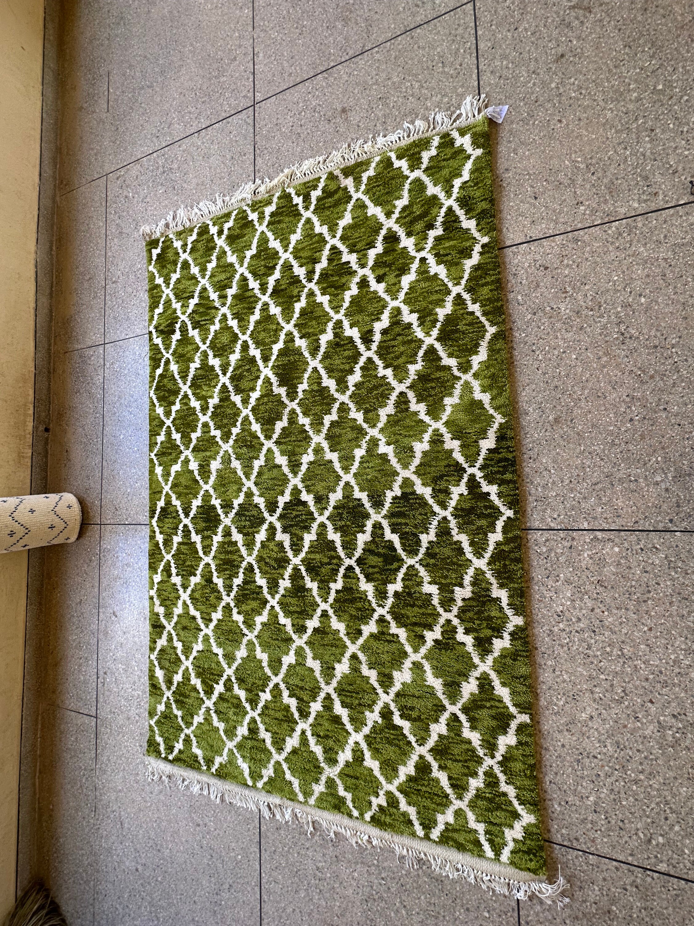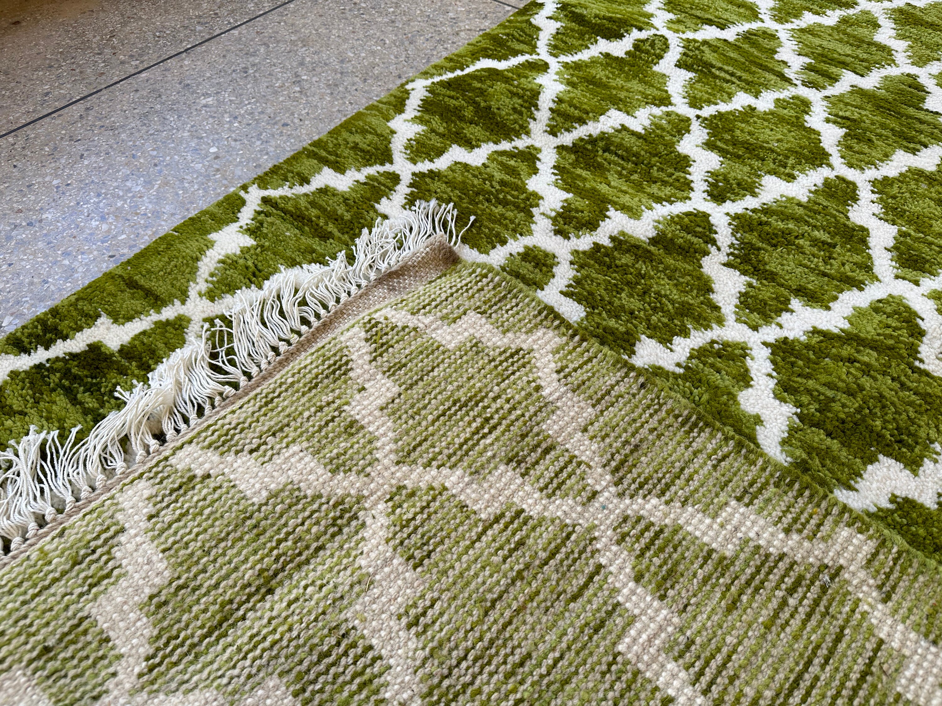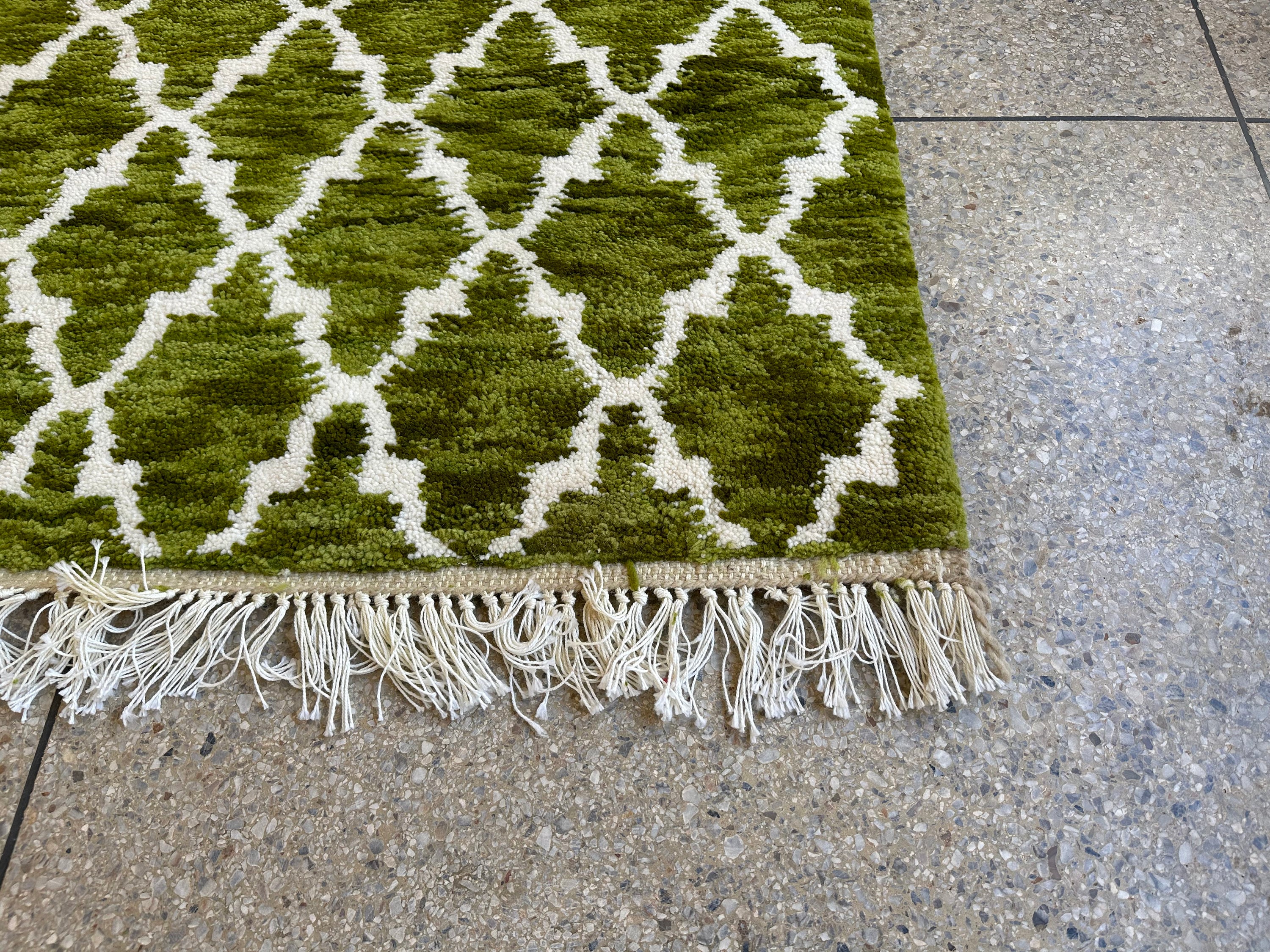 Add a fresh and modern touch to your home with this green and white Beni Ourain rug. Handmade by Berber artisans using soft wool, this geometric area rug is perfect for modern decor. Its timeless design and eco-friendly materials make it a sustainable and stylish choice for any space. Elevate your decor with this luxurious, artisan-crafted Moroccan rug today!