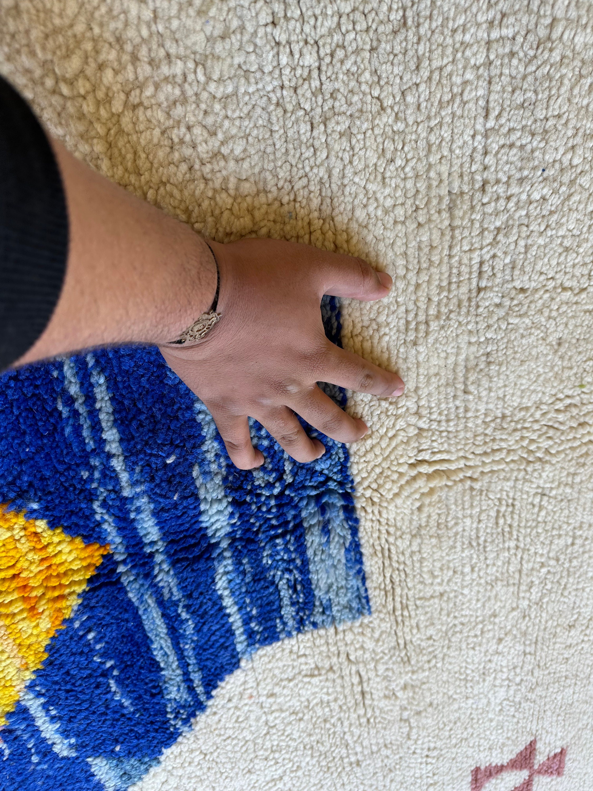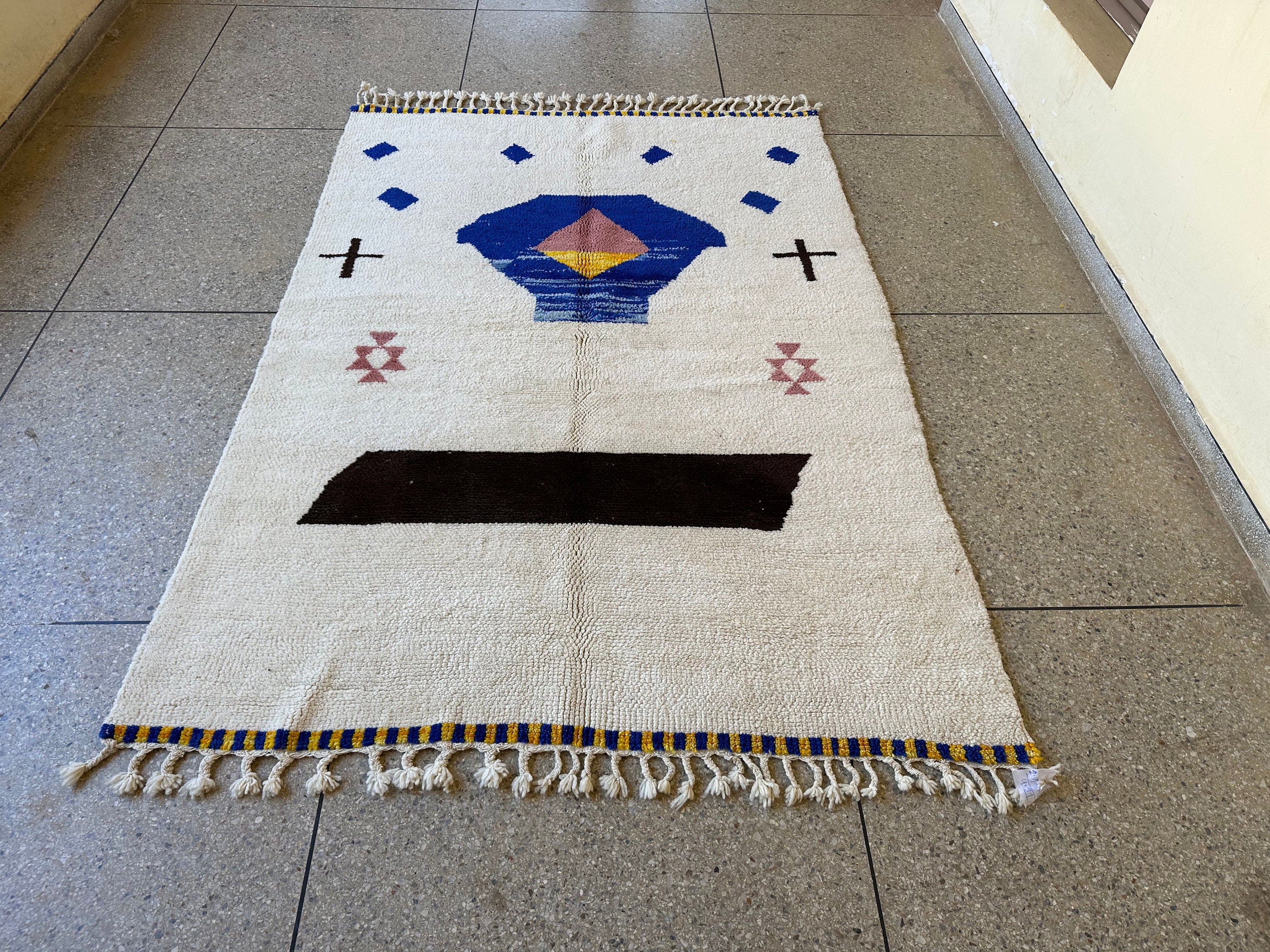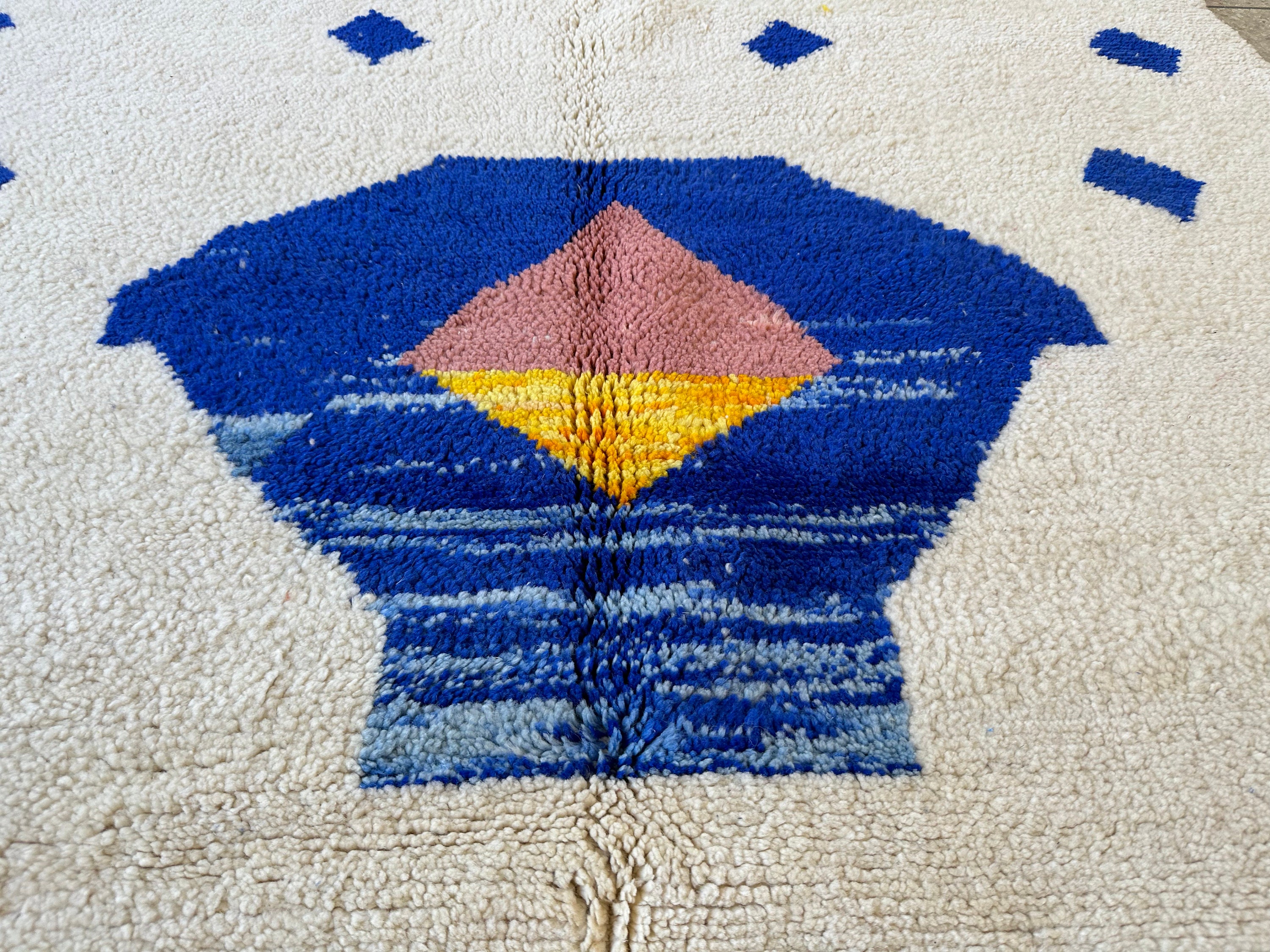 This White and Blue Abstract Moroccan Beni Ourain Rug is a stunning handwoven wool rug, featuring a unique blend of traditional Berber craftsmanship and modern artistic design. Perfect for bohemian and eclectic interiors, this custom area rug adds warmth, softness, and texture to your living room or bedroom. Its vibrant colors and abstract patterns make it a standout piece in any space.