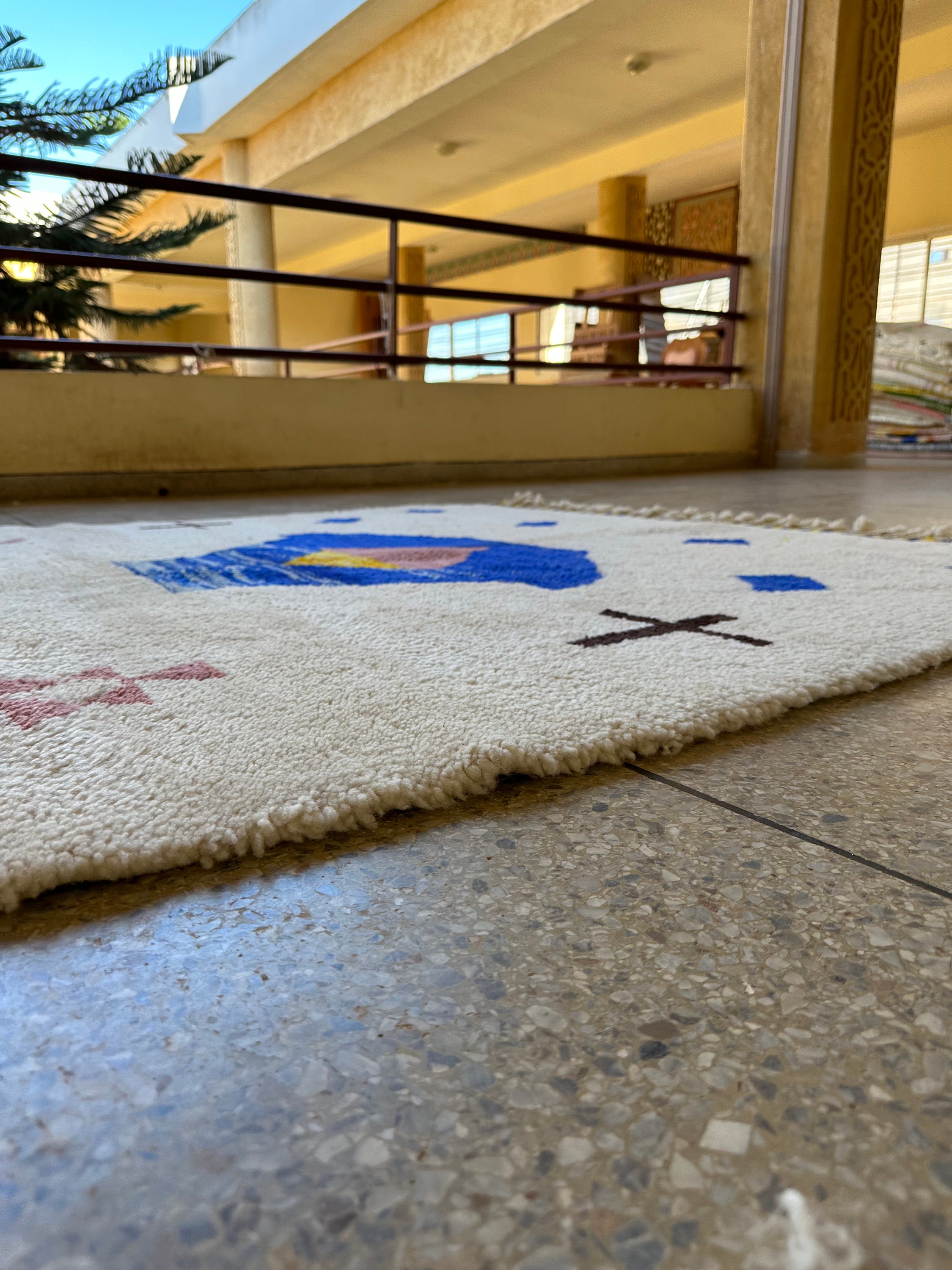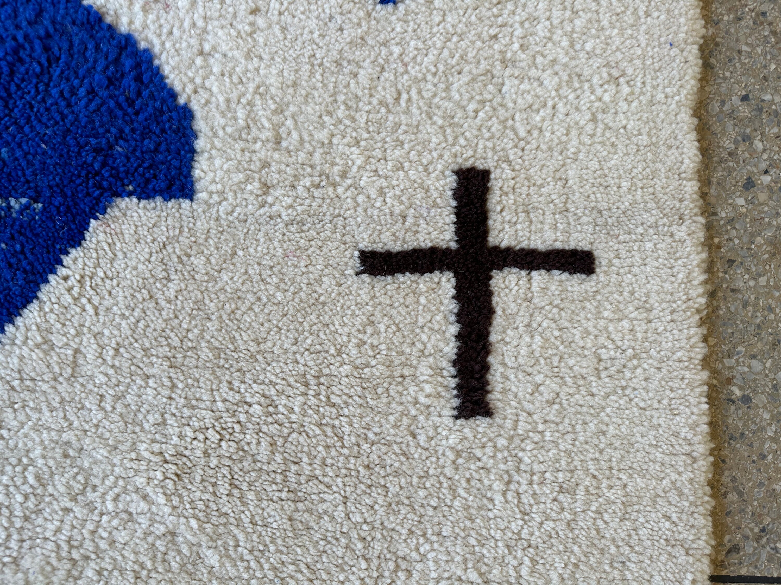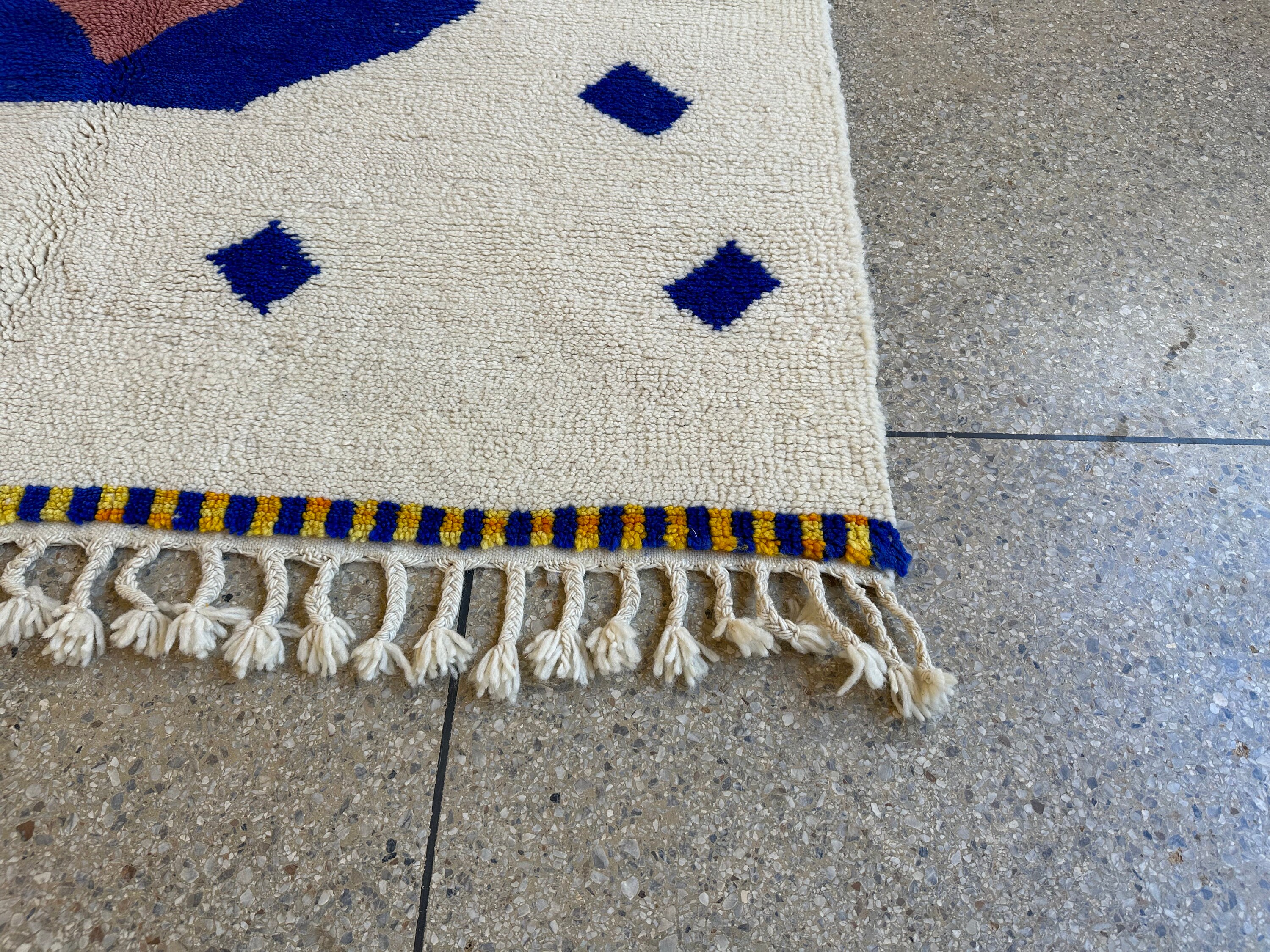 This White and Blue Abstract Moroccan Beni Ourain Rug is a stunning handwoven wool rug, featuring a unique blend of traditional Berber craftsmanship and modern artistic design. Perfect for bohemian and eclectic interiors, this custom area rug adds warmth, softness, and texture to your living room or bedroom. Its vibrant colors and abstract patterns make it a standout piece in any space.