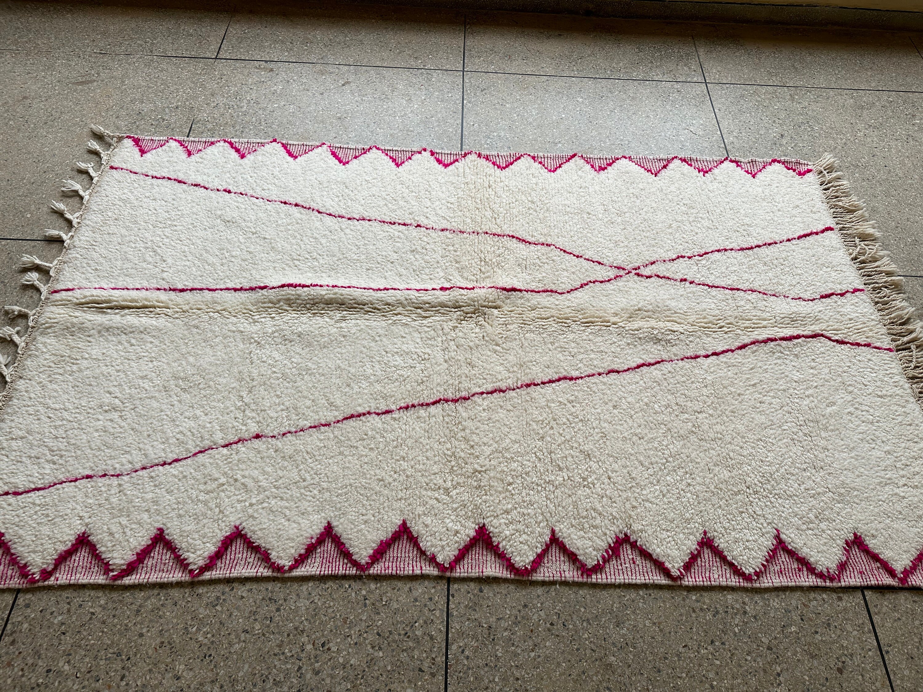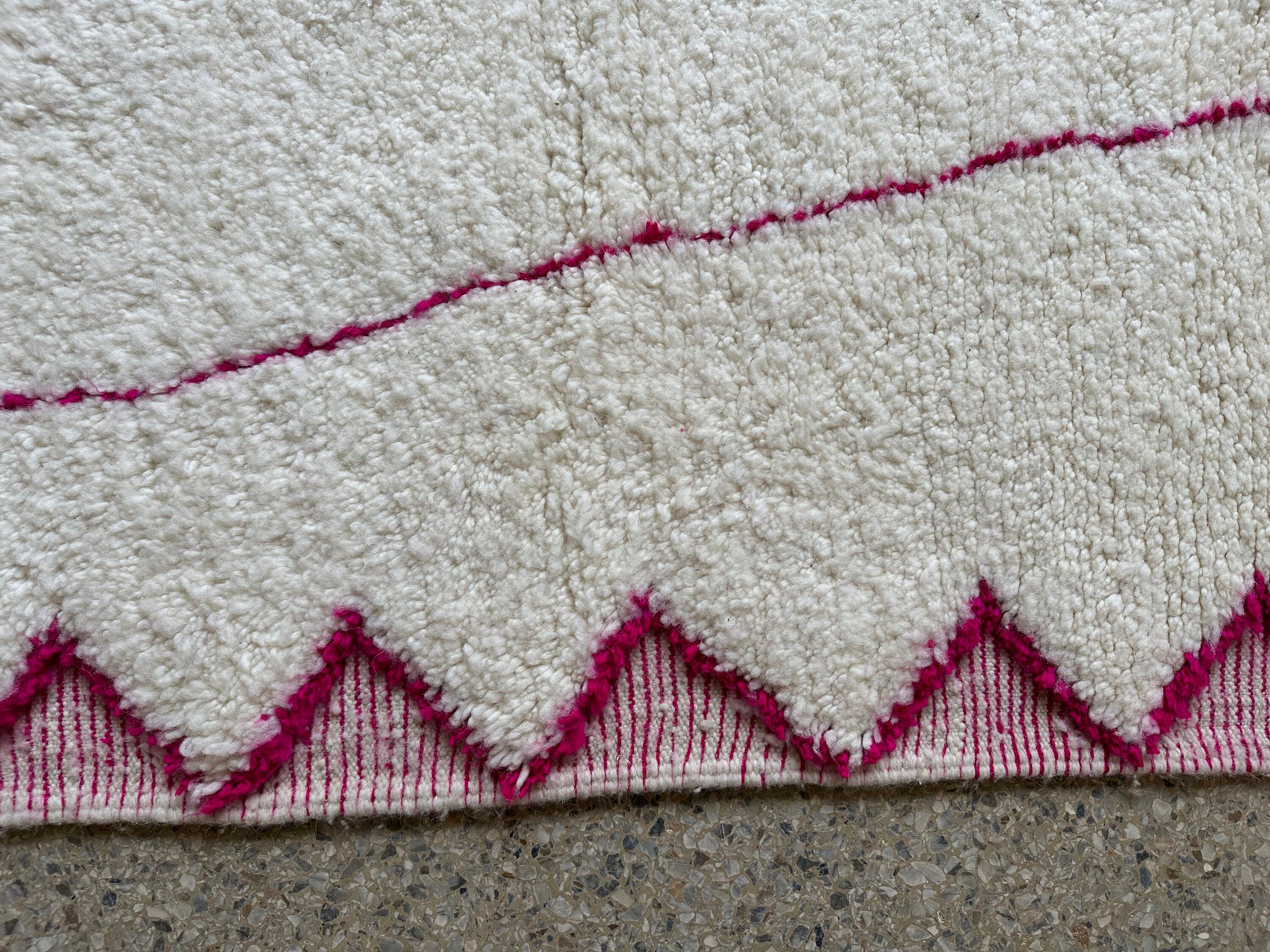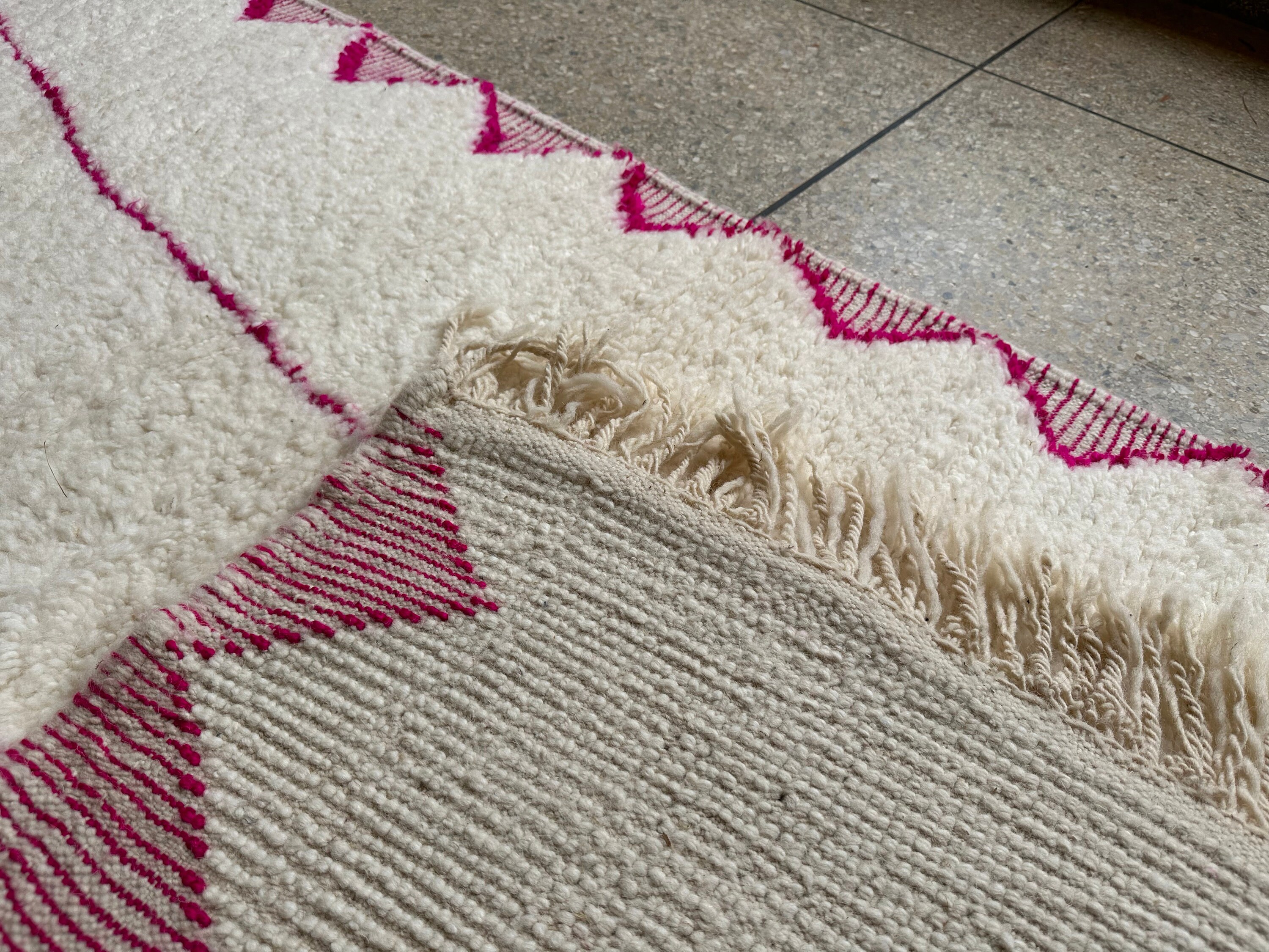 Add a touch of Moroccan elegance to your home with this hand-tufted Beni Ourain rug. Crafted from 100% natural sheep wool, this pink and white rug is soft, durable, and perfect for modern or boho-chic interiors. Its minimalist design complements any decor, while the plush texture adds warmth and comfort to your living room or bedroom. Handmade by skilled artisans, this eco-friendly rug is a unique and sustainable choice for your home. Transform your space with this timeless piece today!
