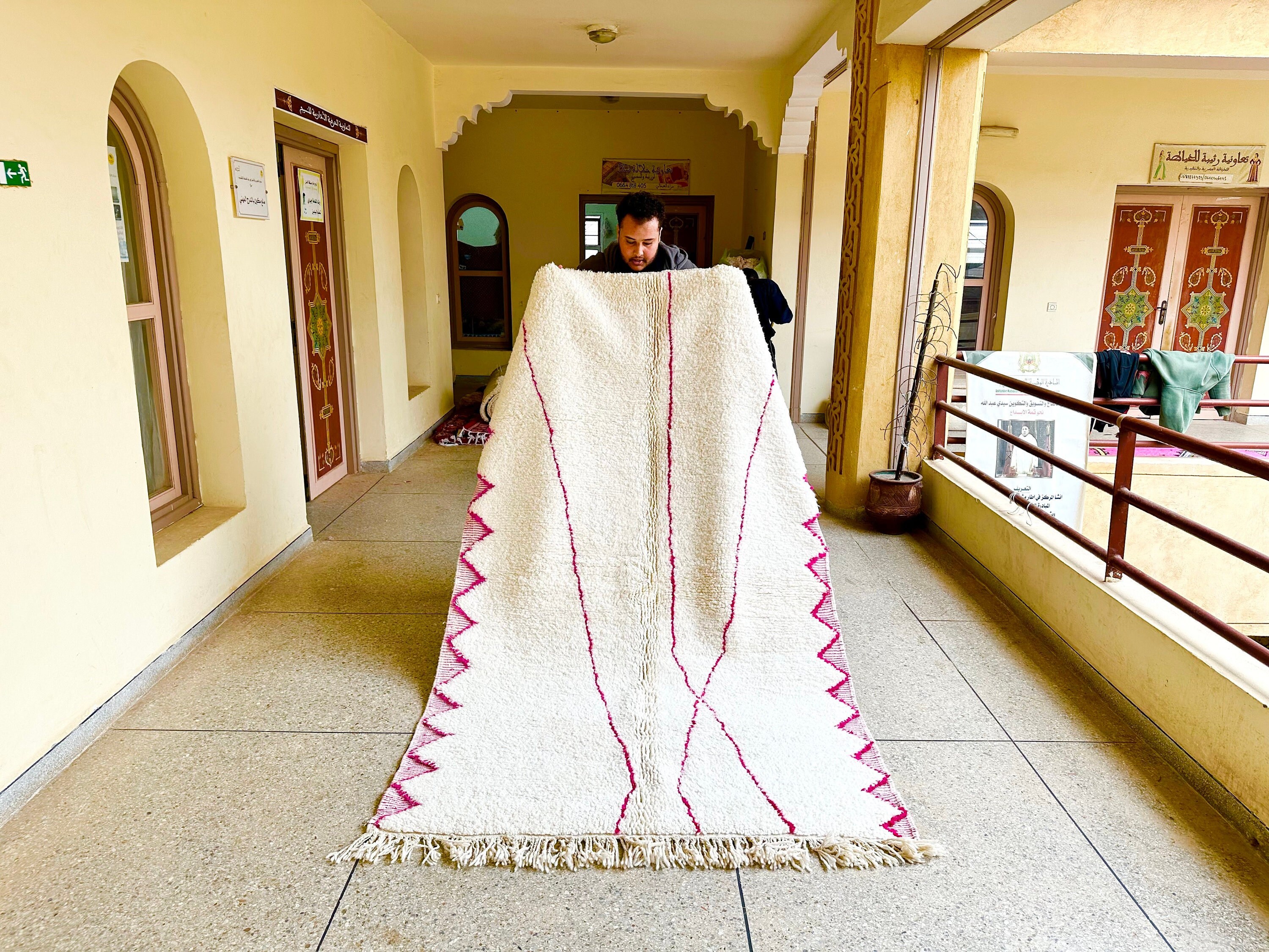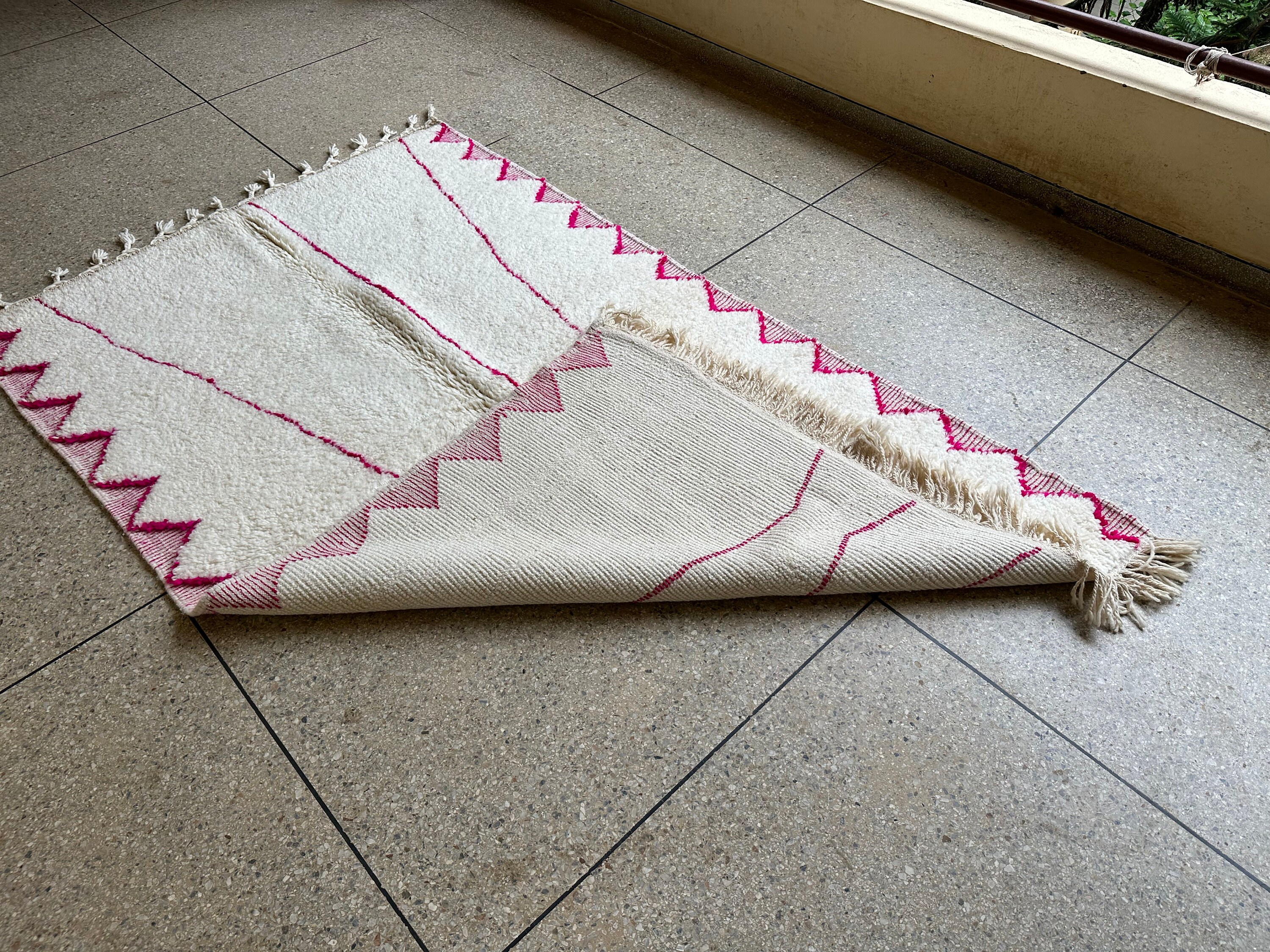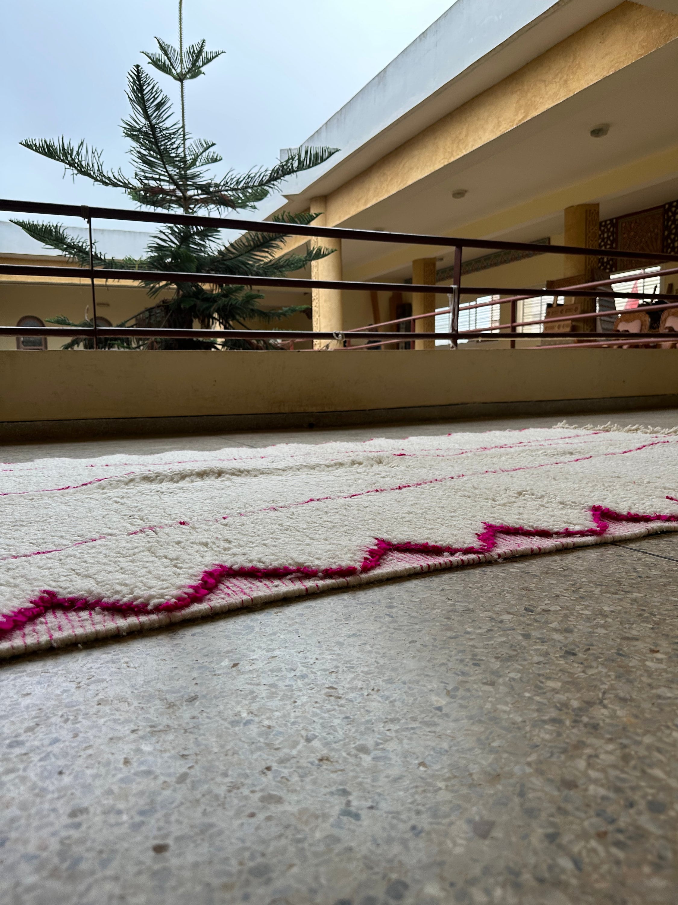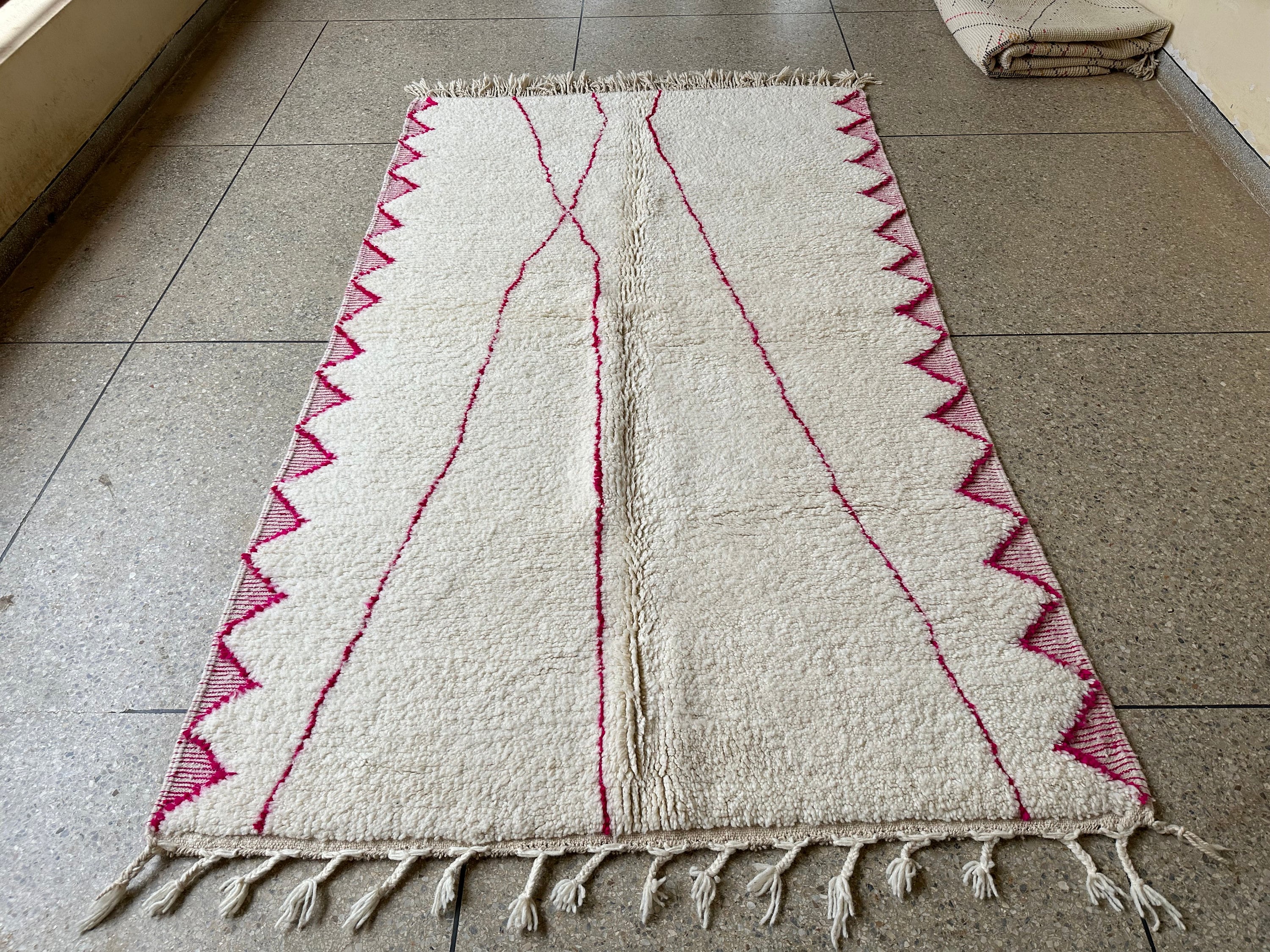Add a touch of Moroccan elegance to your home with this hand-tufted Beni Ourain rug. Crafted from 100% natural sheep wool, this pink and white rug is soft, durable, and perfect for modern or boho-chic interiors. Its minimalist design complements any decor, while the plush texture adds warmth and comfort to your living room or bedroom. Handmade by skilled artisans, this eco-friendly rug is a unique and sustainable choice for your home. Transform your space with this timeless piece today!