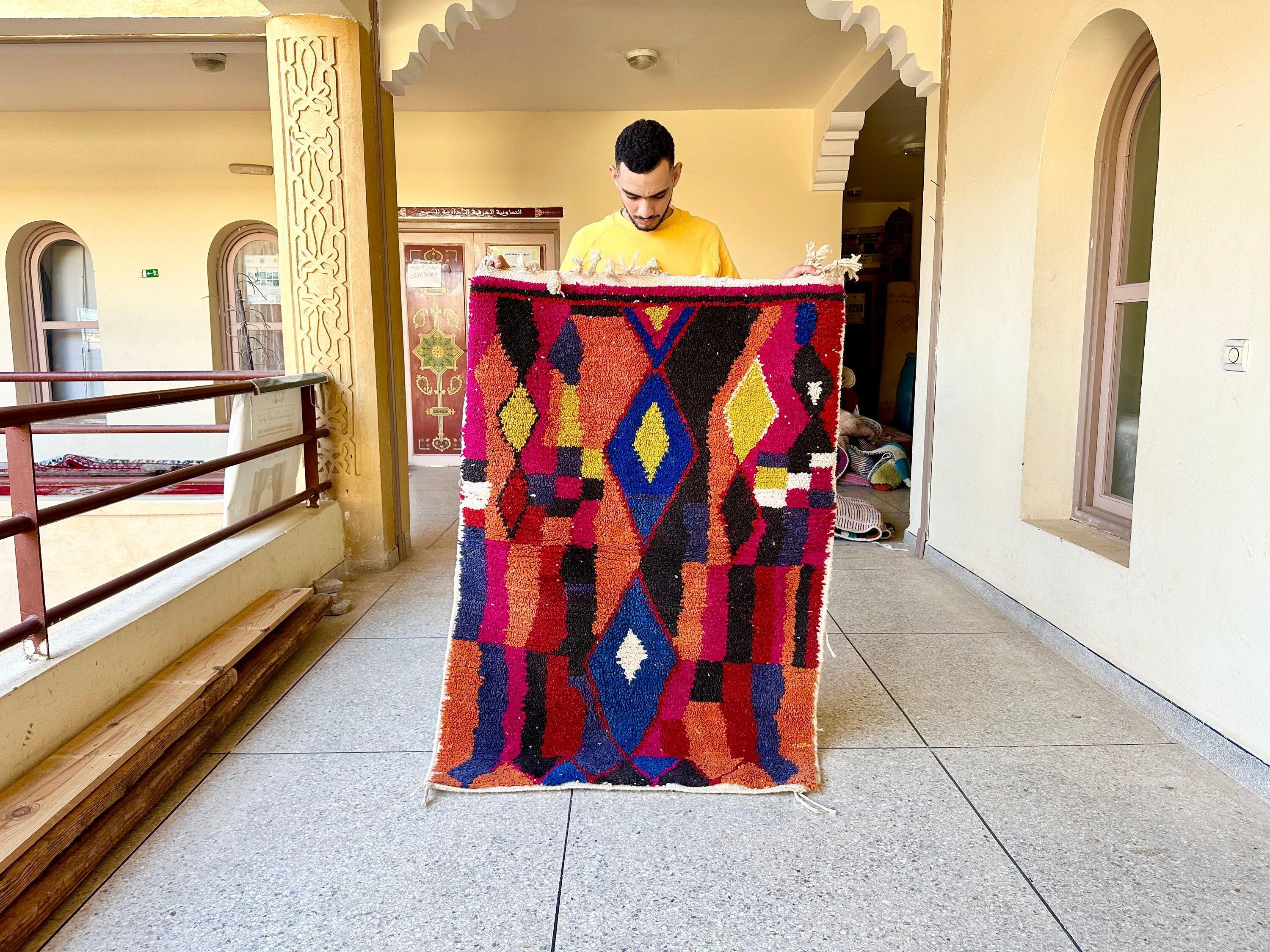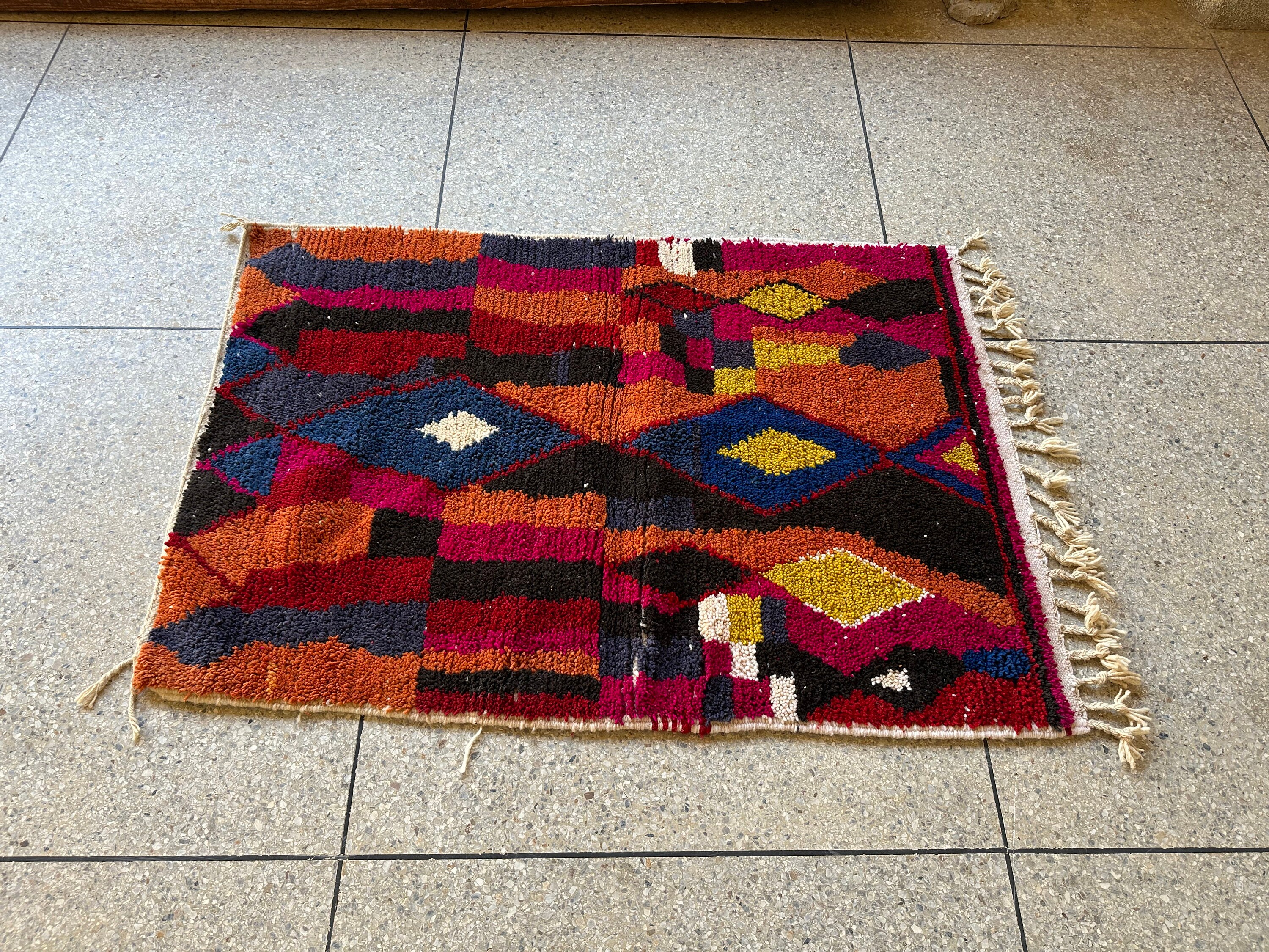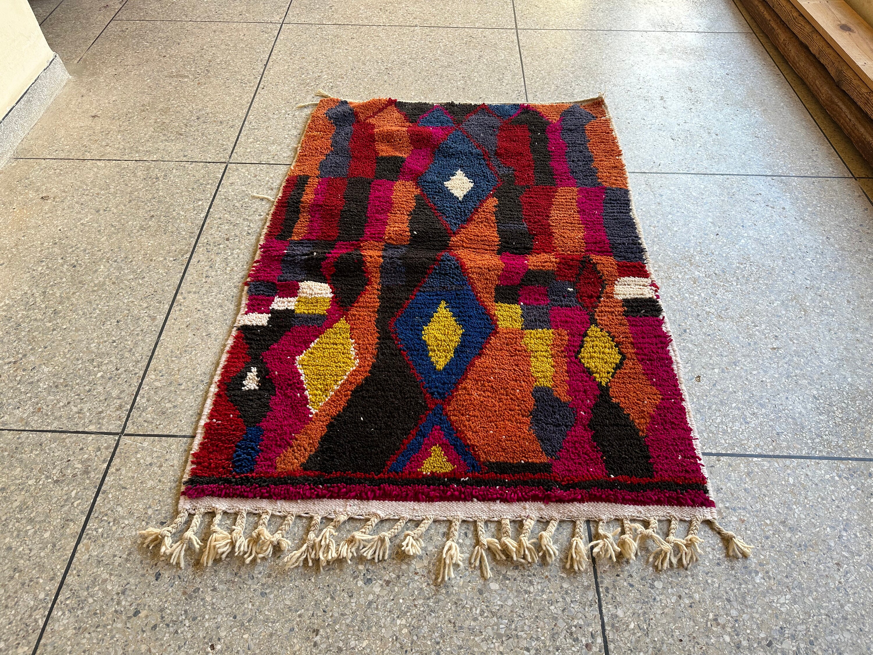 Add a burst of color to your space with this vibrant multicolor abstract Beni Ourain rug! Handwoven from the finest sheep wool, this unique Moroccan rug blends traditional Berber craftsmanship with a modern boho-chic aesthetic. Its soft, plush texture makes it a cozy addition to any living room, bedroom, or creative space. Designed for eclectic home styles, this one-of-a-kind wool rug brings warmth, character, and artistic flair to your decor. Elevate your space with an authentic Moroccan touch—order your custom handmade rug today!.