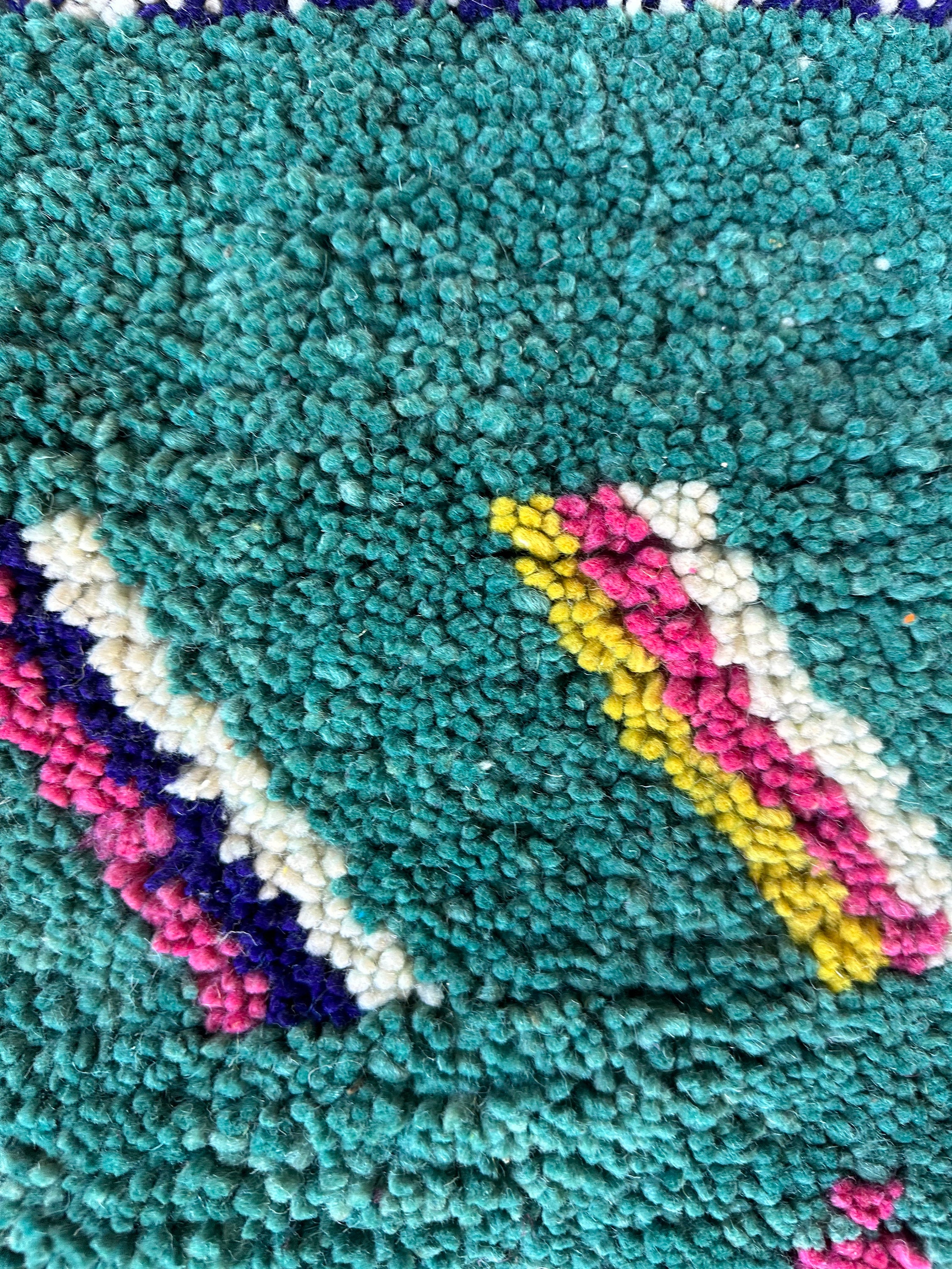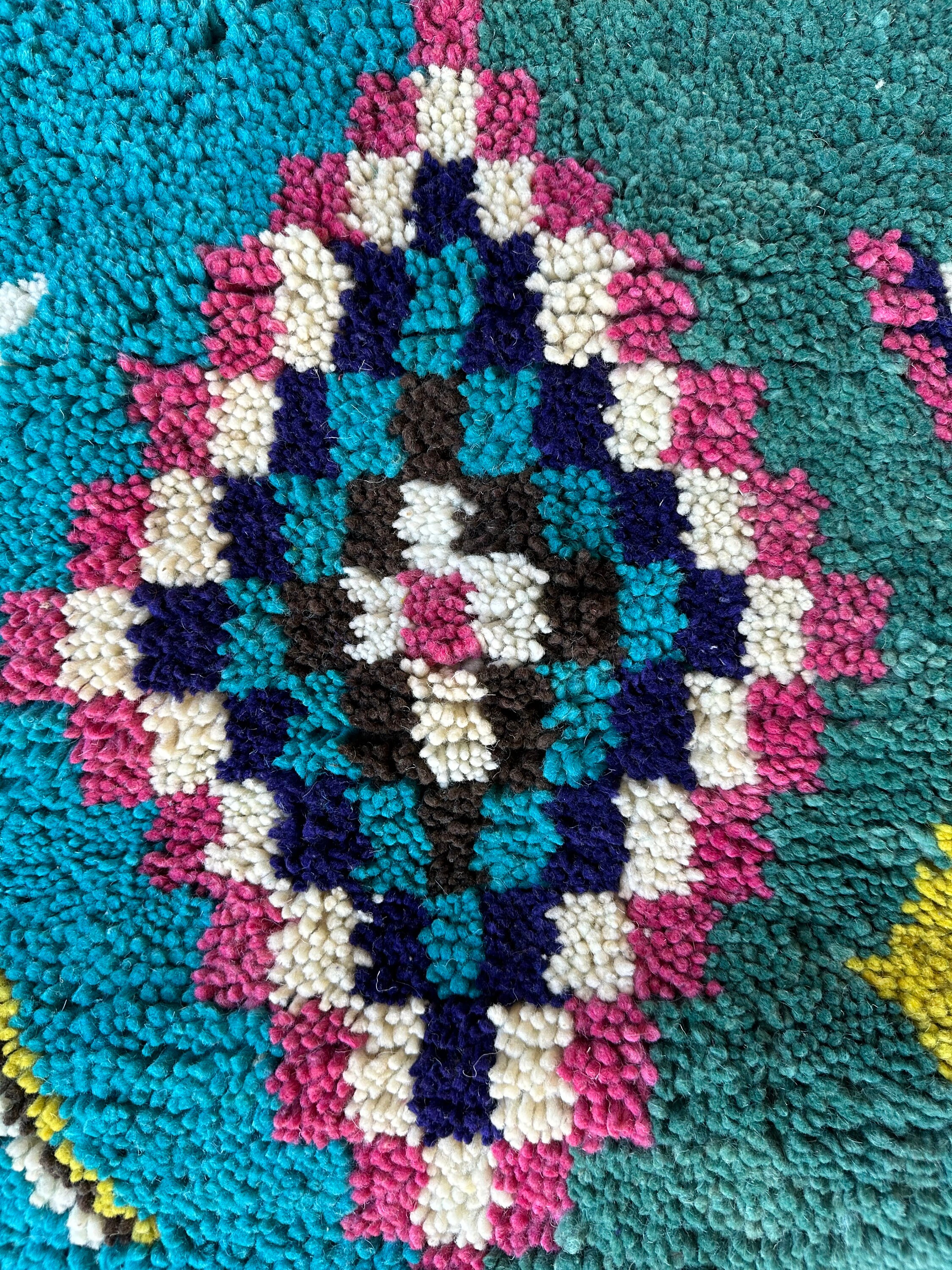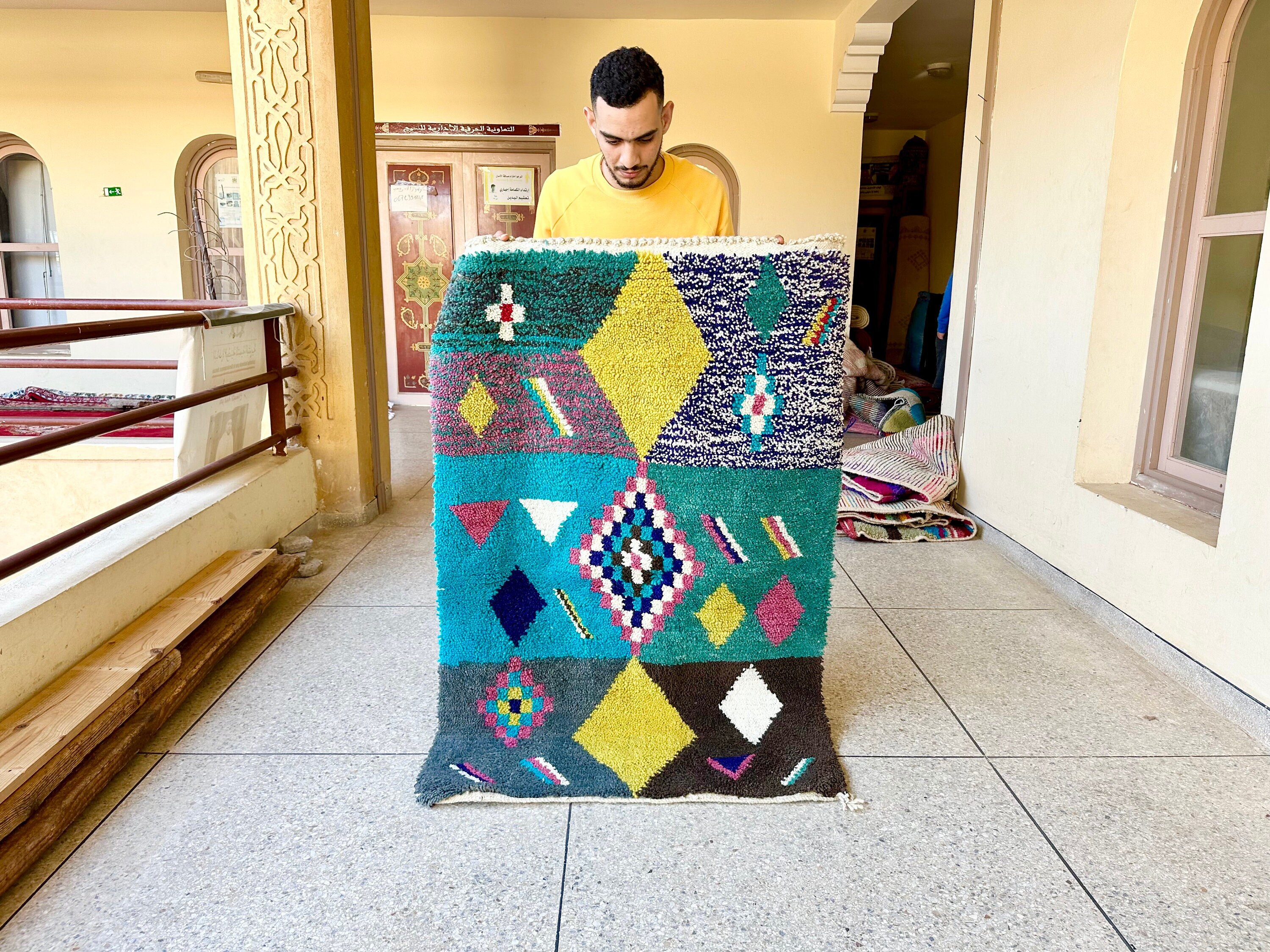 Turn your space into a cozy, colorful retreat with this handmade blue Beni Ourain rug — a bold boho statement in soft, vibrant Moroccan wool.