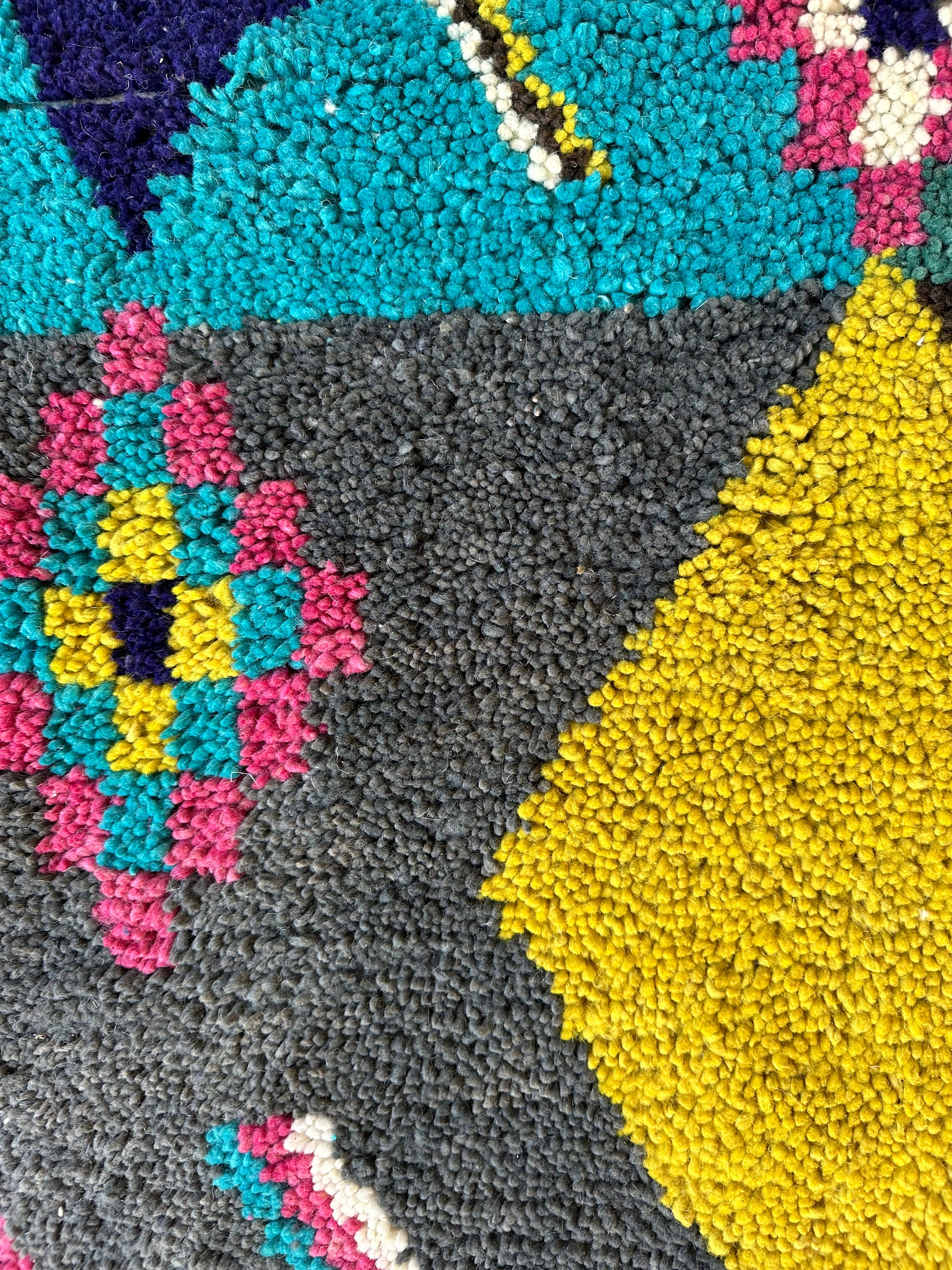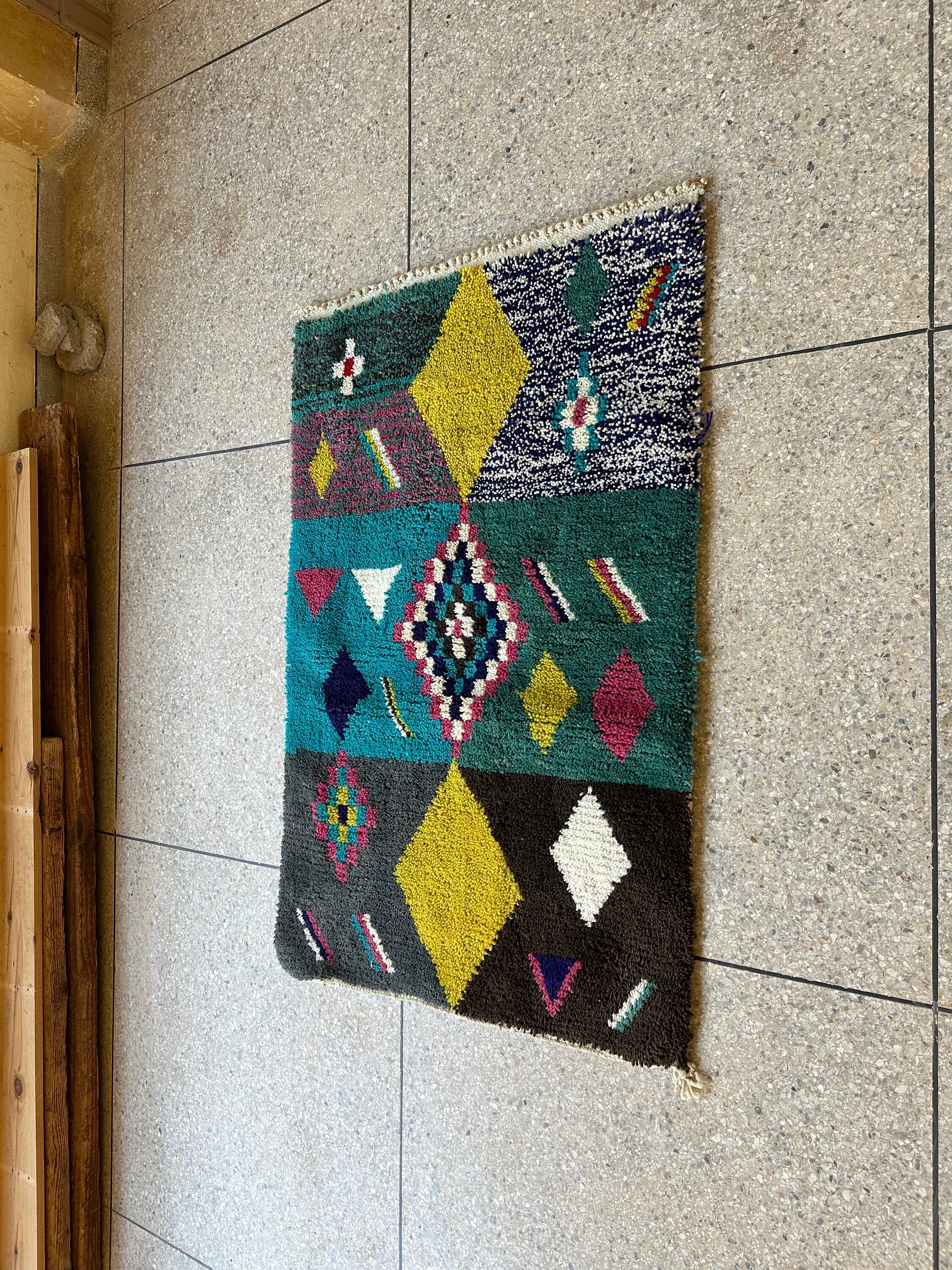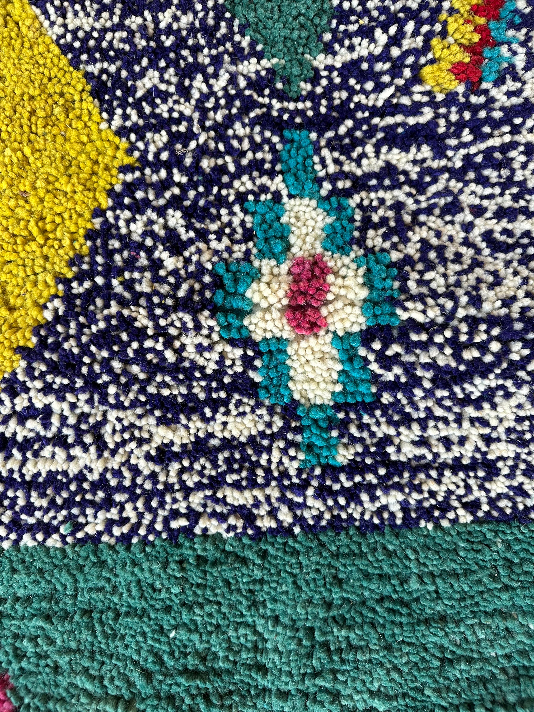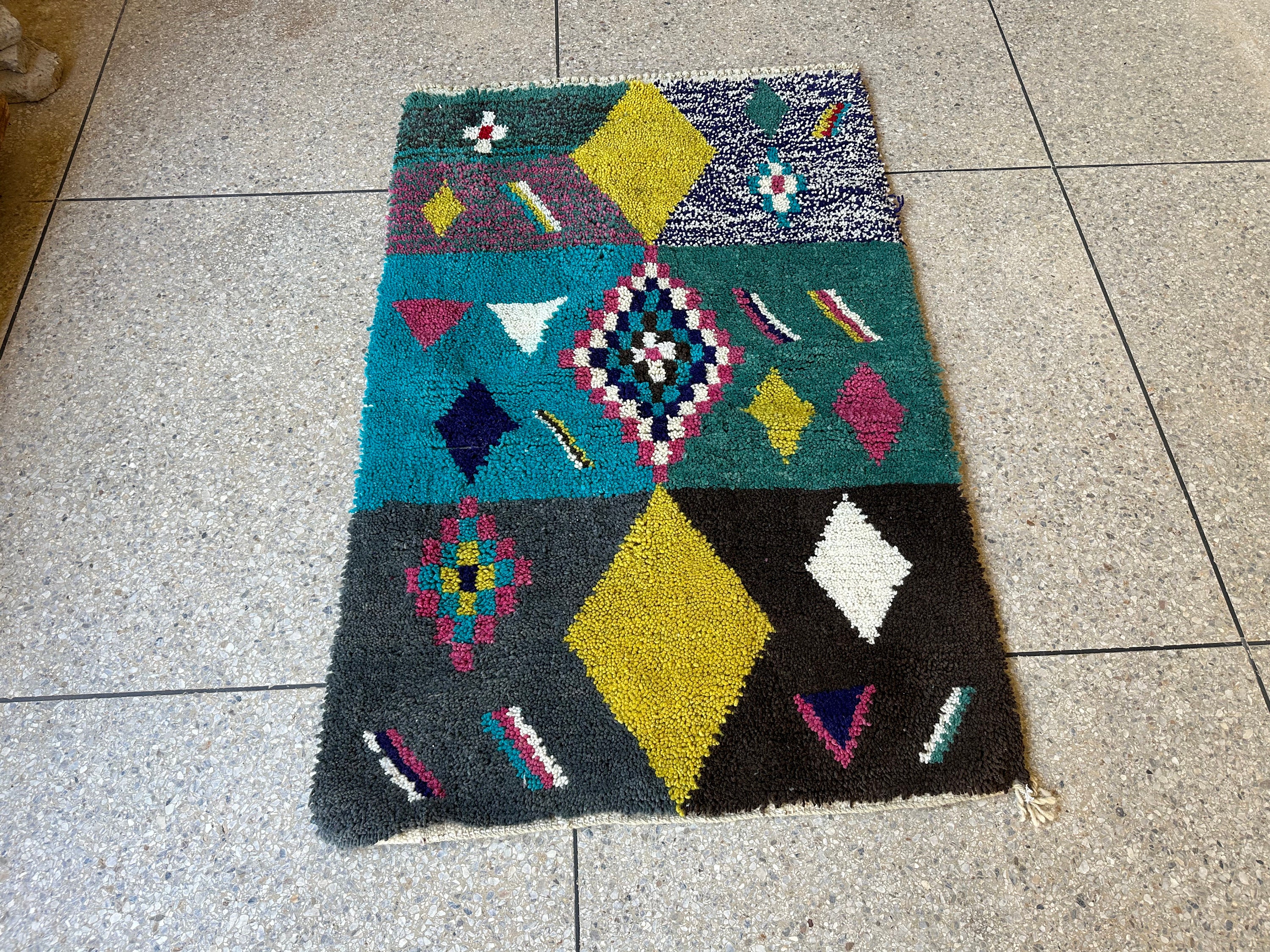 Turn your space into a cozy, colorful retreat with this handmade blue Beni Ourain rug — a bold boho statement in soft, vibrant Moroccan wool.