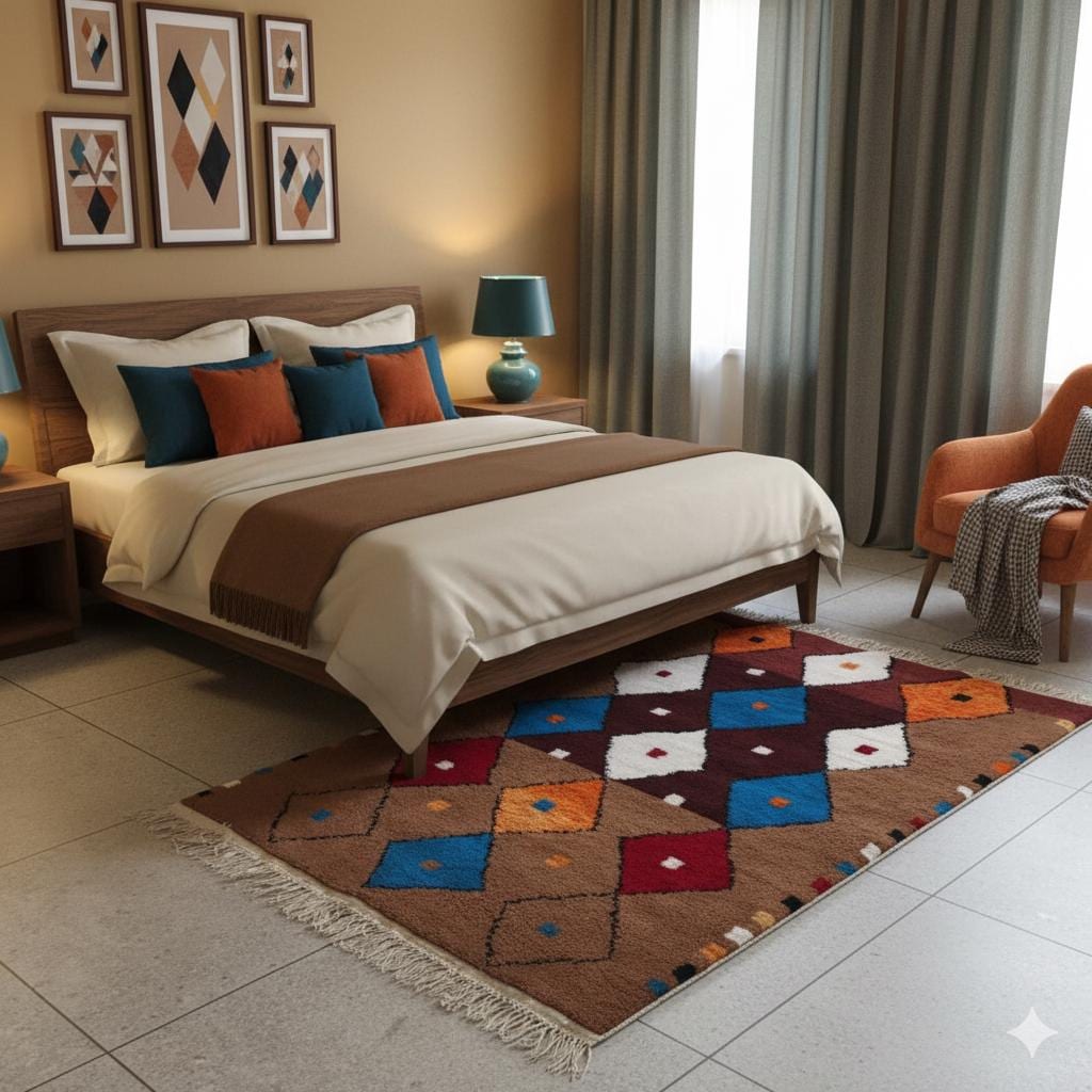 "Transform your home with a piece of Moroccan heritage that exudes both elegance and warmth 🌟. Whether placed under your sofa 🛋️, in your bedroom 🛏️, or even as a wall hanging 🖼️, these rugs invite a sense of history, style, and comfort 🧶✨ Explore our full collection of Beni Ourain, Azilal, and Boucherouite rugs for unique pieces that tell a story 📚💫.”