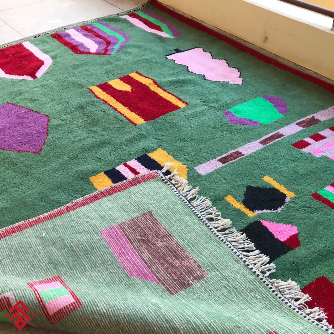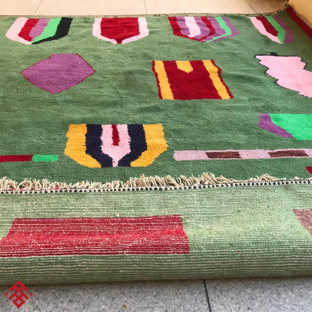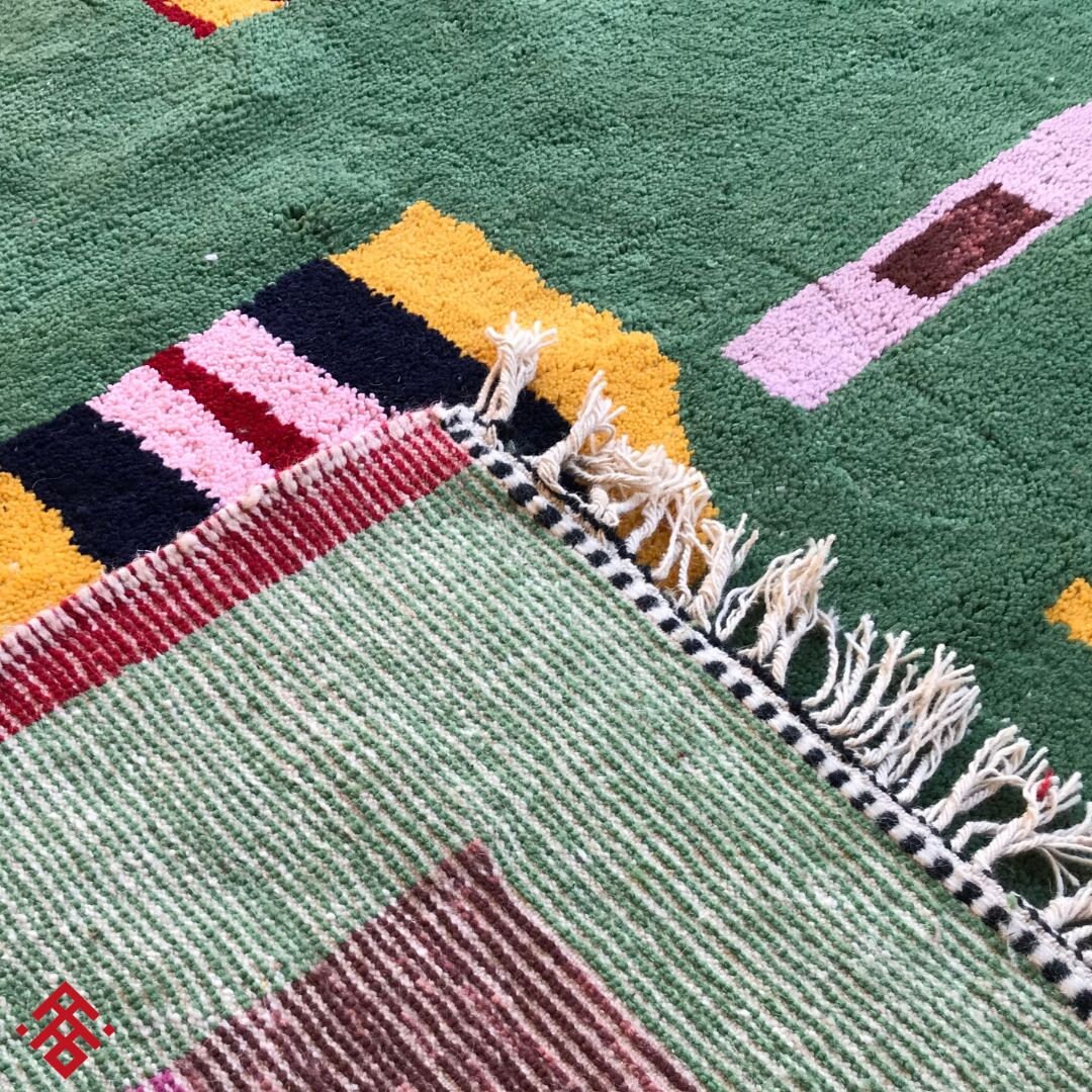 Bring boho charm to your home with this handmade green abstract Beni Ourain rug. Crafted from soft, natural wool, this cozy area rug adds warmth and style to your living room or bedroom. Its unique design and eco-friendly materials make it a perfect choice for modern bohemian decor. Handmade by skilled artisans, this rug is both durable and luxurious. Elevate your space with this timeless piece today!