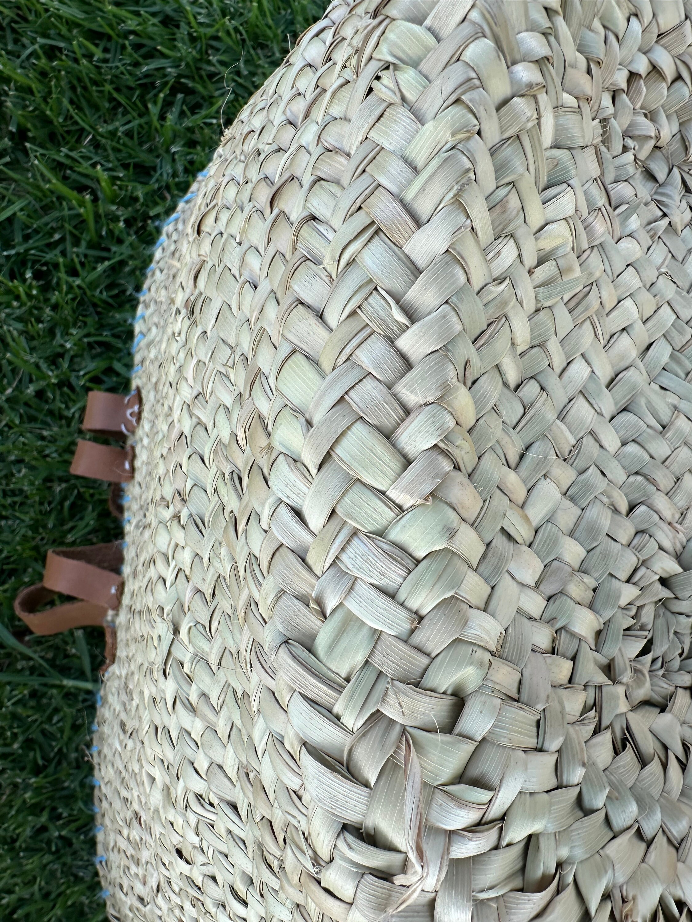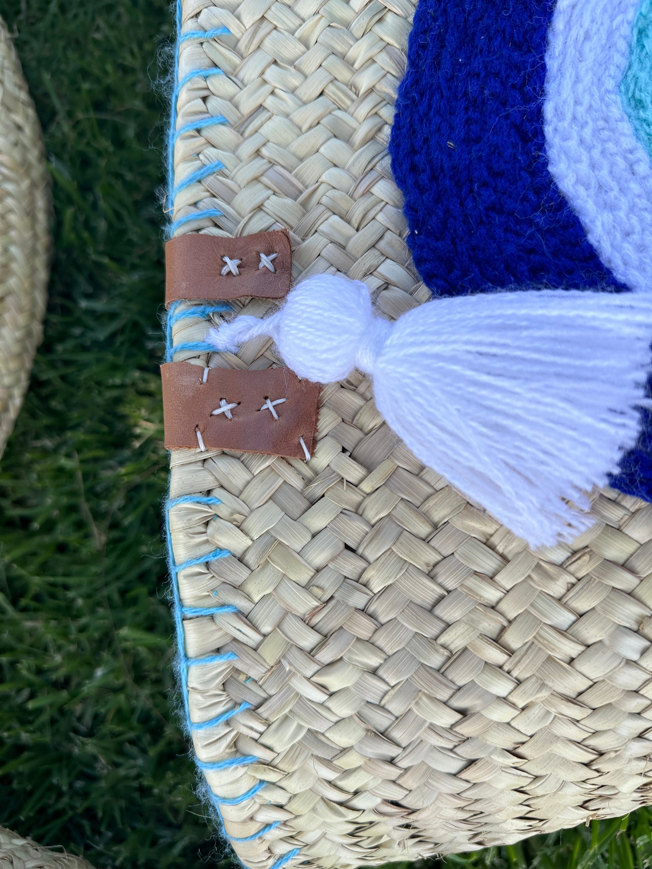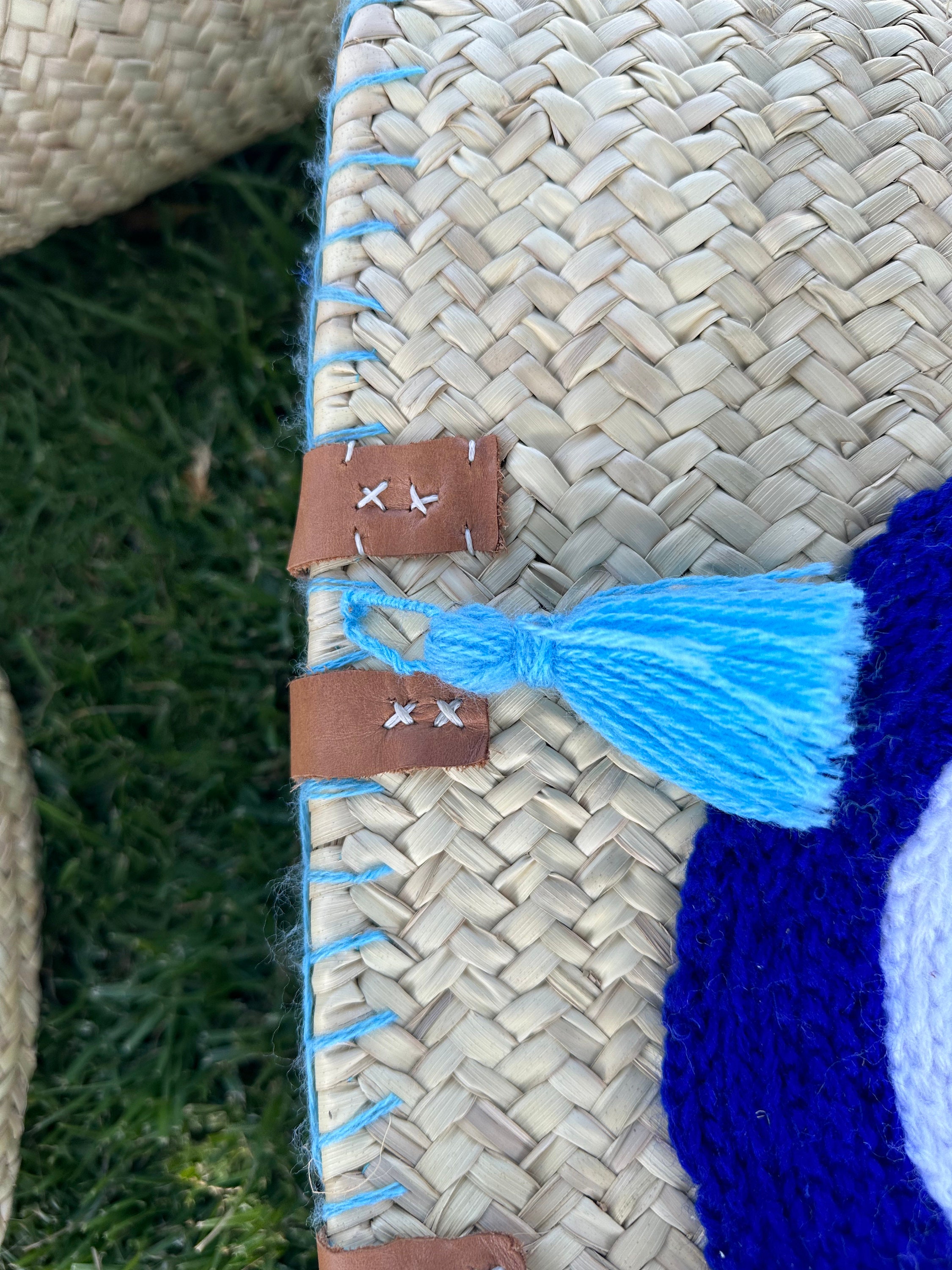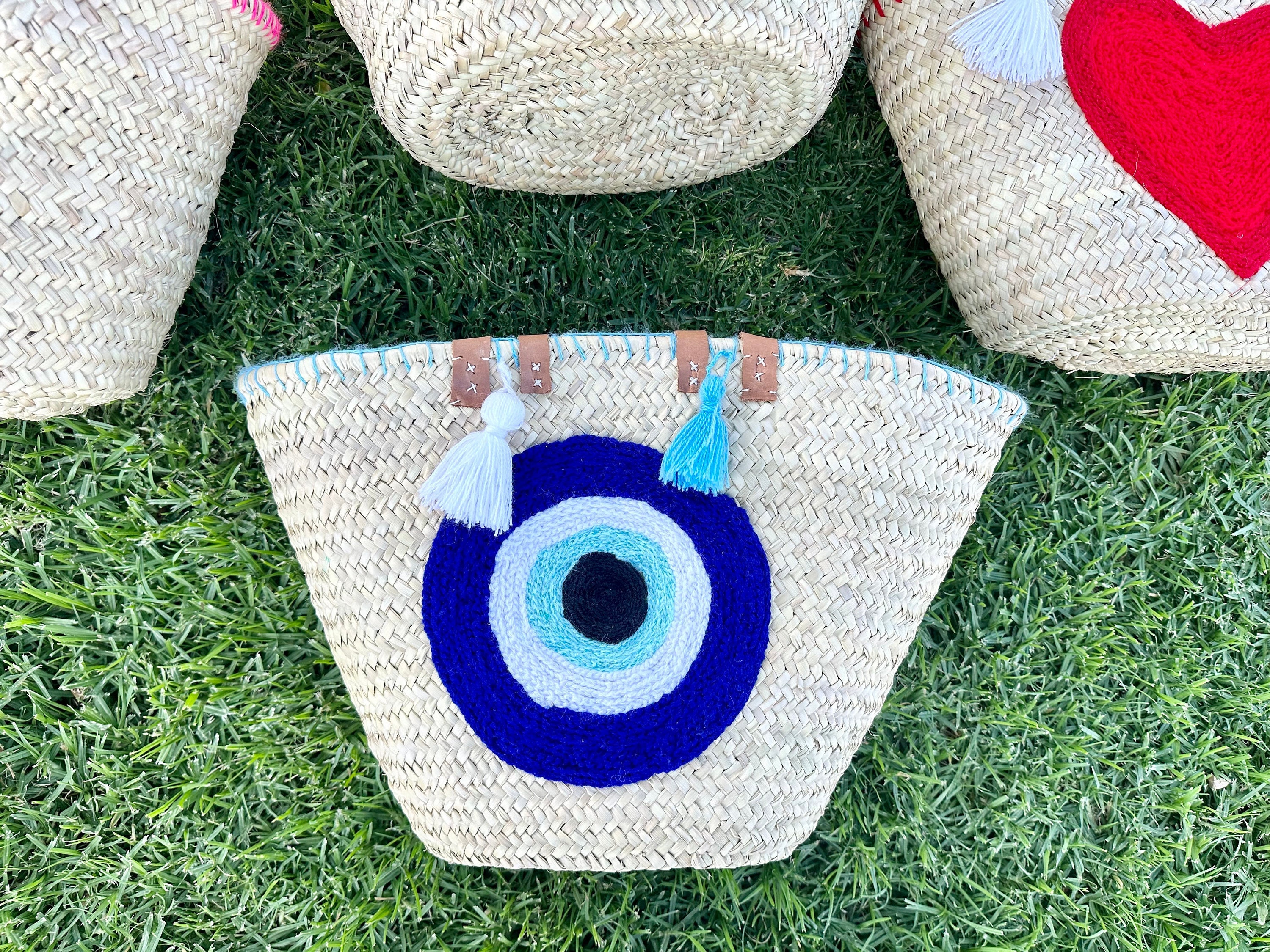 .Moroccan Straw Bag, Straw Beach Bag - Blue eye Shopping Basket - French Basket With Double Leather Handles - grocery market bag