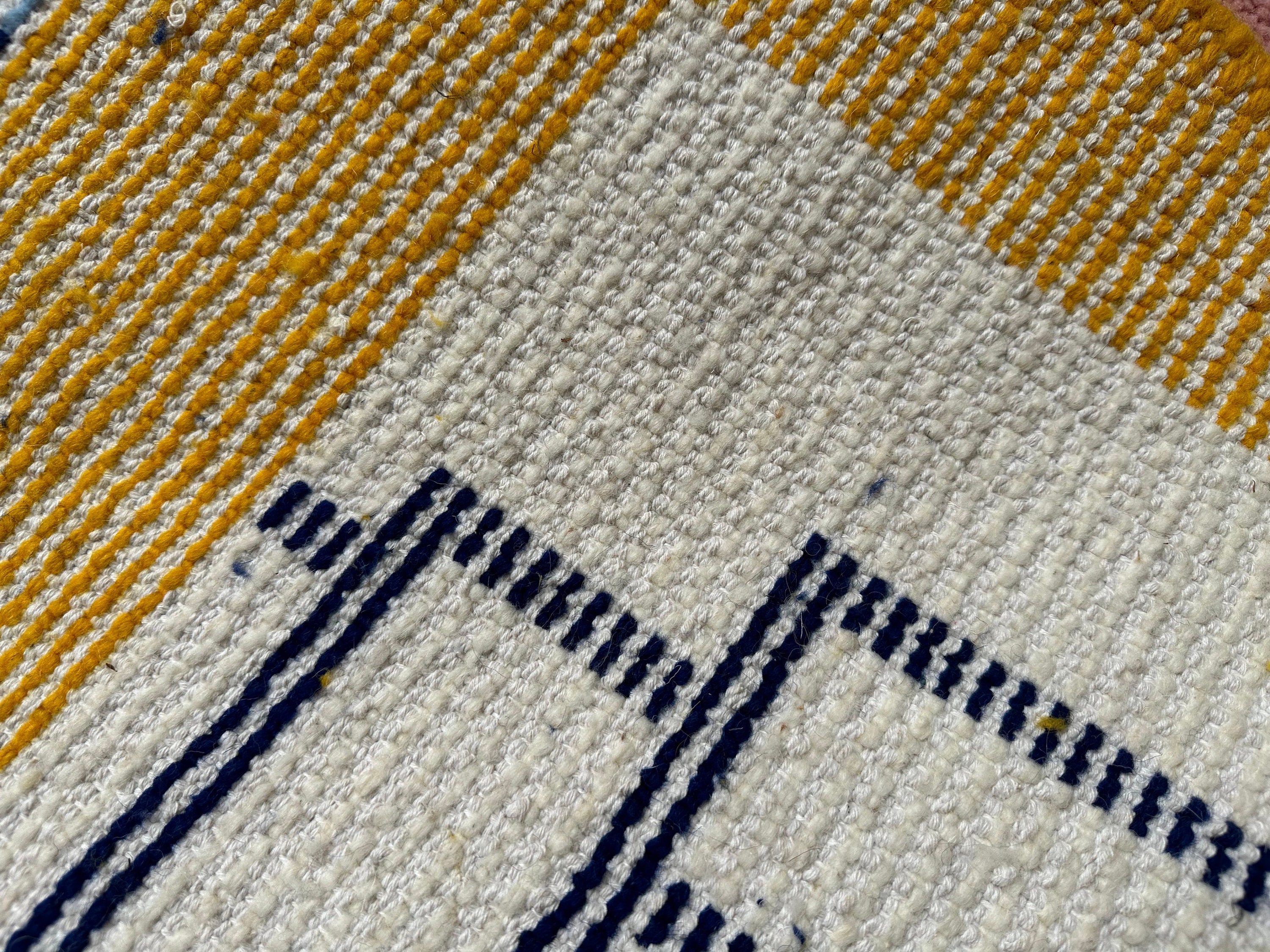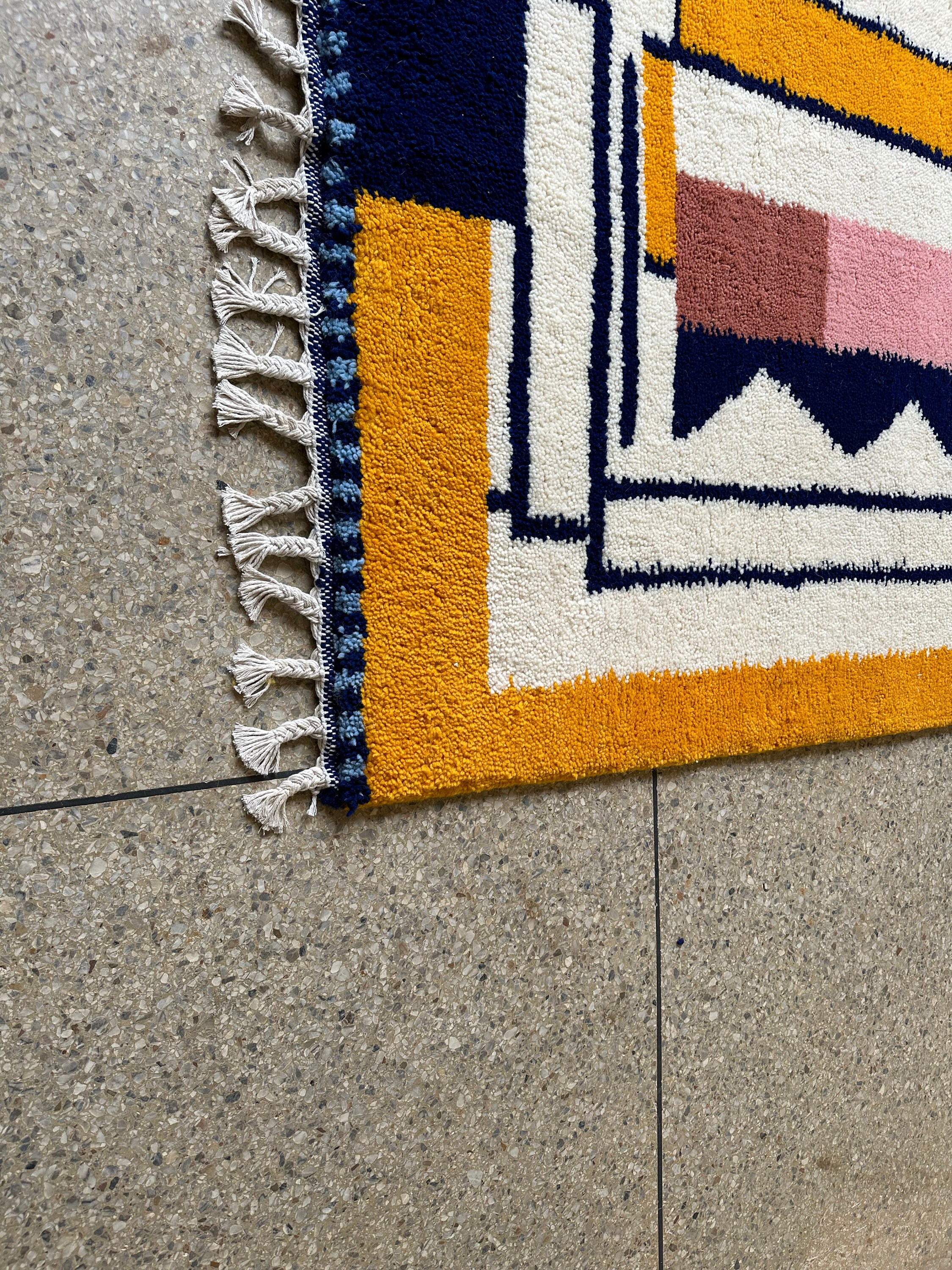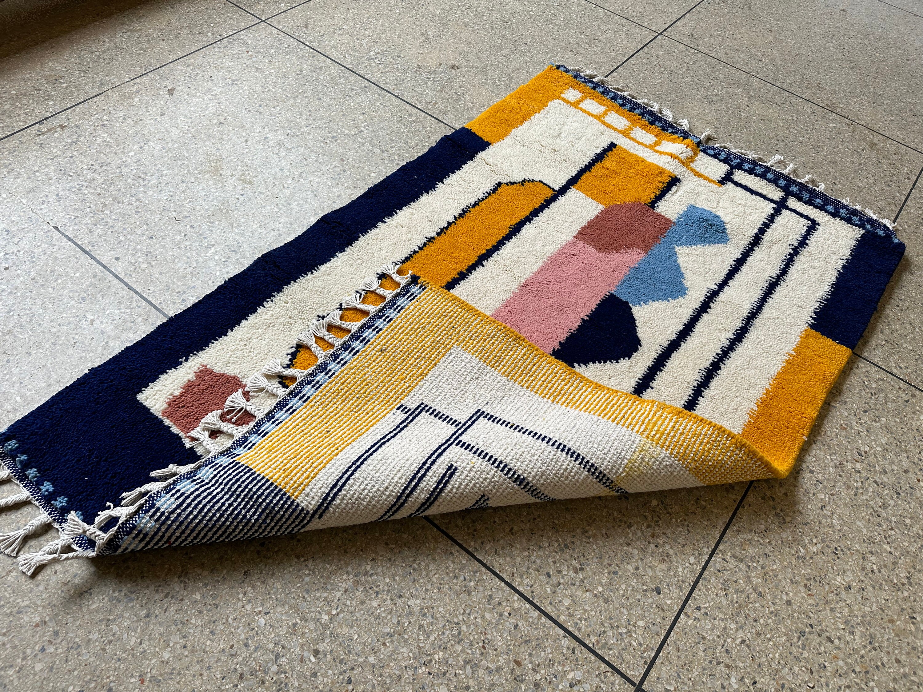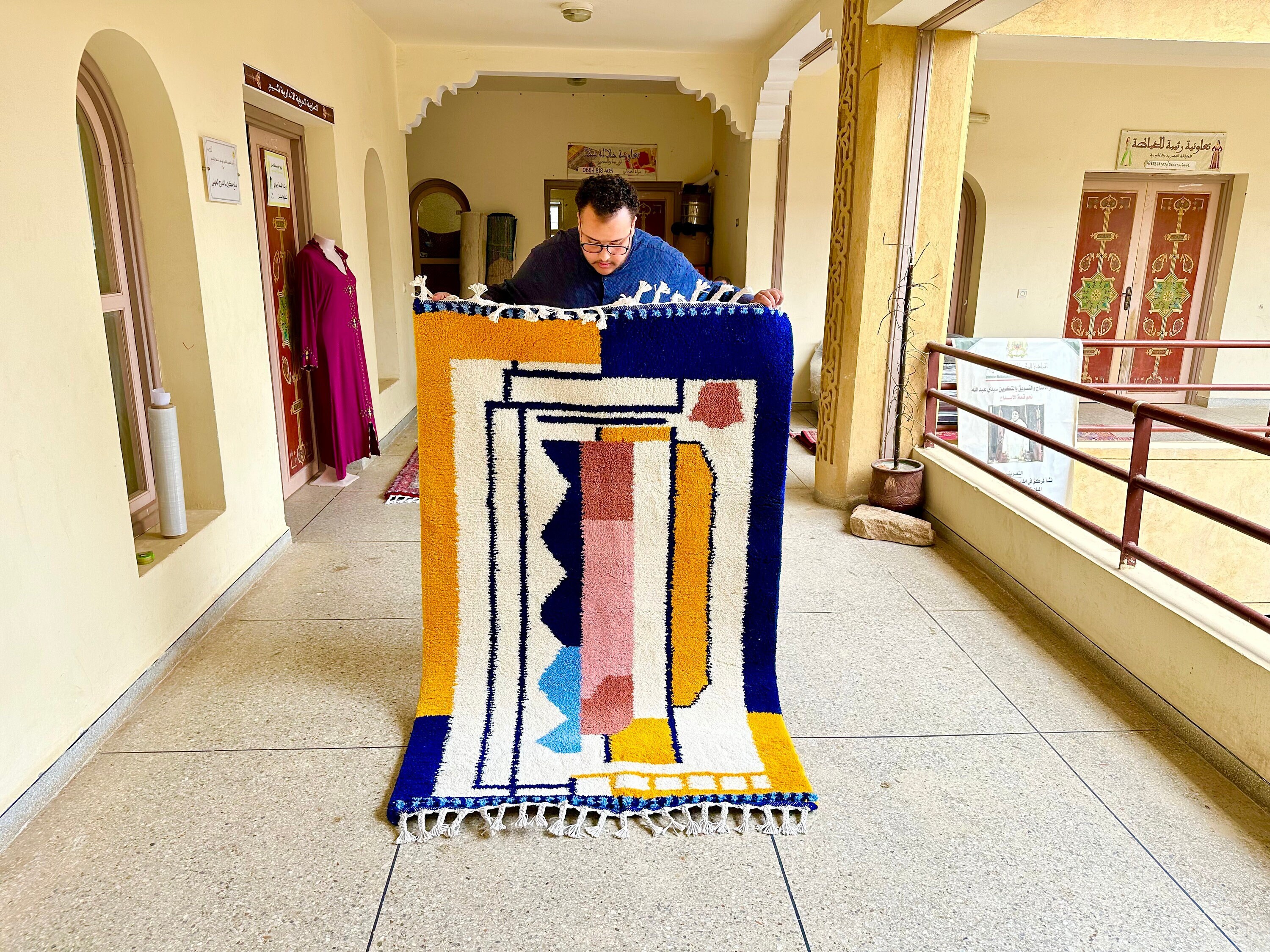 Add a touch of artistic charm to your home with this stunning blue and yellow Moroccan Beni Ourain rug. Expertly handwoven from premium sheep wool, this abstract area rug blends traditional Berber craftsmanship with a modern twist. Its bold yet elegant design makes it the perfect statement piece for any bohemian or eclectic living room, bedroom, or cozy nook. Soft, durable, and one-of-a-kind, this rug brings warmth, texture, and character to your space.