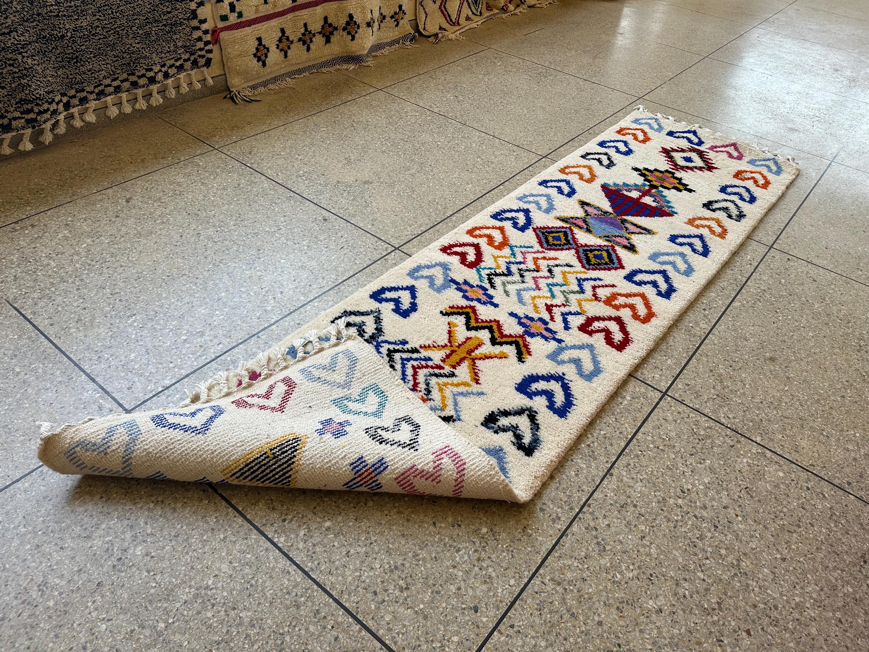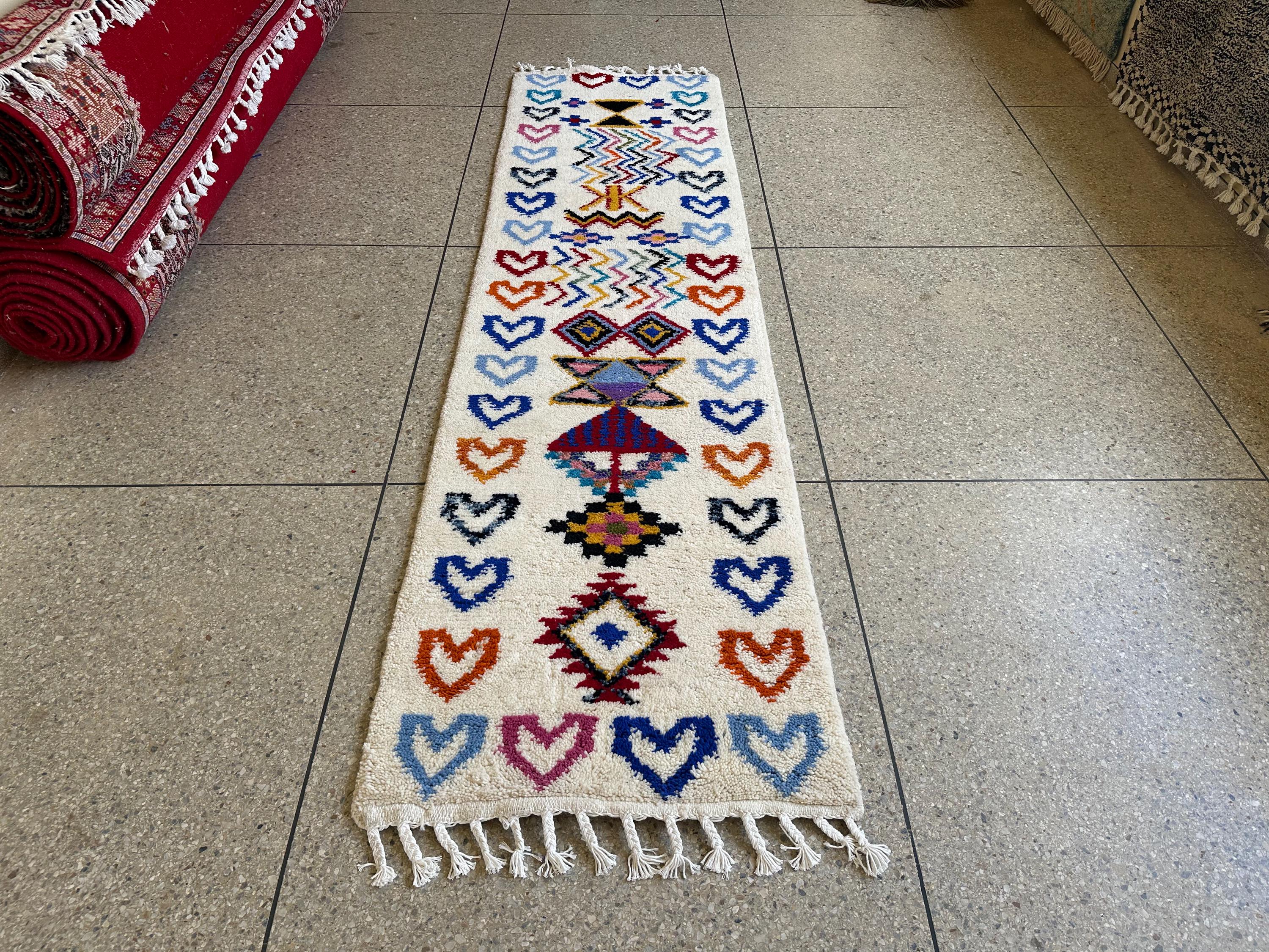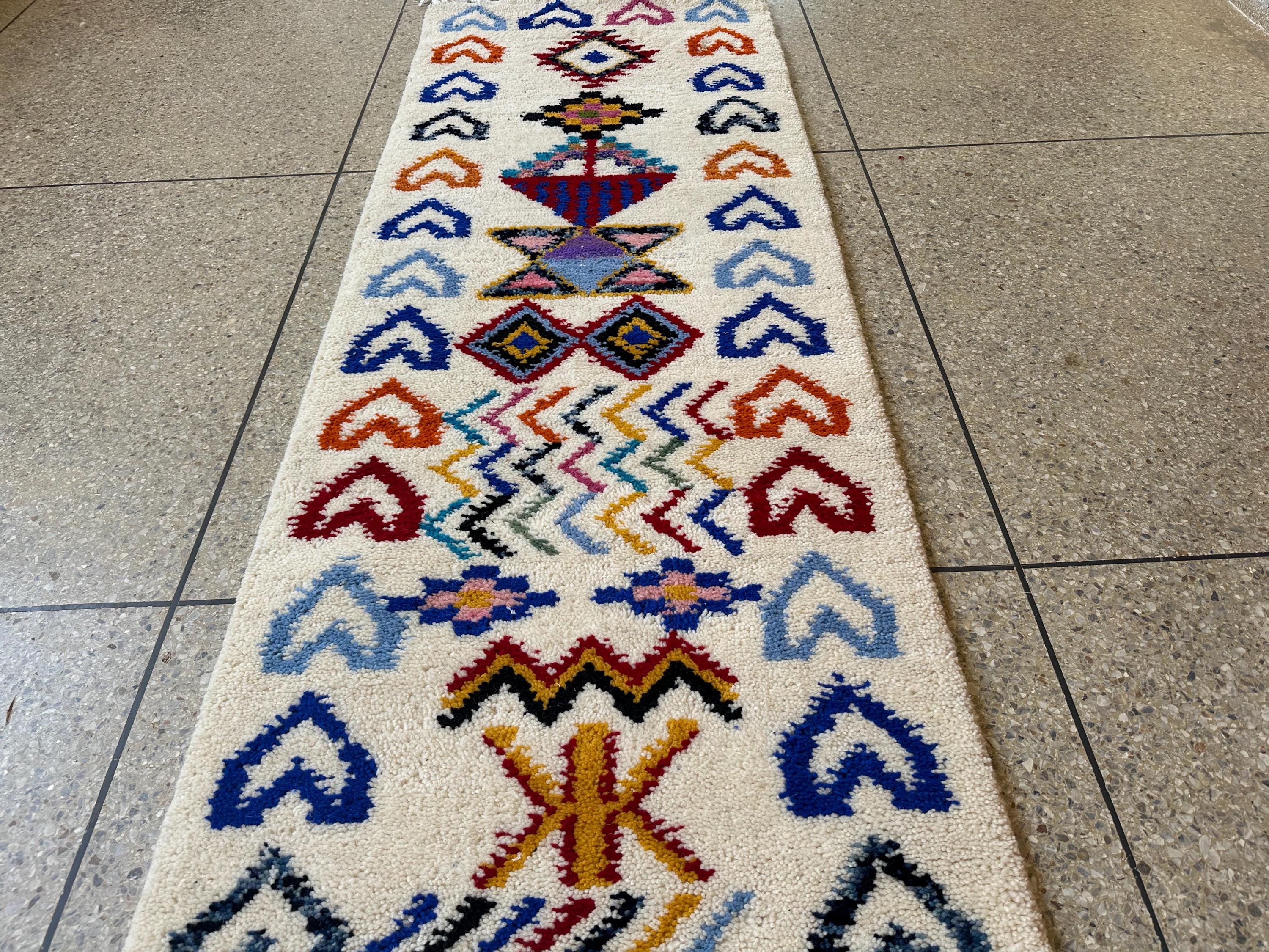 Add a vibrant touch to your space with this Moroccan runner rug, featuring a white base with multicolor abstract patterns. Handwoven from soft sheep wool, this custom hallway runner brings warmth and character to bohemian and eclectic interiors.
