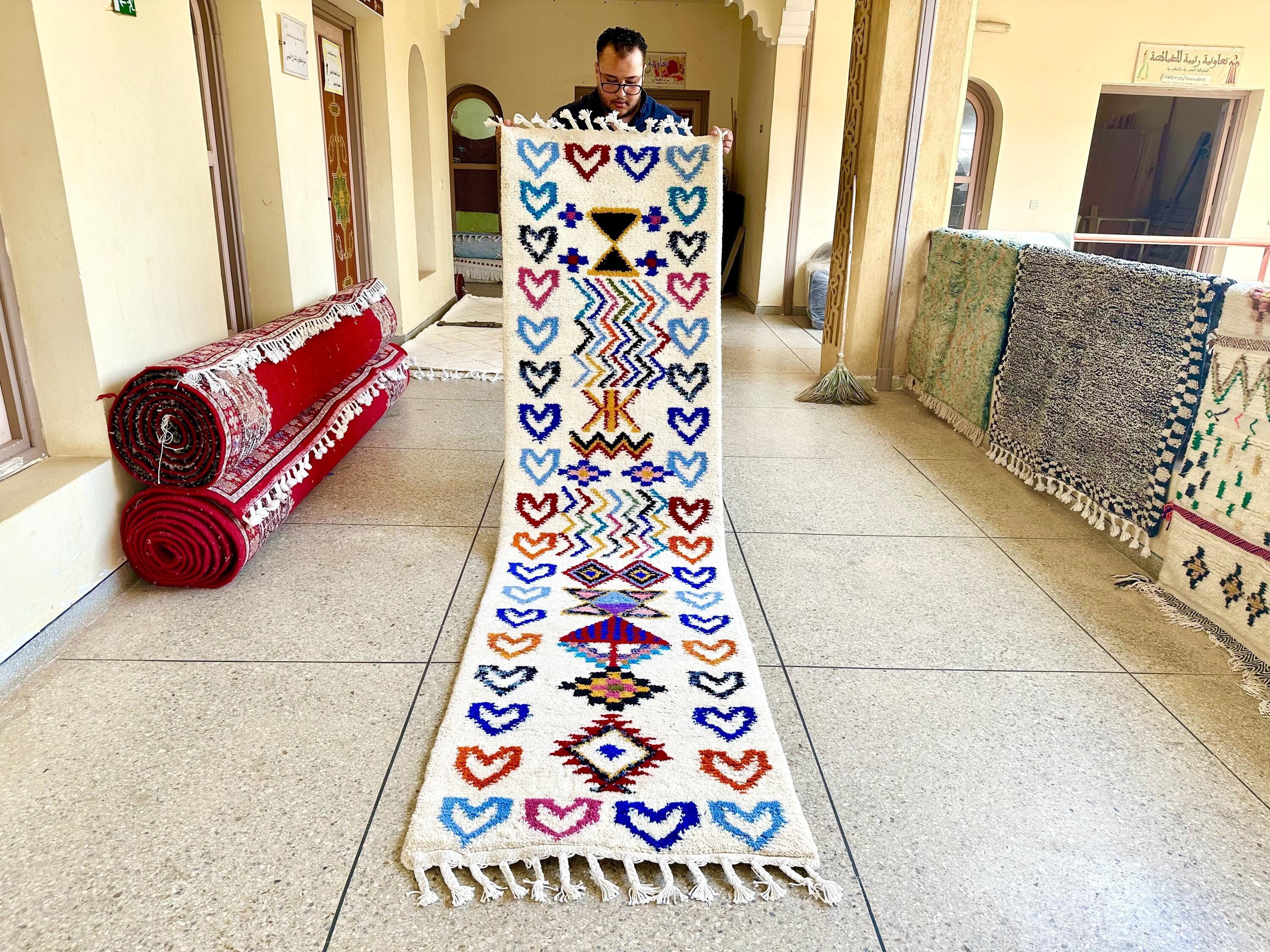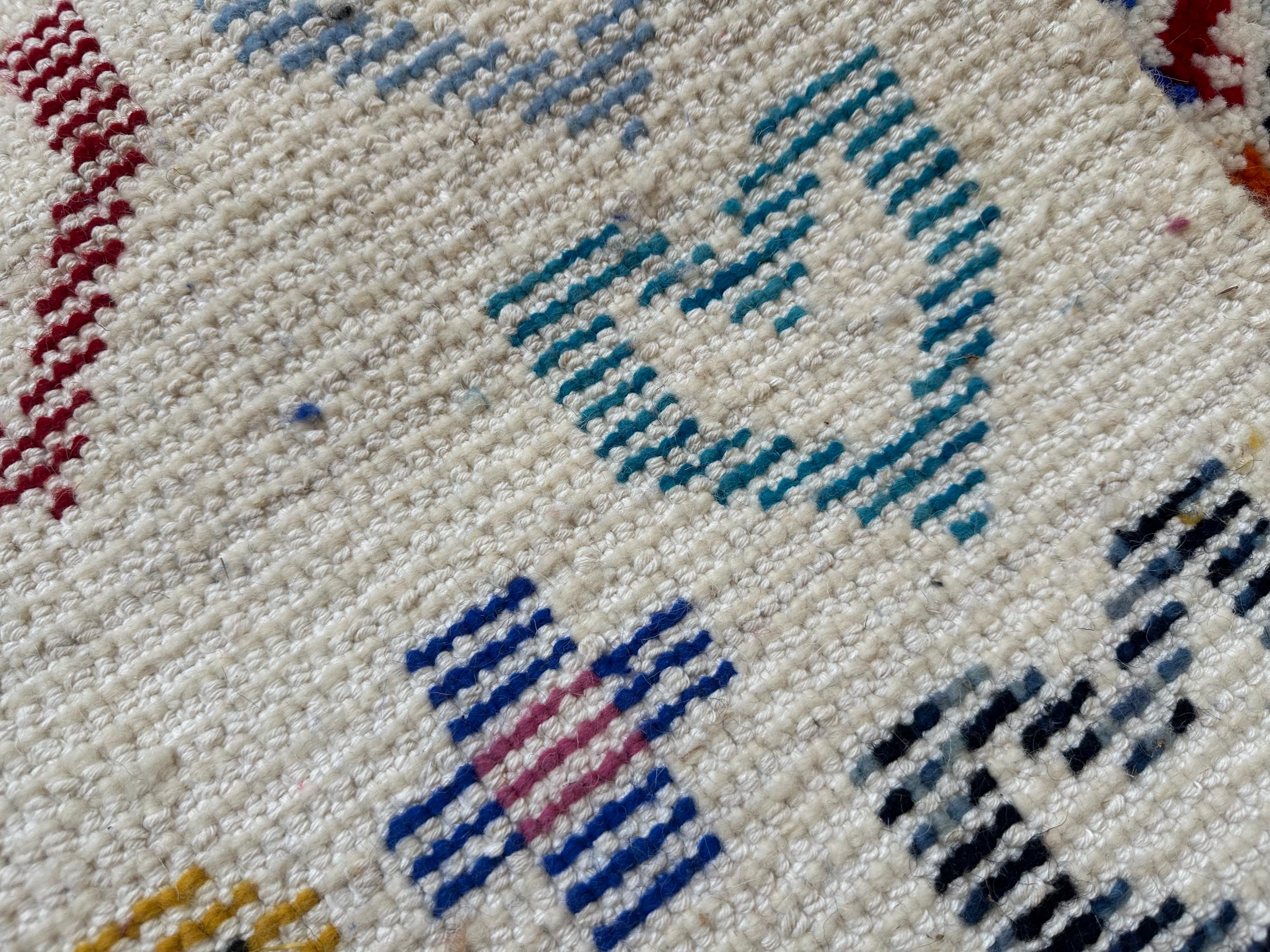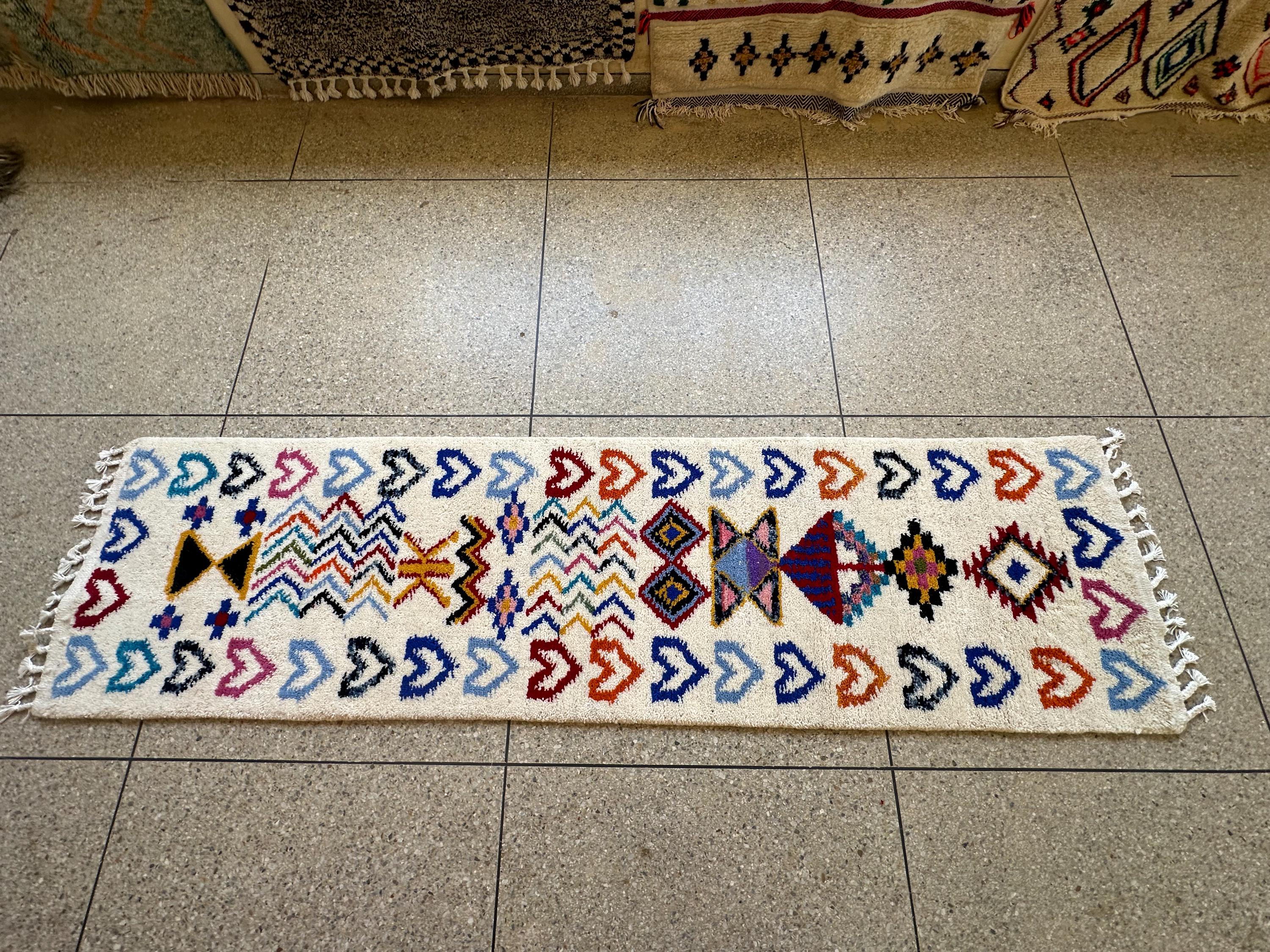 Add a vibrant touch to your space with this Moroccan runner rug, featuring a white base with multicolor abstract patterns. Handwoven from soft sheep wool, this custom hallway runner brings warmth and character to bohemian and eclectic interiors.