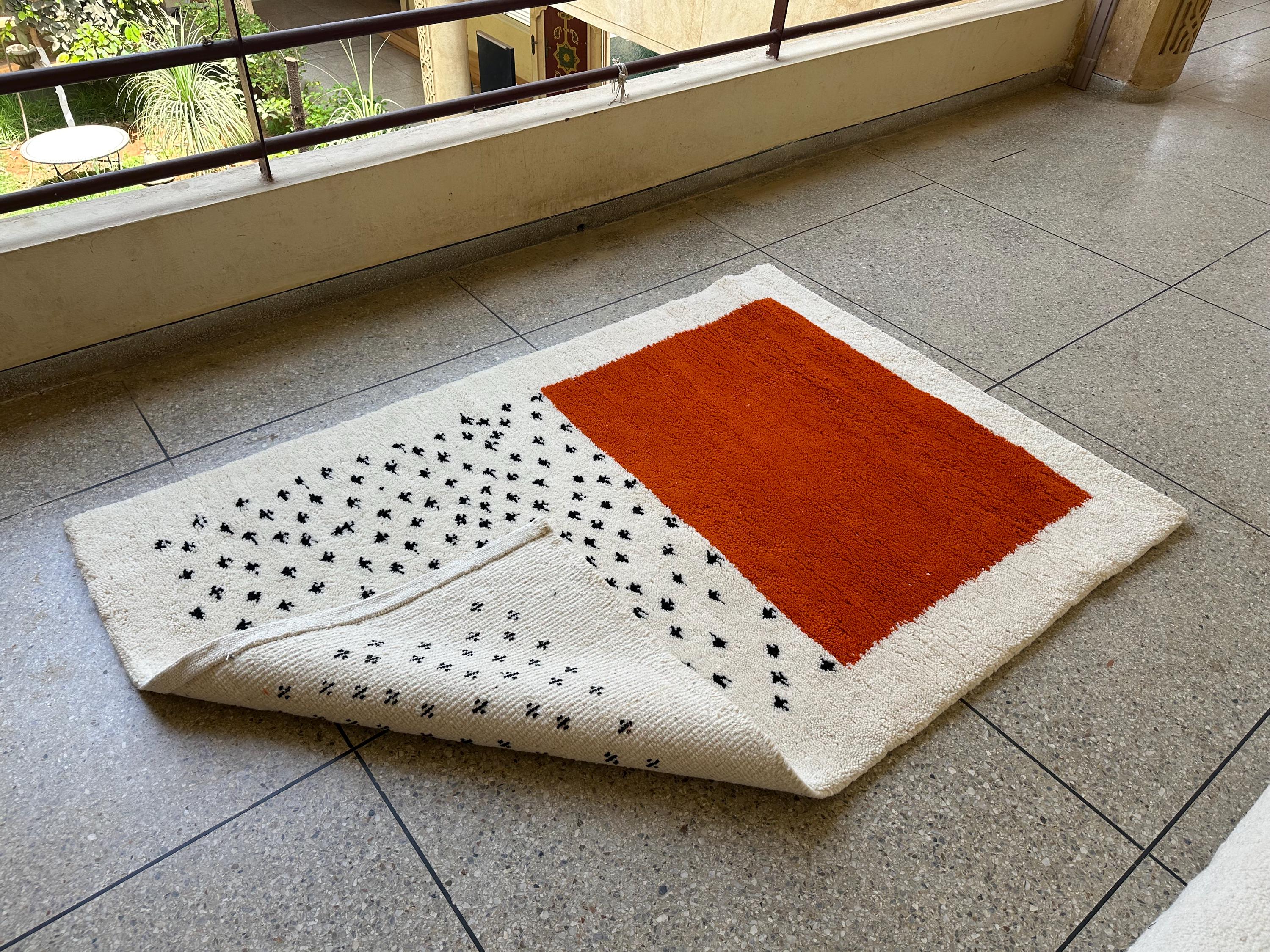 .BENI OURAIN RUG, White and Orange Moroccan Rug, 7x4 Size Decorative Berber Rug, Dotted Handmade Area Rug, Fluffy Wool Moroccan Carpet.