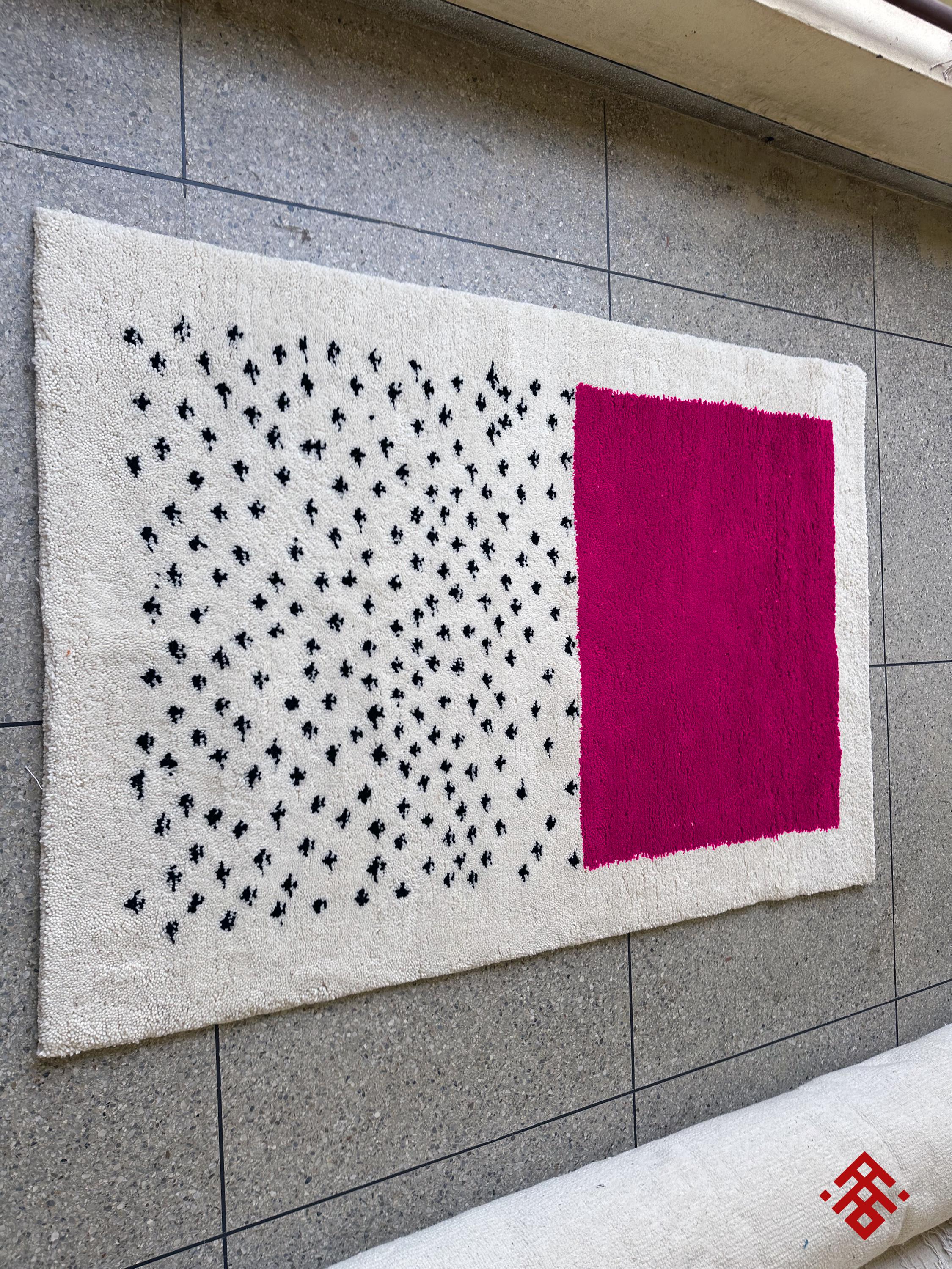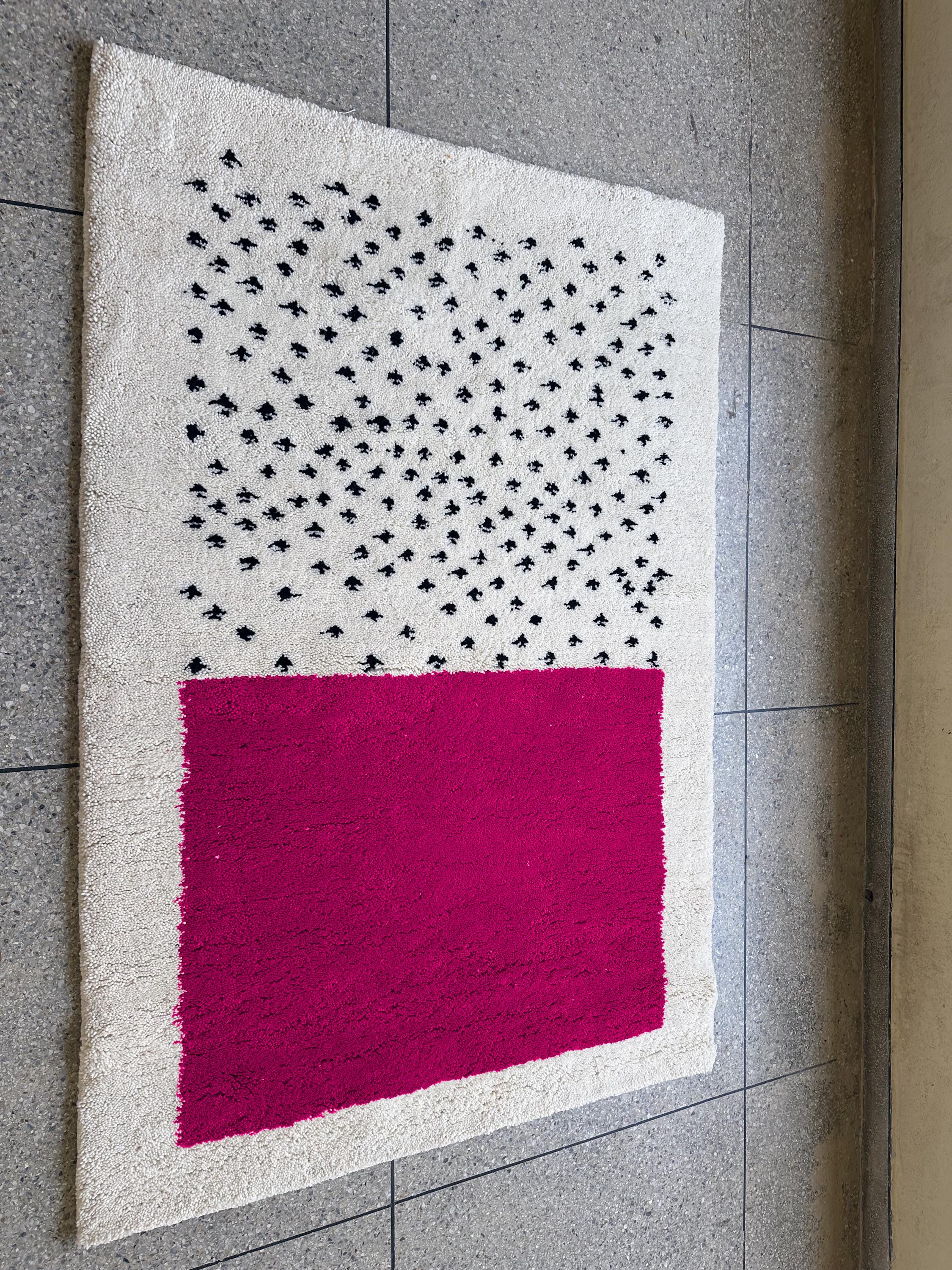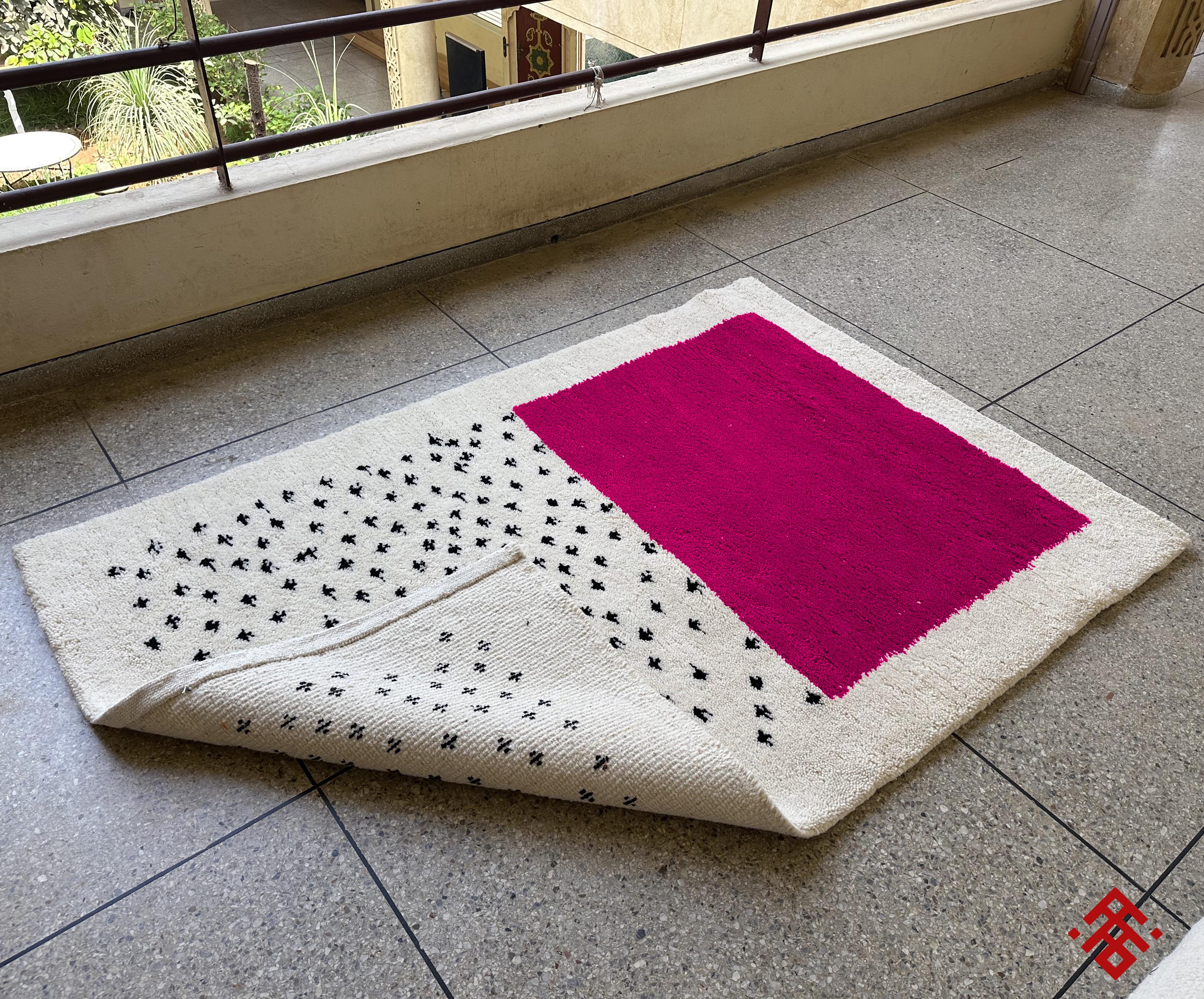 Add a touch of charm to your home with this MARVELOUS Beni Ourain rug, featuring a soft white base with delicate pink dotted patterns. Handwoven from premium sheep wool, this cozy Berber rug is perfect for bohemian, minimalist, or modern interiors.