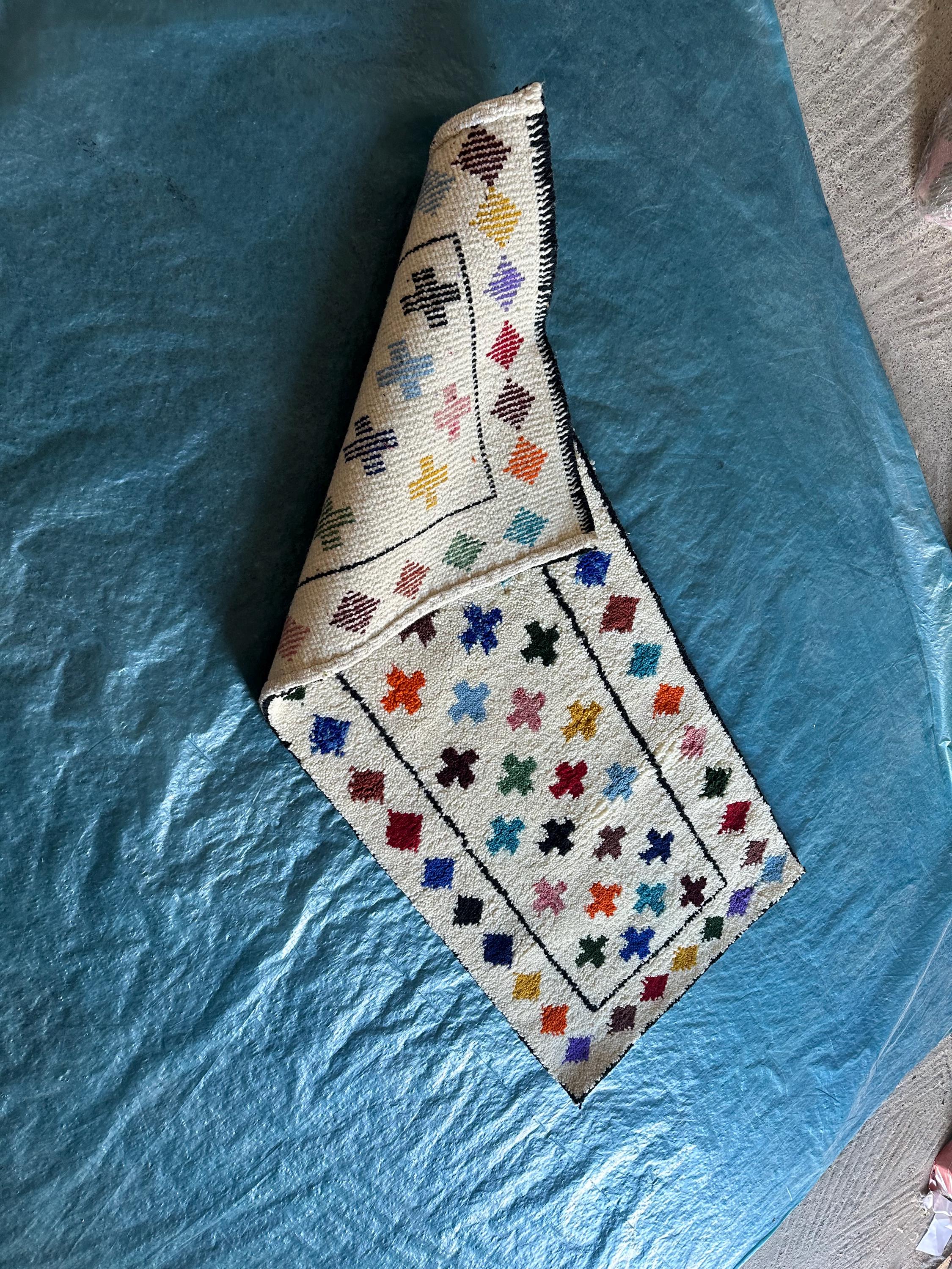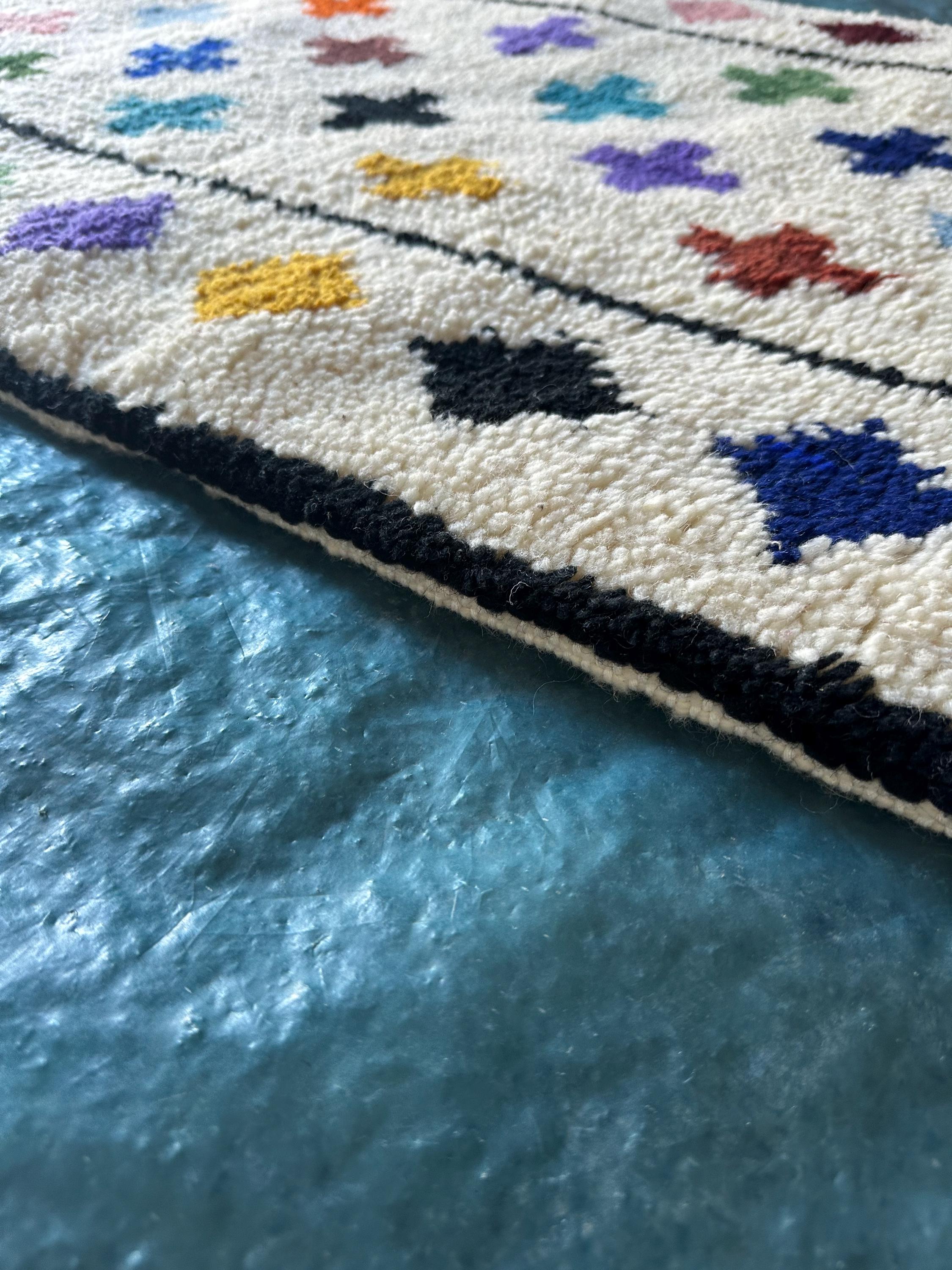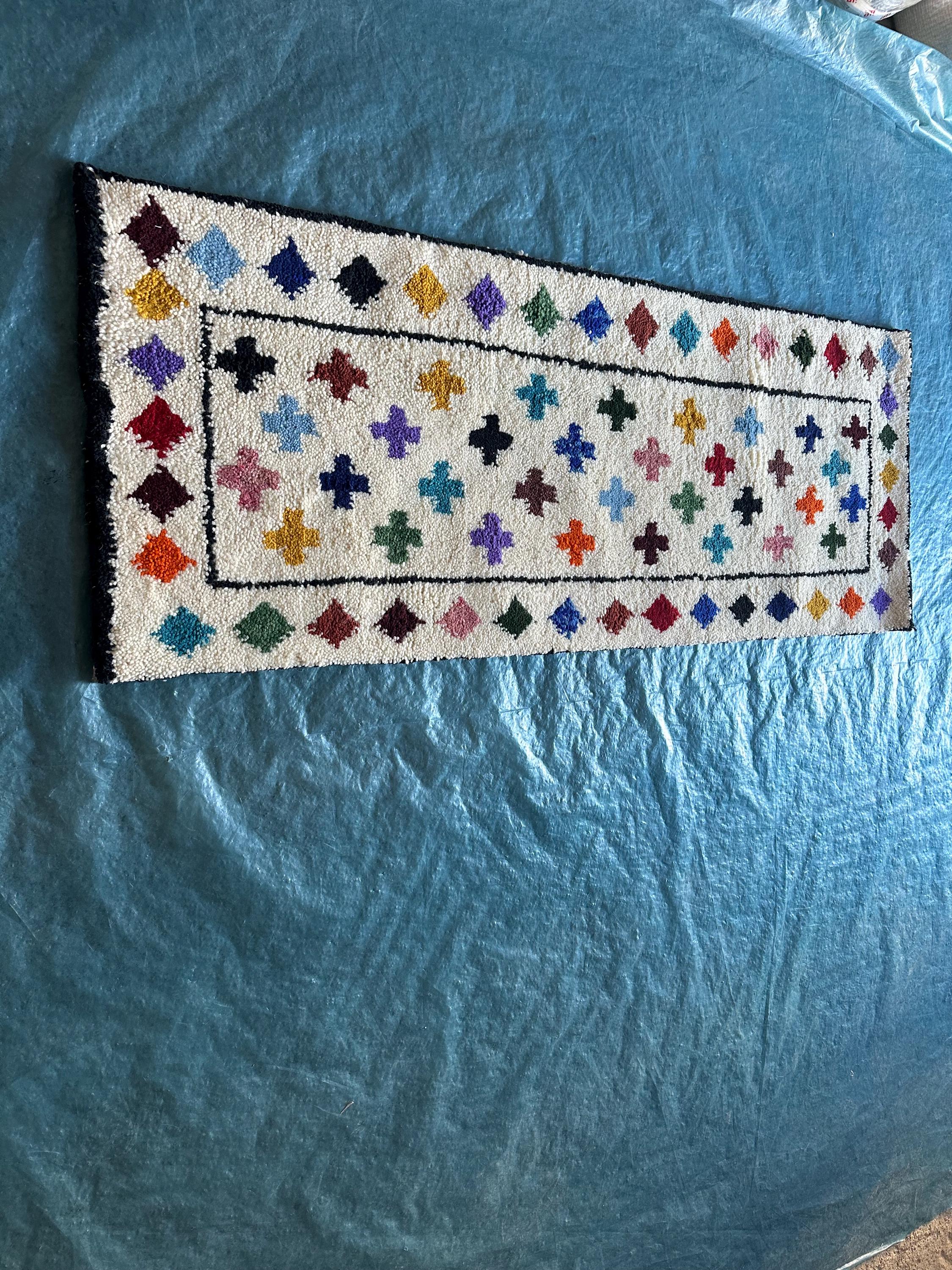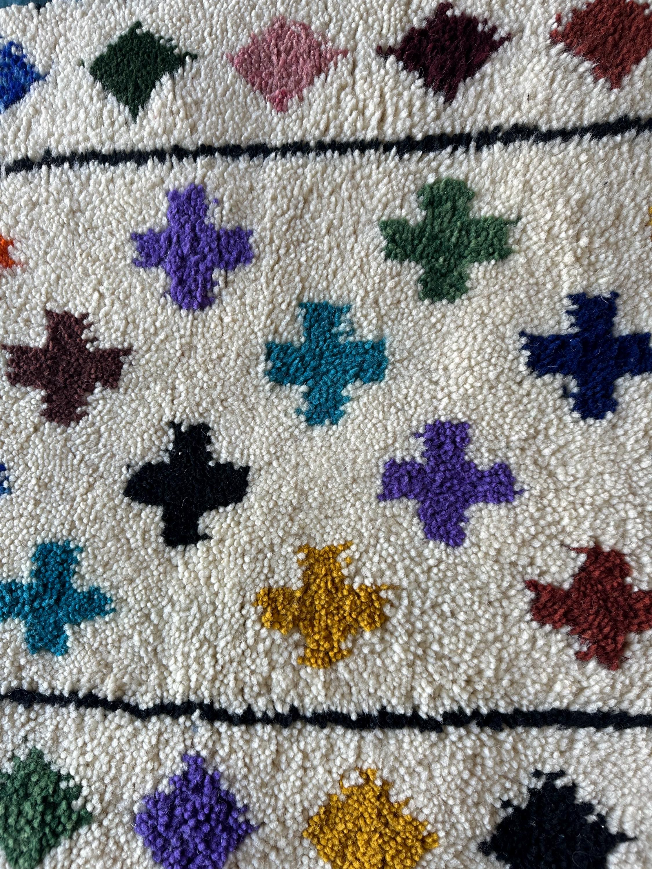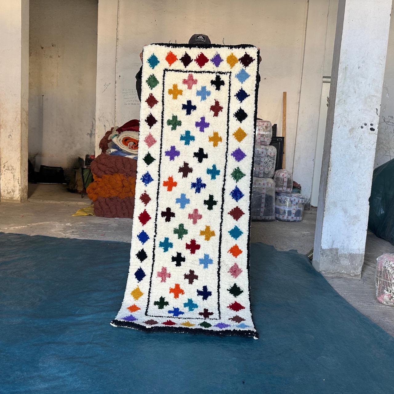 Add a touch of bohemian charm with this White & Multicolor Dotted Beni Ourain Runner Rug. Handmade from premium wool, this custom Moroccan carpet features a unique dotted design, making it a perfect fit for hallways, entryways, bedrooms, or any cozy space. Its soft texture and authentic craftsmanship bring warmth and style to your home decor.