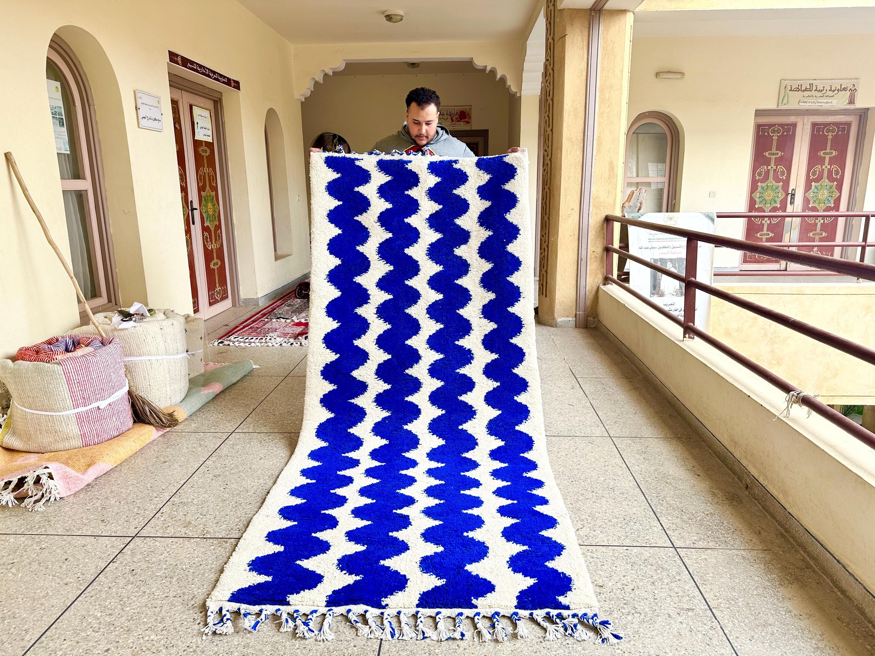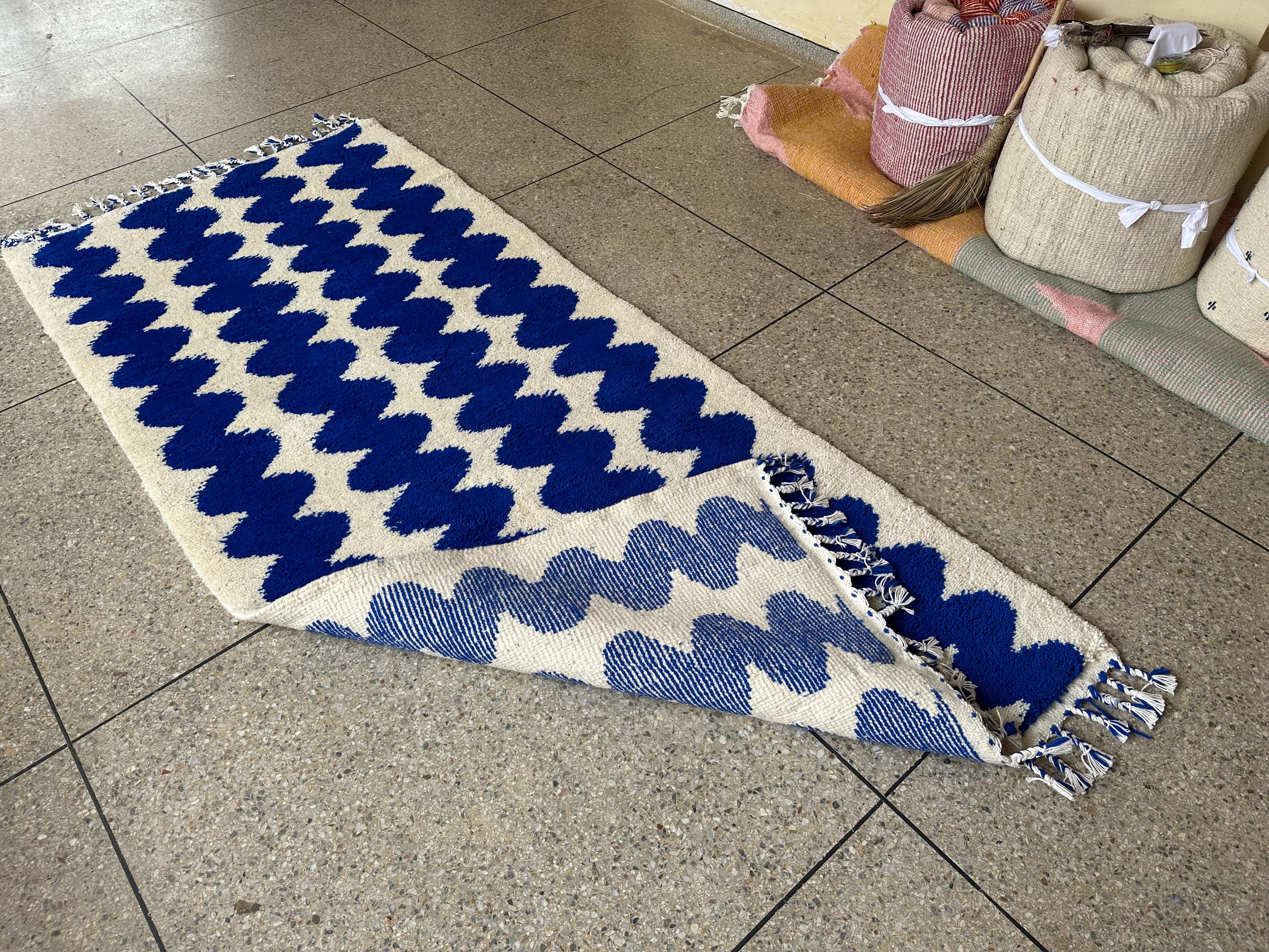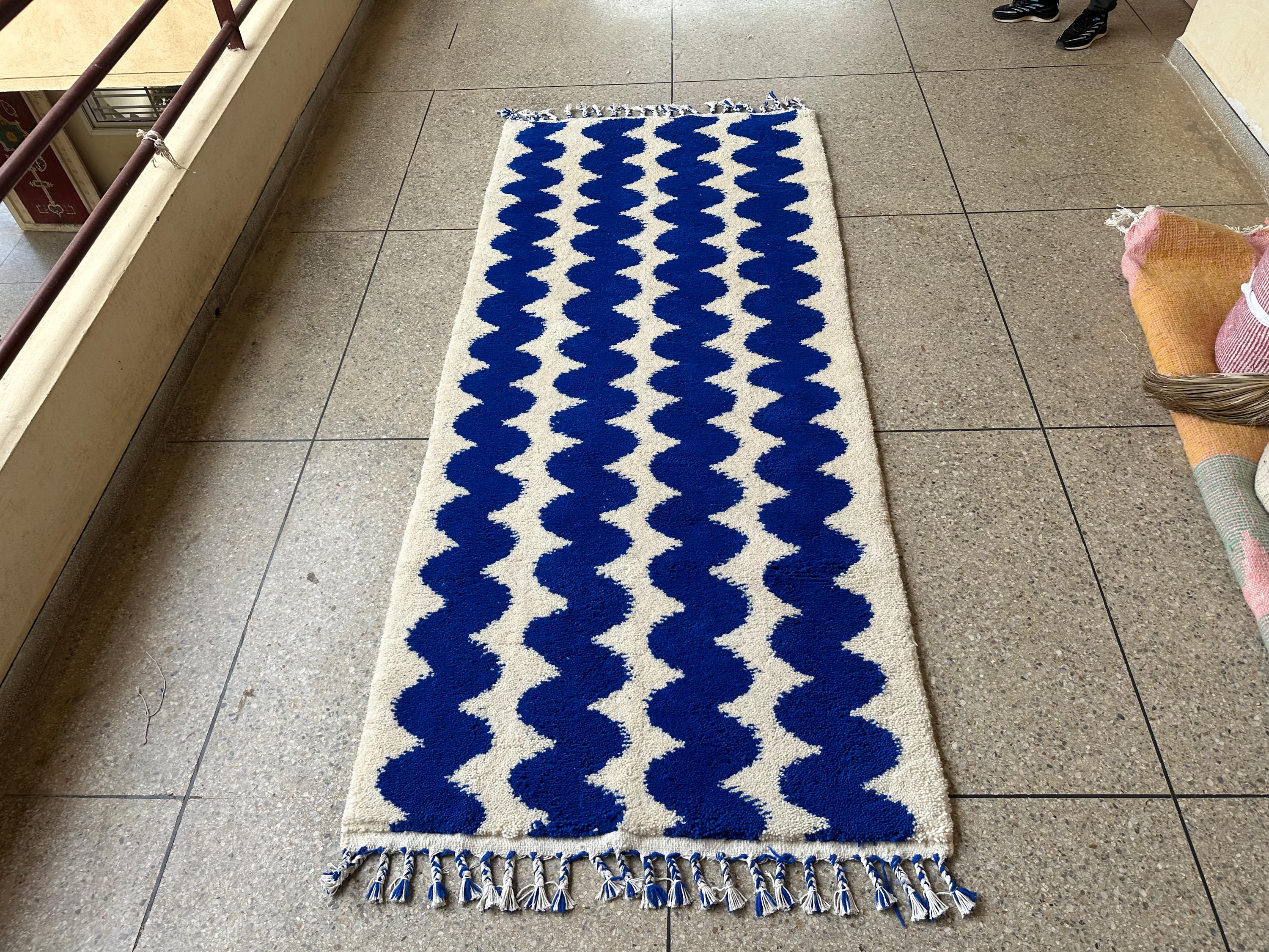 Elevate your space with our stunning BENI OURAIN RUNNER, a custom Moroccan blue and white rug that brings a touch of elegance to any entryway. This striped handmade wool rug is both perfect for hallways, offering style and coziness. Crafted with care, each Berber area rug showcases unique patterns that add character to your home. Whether you're redesigning your living space or enhancing your decor, this versatile rug is the ideal choice for making a statement. Transform your hallway today!