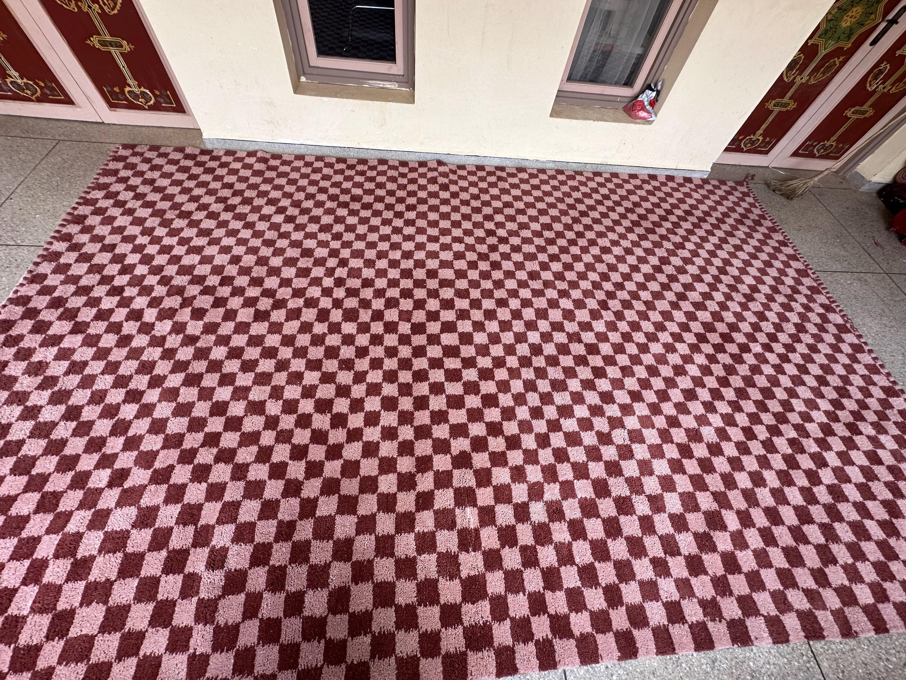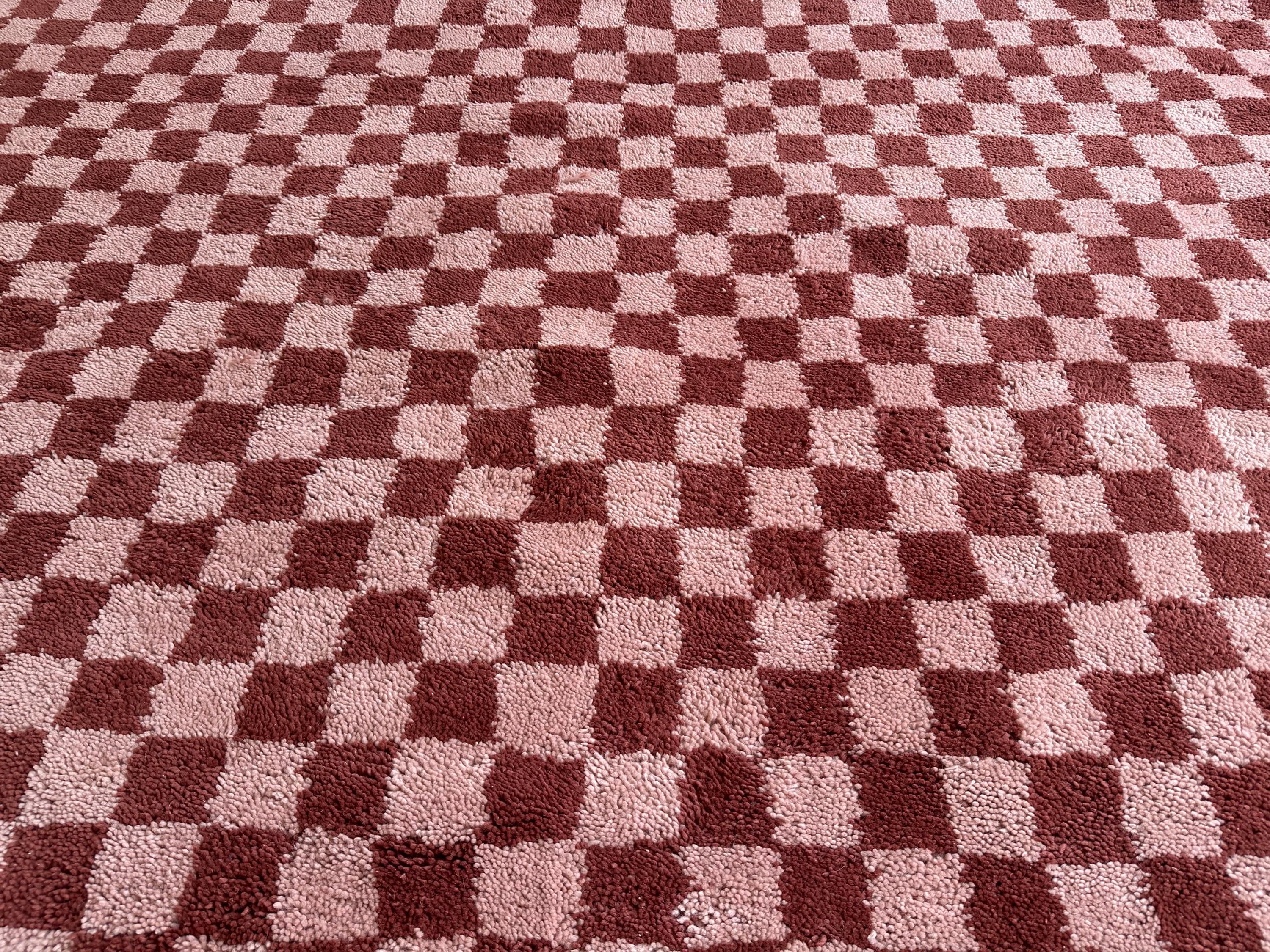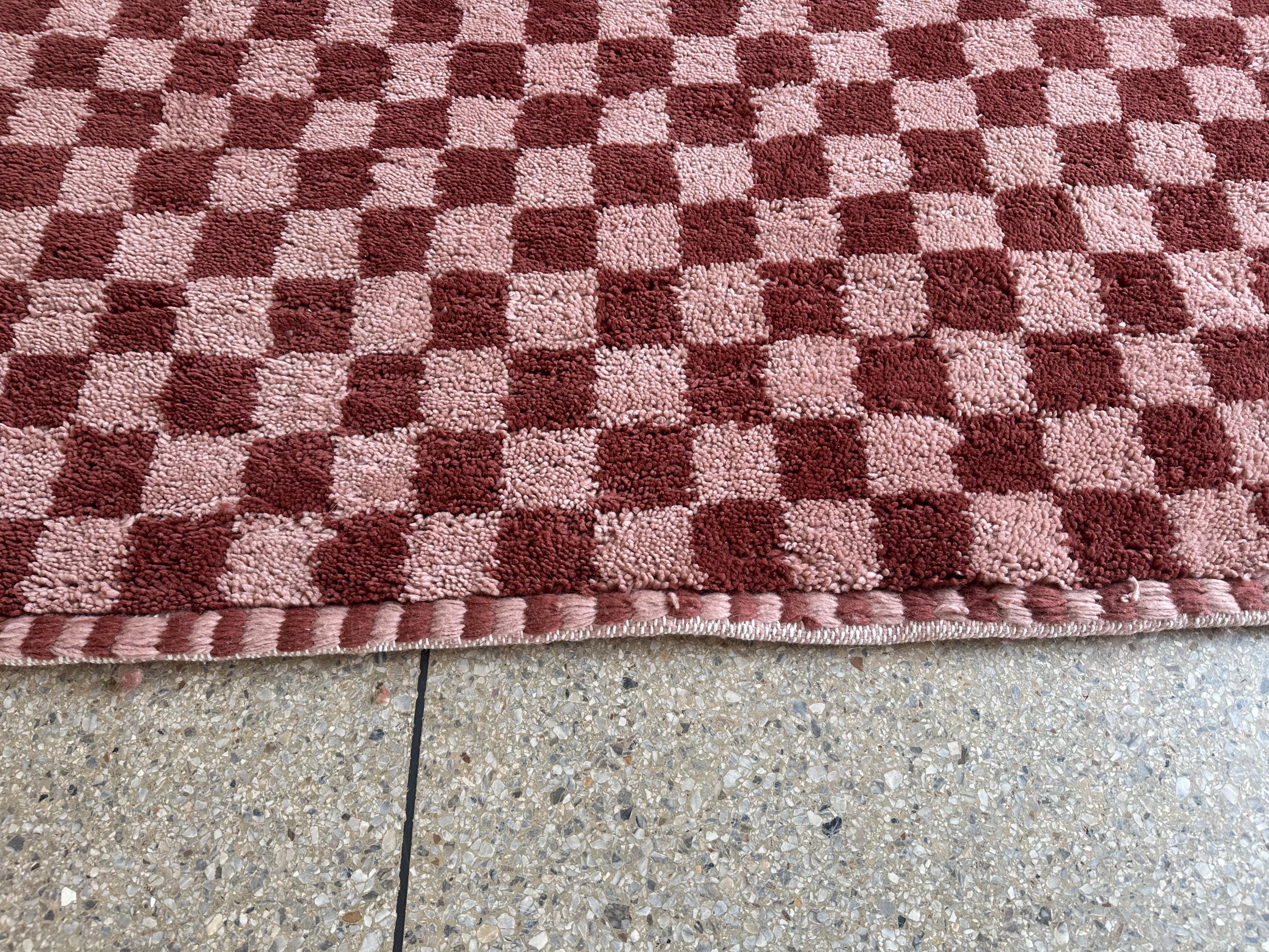 Add a touch of warmth and style to your space with this amazing checkered rug. Handmade from high-quality Moroccan wool, this soft Beni Ourain rug features a beautiful pink and red color scheme. Customize the size to fit your space perfectly. Elevate your home decor with this exquisite handmade Berber carpet today!