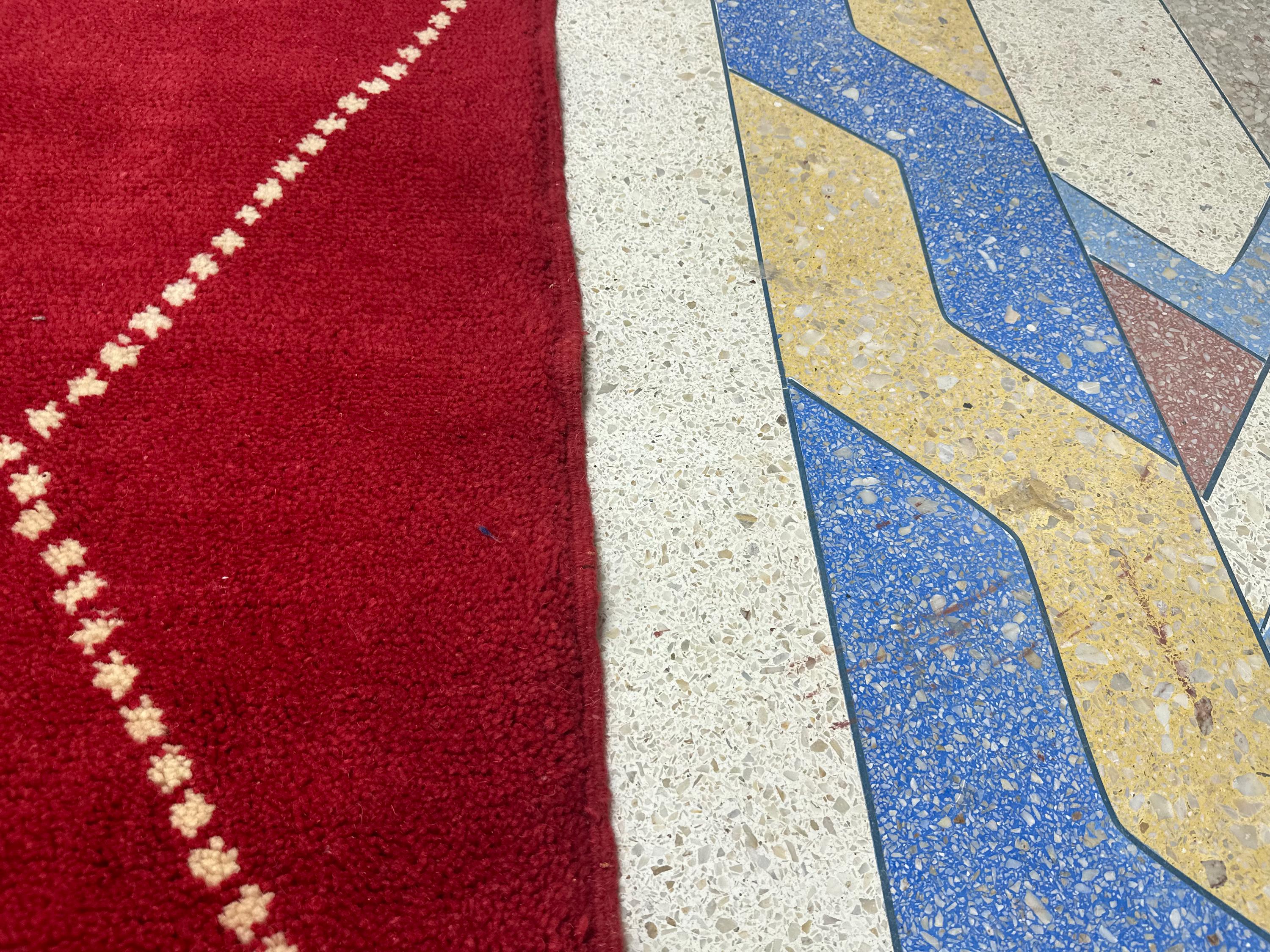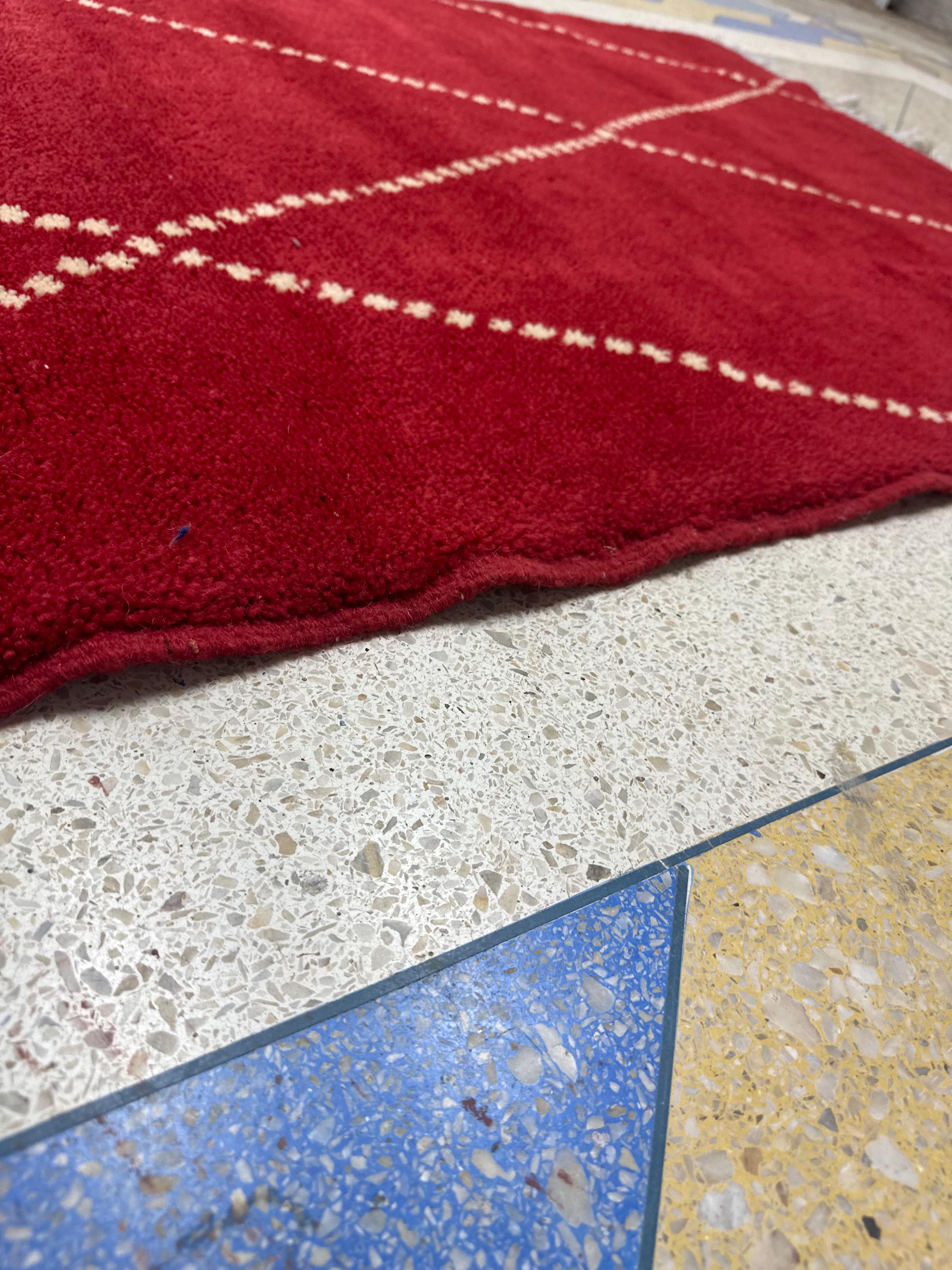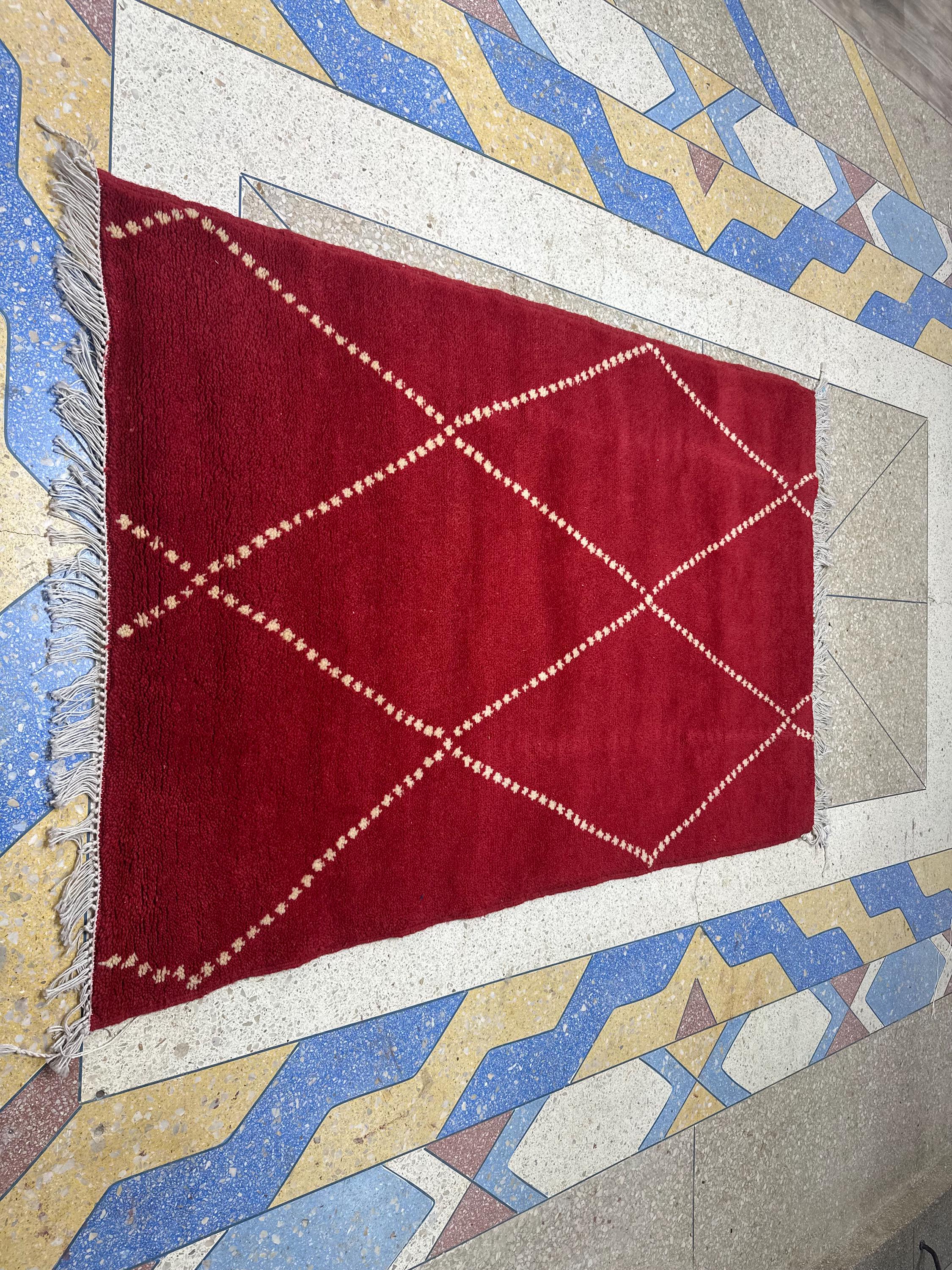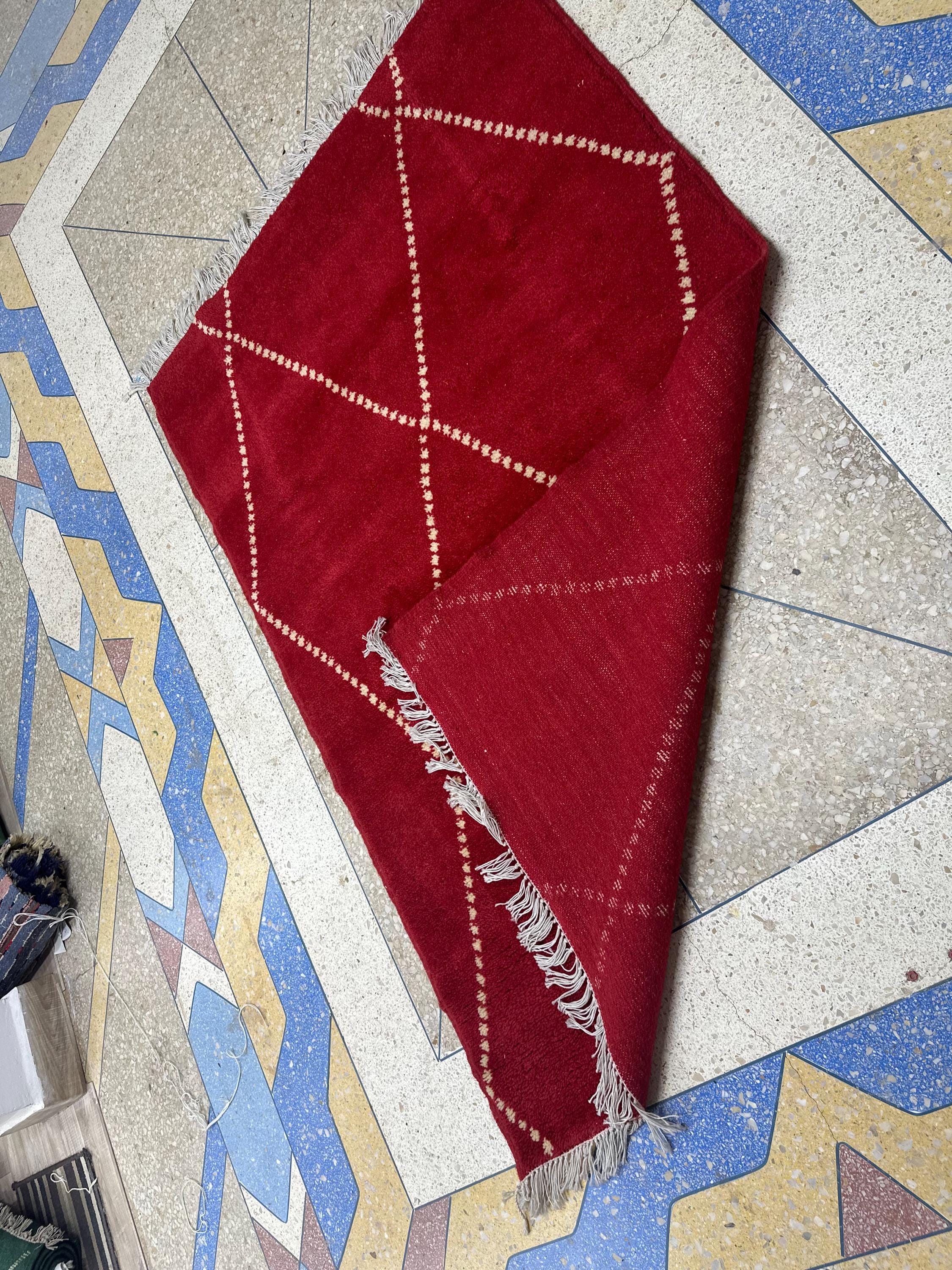 Artistic Moroccan Beni Ourain Rug – 6.1x3.6 ft Handwoven Geometric Area Rug, Red and White Berber Wool, Perfect for Living Room Décor