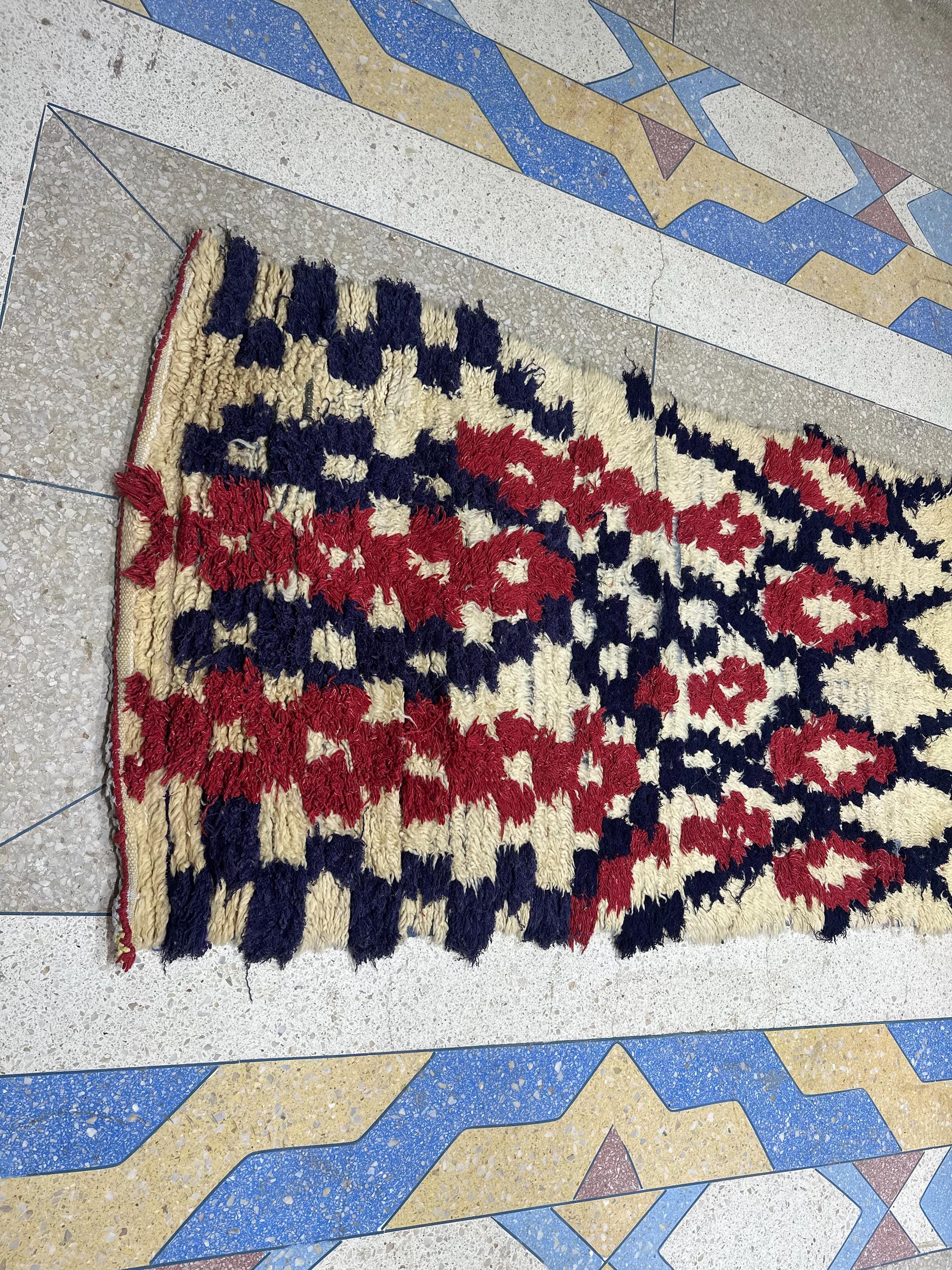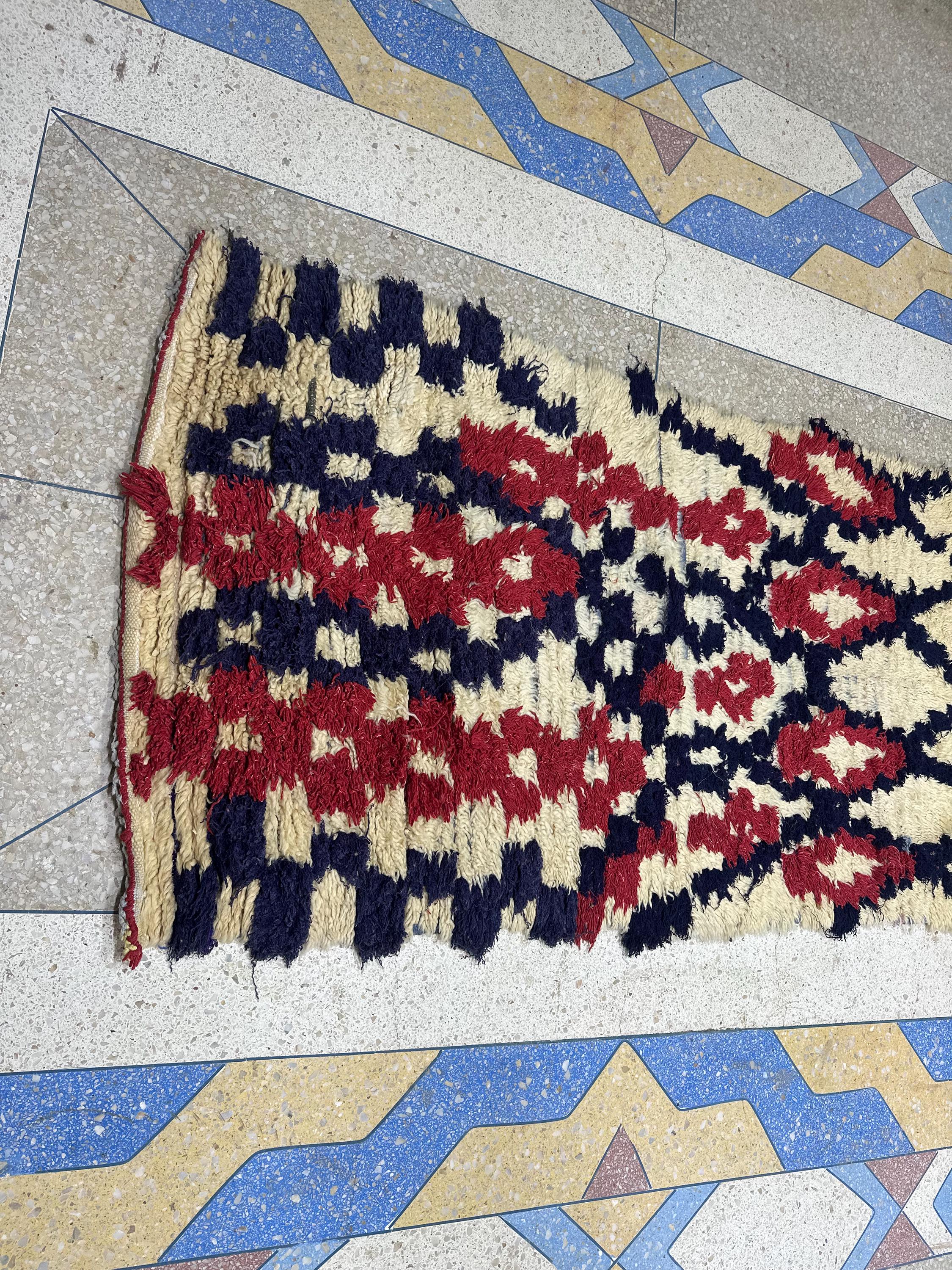 .Vintage Moroccan Berber rug 2.9x6 ft, handmade with cotton & wool. Colorful geometric design, authentic, durable, and one-of-a-kind.
