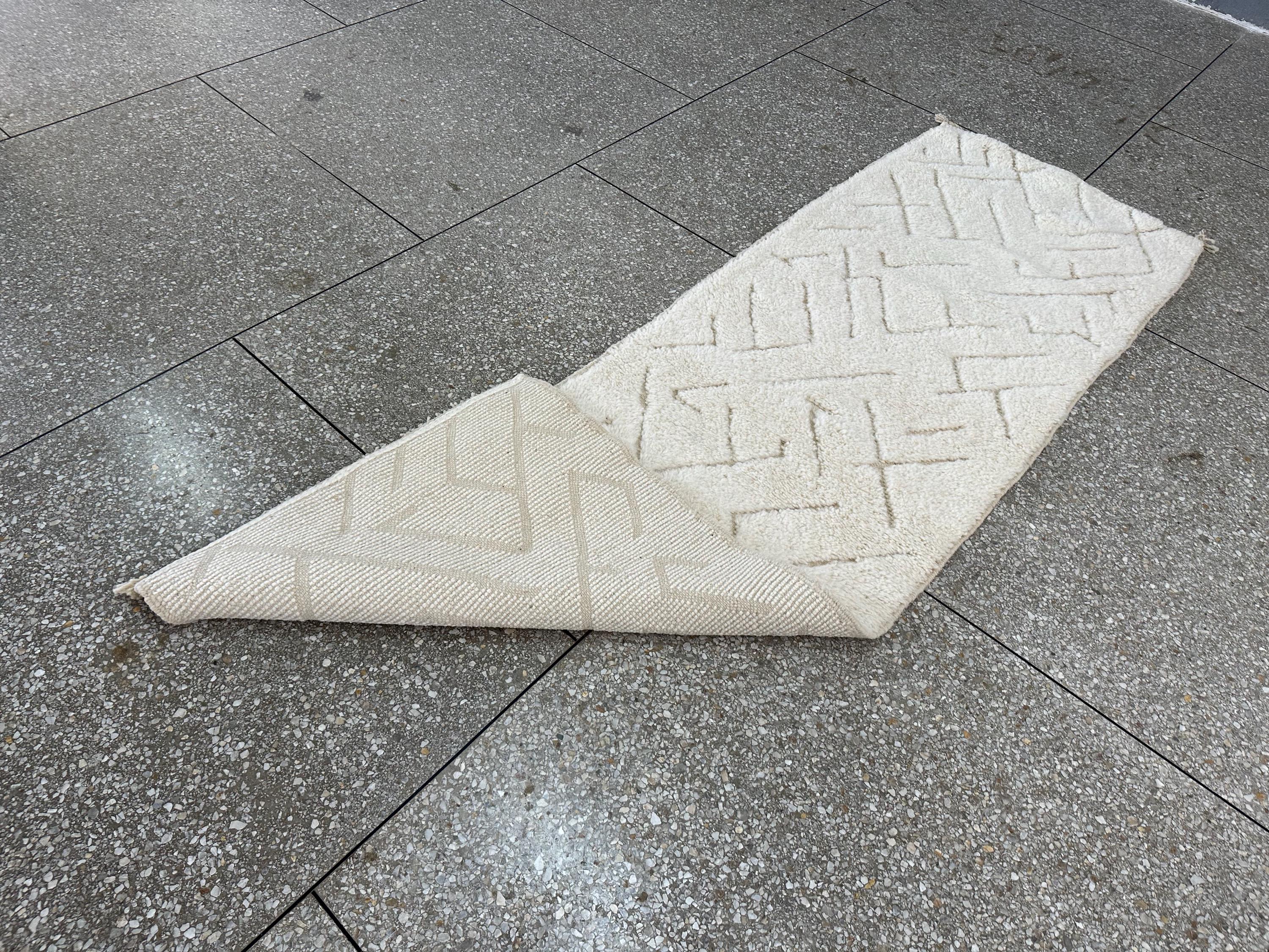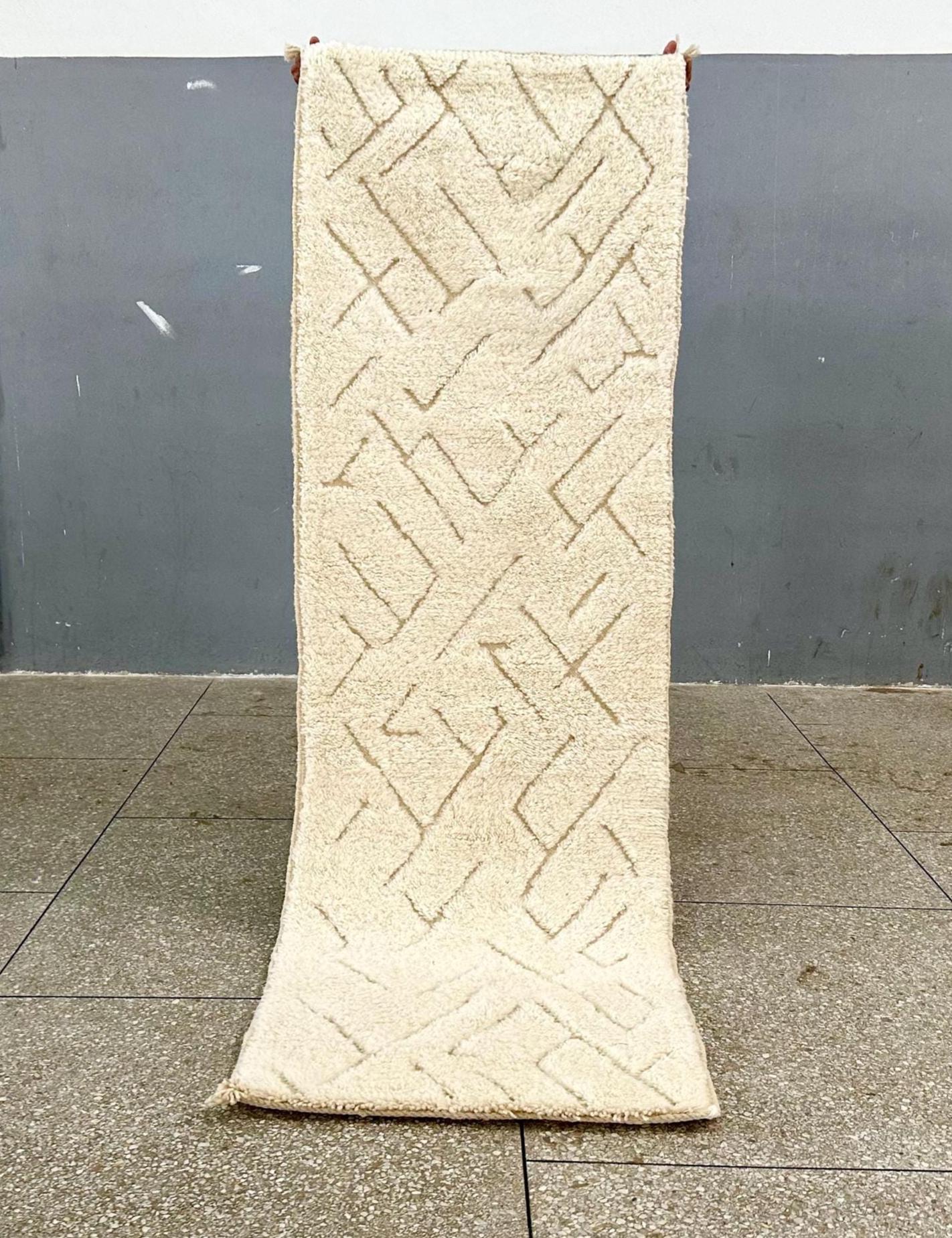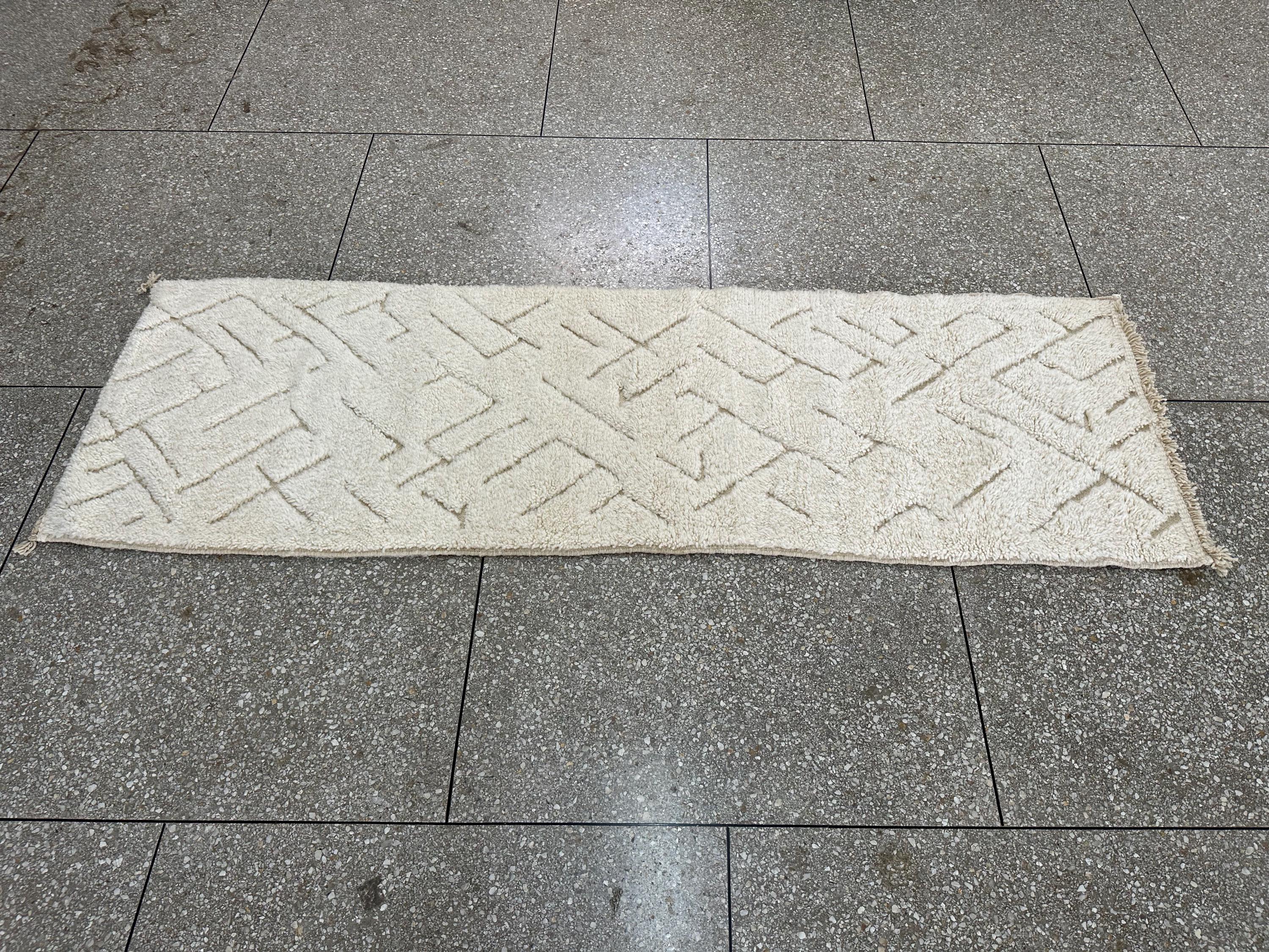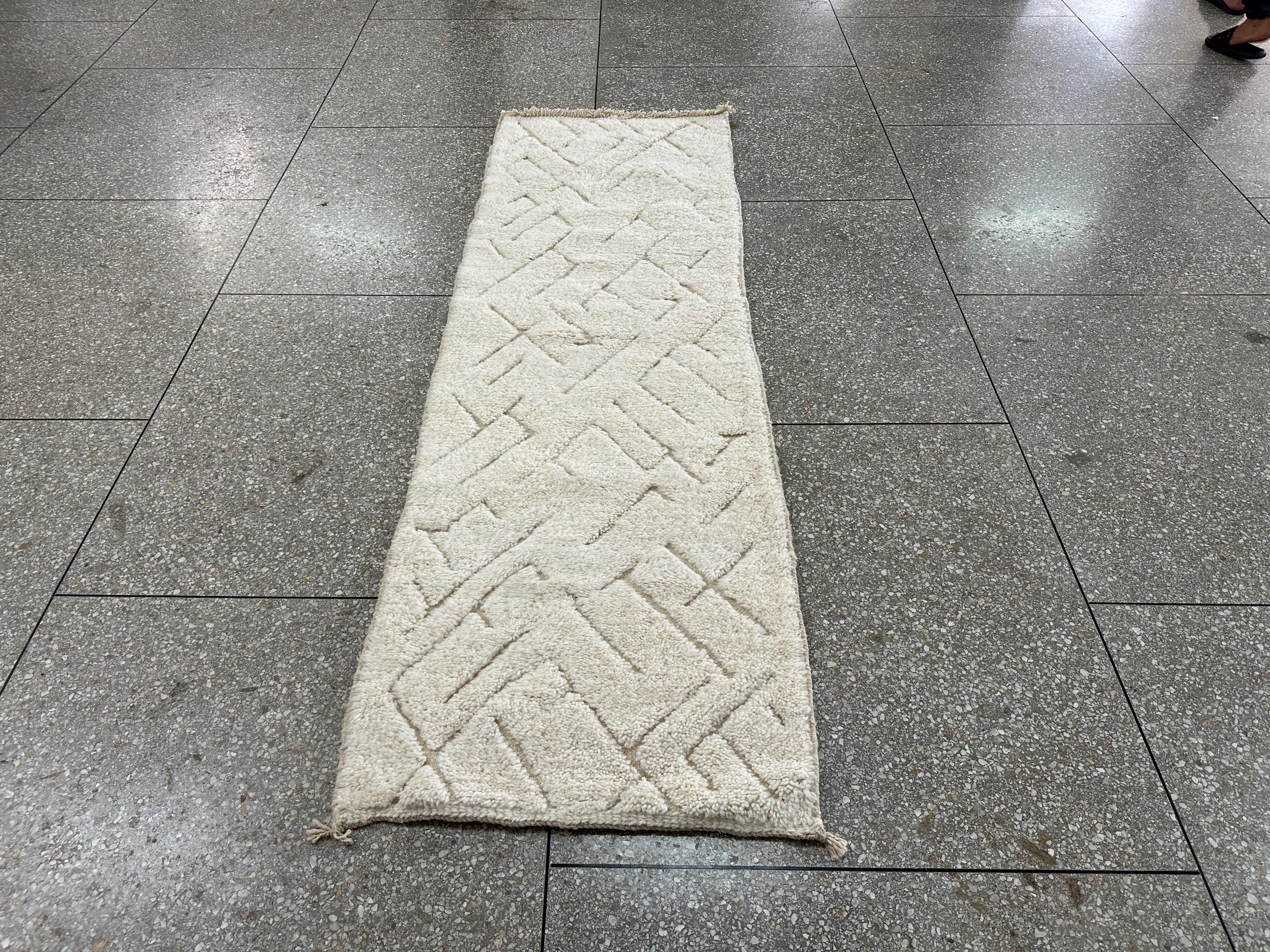 Elevate your home's aesthetic with this Hand-Tufted Moroccan White Abstract Wool Runner, featuring a distinctive Beni Ourain design. Crafted from soft, natural wool, this custom handmade rug offers both comfort and style, making it an ideal addition to contemporary hallways or entryways. Its abstract pattern and neutral tones seamlessly blend with modern décor, providing a touch of Moroccan craftsmanship to your space.