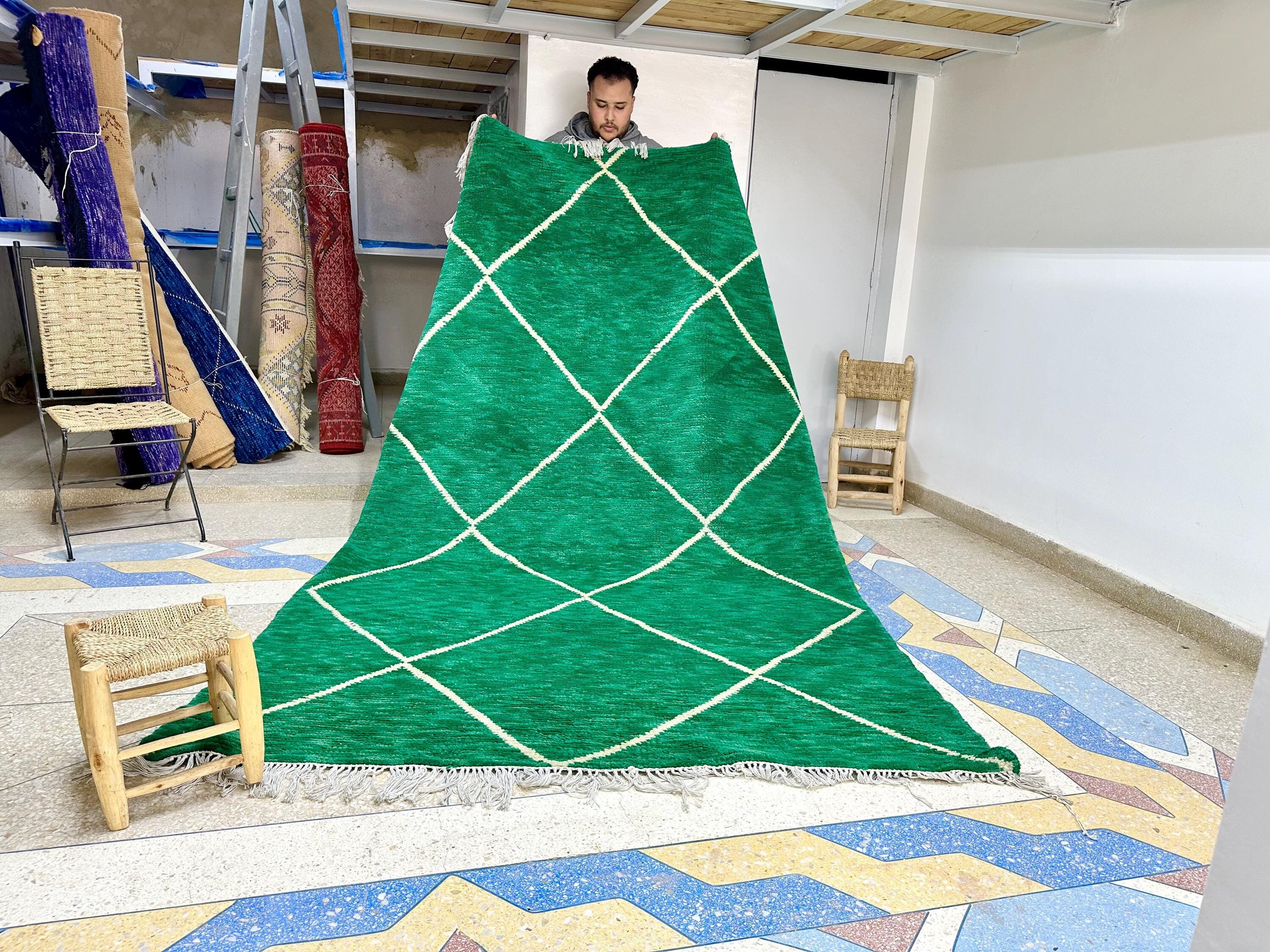 Moroccan Beniourain Geometric Rug - Green Tribal Area Rug - 9.6x5.9FT Woven Rug - Wool Area Rug - Sheep Wool Rug - Dining Room Decor