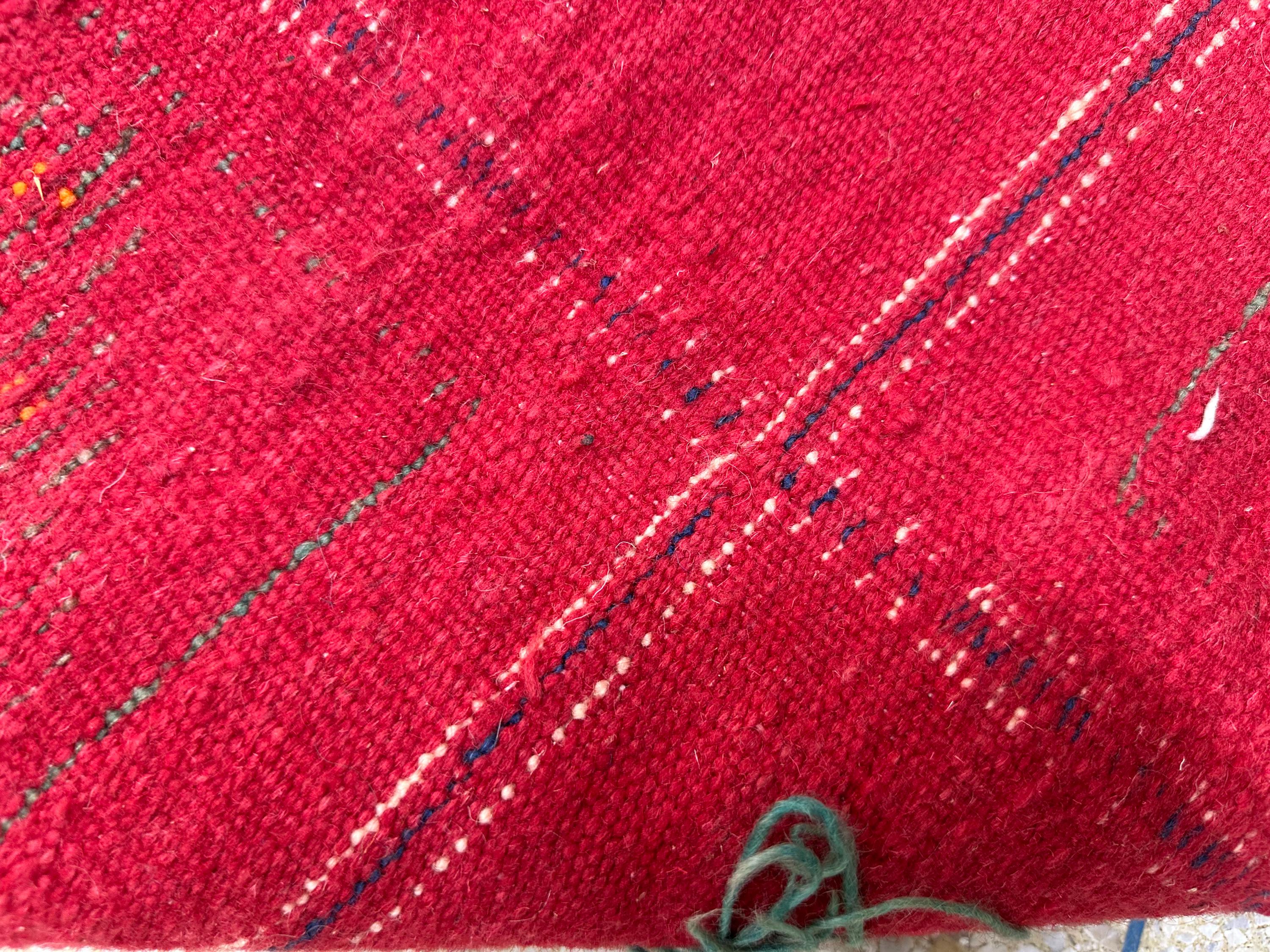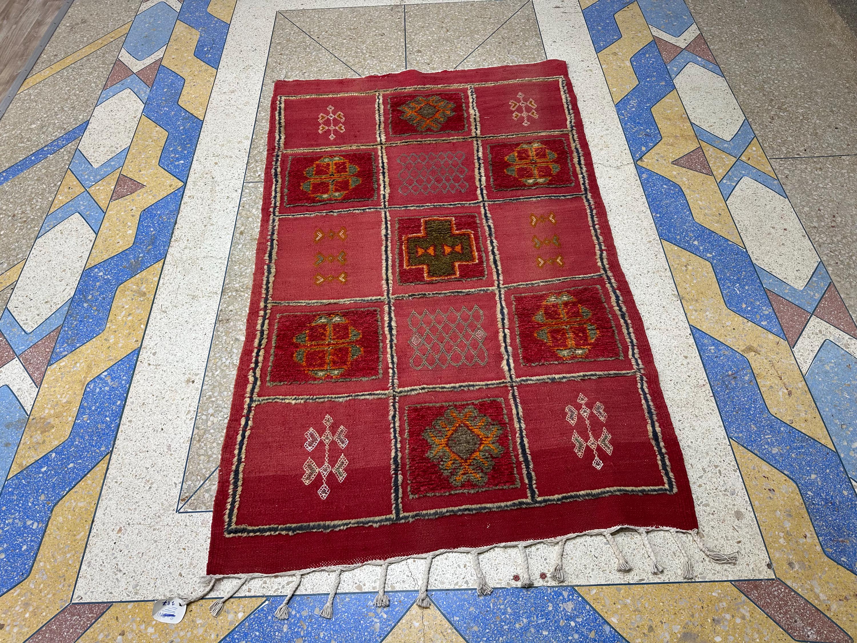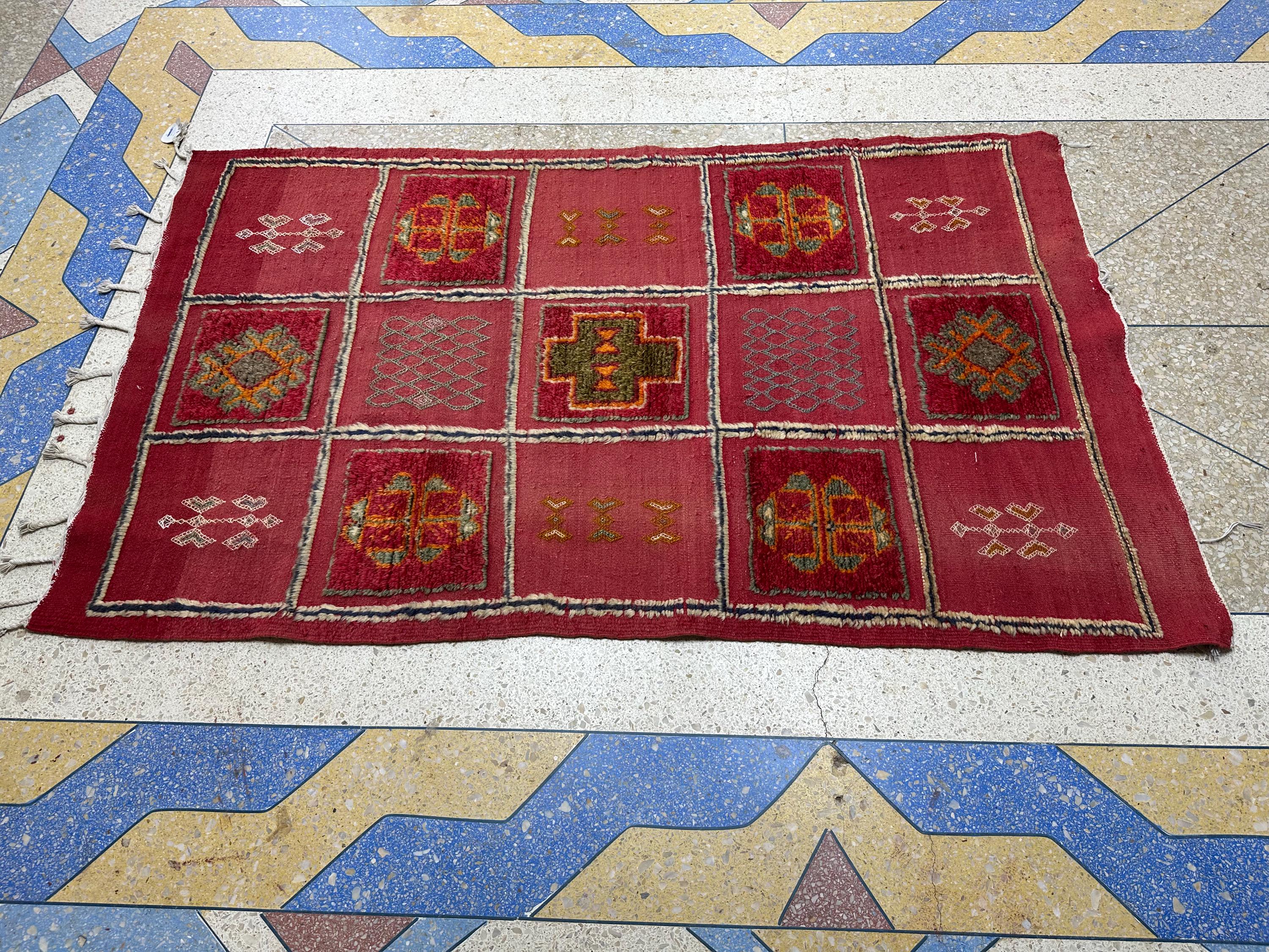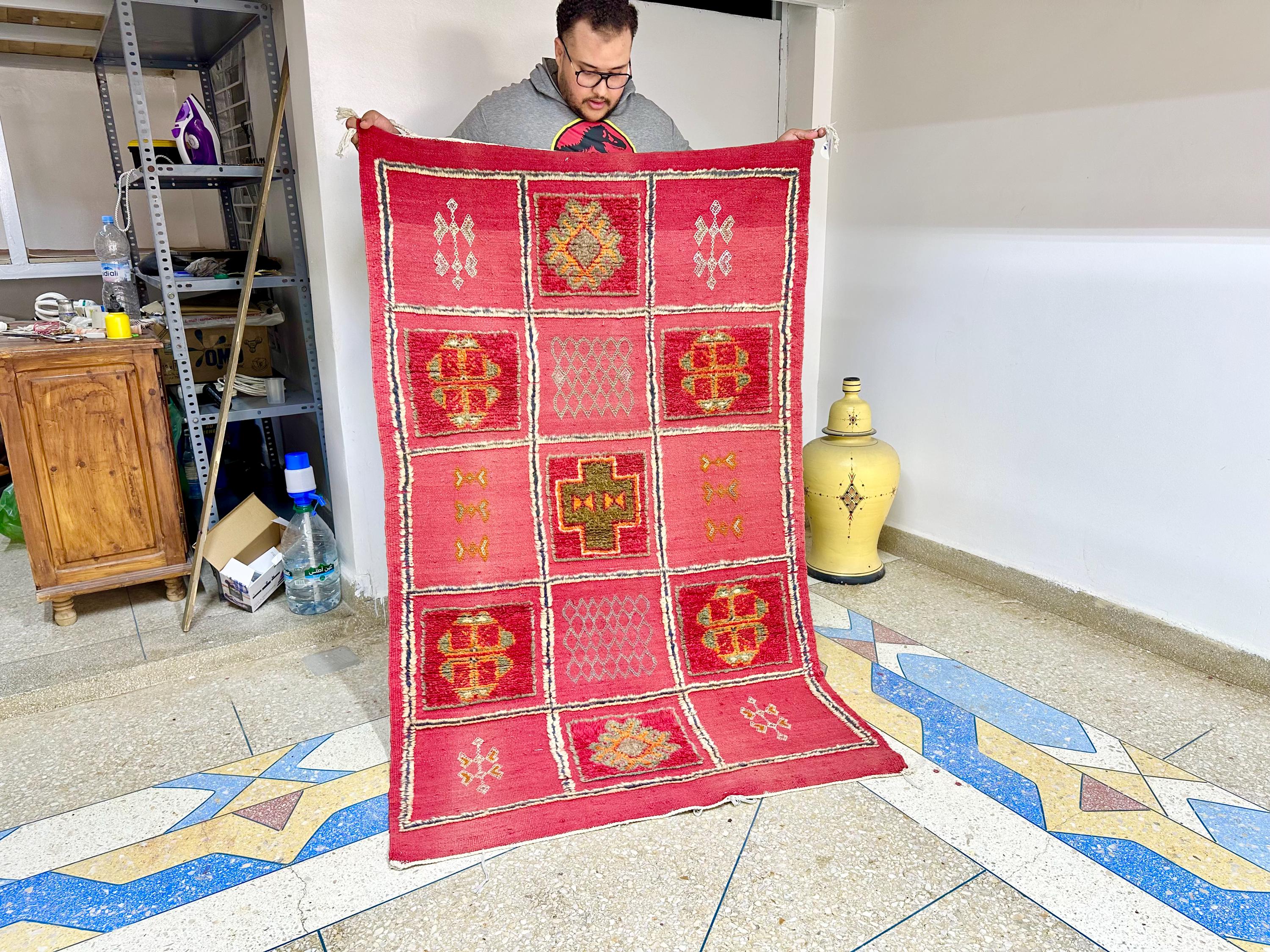 Antique Handmade Carpet - 5.3x3.3 FT Moroccan Berber Red Checkered Wool Rug | Vintage Hand-Knotted Boho Area Rug for Floor Décor