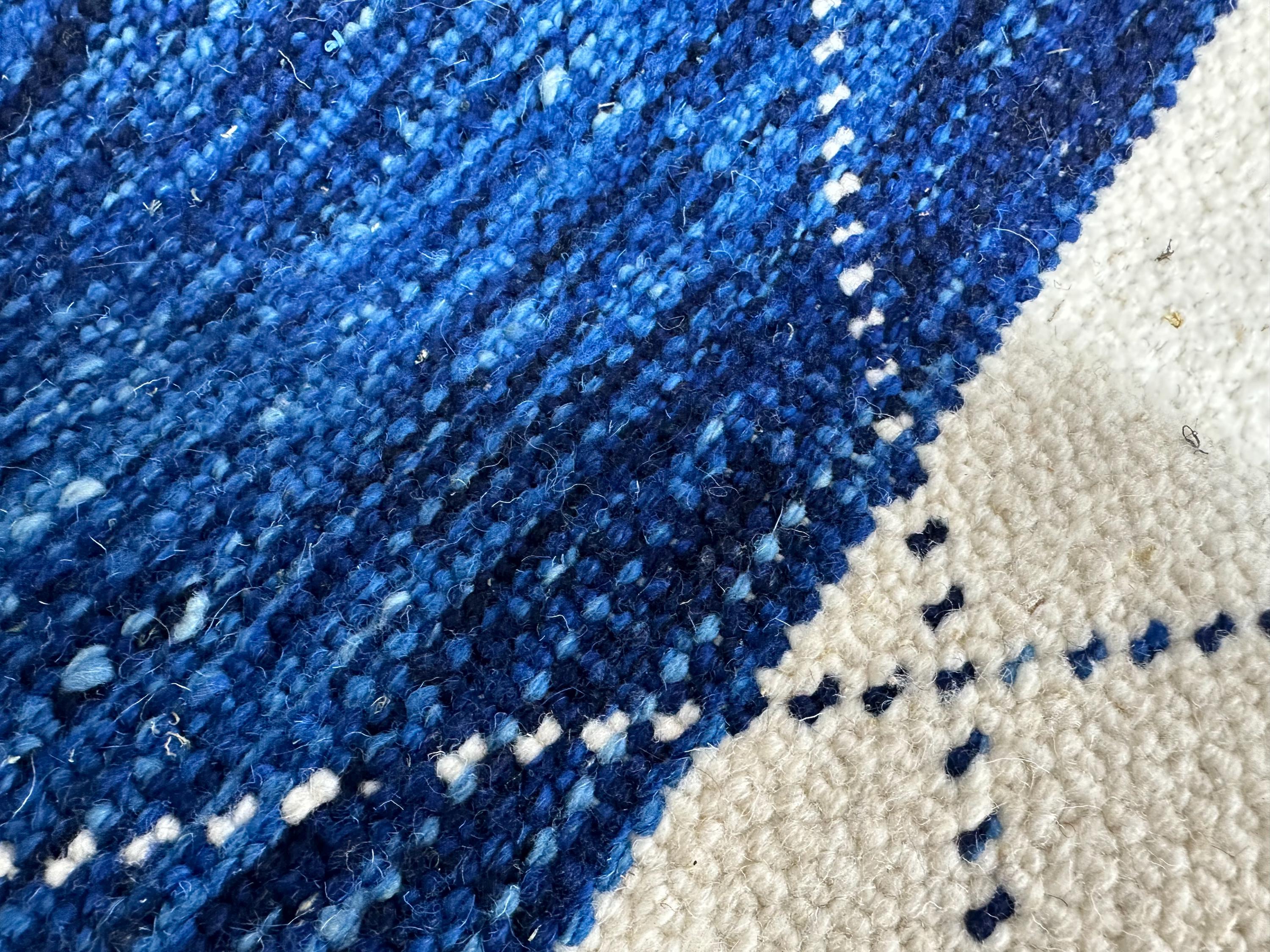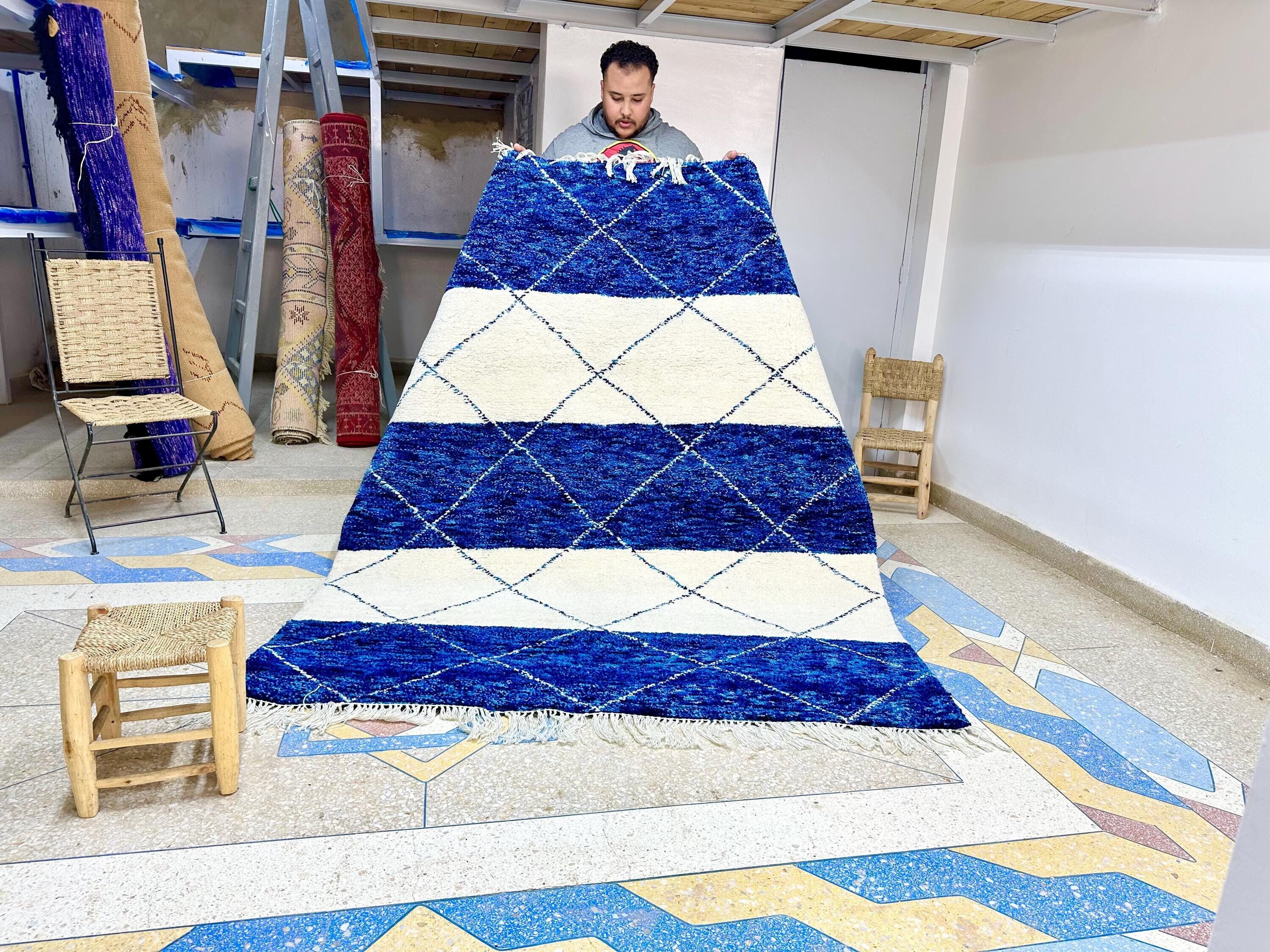 Bring timeless elegance to your space with this White and Blue Geometric Beni Ourain Rug, a handwoven Moroccan wool carpet made with soft, premium-quality wool. The custom striped design blends modern aesthetics with traditional Berber craftsmanship, making it an ideal area rug for bohemian living rooms, bedrooms, or eclectic home decor.