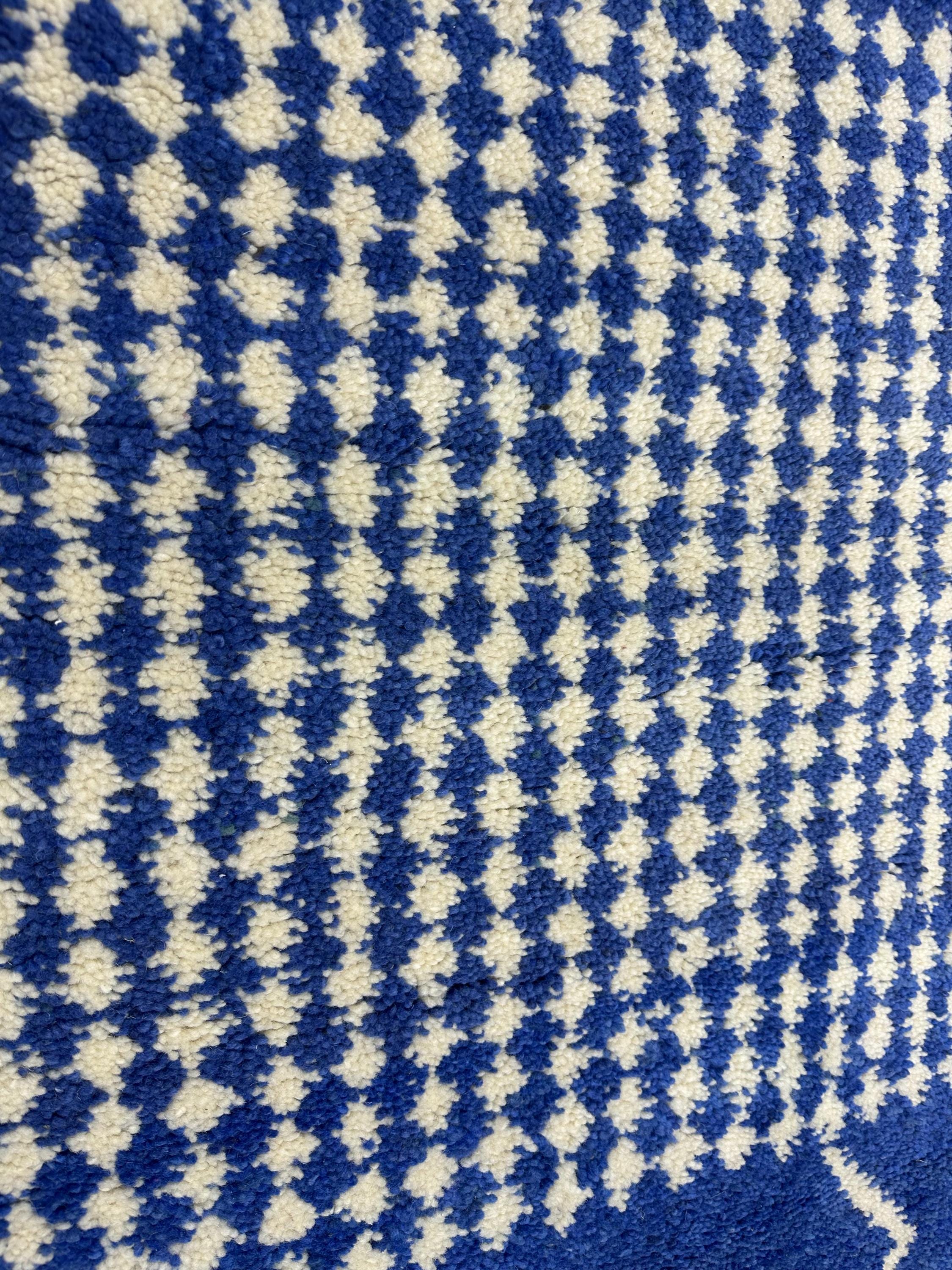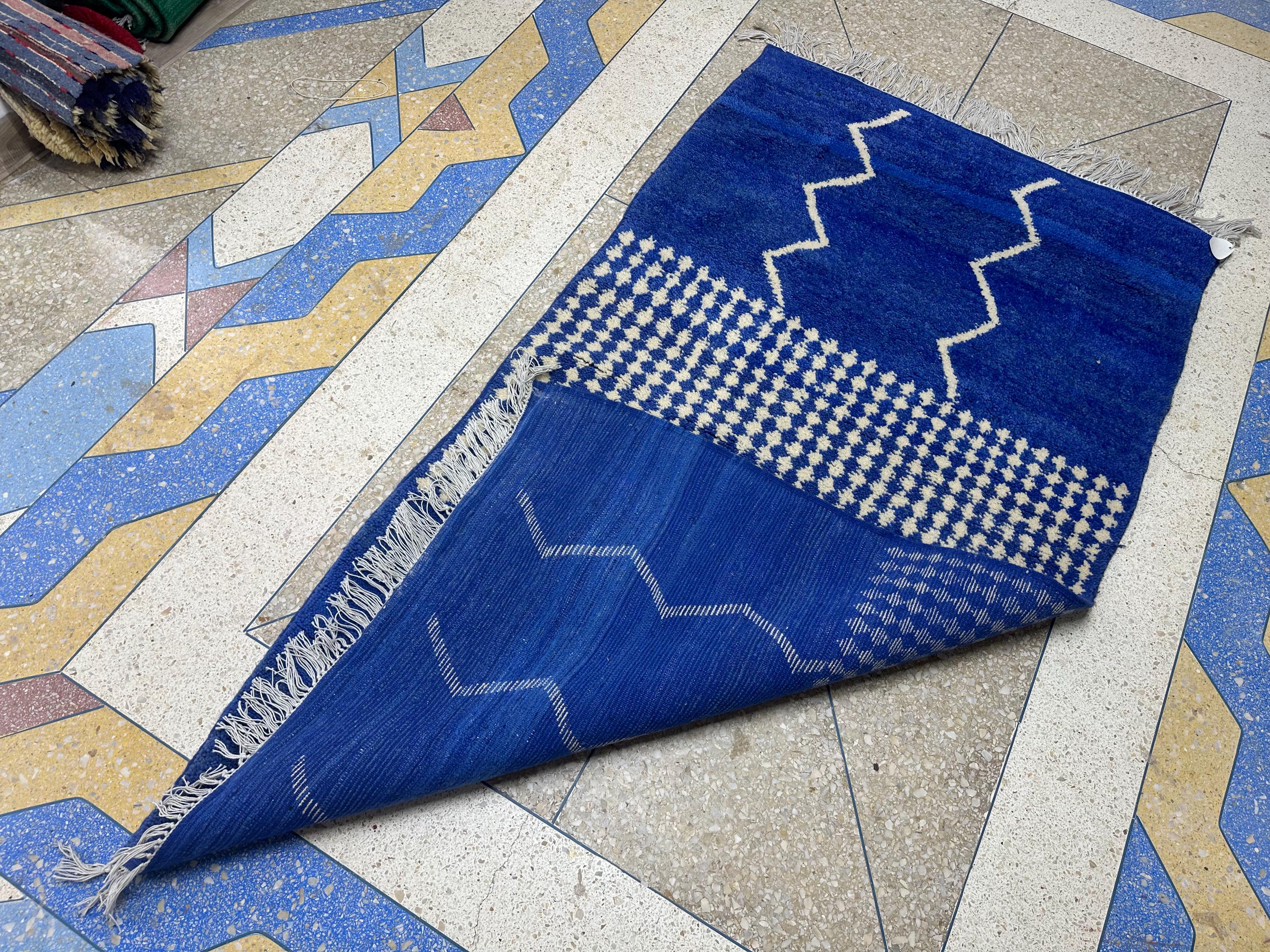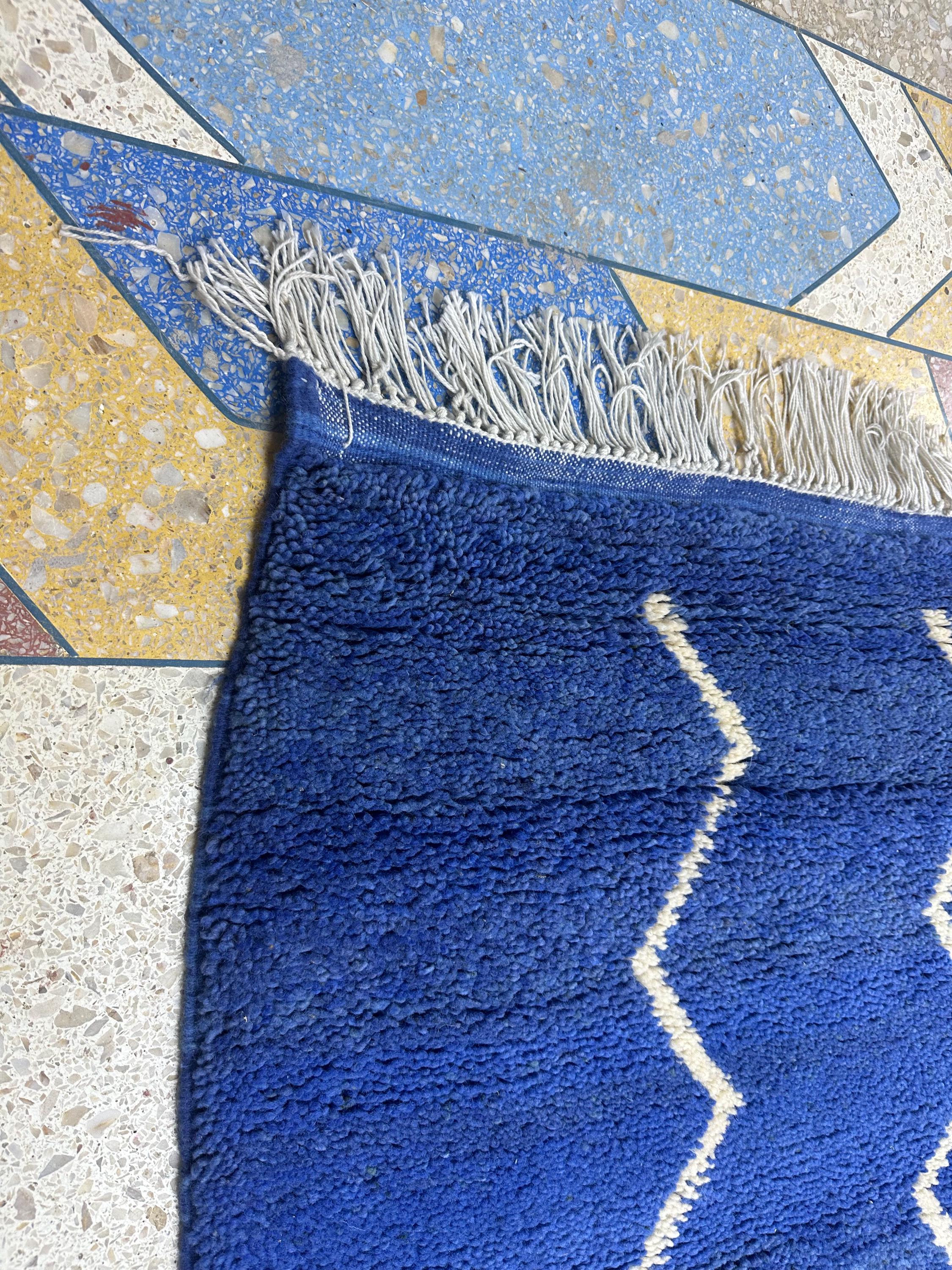 Authentic Moroccan Beni Ourain Rug – Handwoven Berber Blue Wool with White Abstract Stripes, Boho-Chic Design, Premium Tapis Berbère/Teppich