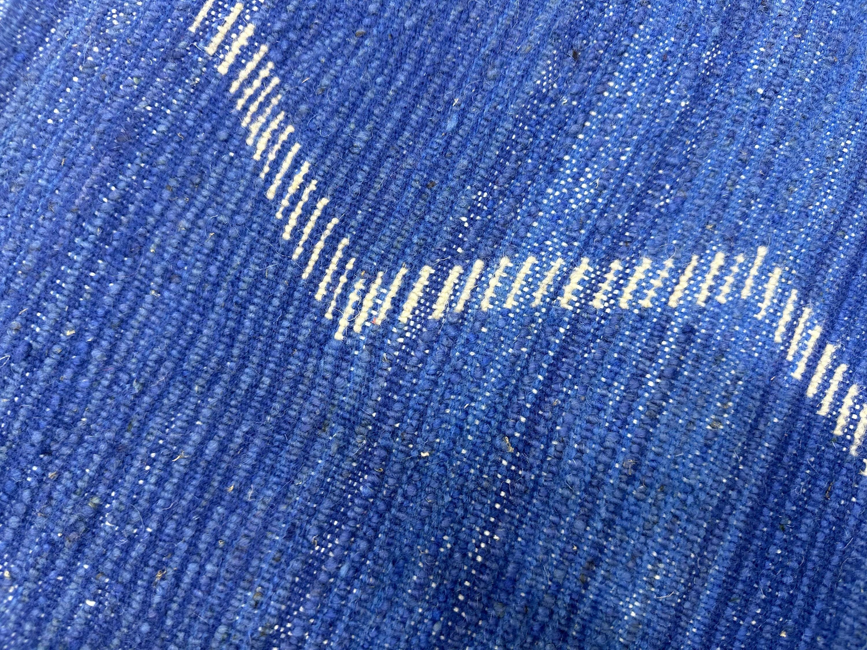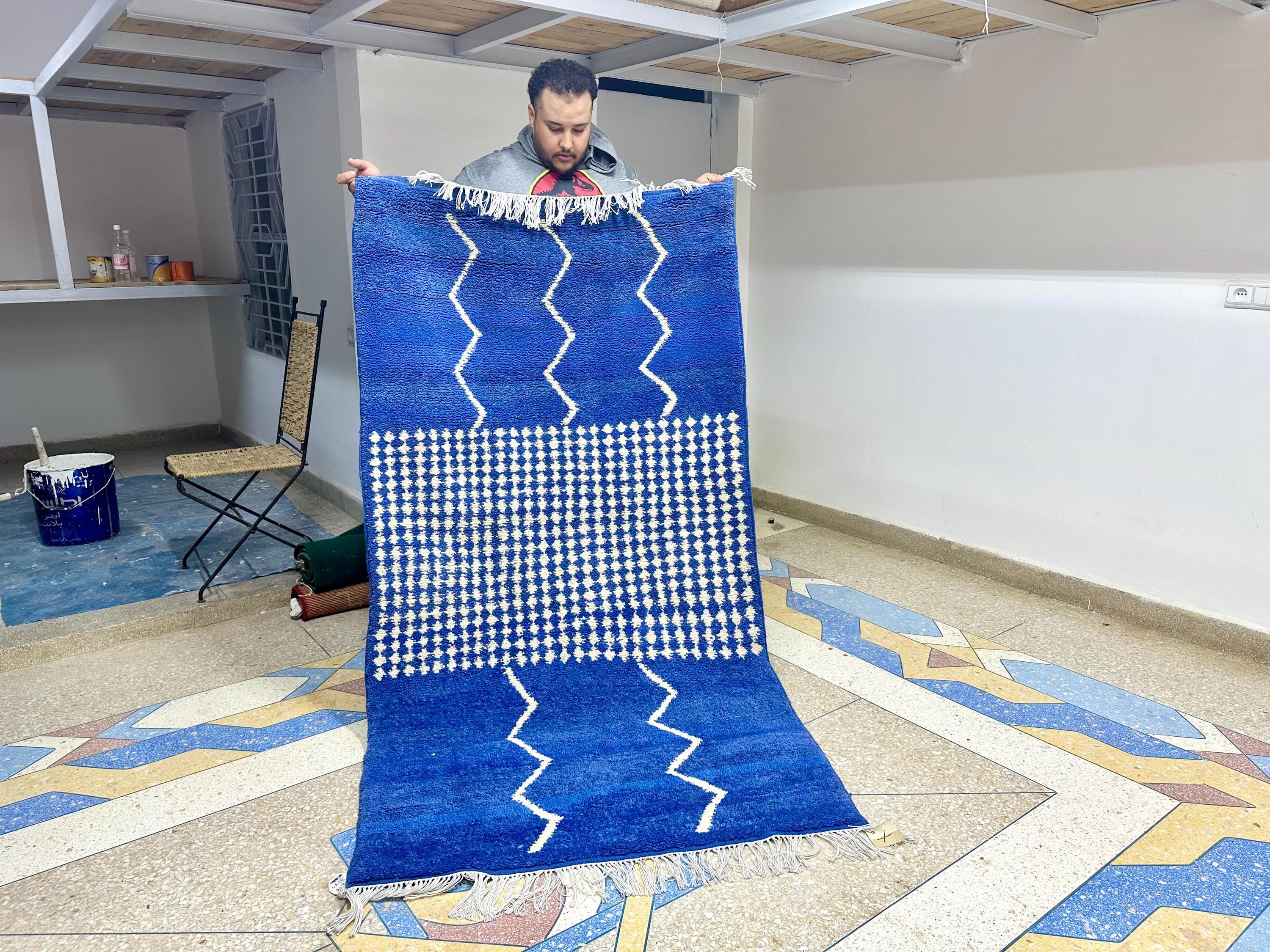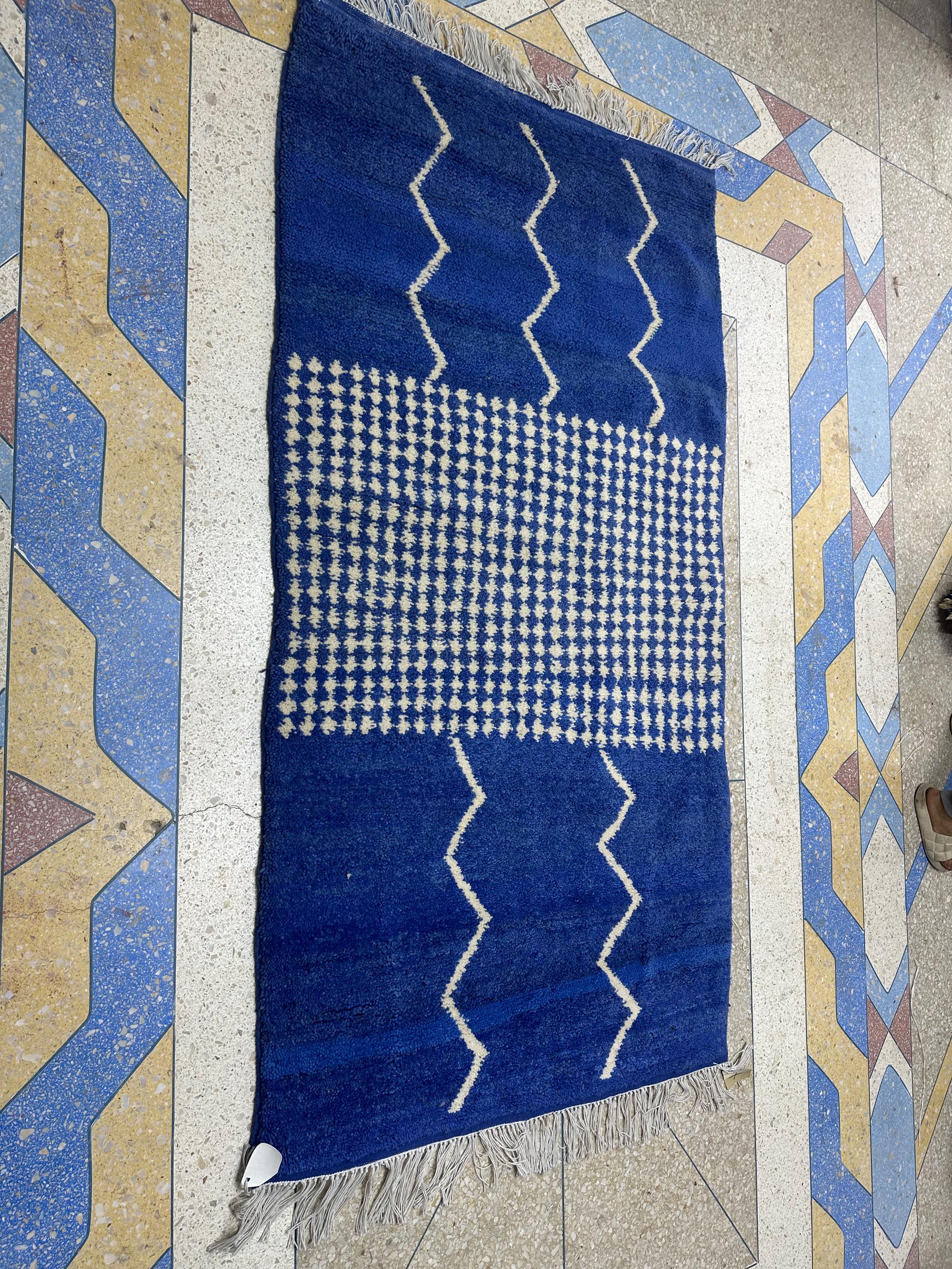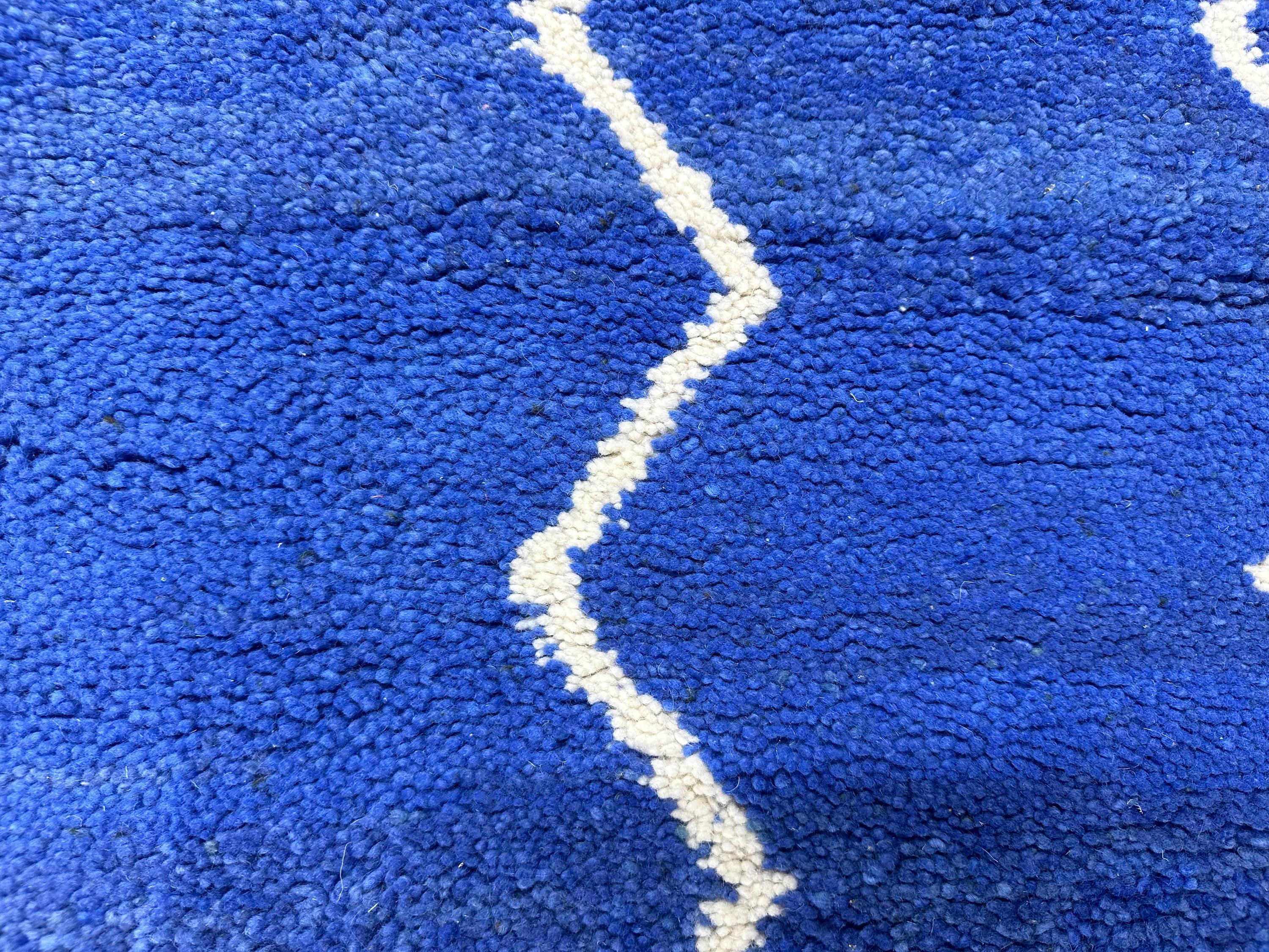 Authentic Moroccan Beni Ourain Rug – Handwoven Berber Blue Wool with White Abstract Stripes, Boho-Chic Design, Premium Tapis Berbère/Teppich