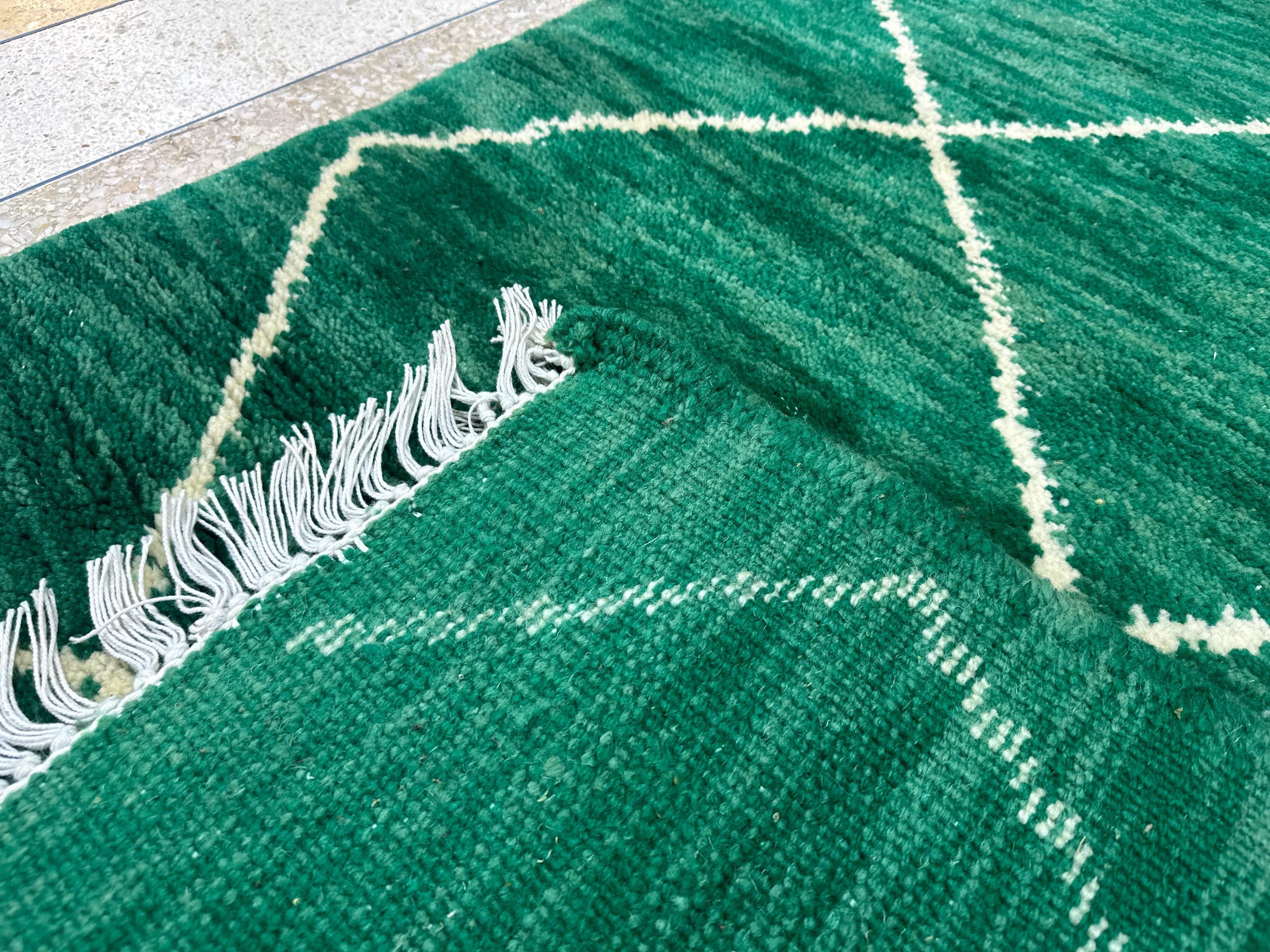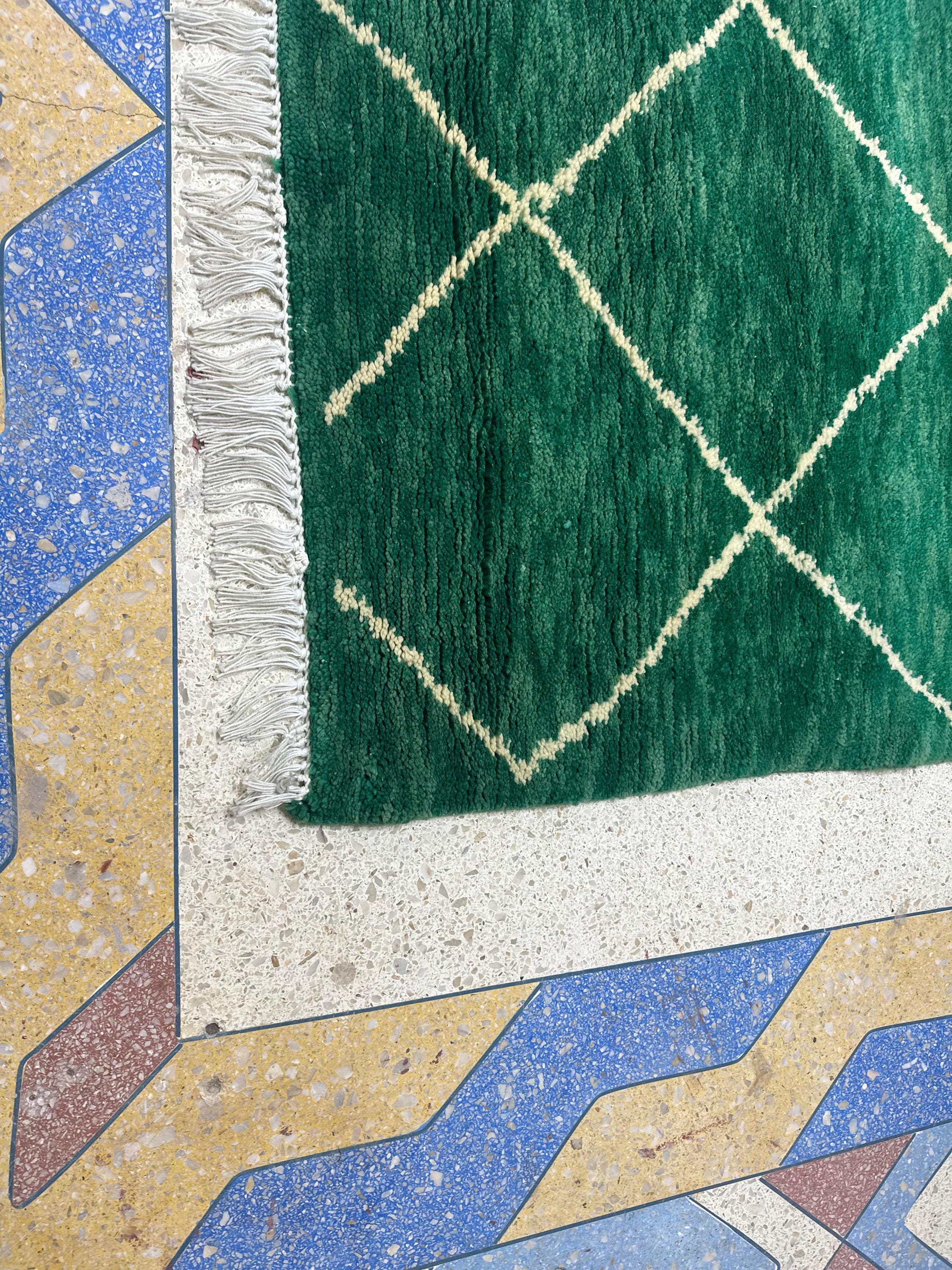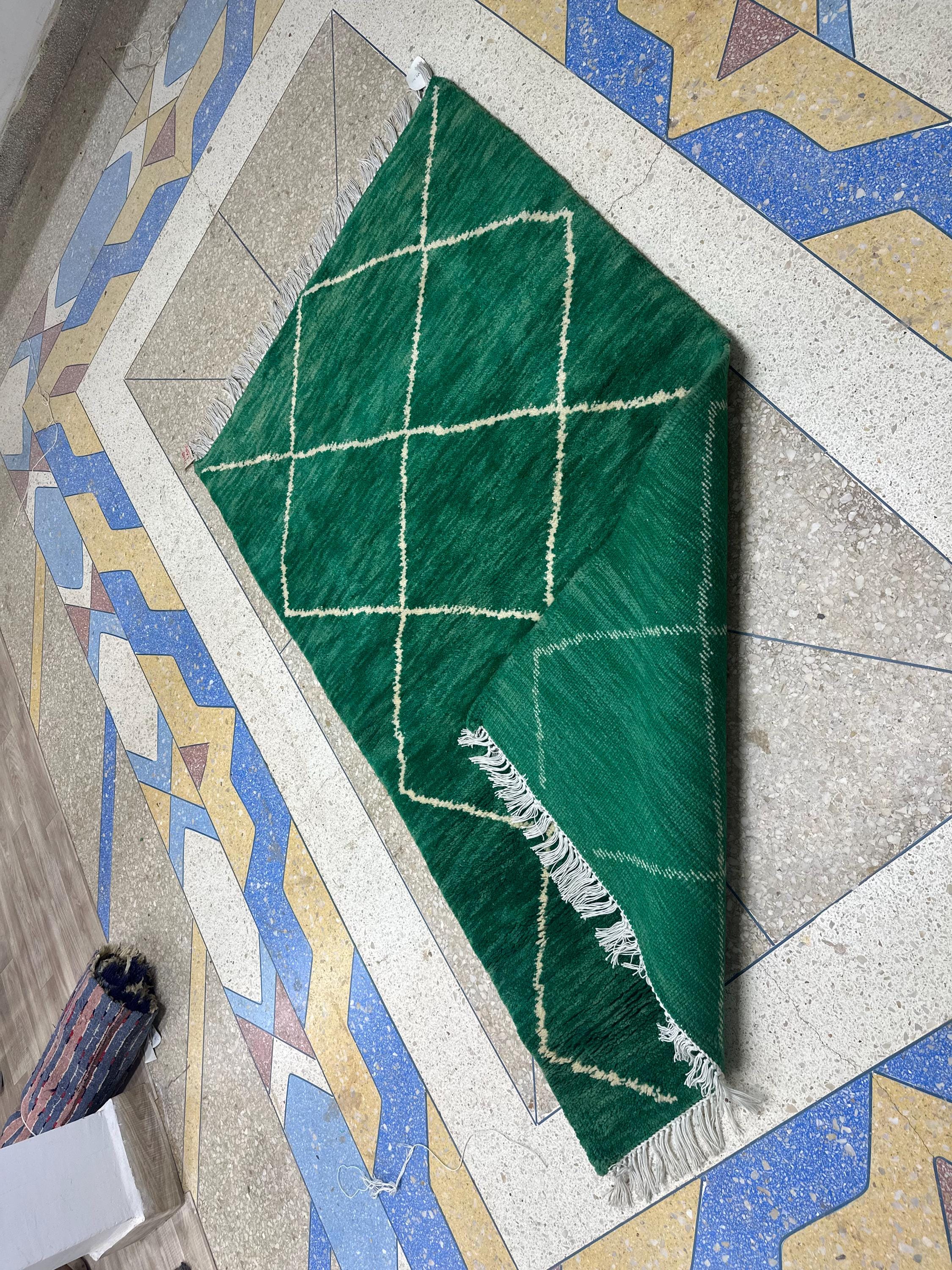 Artistic Moroccan Beni Ourain Rug – 6.1x3.6 ft Handwoven Geometric Area Rug, Green and White Berber Wool, Perfect for Living Room Décor