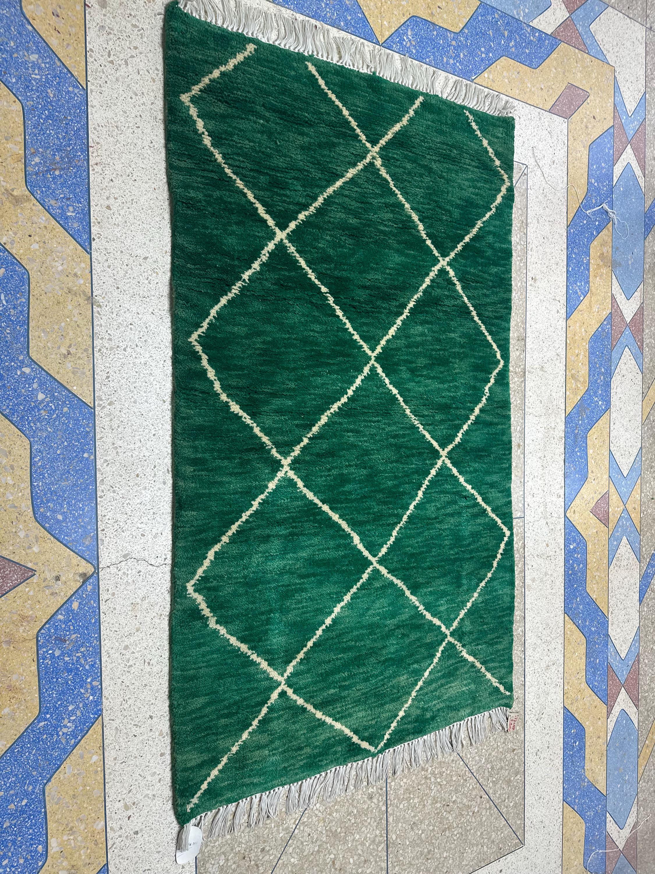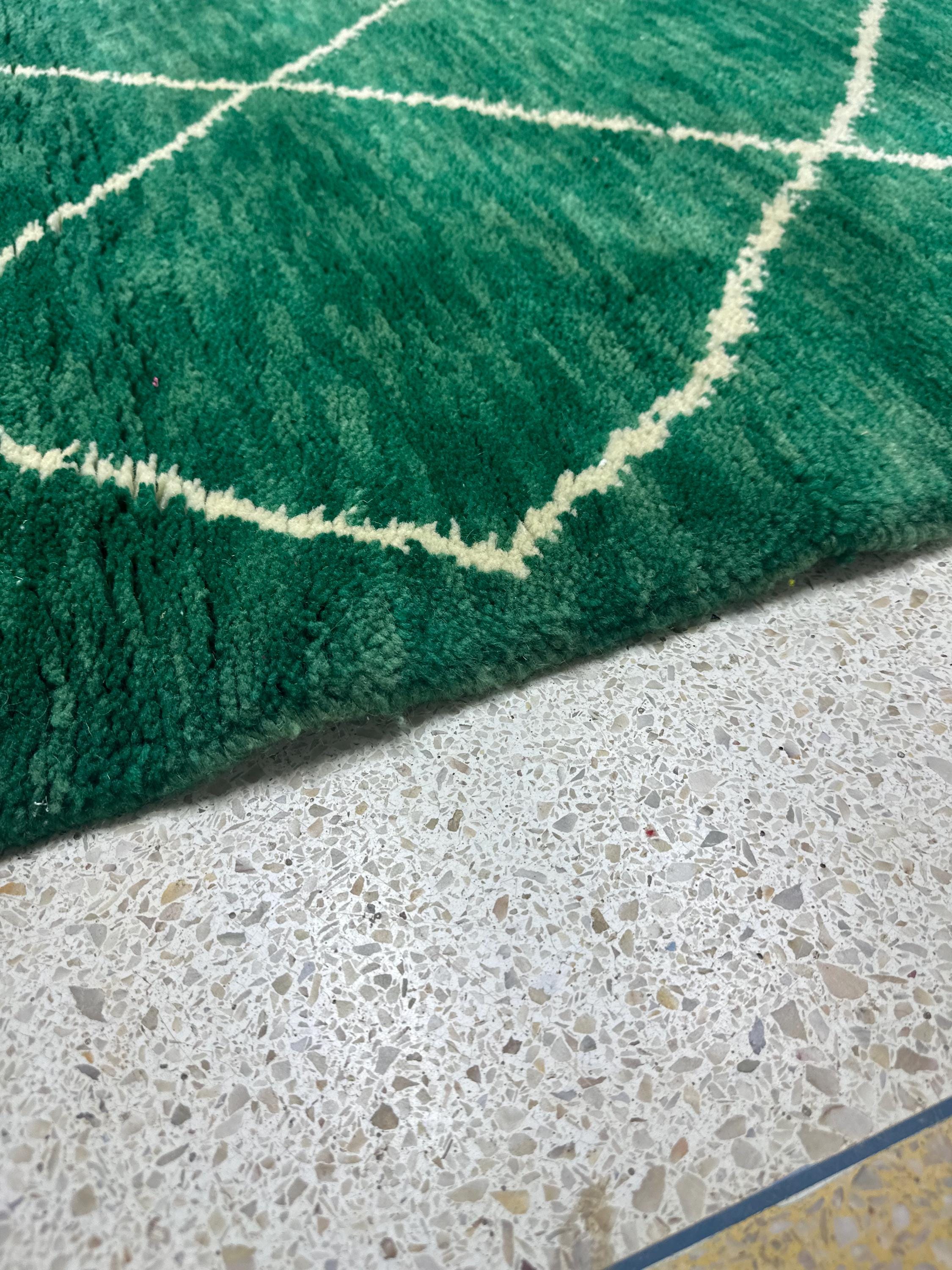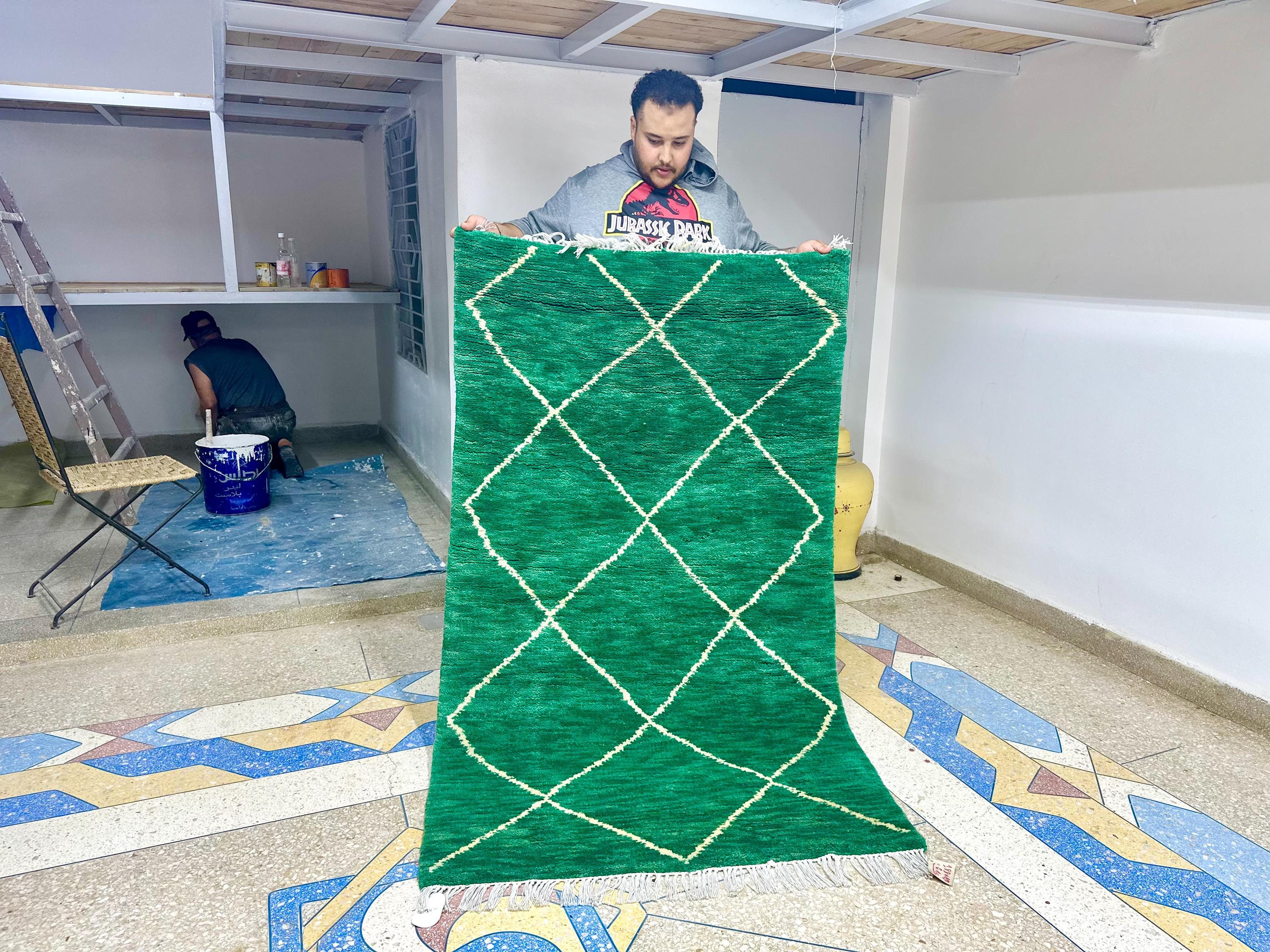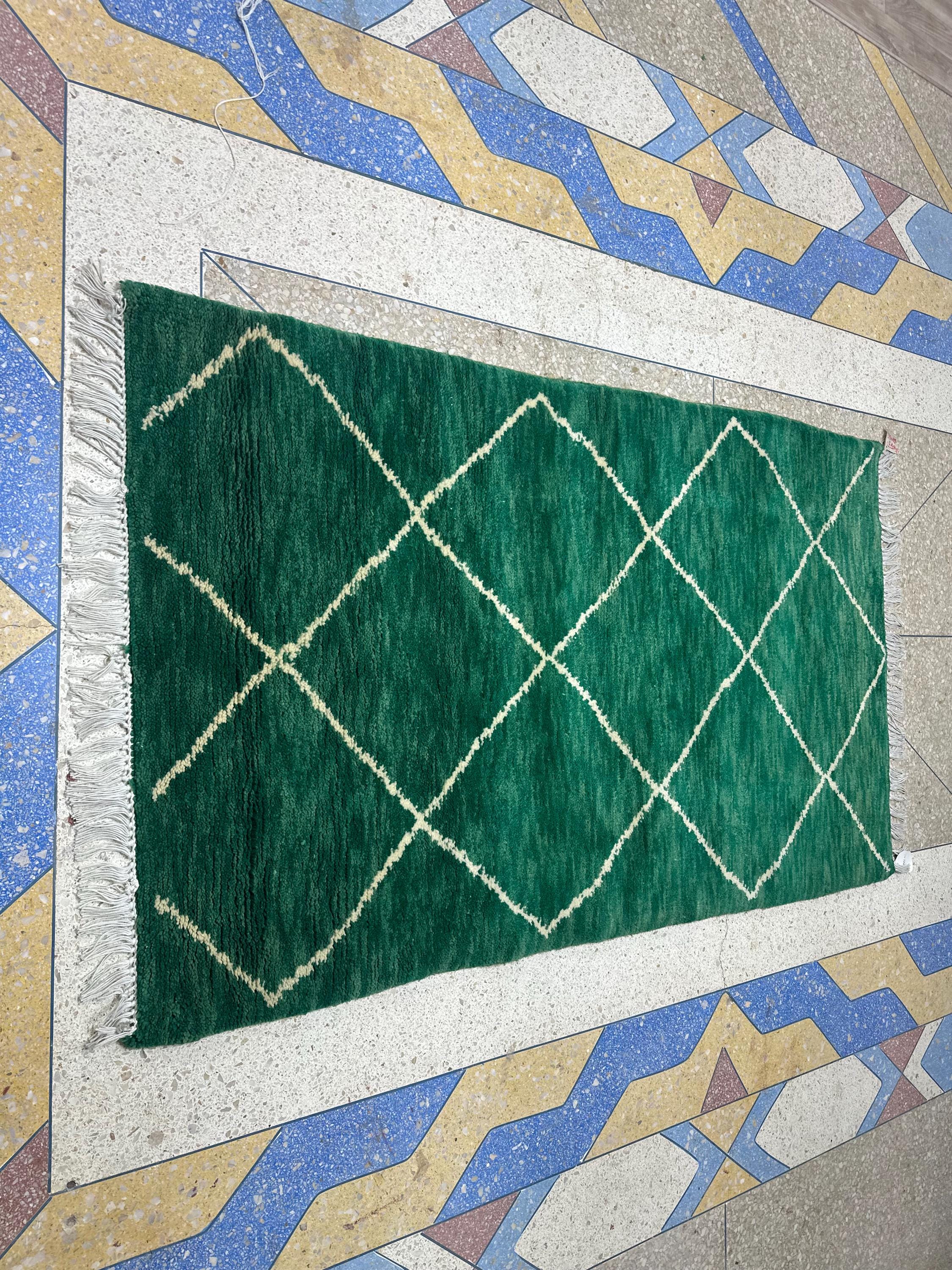 Artistic Moroccan Beni Ourain Rug – 6.1x3.6 ft Handwoven Geometric Area Rug, Green and White Berber Wool, Perfect for Living Room Décor