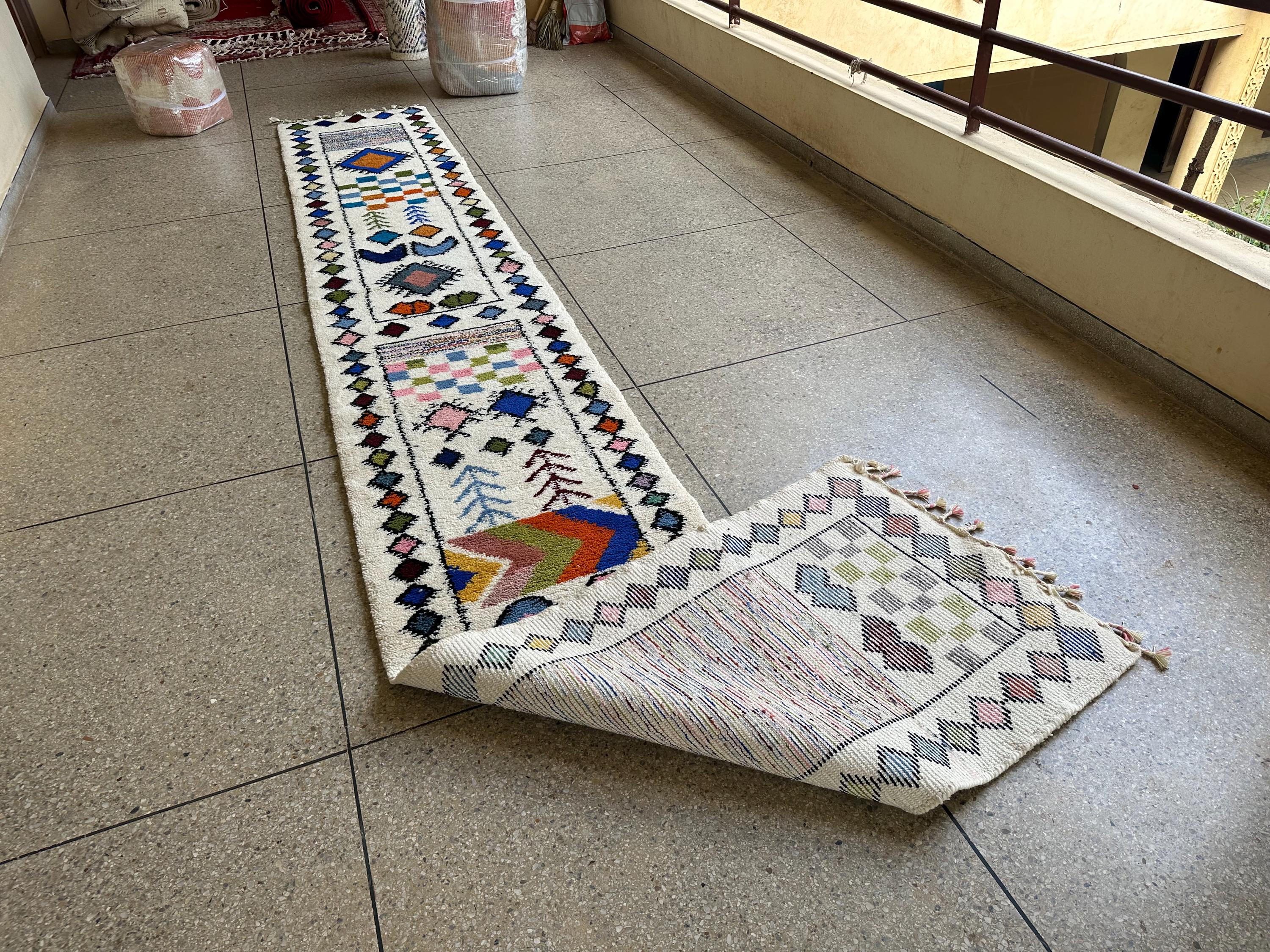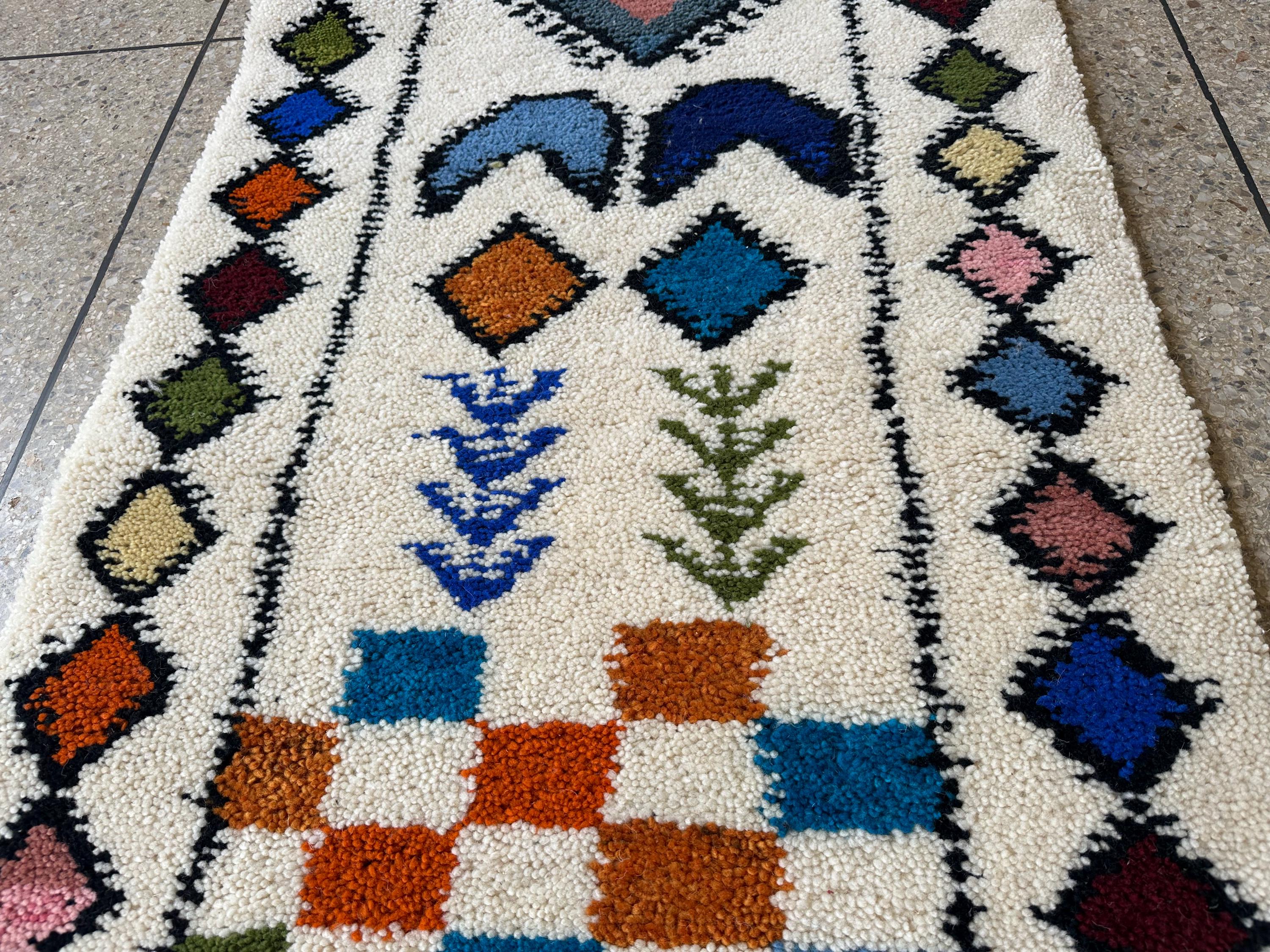 Enhance your hallway or entryway with this White and Multicolor Abstract Beni Ourain Runner, a custom handwoven Moroccan wool rug that seamlessly blends traditional Berber artistry with contemporary design. Crafted from soft, high-quality wool, this runner features a vibrant abstract pattern, adding a touch of bohemian elegance to your home. Its durable construction ensures longevity, making it a perfect addition to high-traffic areas.