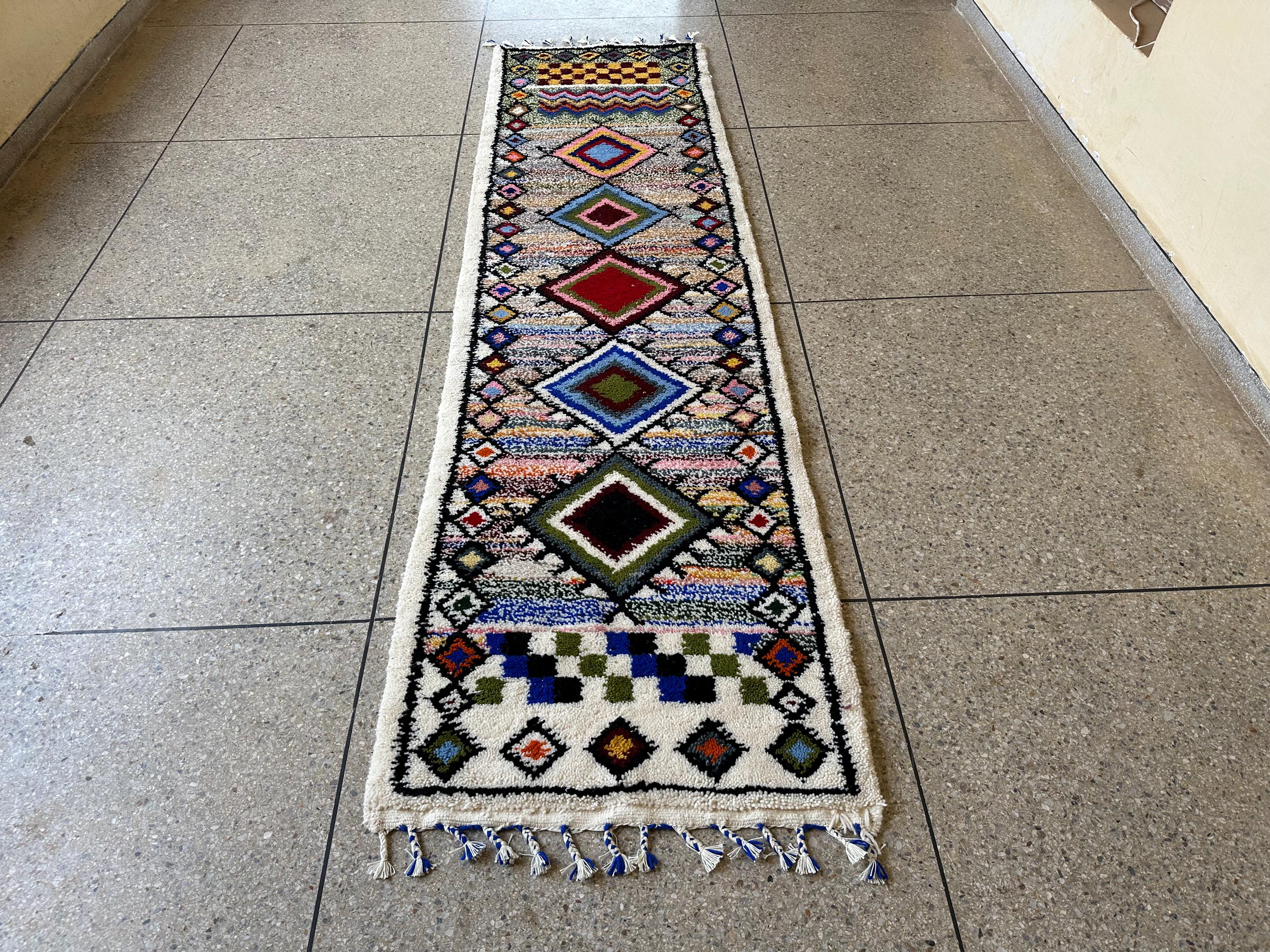 Enhance your hallway or entryway with this White and Multicolor Abstract Beni Ourain Runner, a custom handwoven Moroccan wool rug that seamlessly blends traditional Berber artistry with contemporary design. Crafted from soft, high-quality wool, this runner features a vibrant abstract pattern, adding a touch of bohemian elegance to your home. Its durable construction ensures longevity, making it a perfect addition to high-traffic areas.