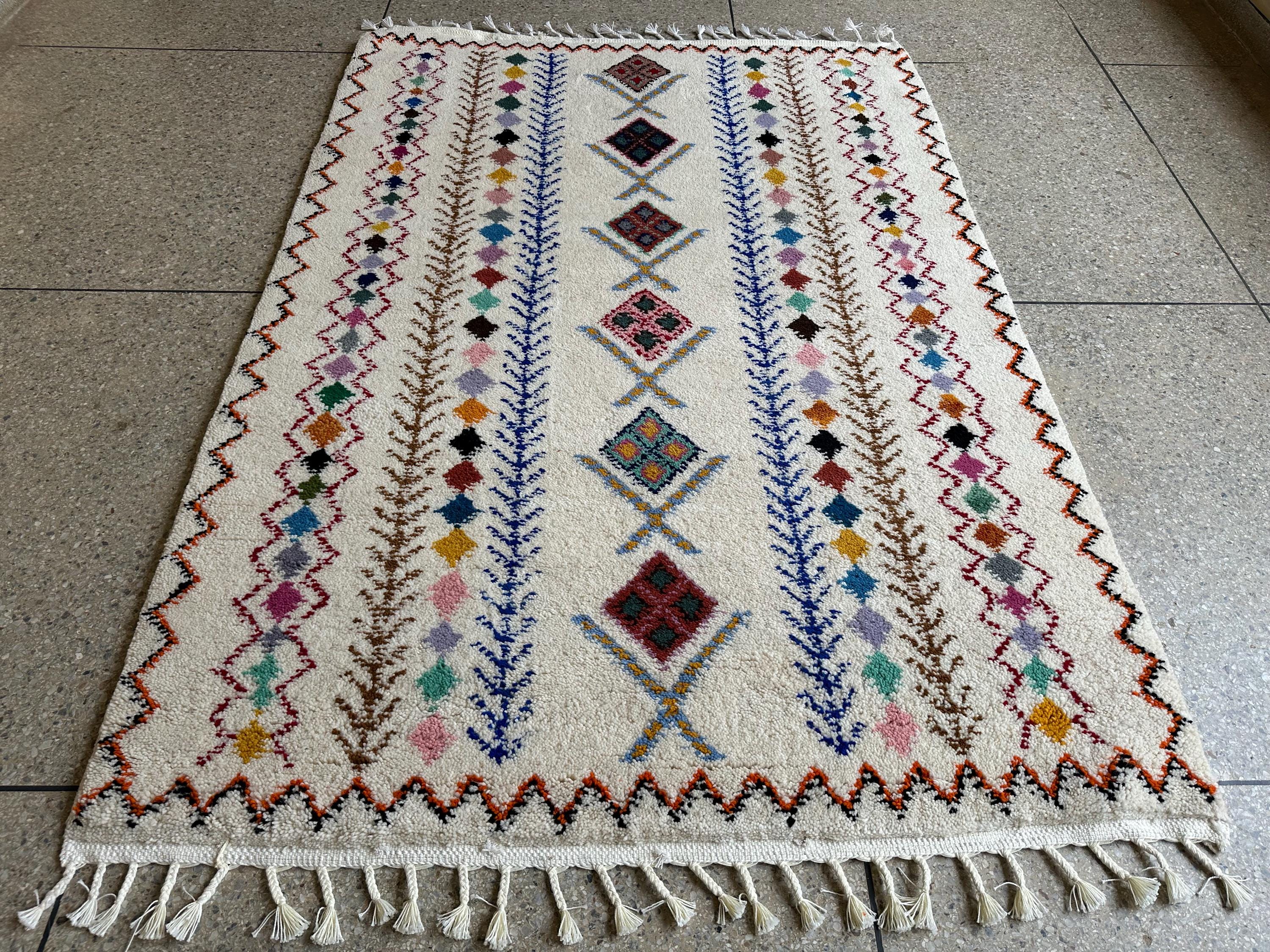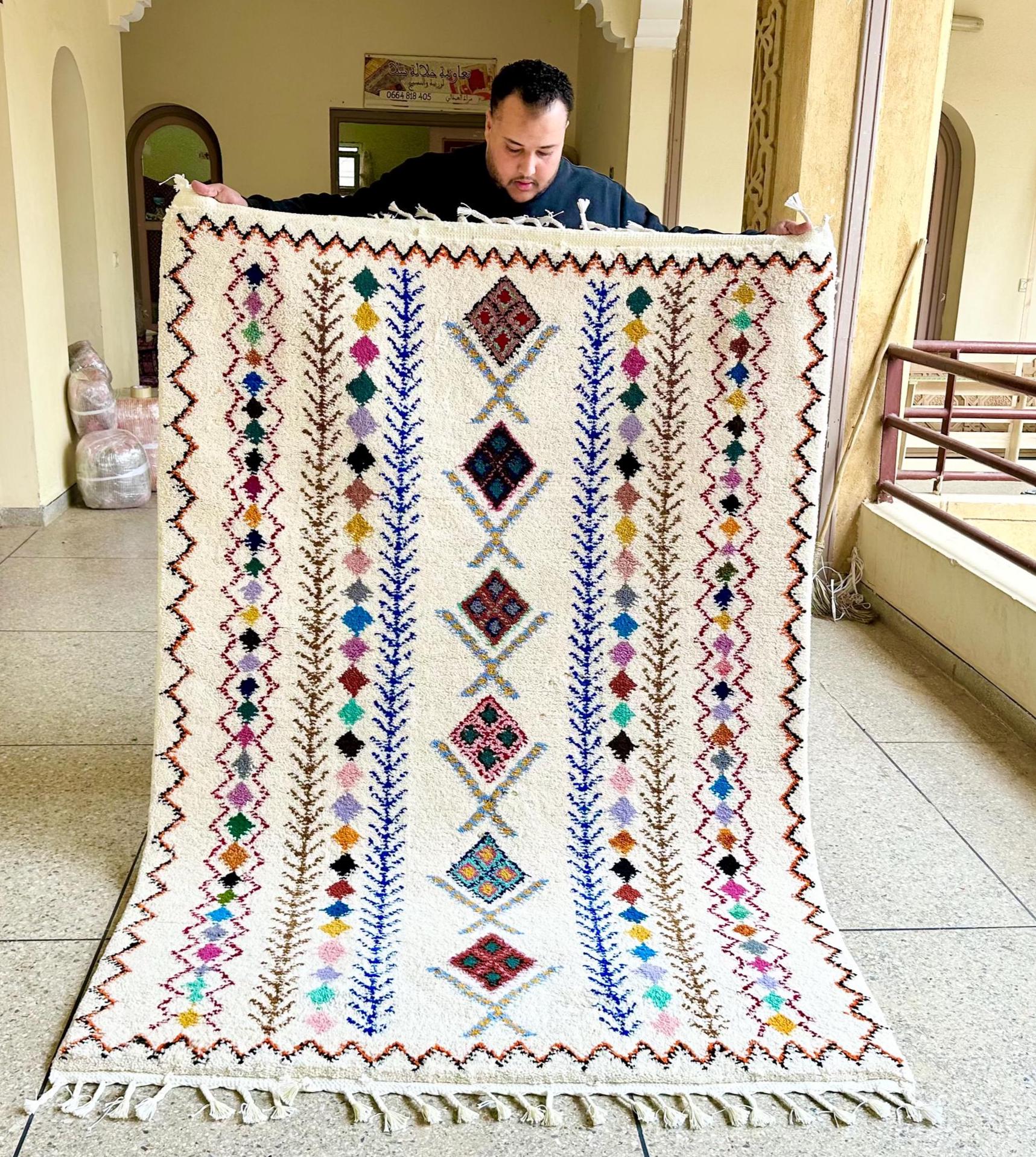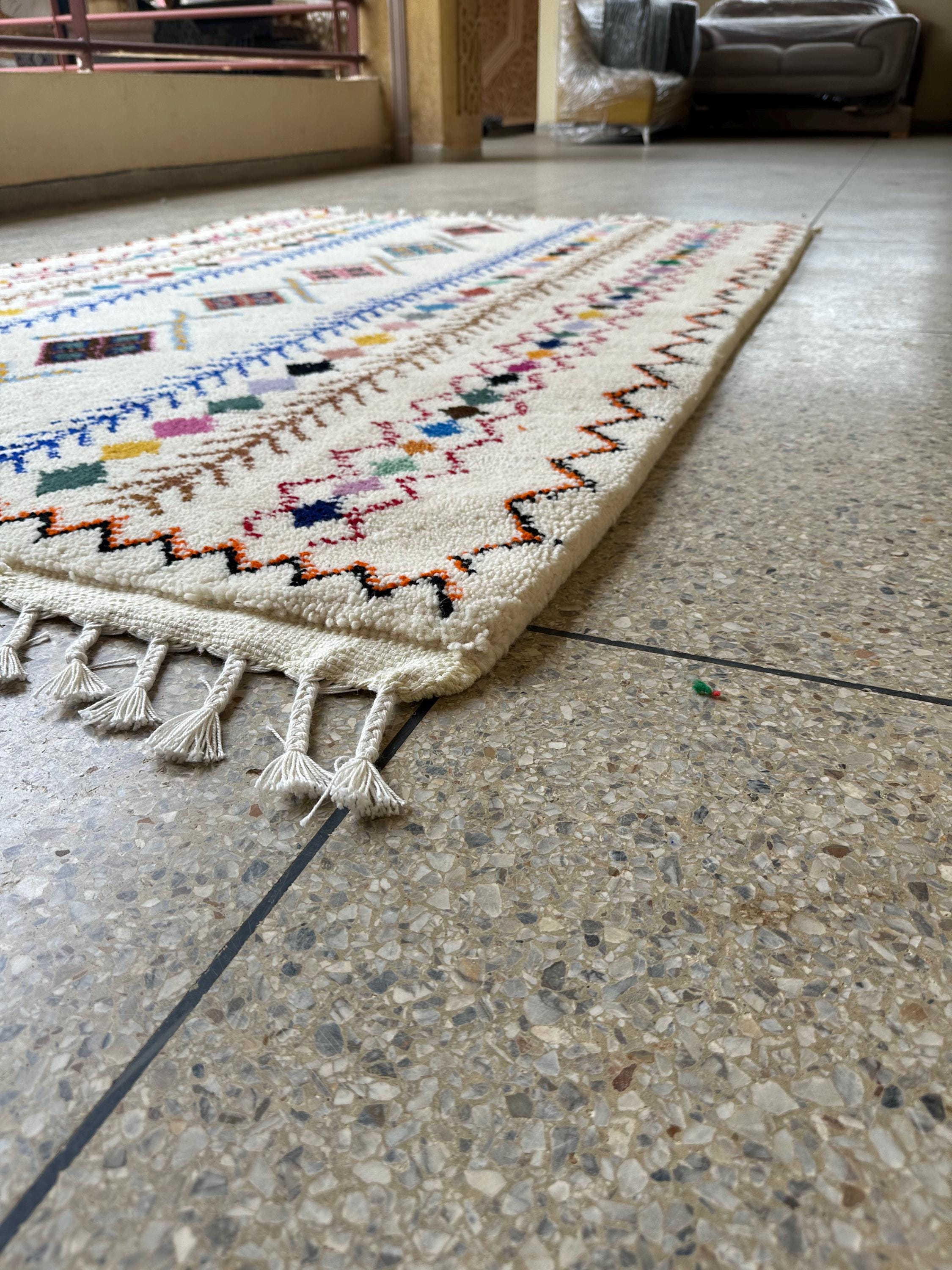 Enhance your home with this authentic Moroccan Beni Ourain Rug, featuring a white base adorned with multicolor geometric patterns. Handwoven from natural wool, this custom-made soft wool area rug seamlessly blends traditional Berber craftsmanship with contemporary design, making it an ideal centerpiece for bohemian-style living rooms or bedrooms.