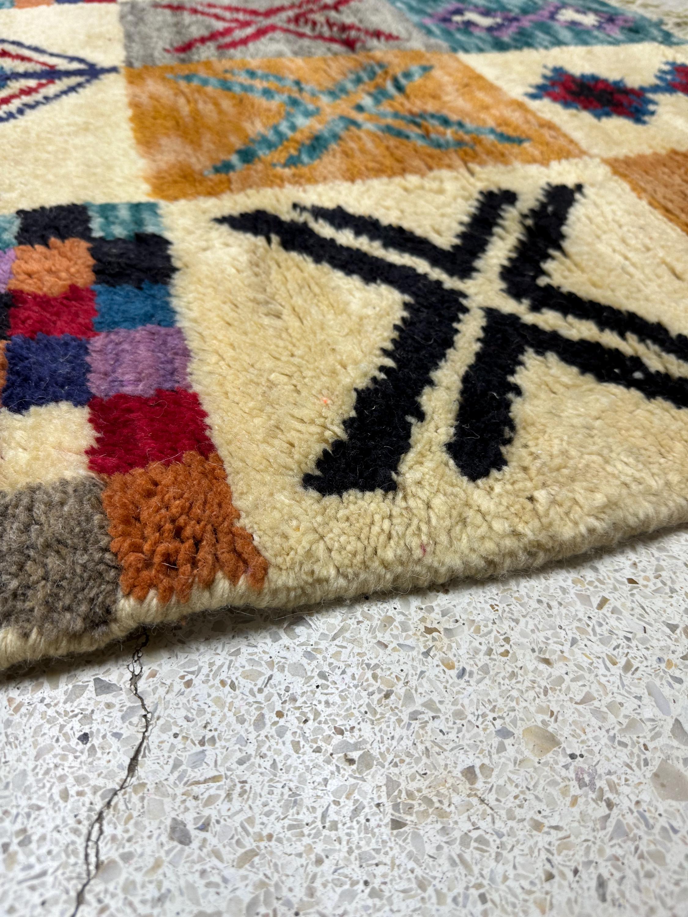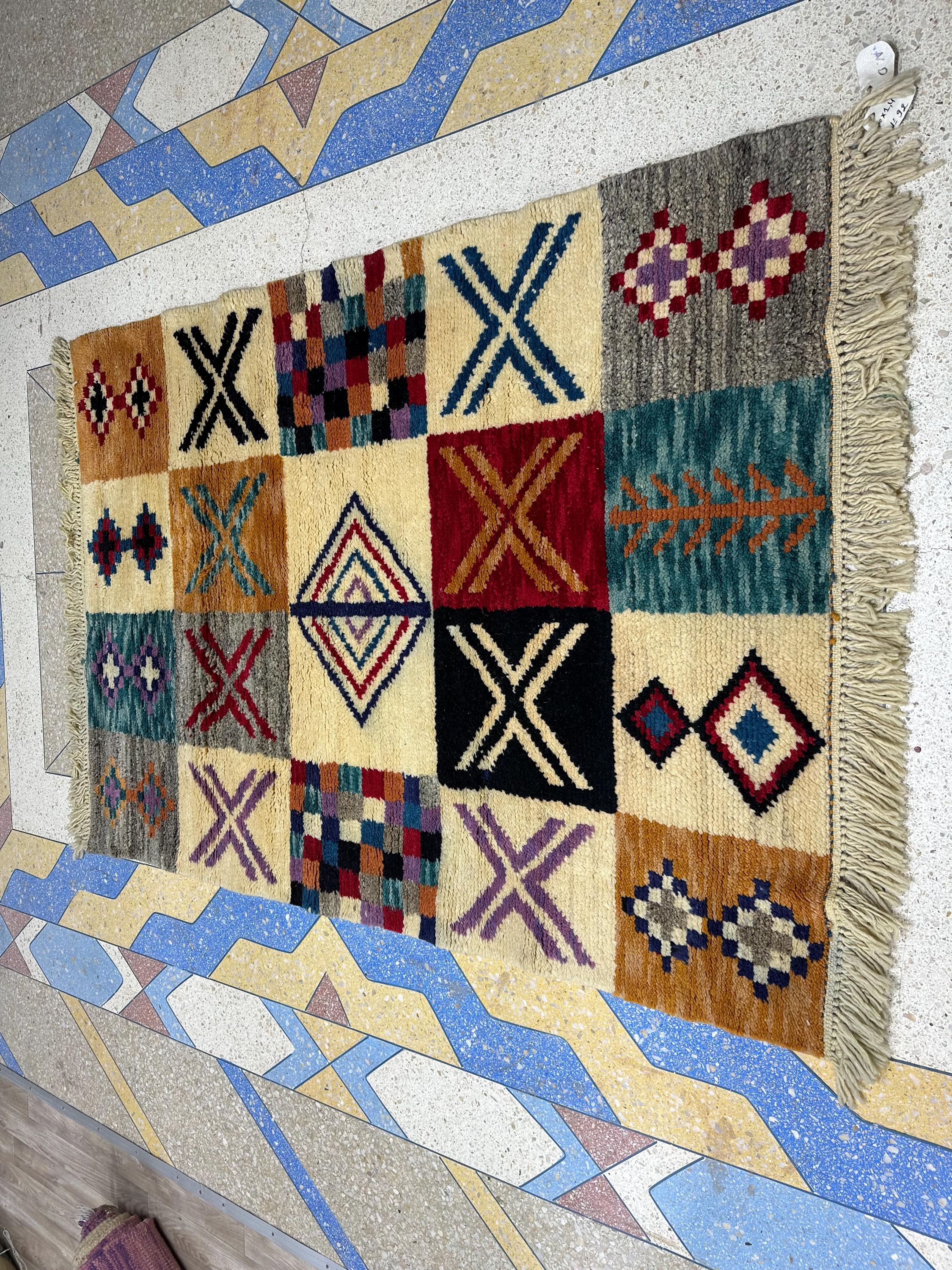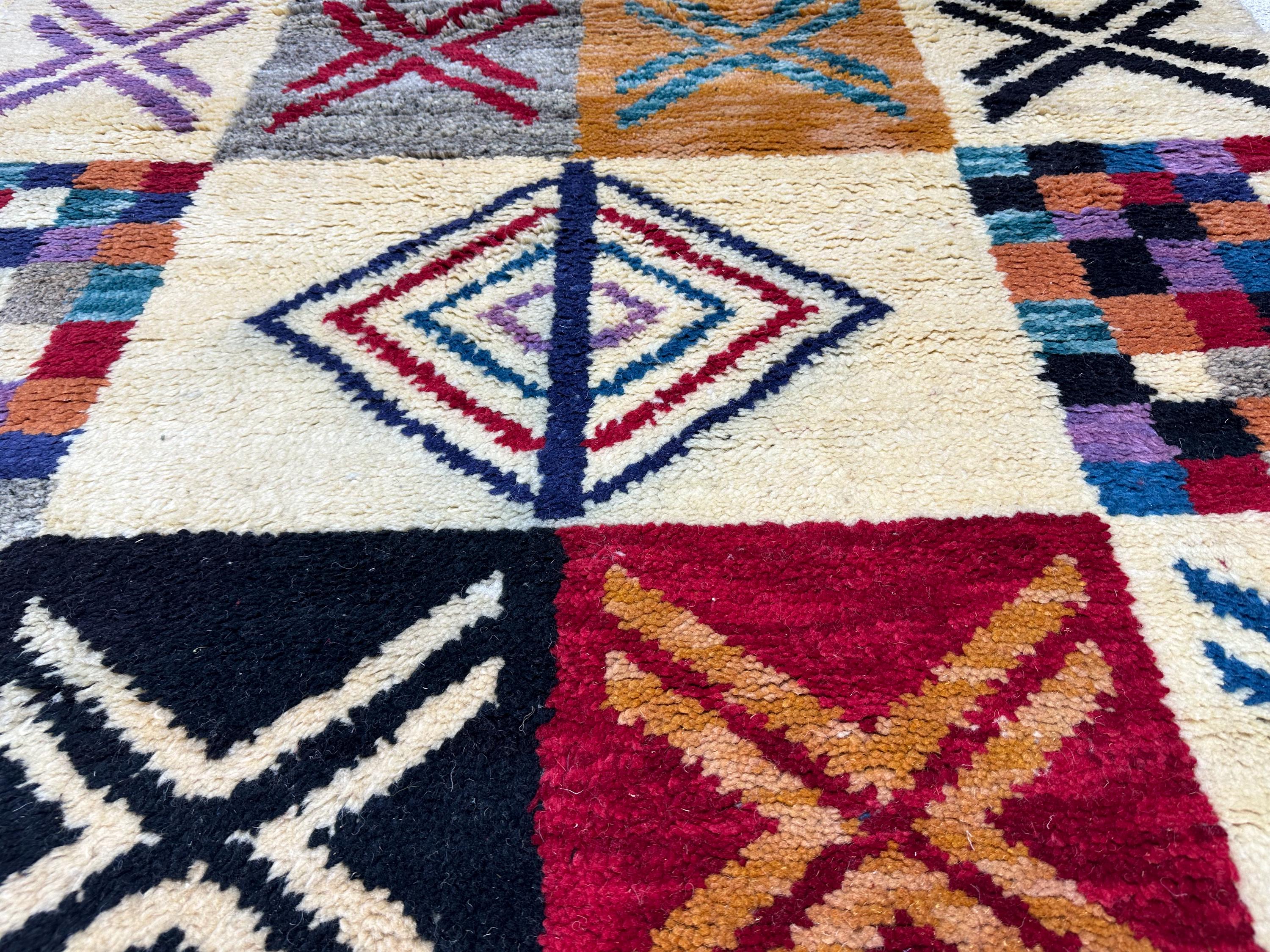 Playful and bold — this multi-colored checkered Beni Ourain rug is handwoven from soft wool, adding vibrant Moroccan charm to any boho space.
