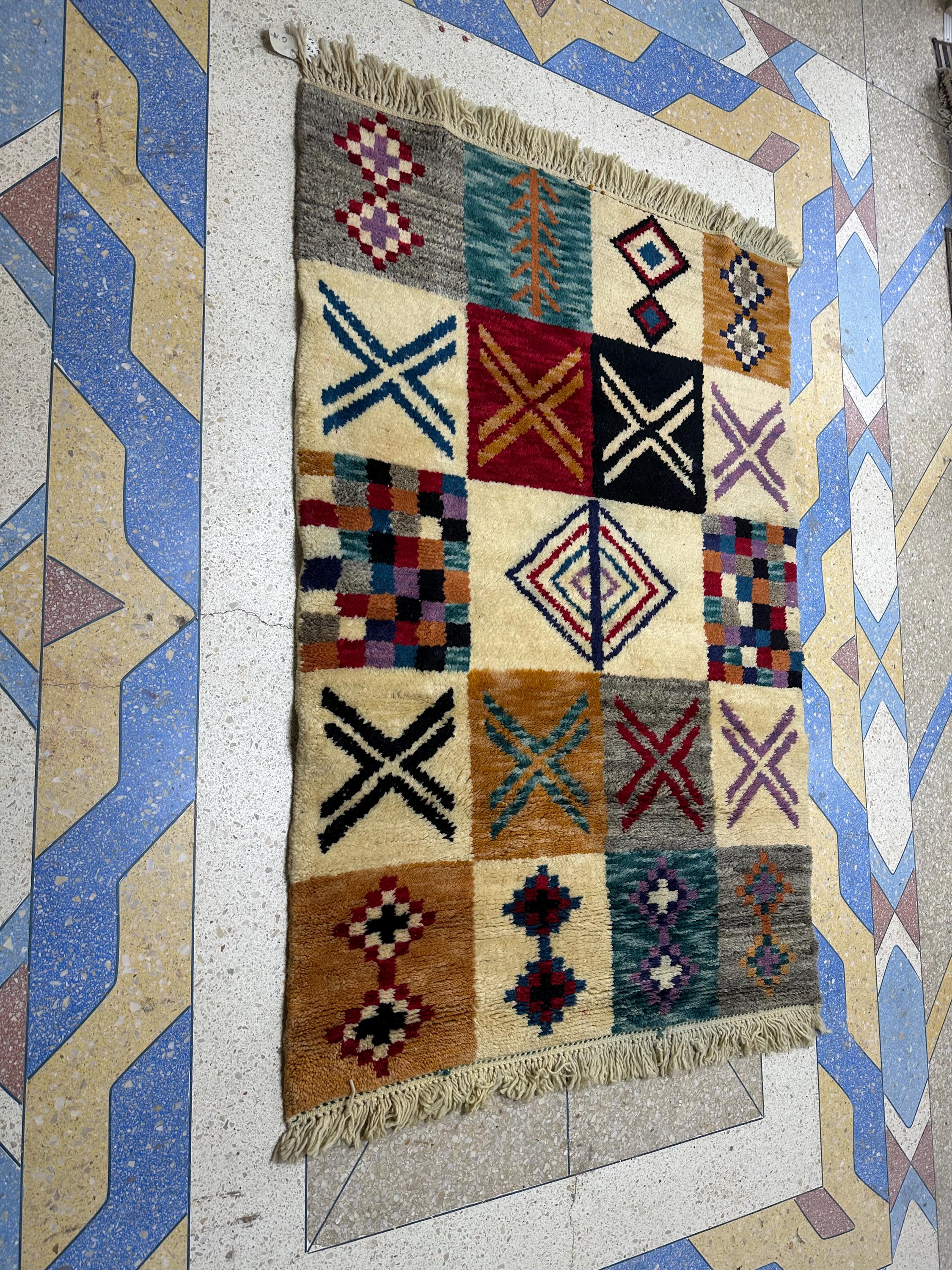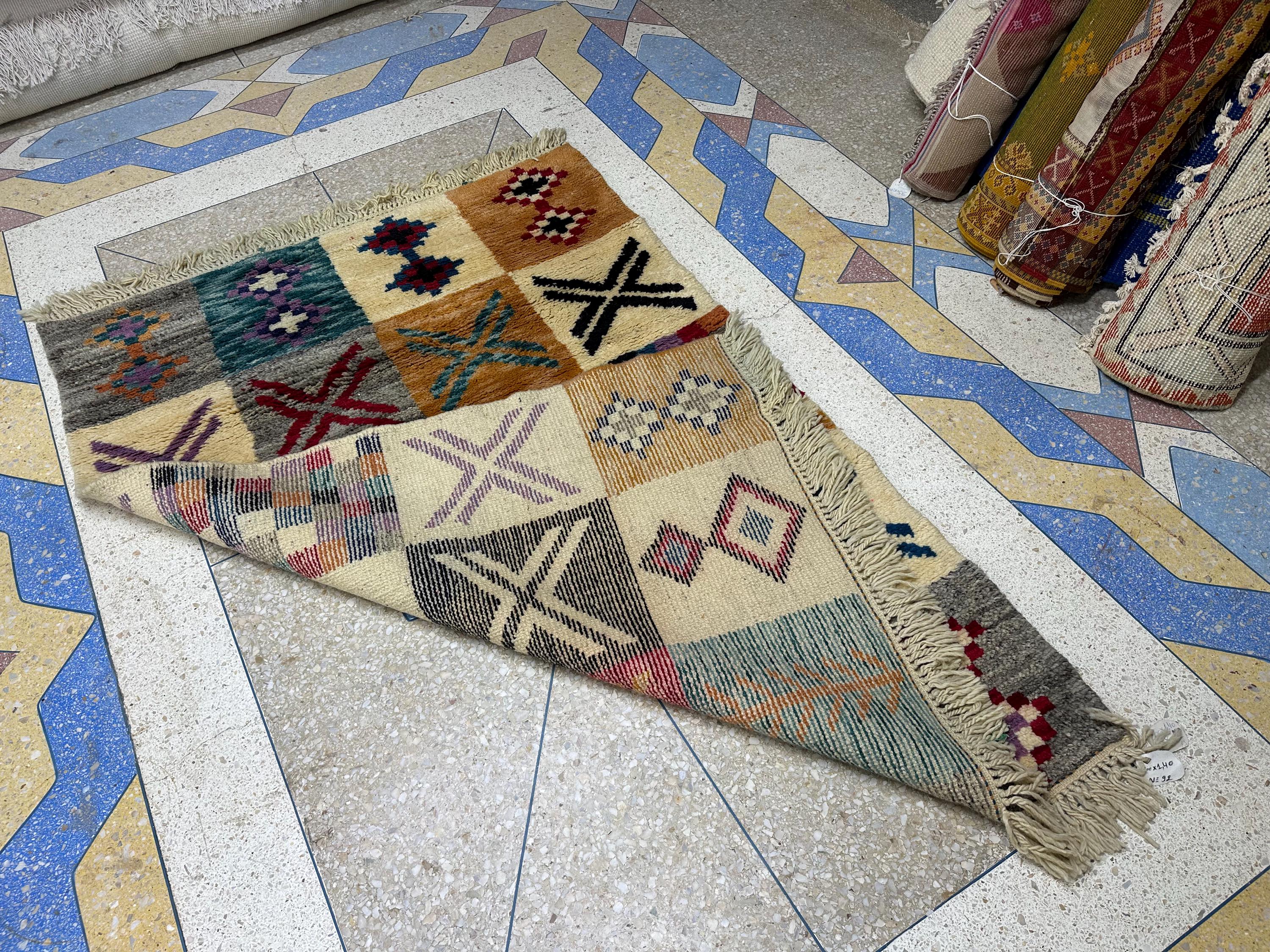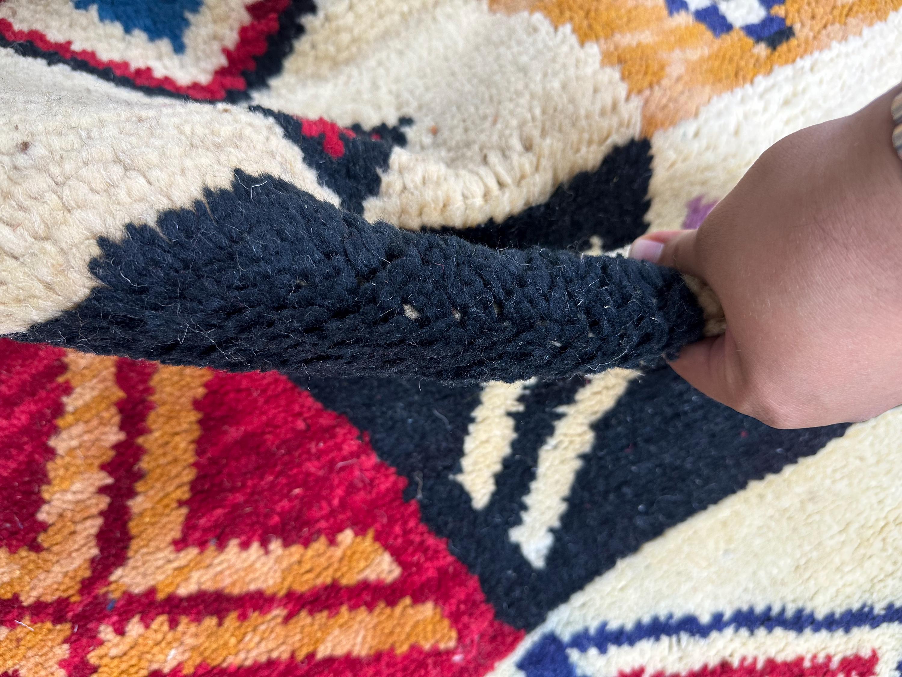 Playful and bold — this multi-colored checkered Beni Ourain rug is handwoven from soft wool, adding vibrant Moroccan charm to any boho space.