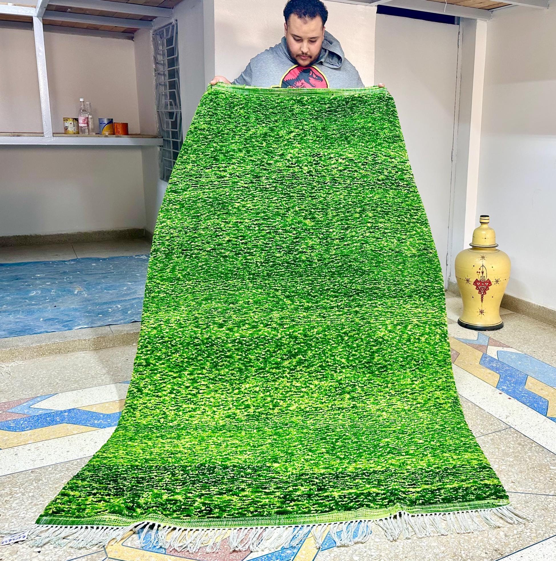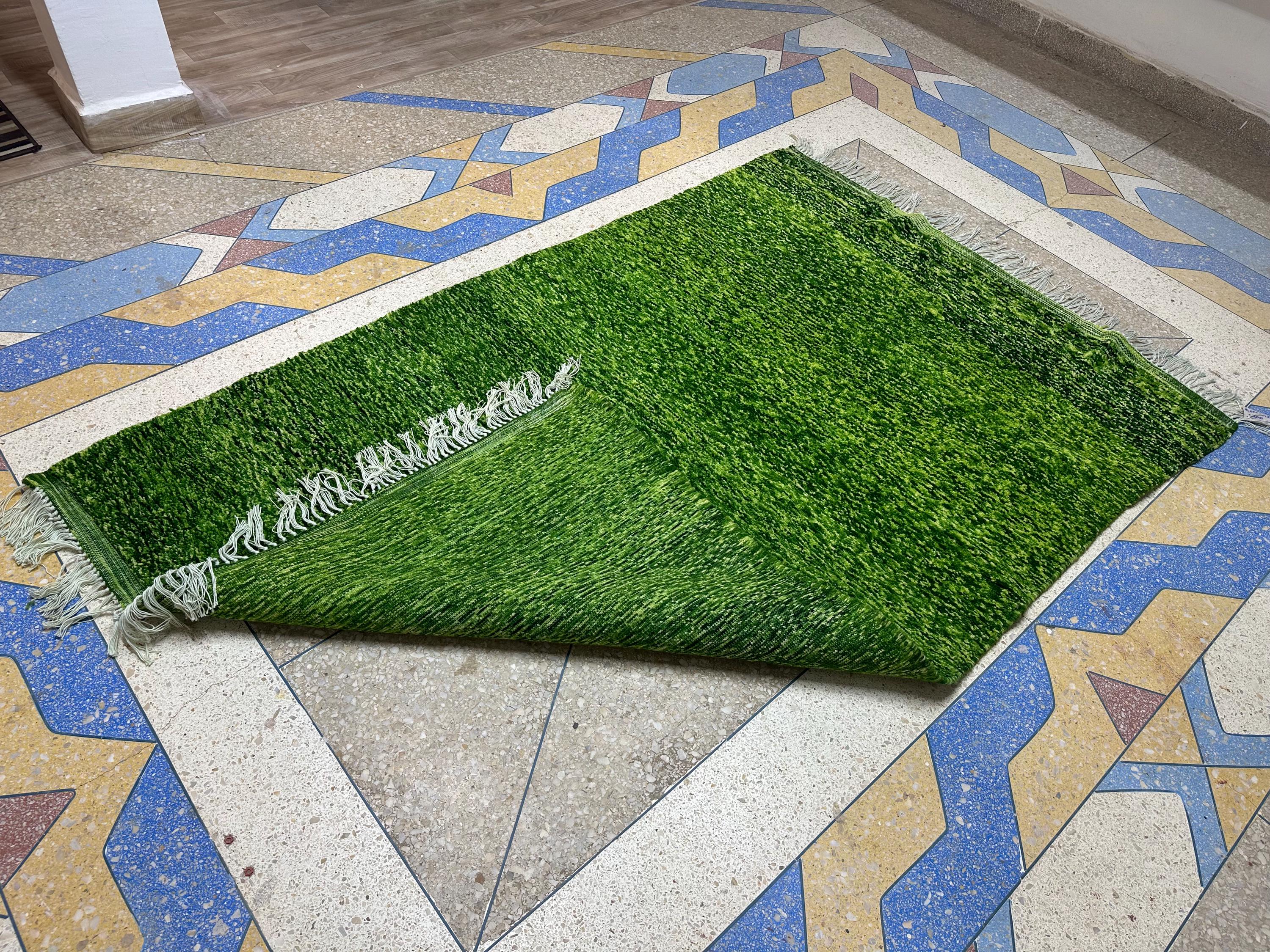 Introduce a touch of serene elegance to your space with this Solid Green Beni Ourain Rug, a handwoven Moroccan wool carpet crafted by skilled artisans. Made from 100% natural sheep wool, this custom area rug offers a plush texture and minimalist design, making it an ideal centerpiece for bohemian living rooms, cozy bedrooms, or eclectic interiors.