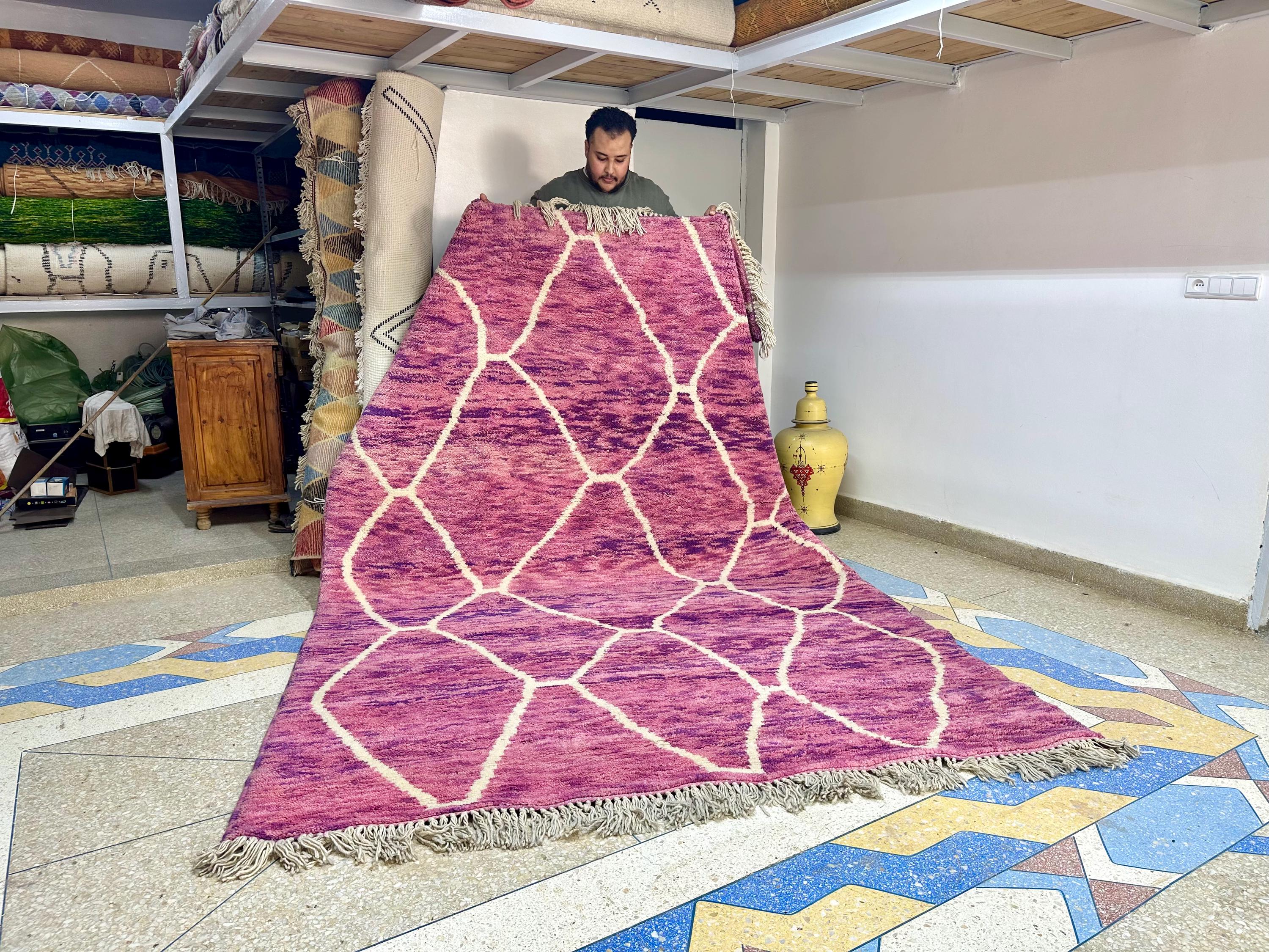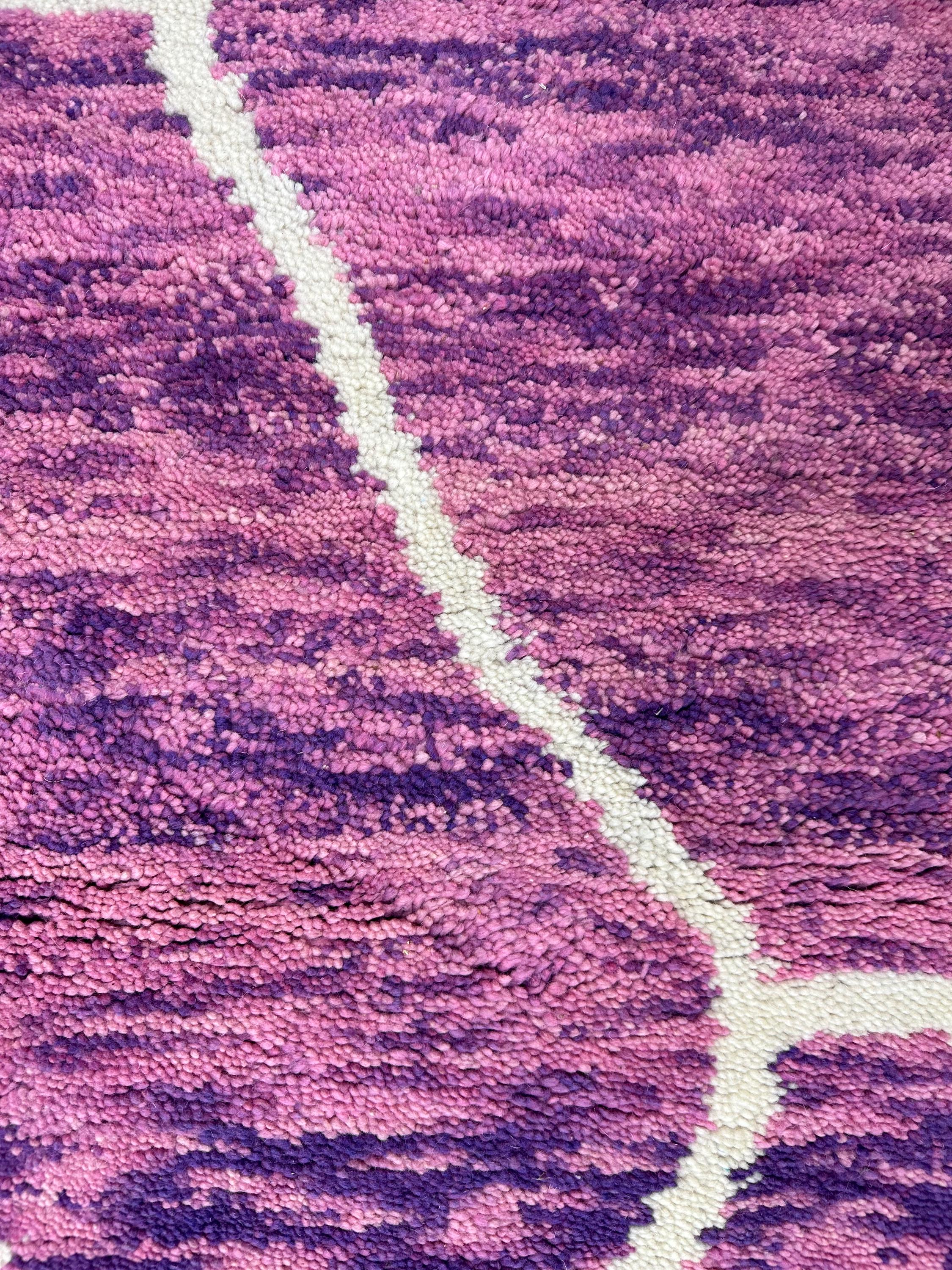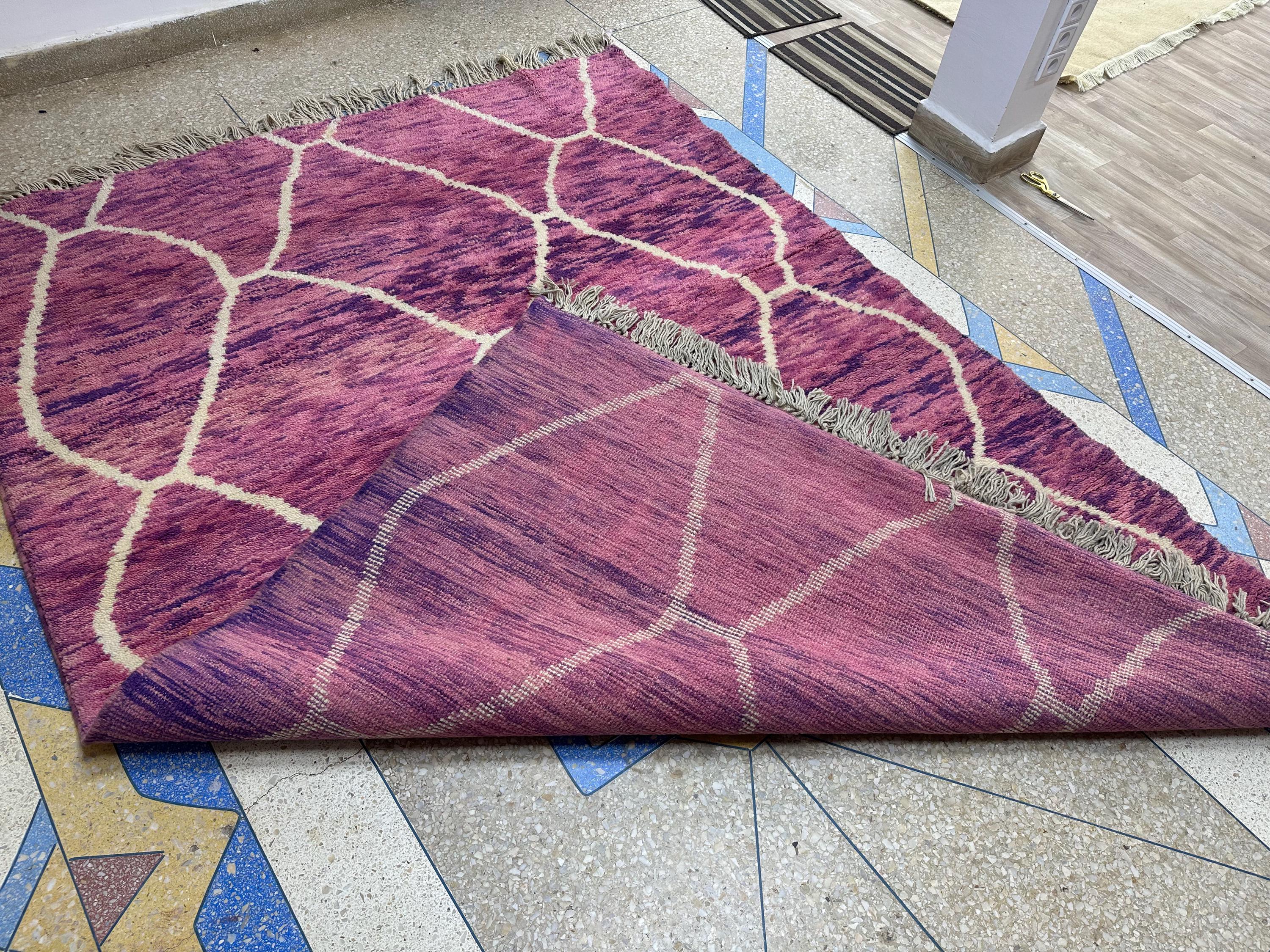 Make a bold yet cozy statement with this handmade purple & white Beni Ourain rug — soft wool, geometric design, and perfect for boho vibes.
